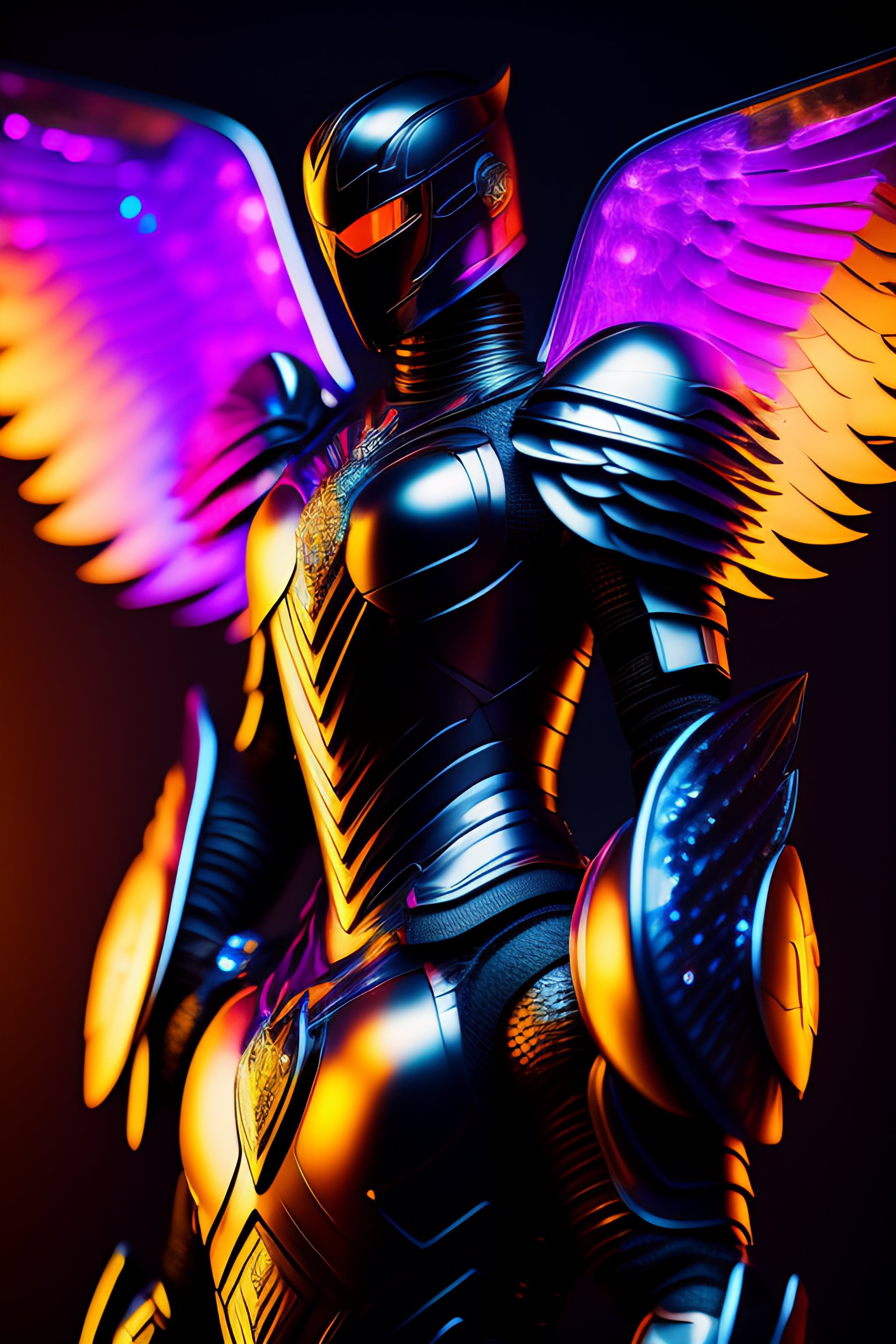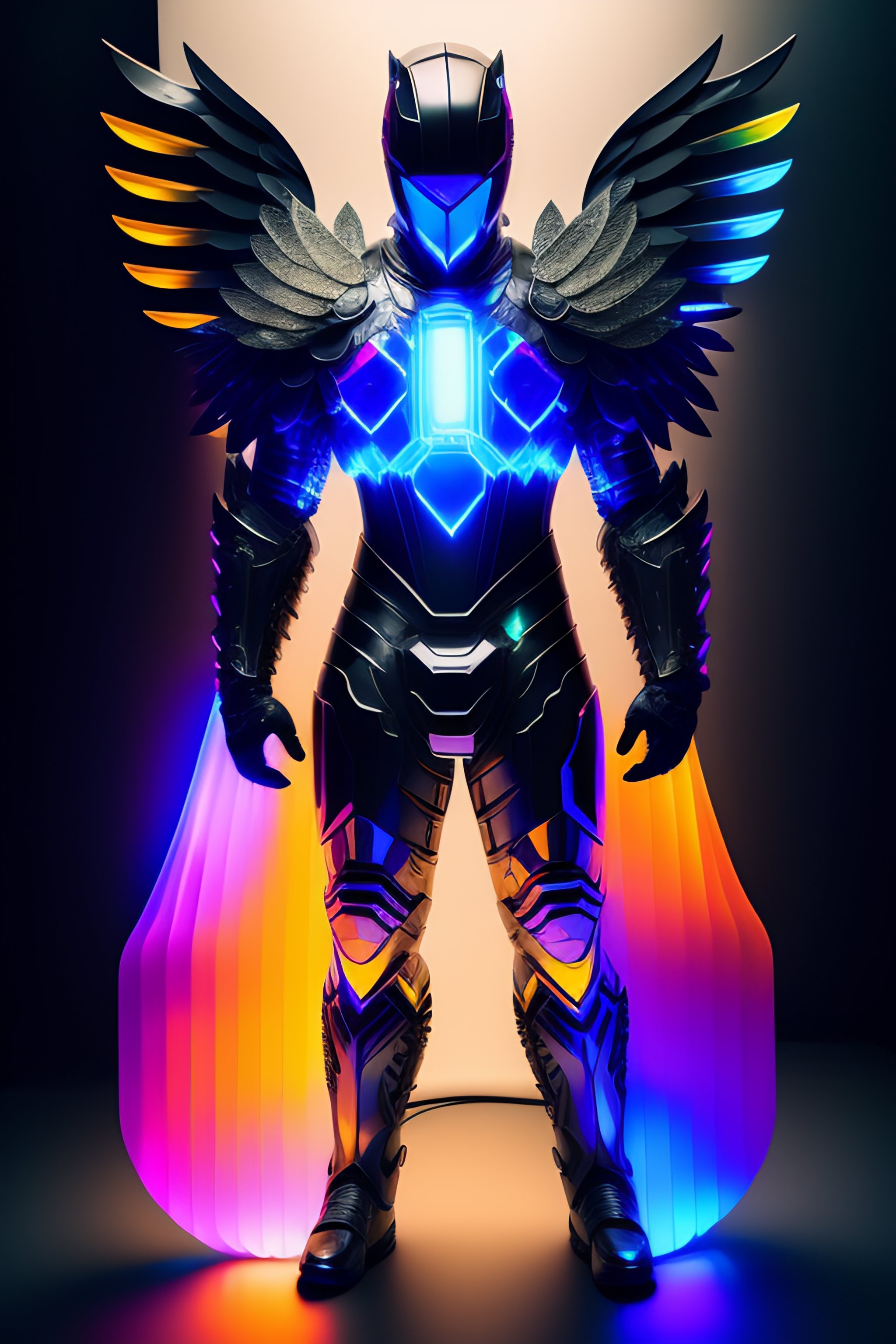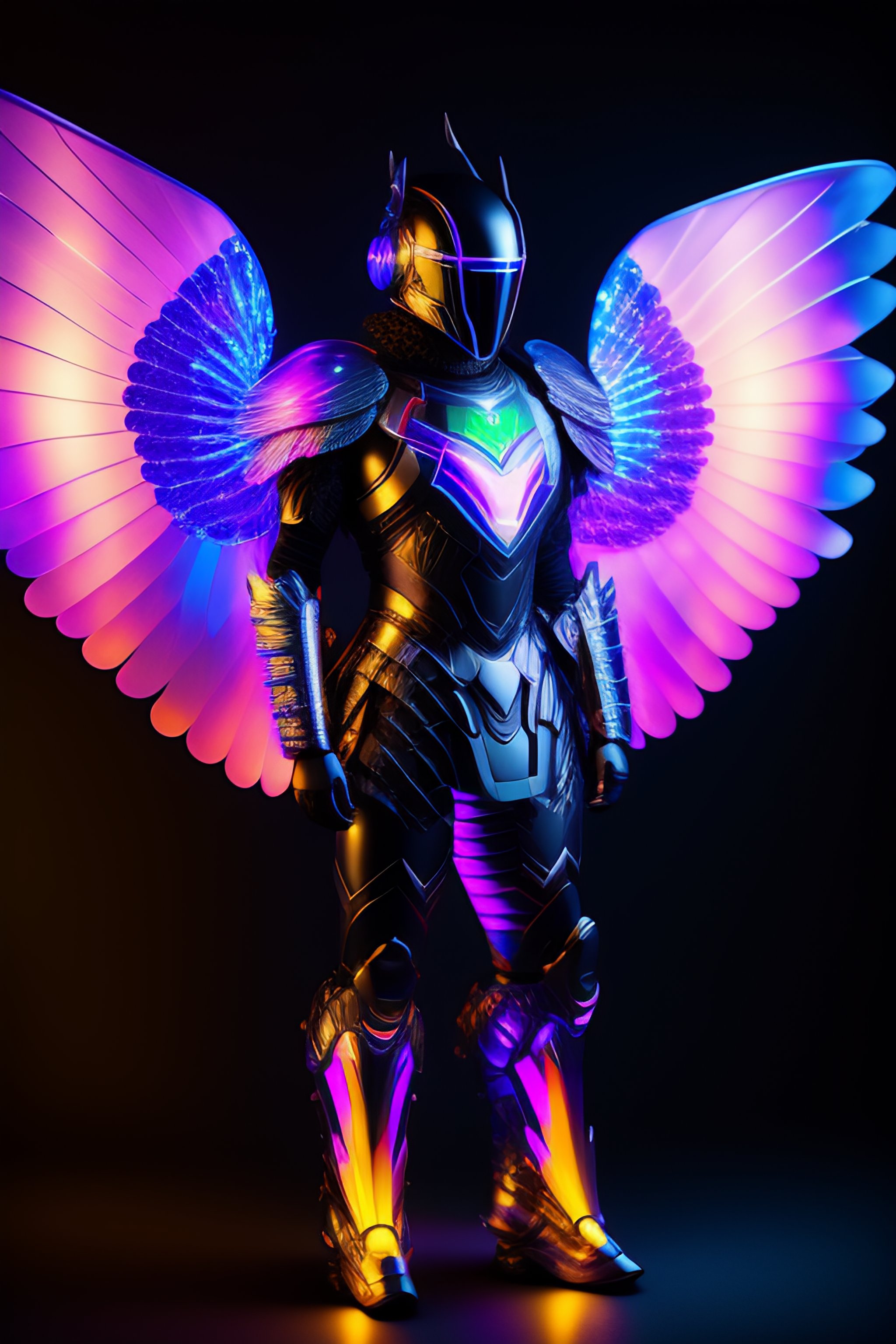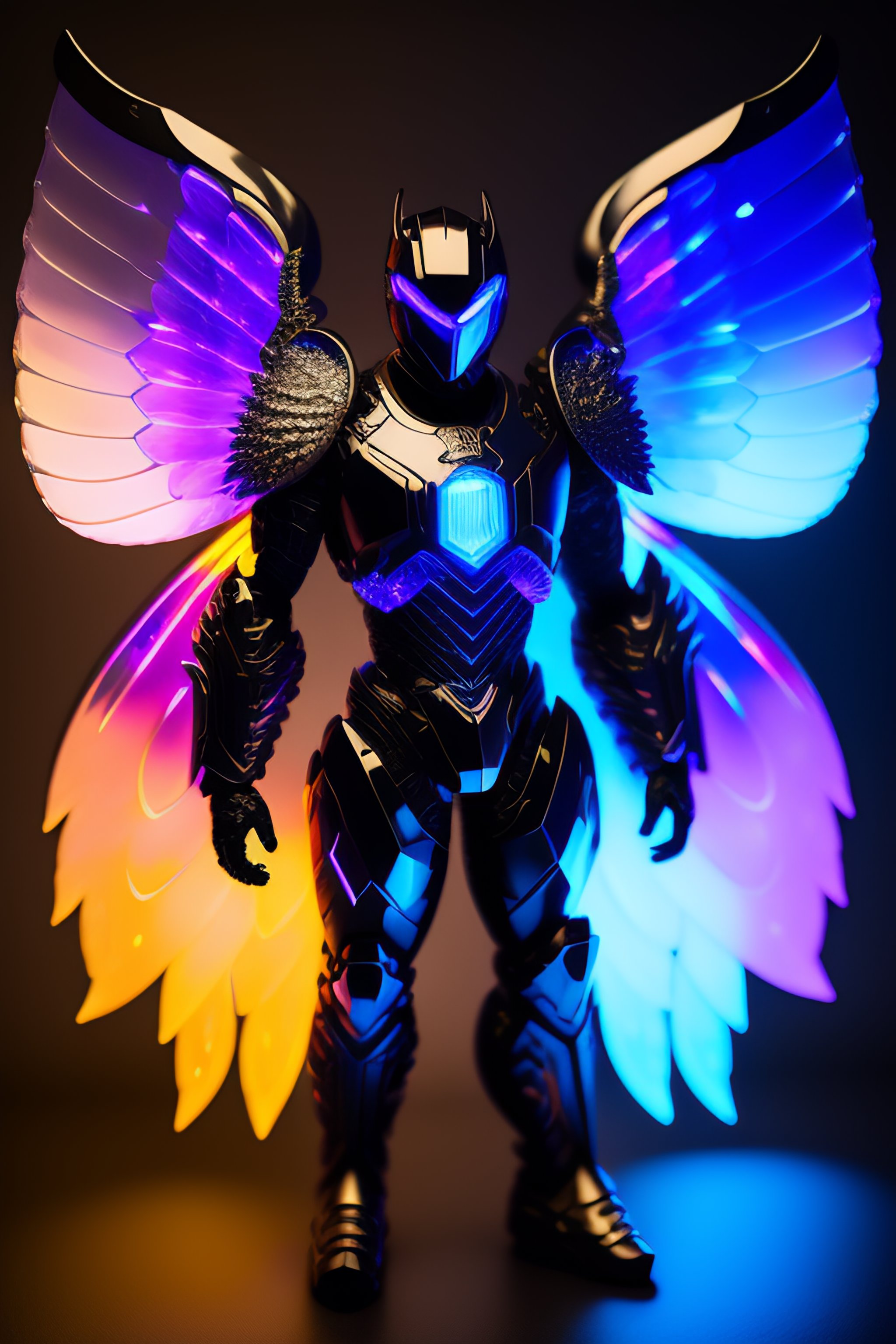 A photograph of warrior with wings armour made of black titanium and some crystal, rgb leds rainbow, power suit, gradient, crystal, visible wires and microchip, holograph, crystal transparent torso, imposing, elegant, for men, modern minimalism, low poly lines, glitch core, dreamy, colorful, dystopia, godlike, mysterious