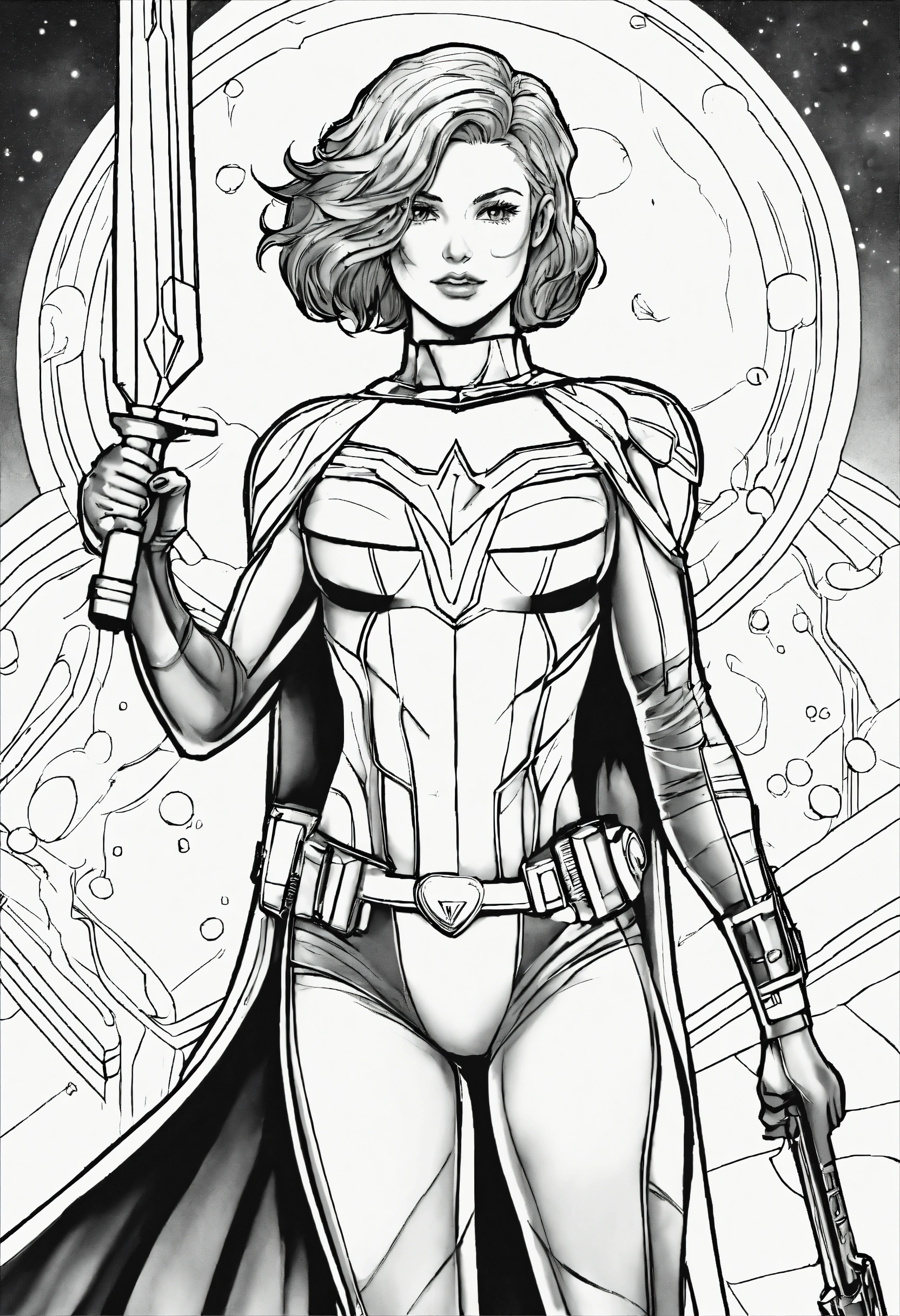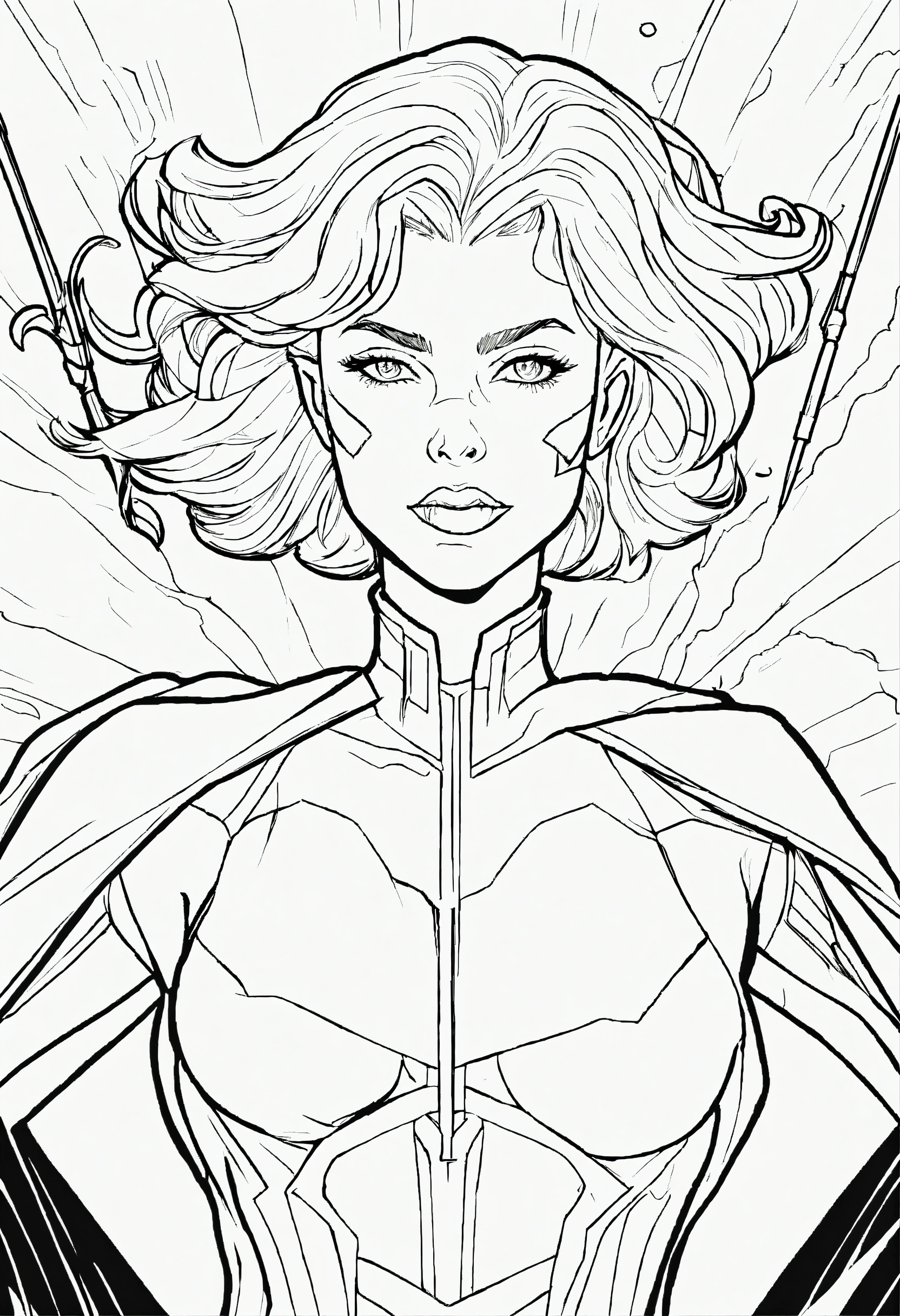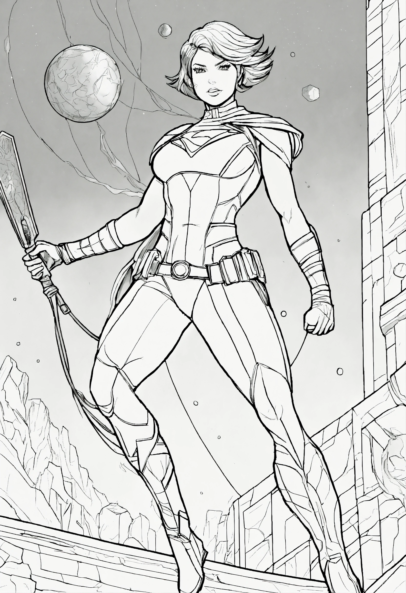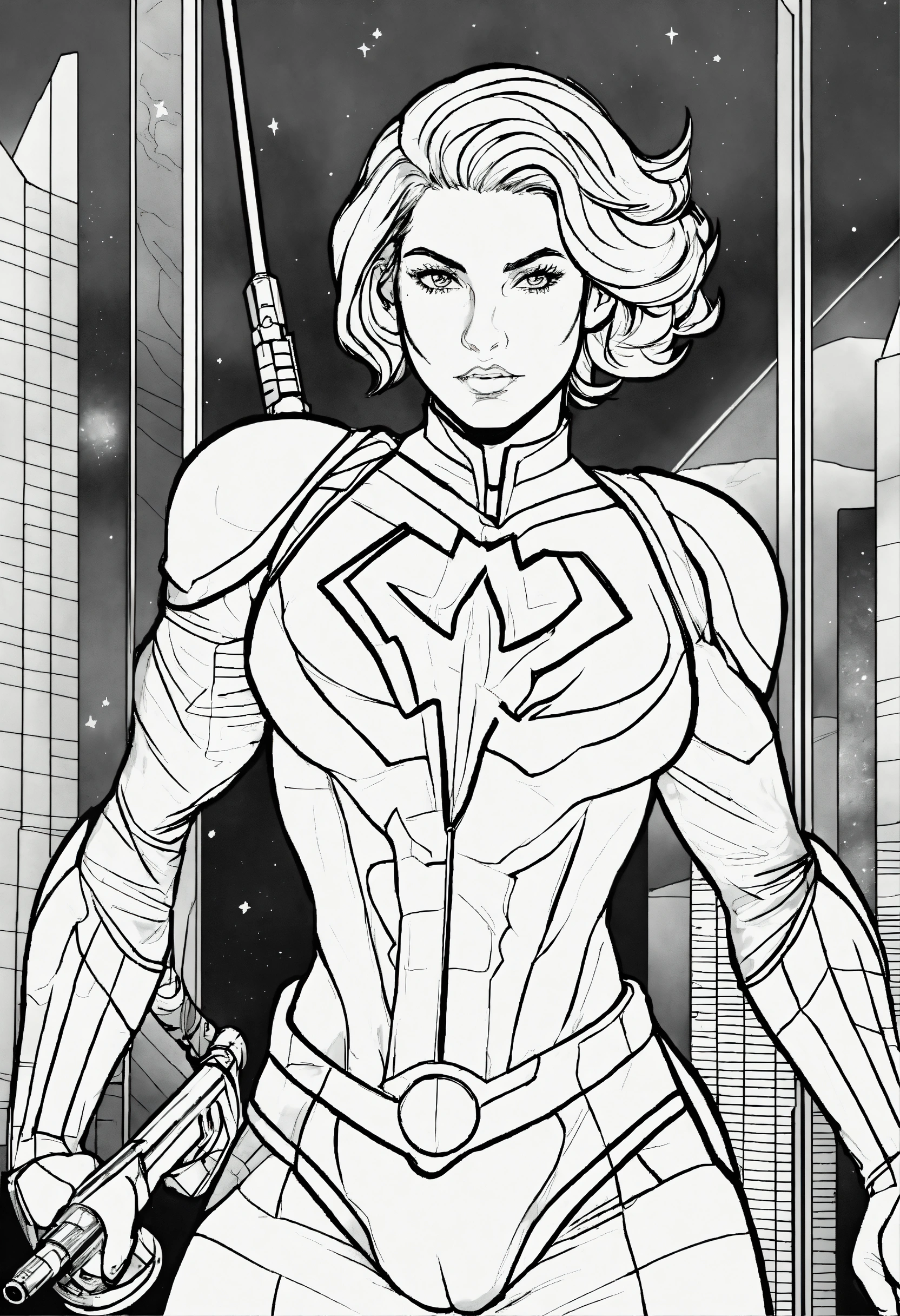Coloring page for kids, a black and white drawing with thin dark lines of a female superhero from uranus. she has short hair and a scar in her face. she uses a whip as a weapon