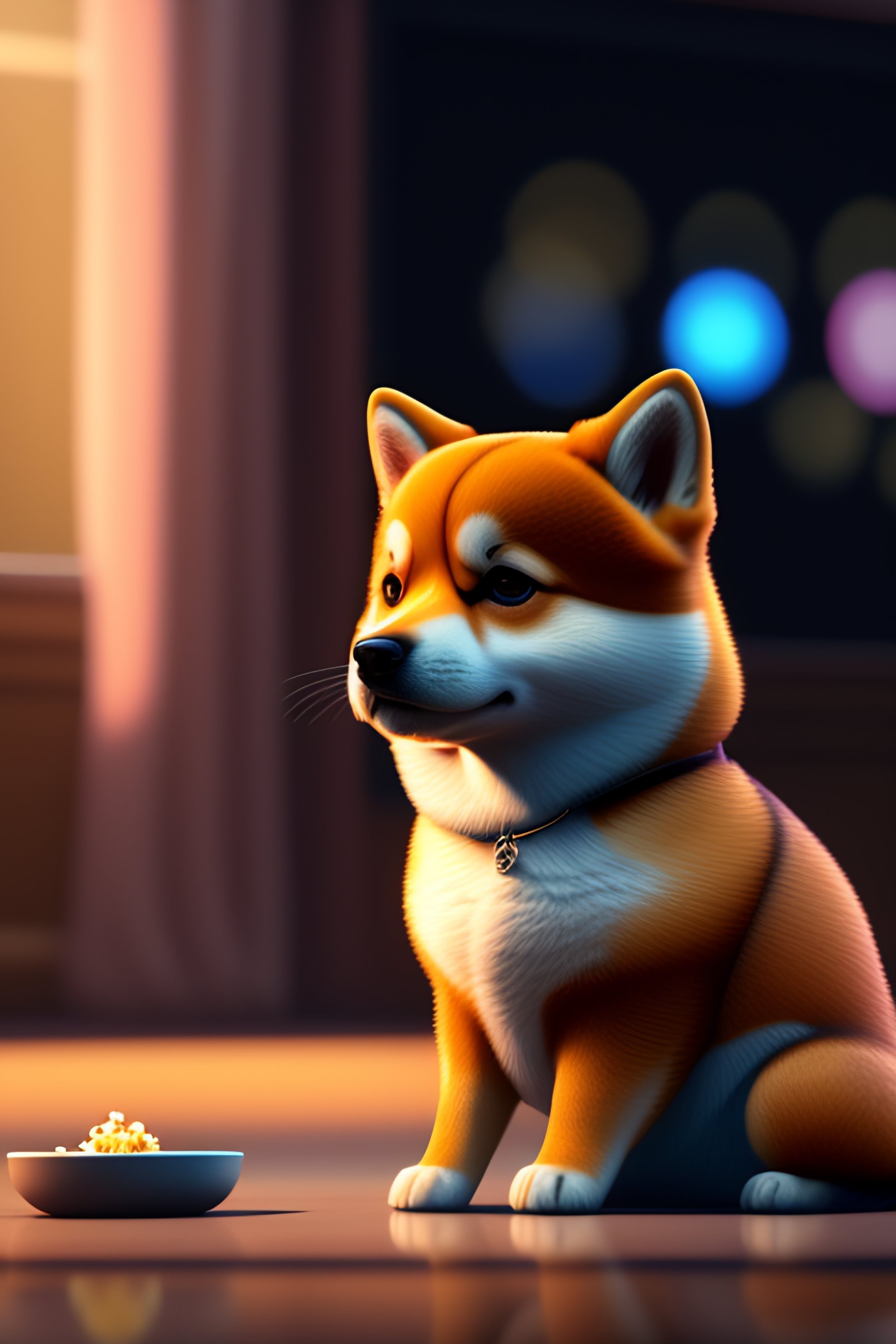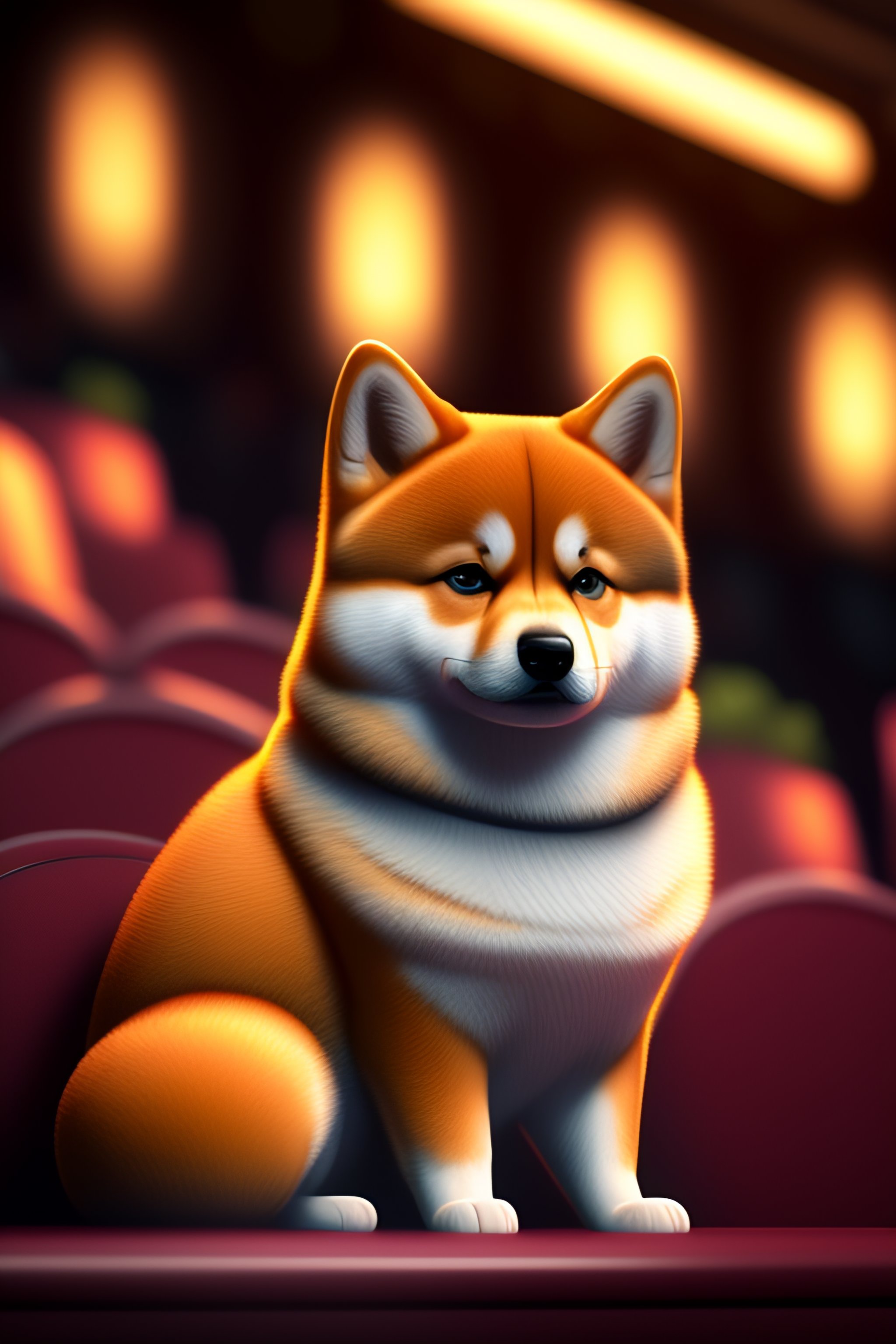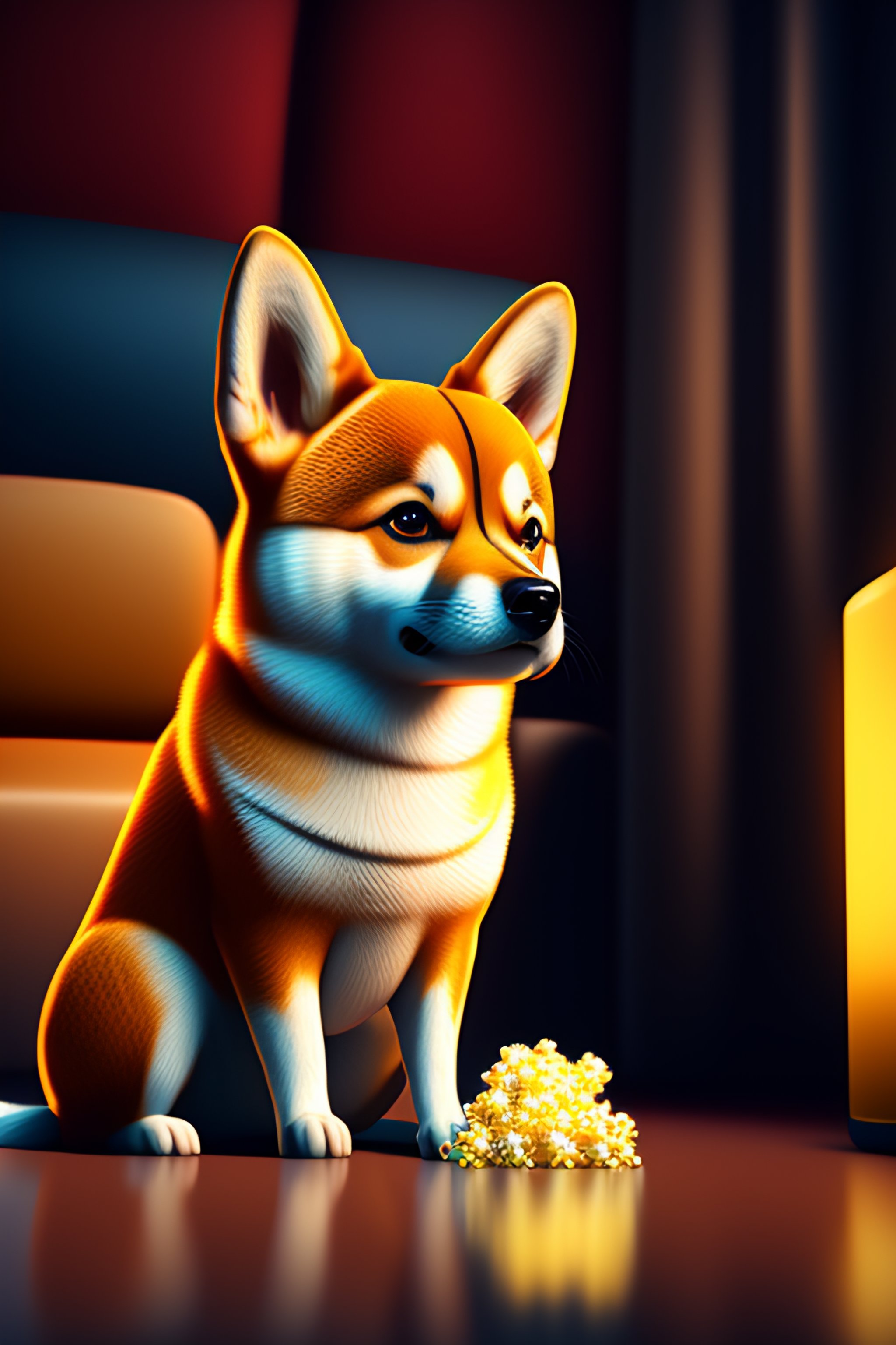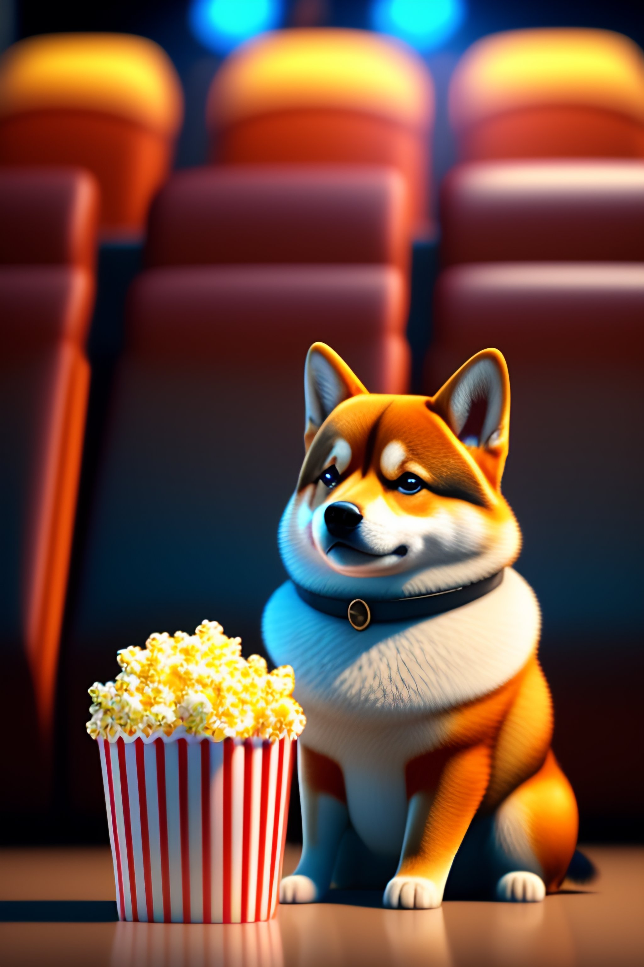 A cute little shiba inu sitting a movie theater eating popcorn while watching a movie, unreal engine, cozy indoor lighting, artstation, detailed, digital painting, cinematic, character design by mark ryden and pixar and hayao miyazaki, unreal 5, daz, hyperrealistic, octane render