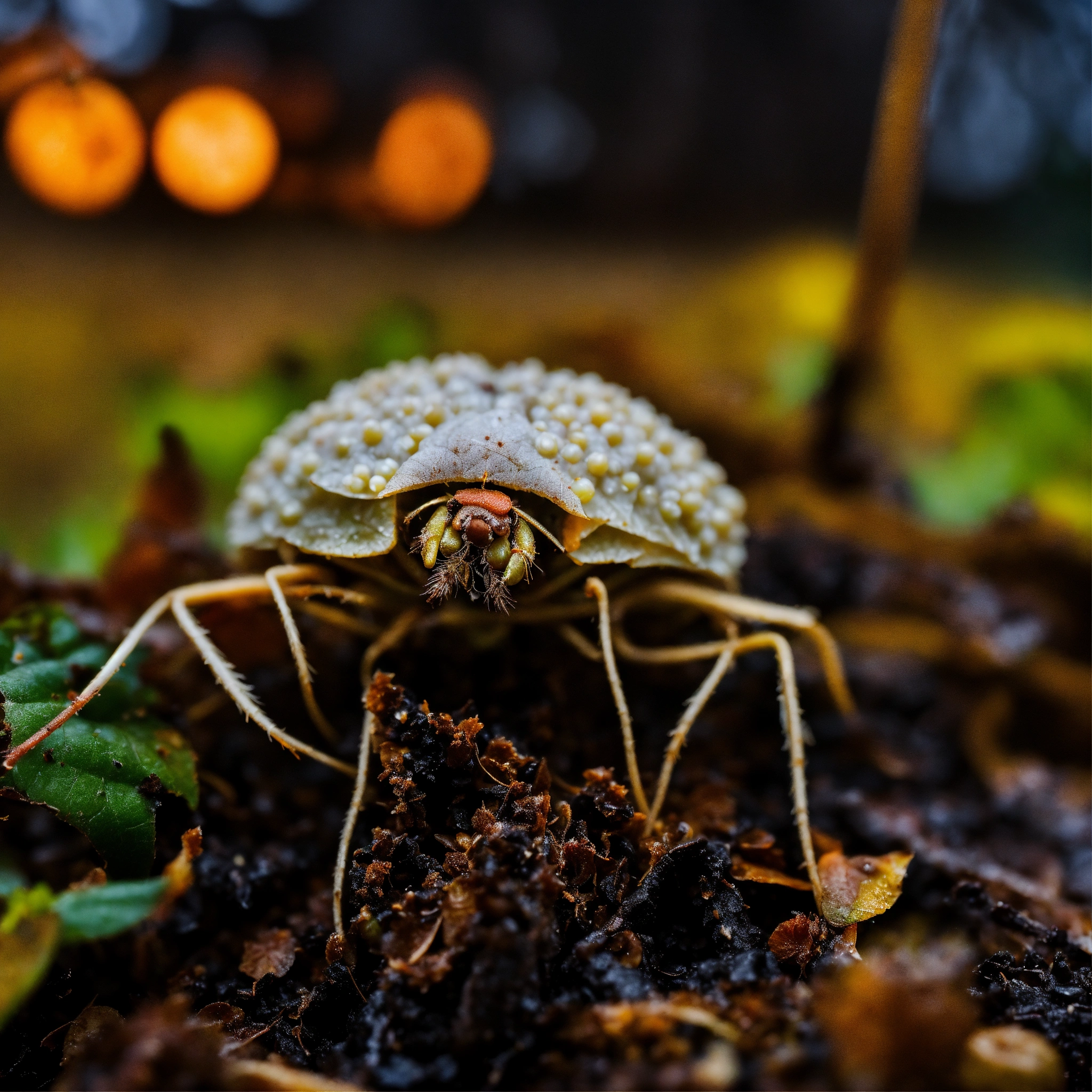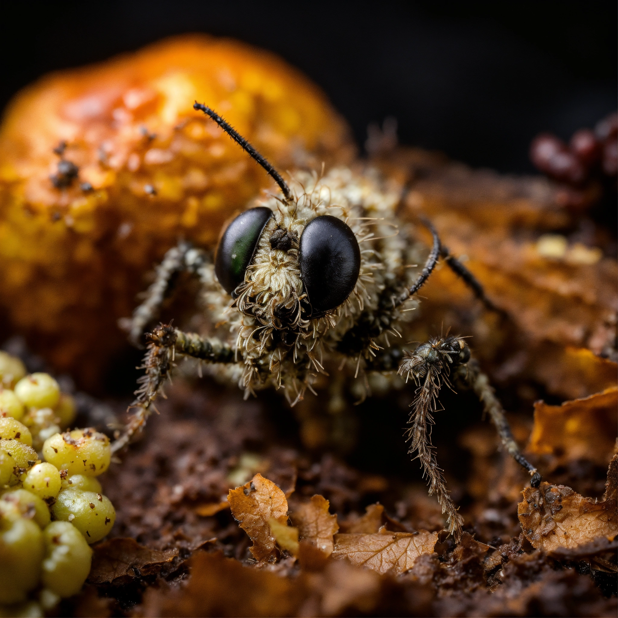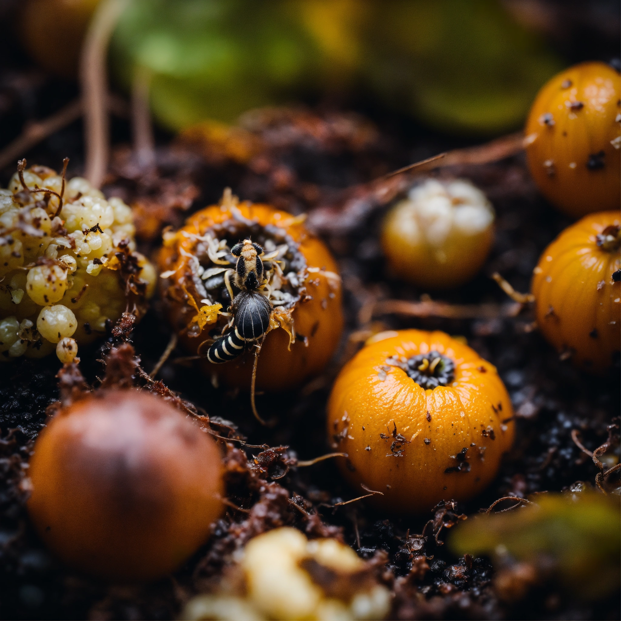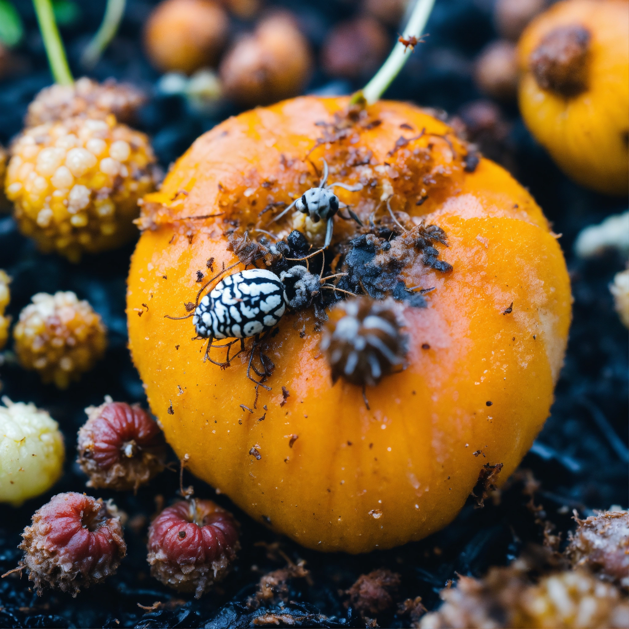 Dark creepy ugly autumn macro photography of dirty and filthy ambient showing some rotten moldy fruits and long white worms and fly larvas coming outside