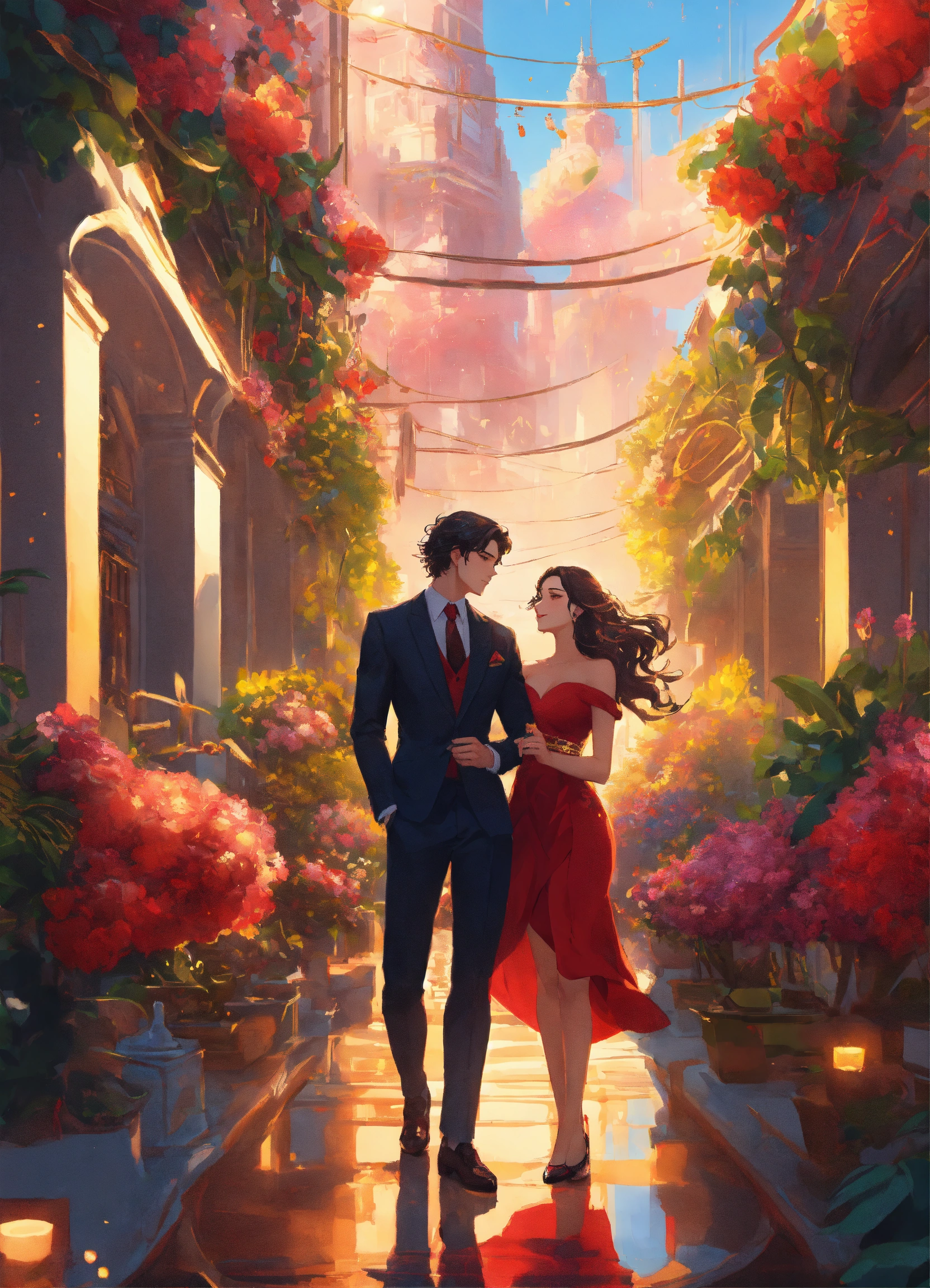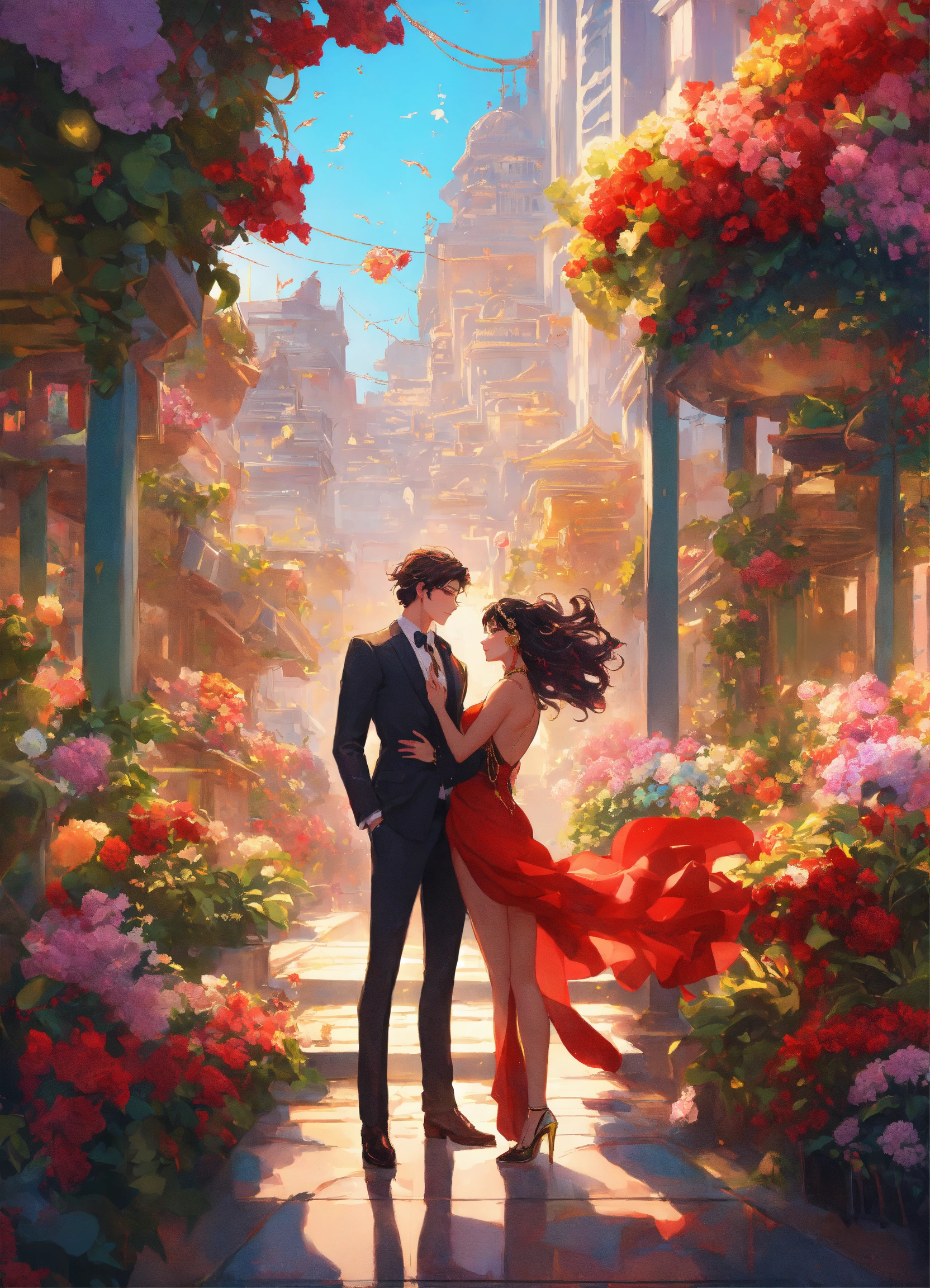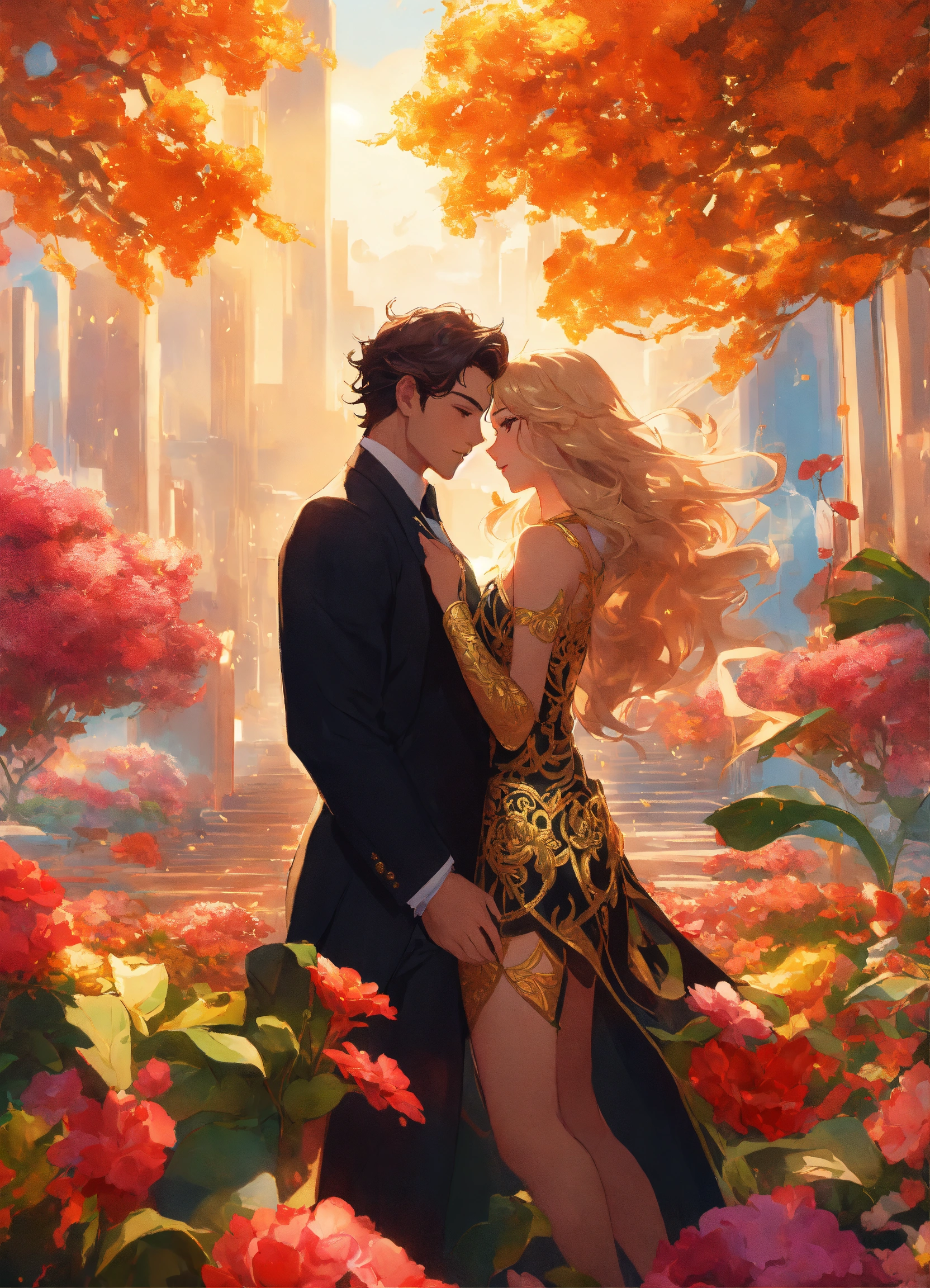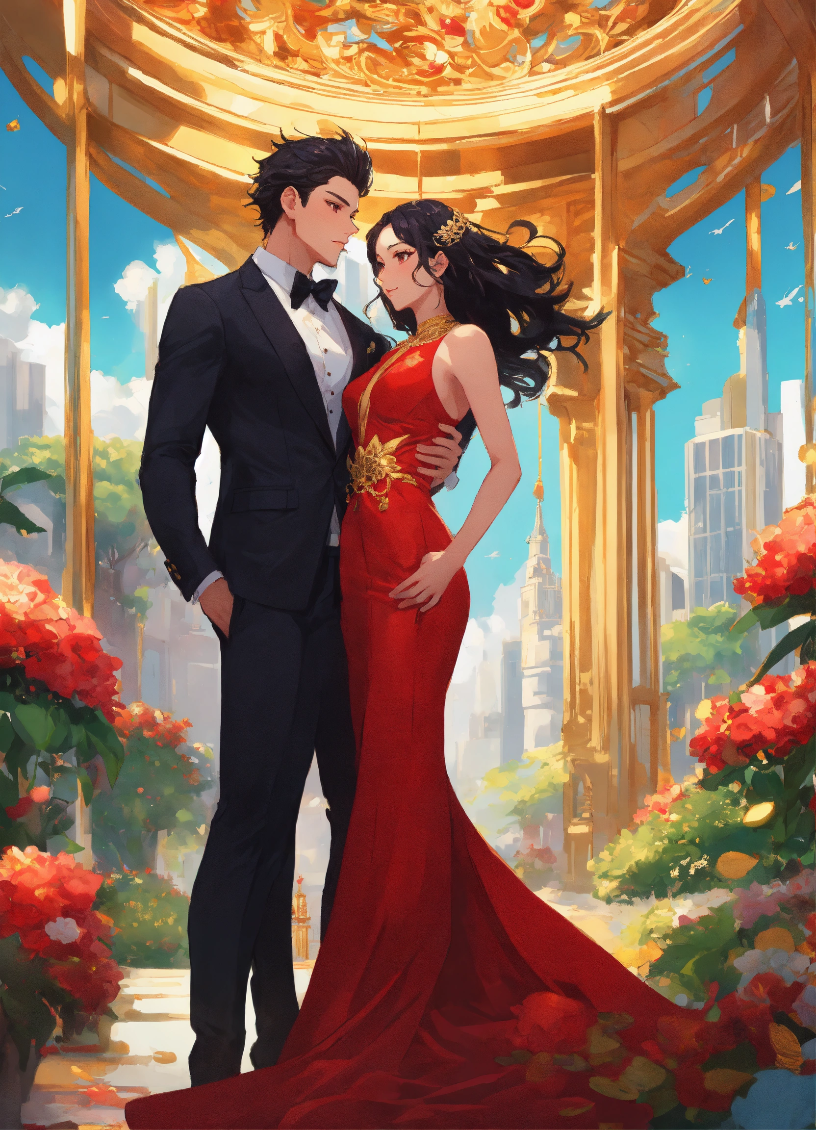 Illustration of beautiful city of towering skyscrapers, islands, vibrant colors, fair skin, the young man wears a intricate black suit with gold ornaments, has wavy black tousled hair, the golden haired woman wears a red intricate dress with gold adornments that shows legs, maximalist, 8k photo, animestyle, by artgerm, by rossdraws, trending on artstation, garden, windy, flowers, circular perspective, romantic, facing each other