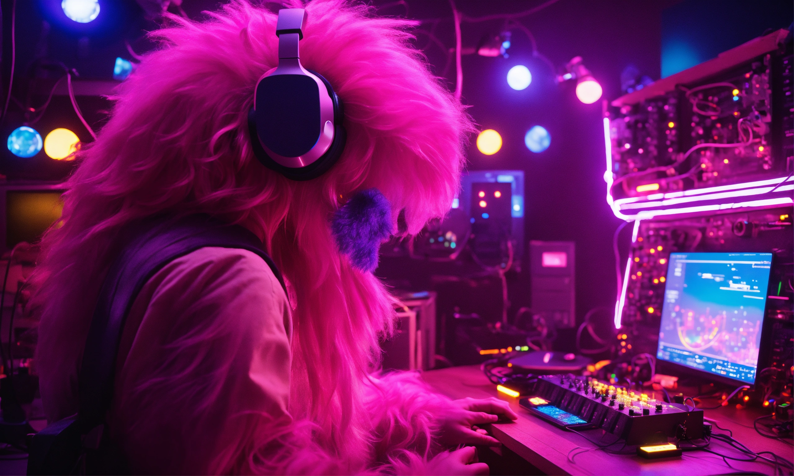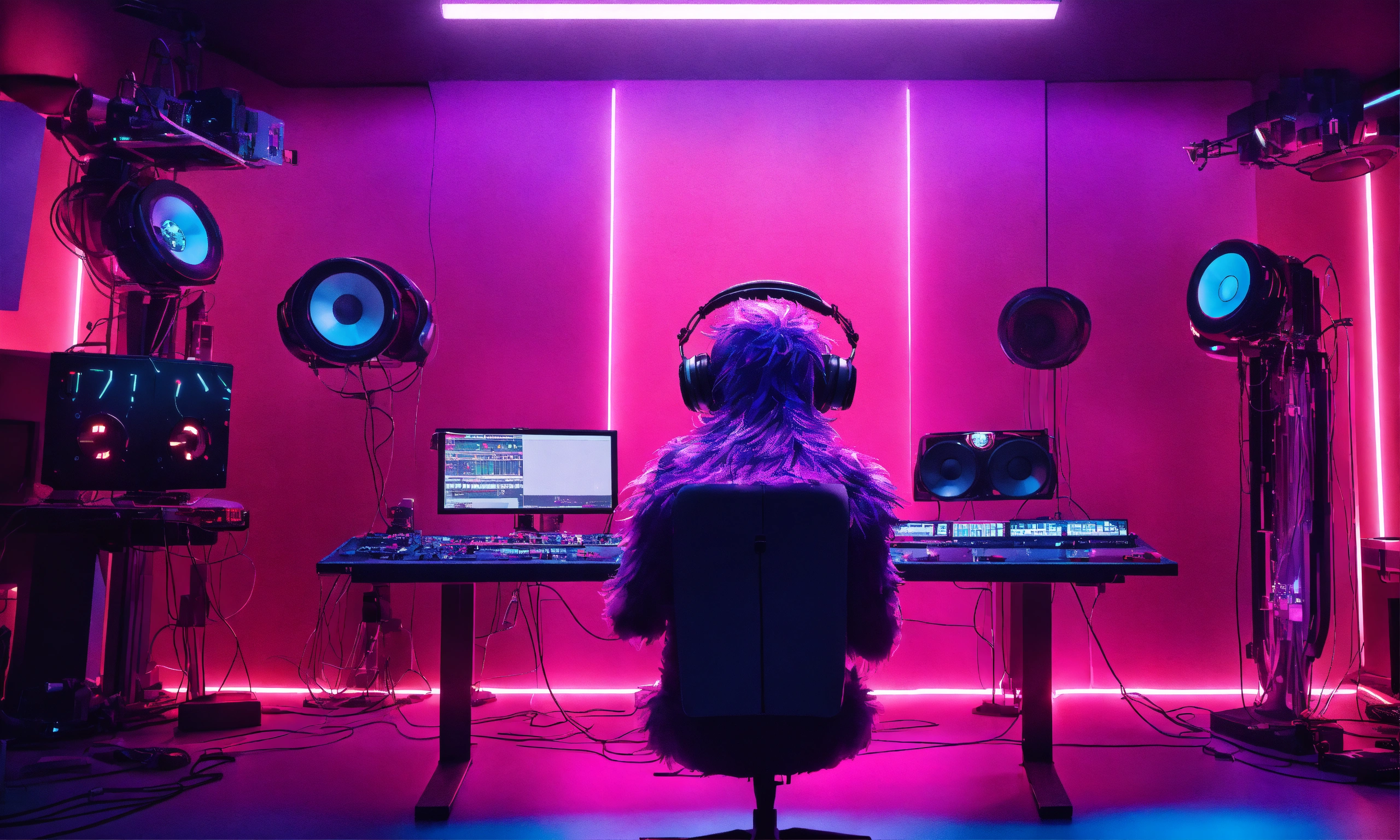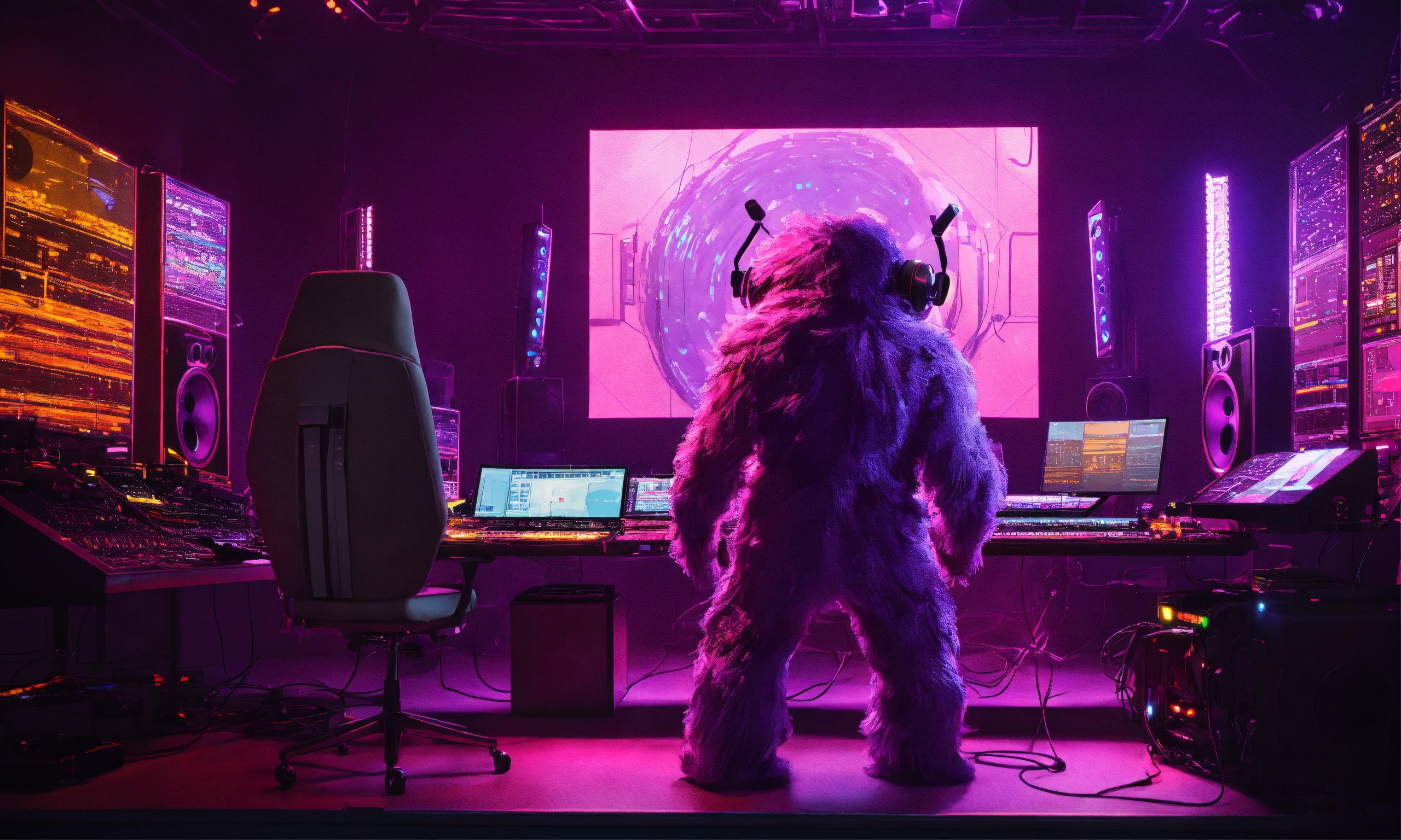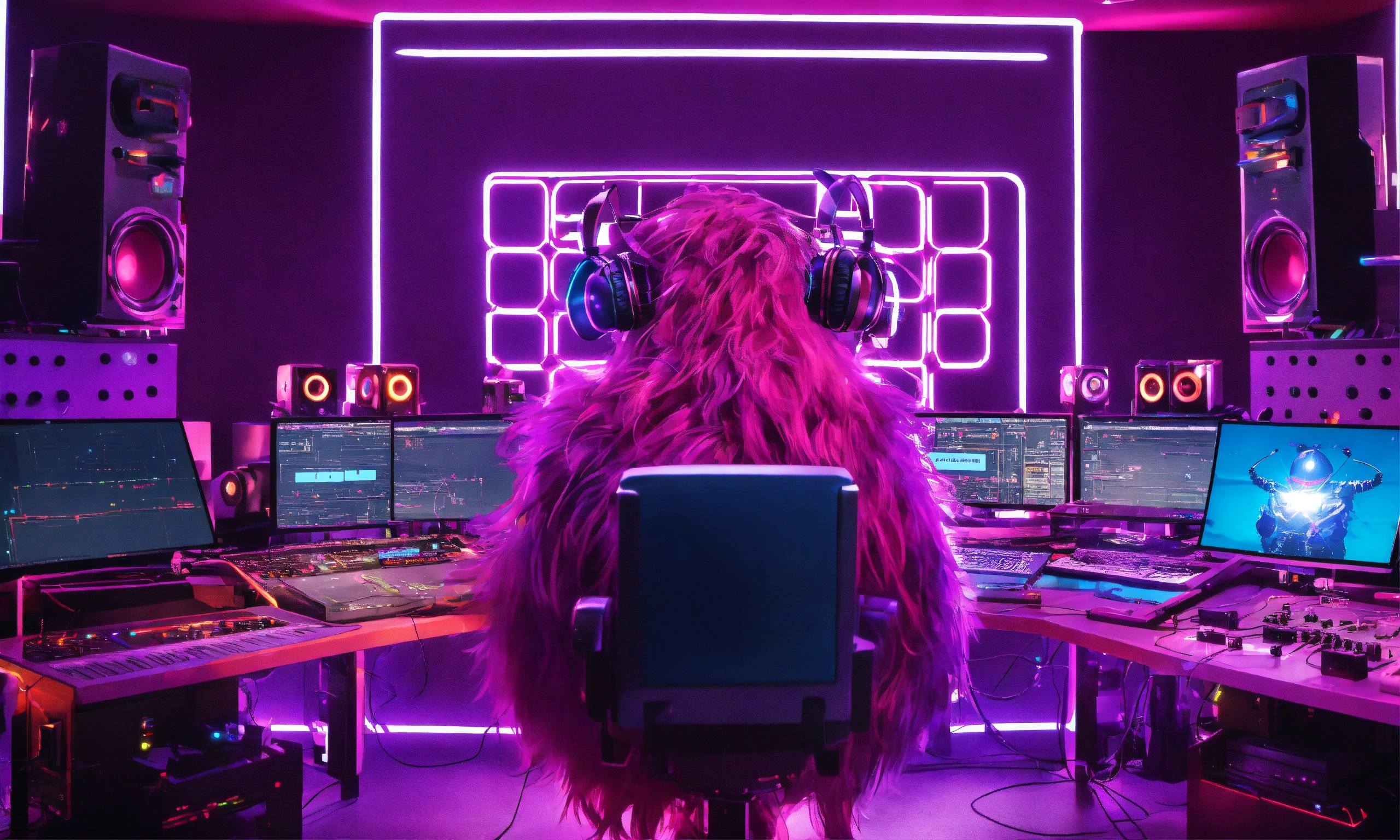 Back view of an oversized huge hairy pink and purple grimace monster, wearing futuristic headphones, sitting at a quantum holographic musical workstation with high tech controls, knobs, and lighted buttons in a studio, hands on controls. there is a boxy silver square friendly robot hovering next to him, pixar, realistic, giant tron illuminated speakers. the room is a mess of wires and cables, fantasy, 3d