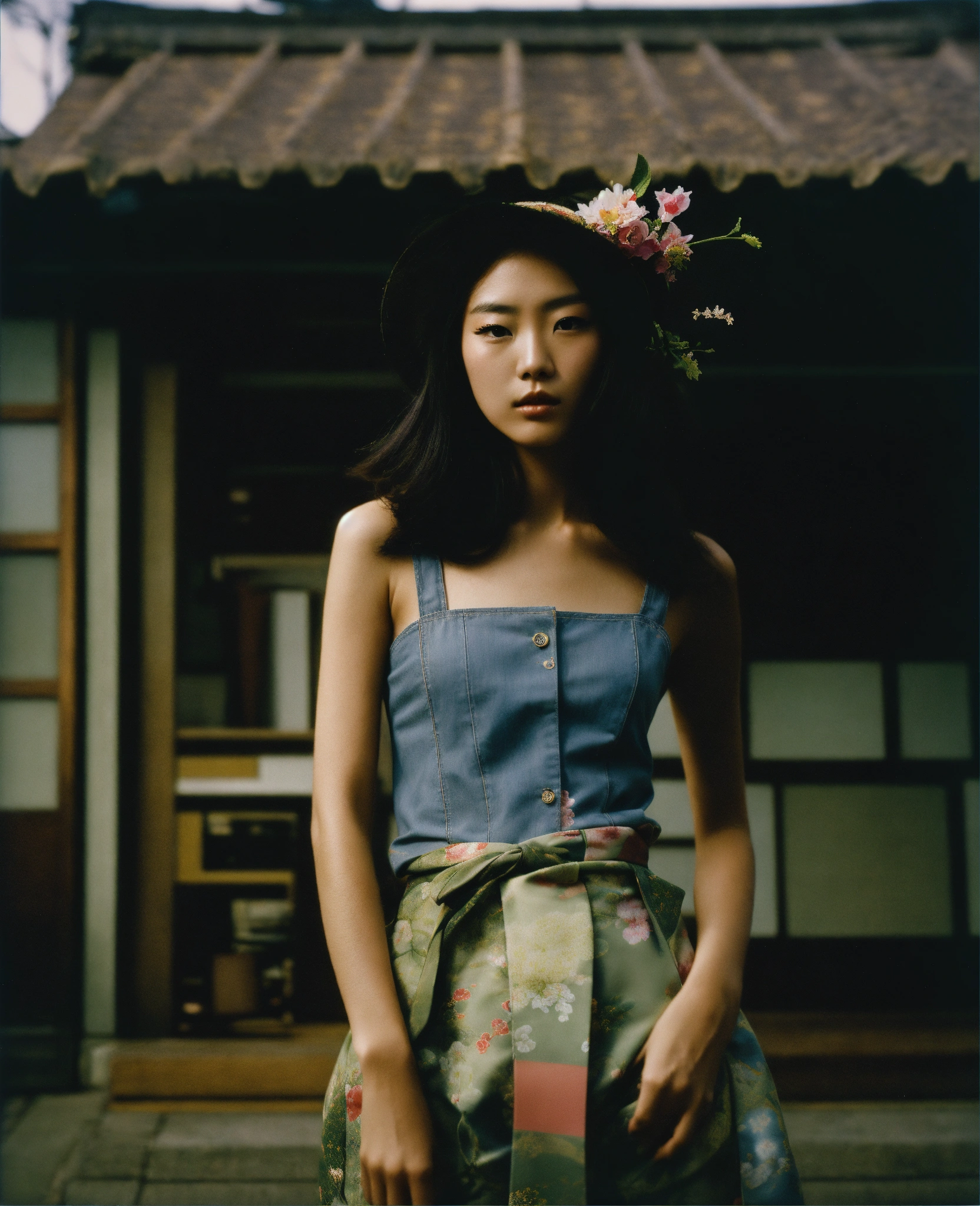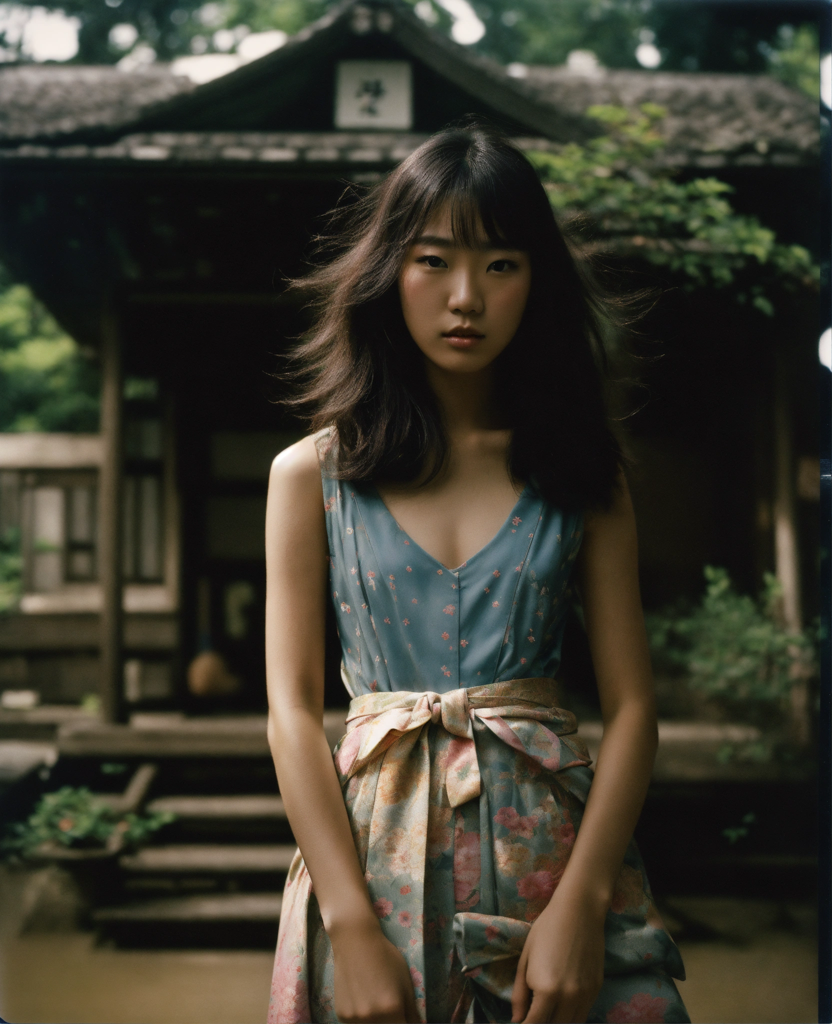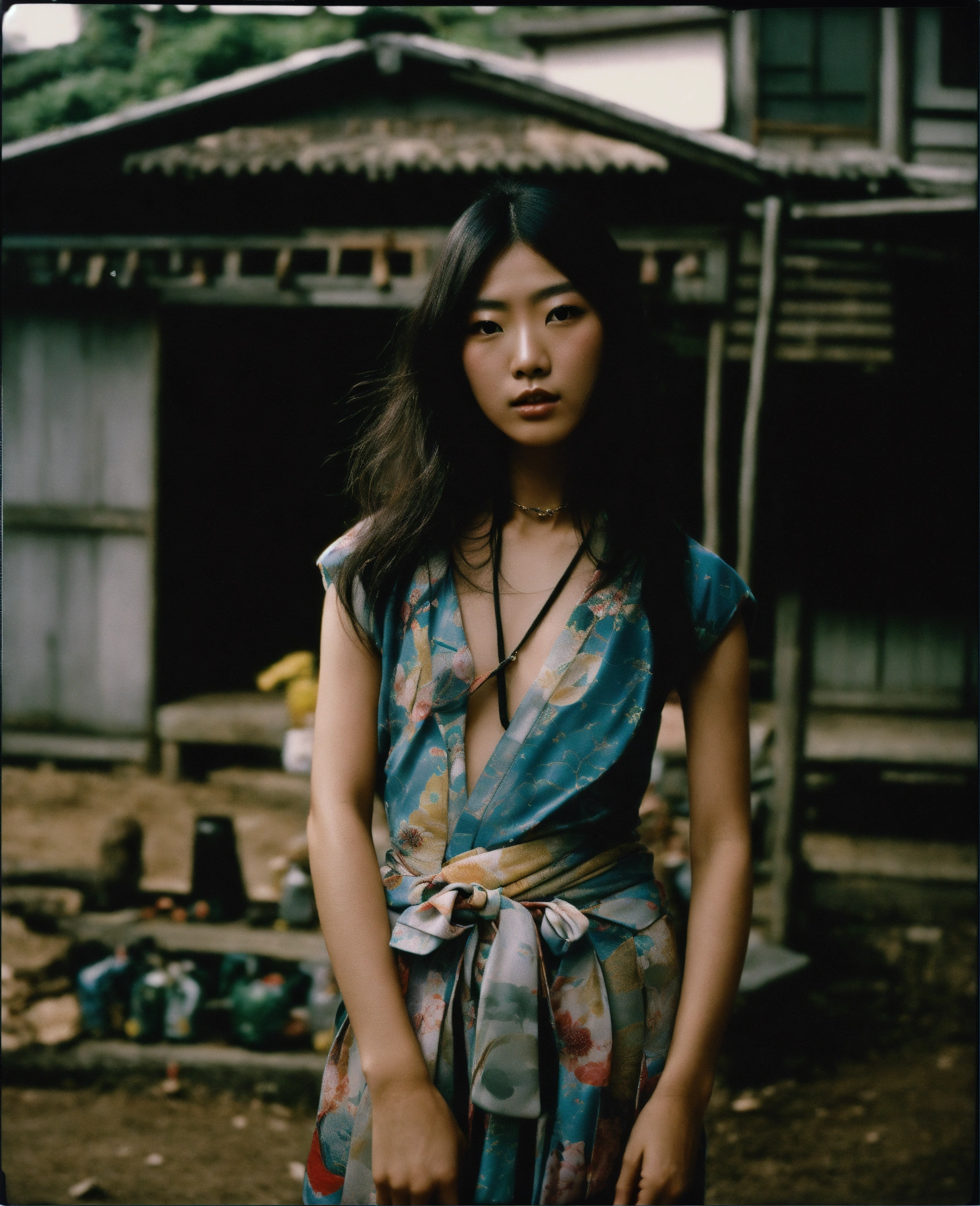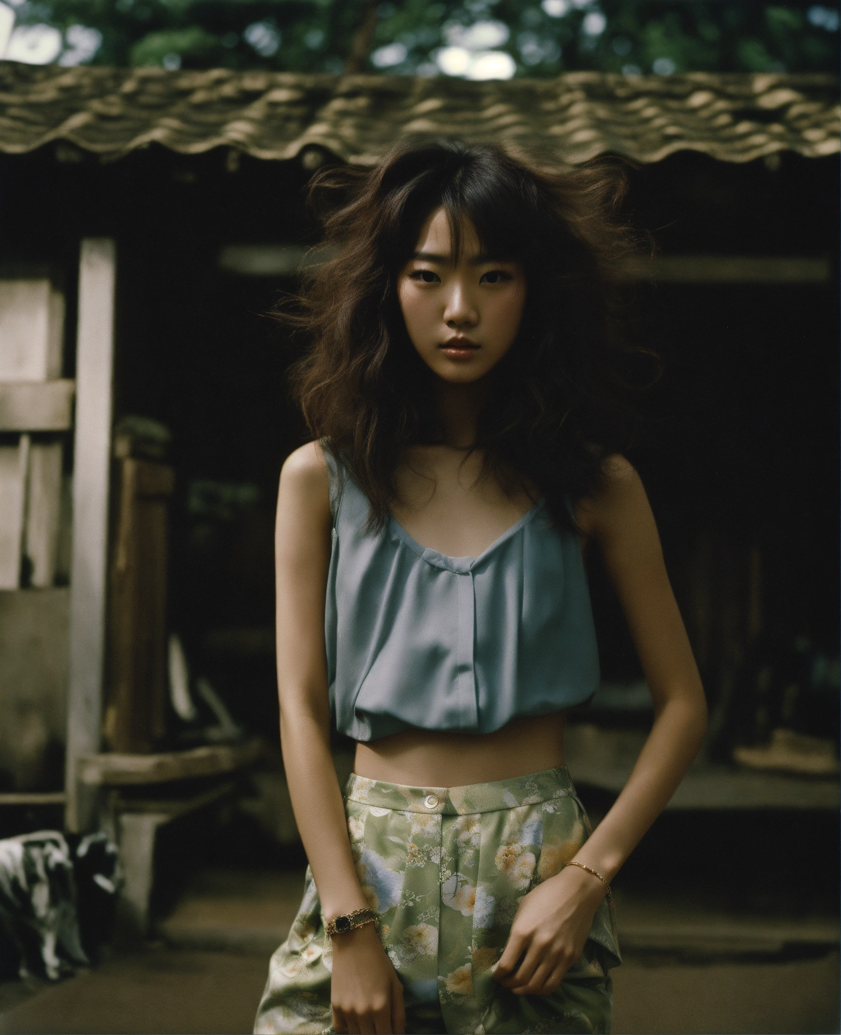 A hyper-realistic polaroid photograph of a japanese fashion model in cool pigamas
