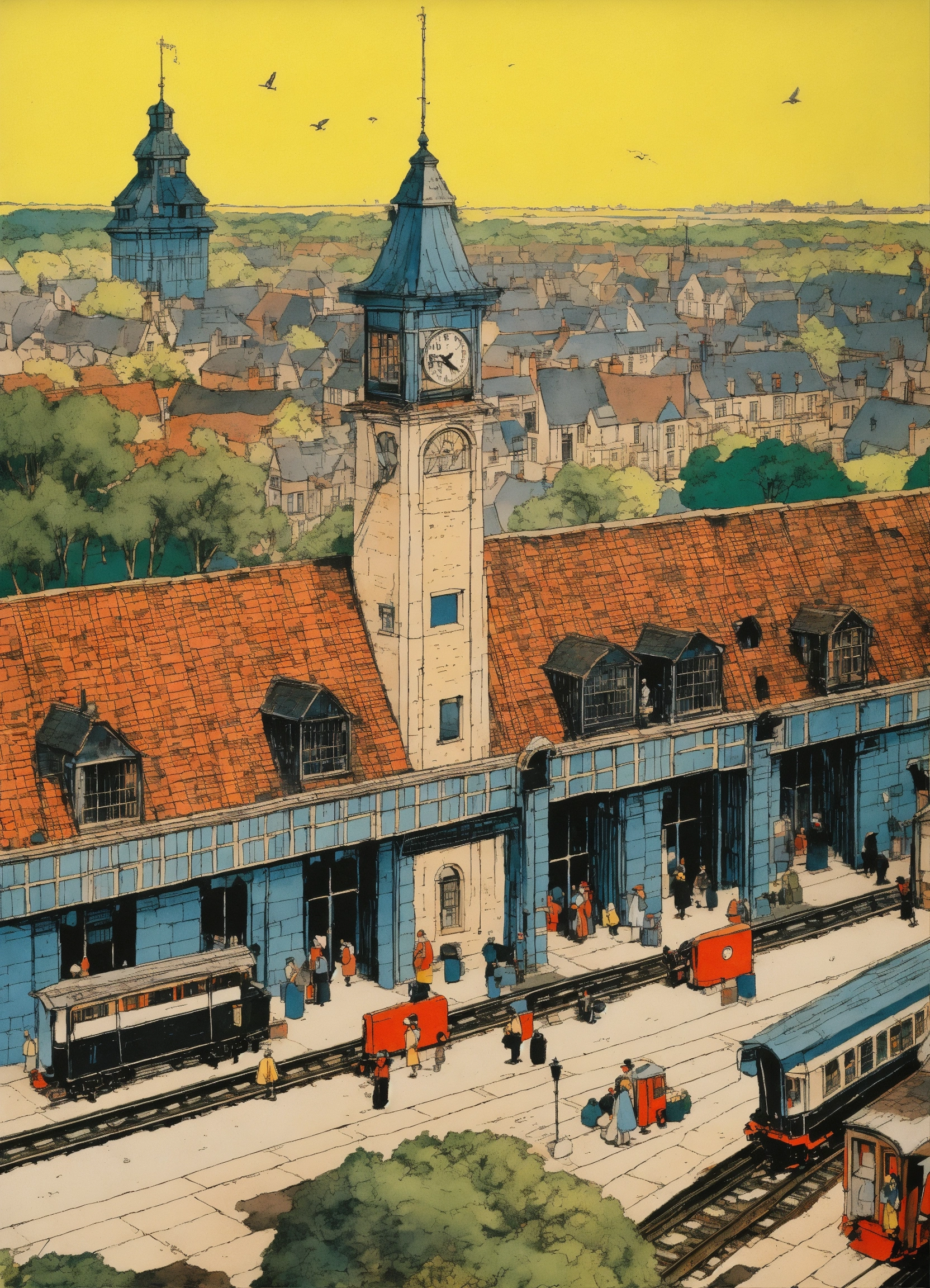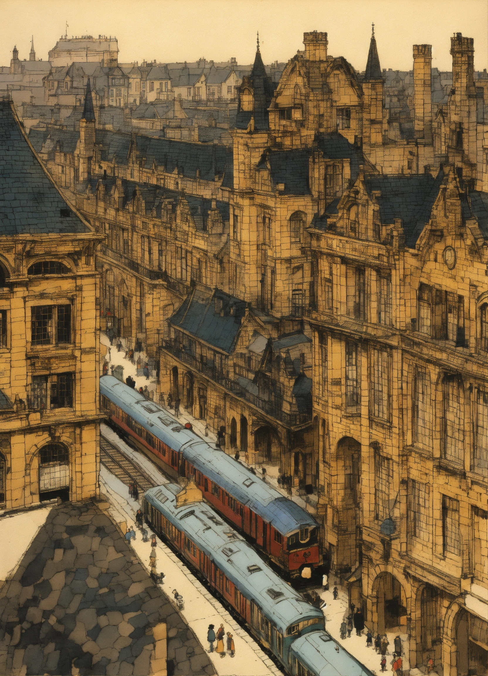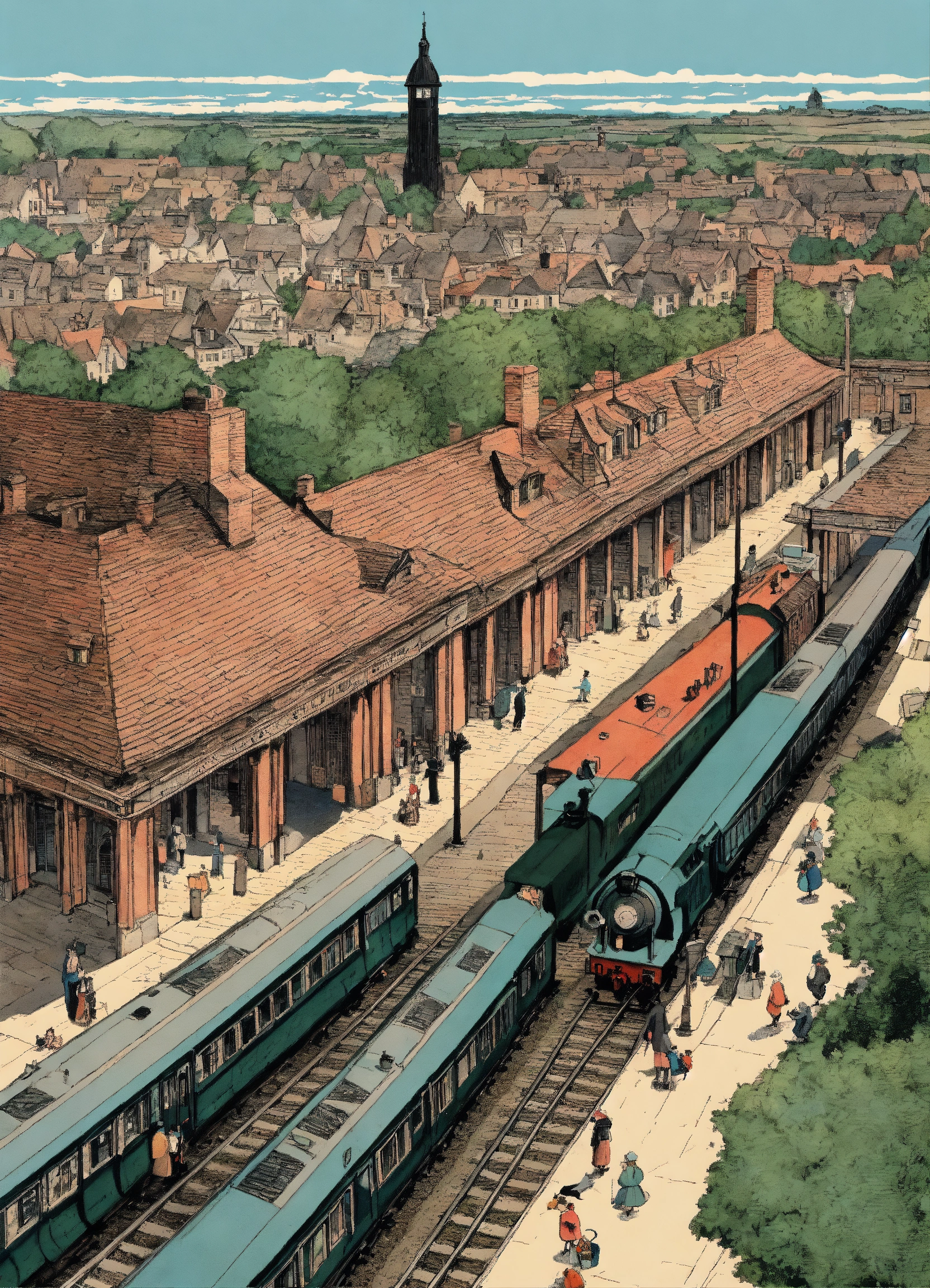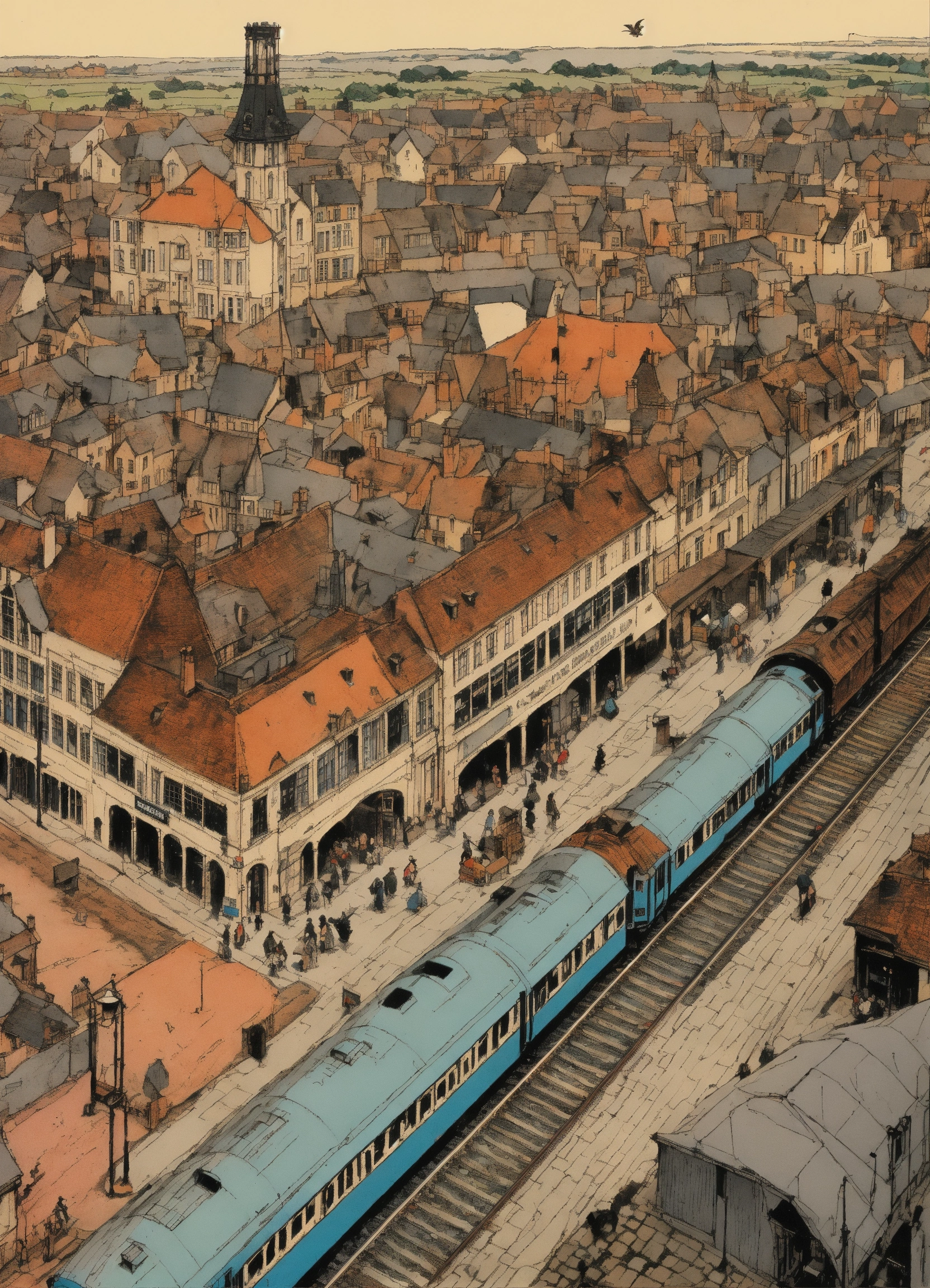 Pen and ink, illustrated by hergé, a birds eye view of an old english train station in a city. sadness, stunning color scheme, high use of black ink, masterpiece