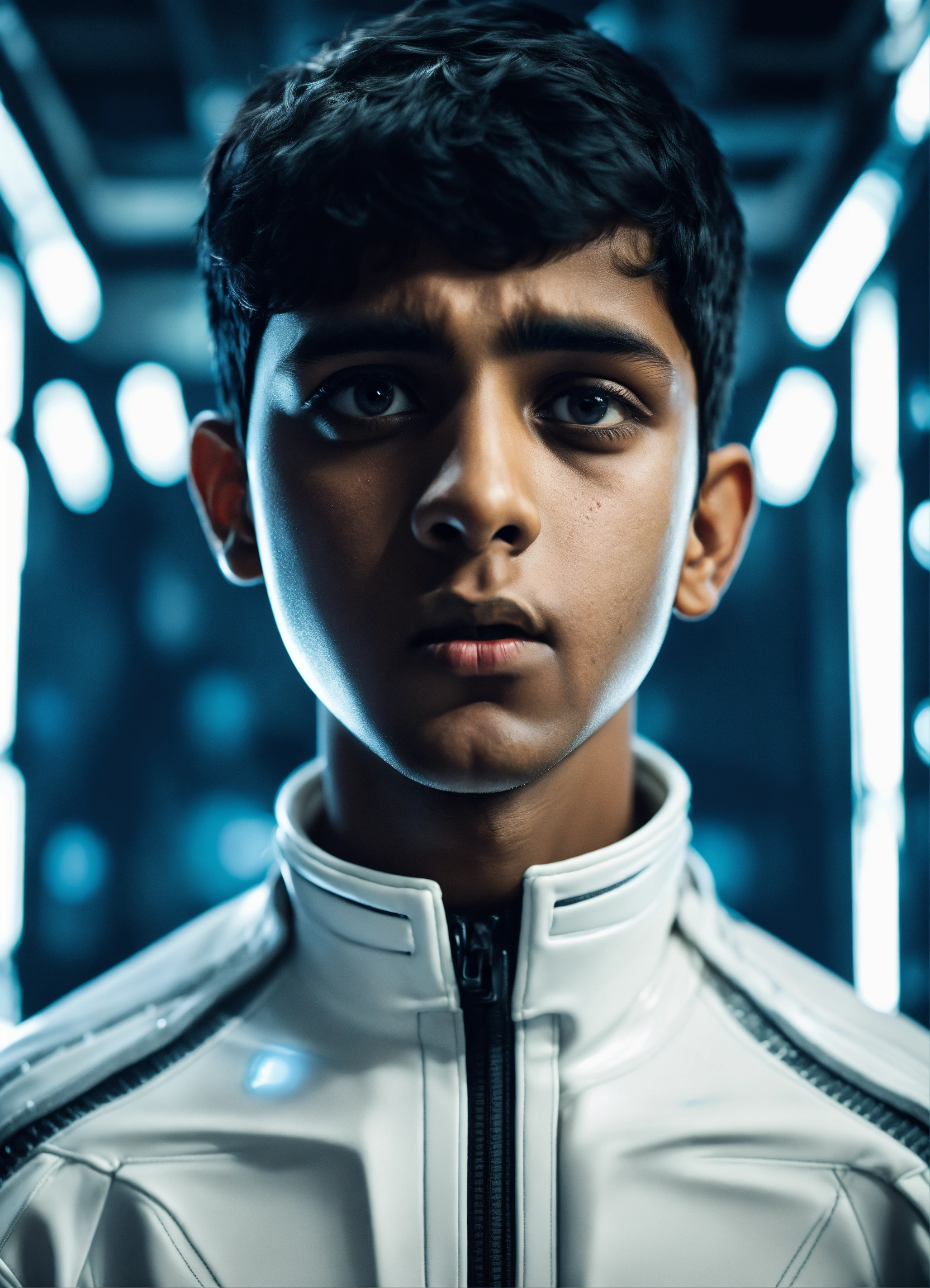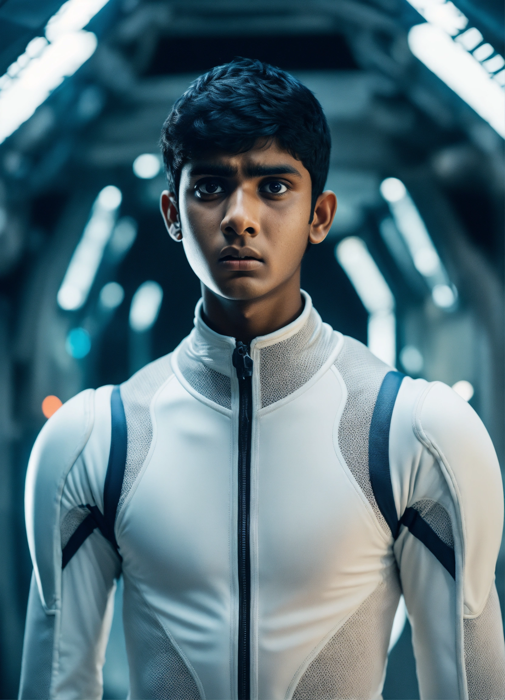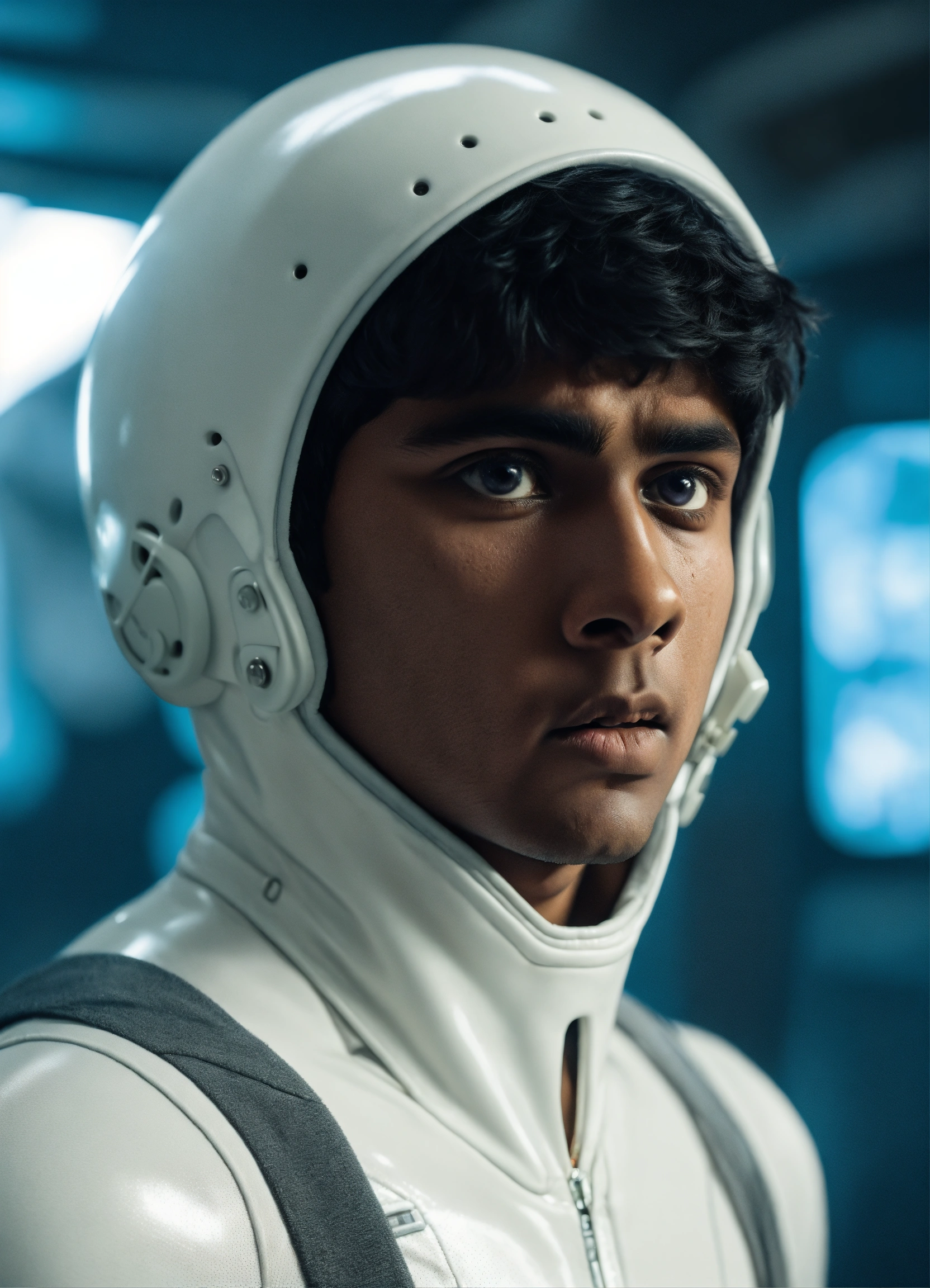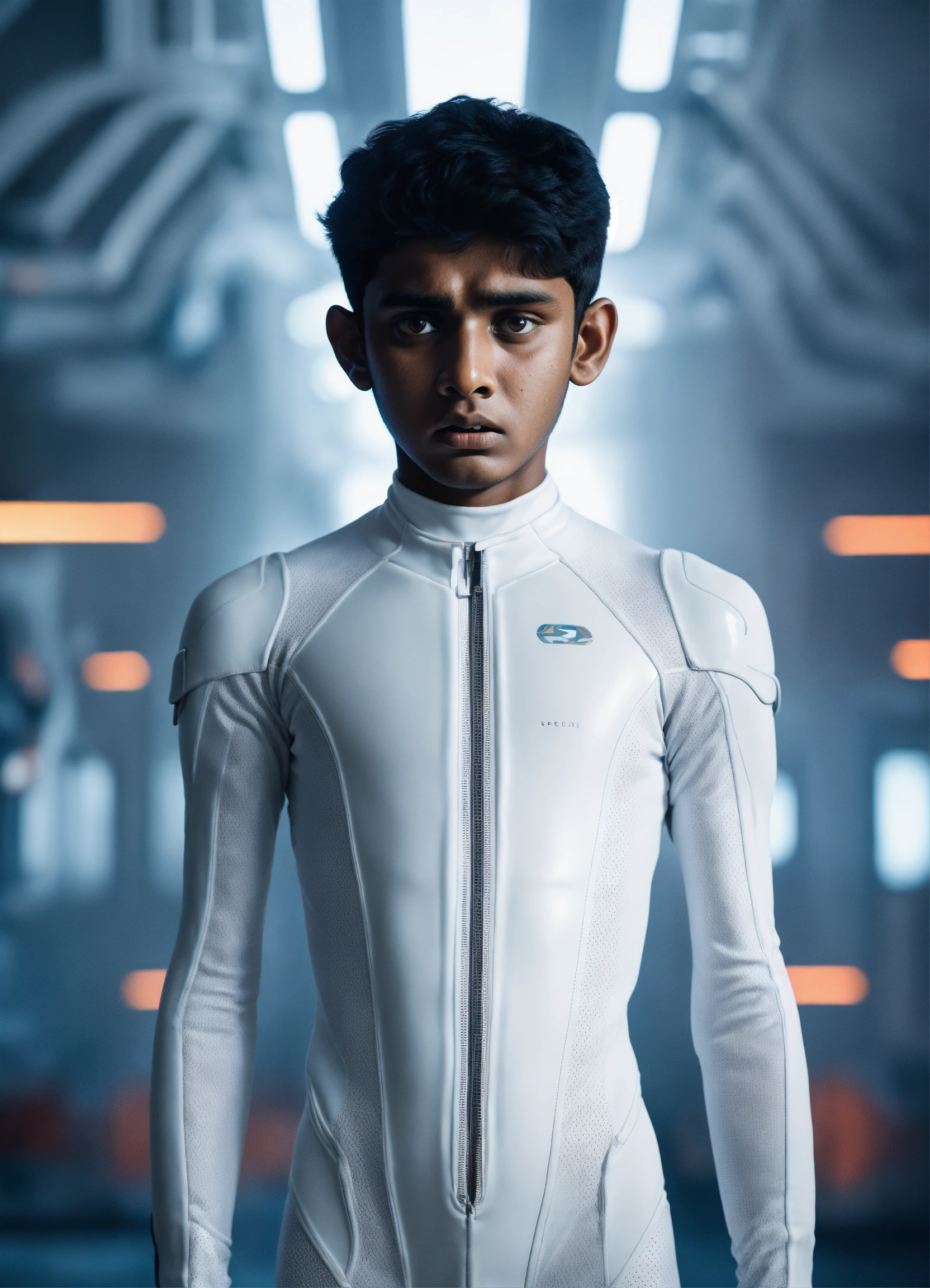 A portrait of a scared 15-years-old indian boy, tall, slim, big nose, very sad expression, terrified face, wearing a white sci-fi tight suit, in a white sci-fi background, hyperdetailed, hyperrealistic, 8k