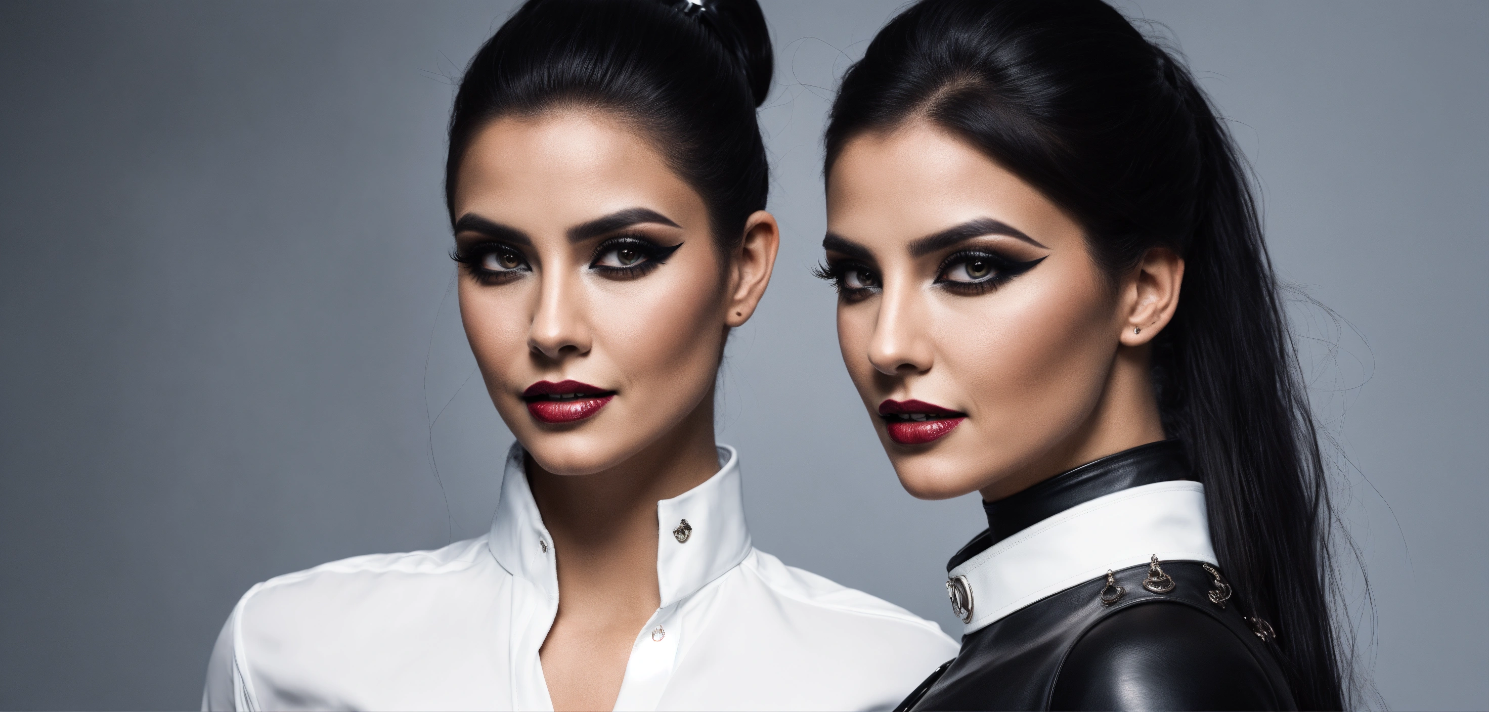 Cinematic look, two stunning arab seductress women equestrian fashion model, arrogant evil smile from above, black straight hair very high ponytail, white office shirt, black leather corset, eyeliner makeup, underworld vampire movie style, ultra-realistic; solid white background; no background
