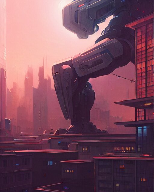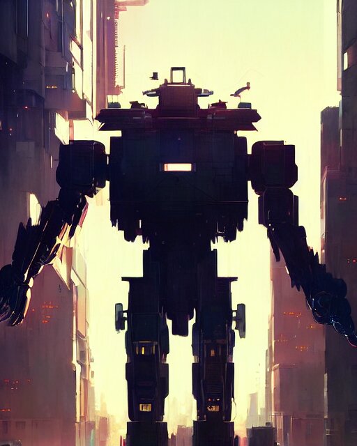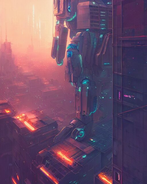 Giant robot destroying futuristic city, digital painting by ilya kuvshinov, greg rutkowski, wlop, james jean, victo ngai, beautifully lit, muted colors, highly detailed, dynamic pose, artstation, fantasy art, ( ( ( intricate background ) ) ) by craig mullins, thomas kinkade