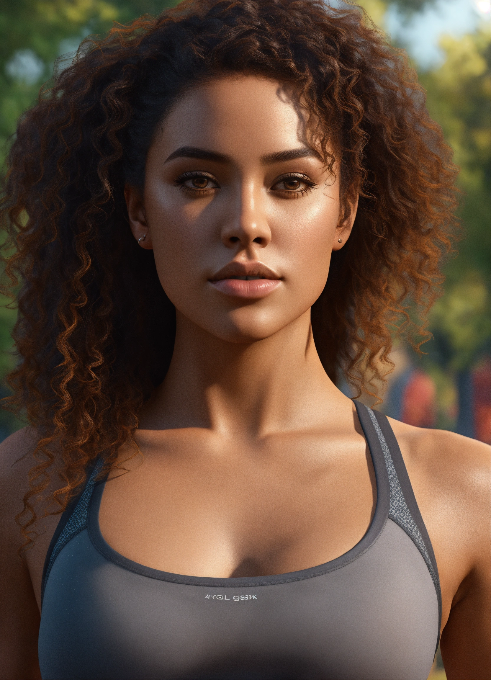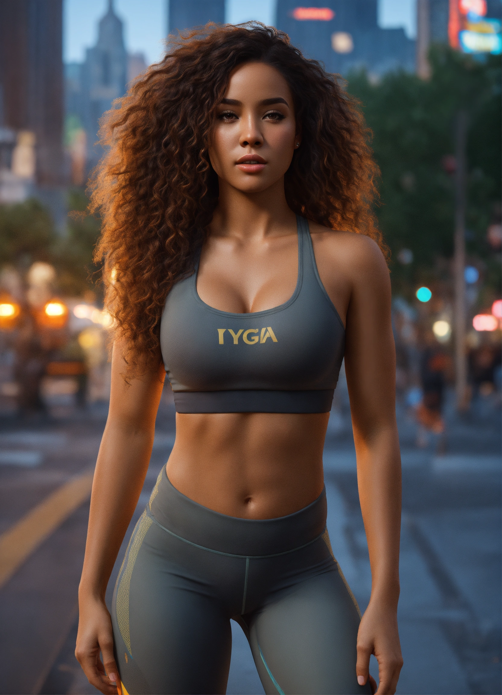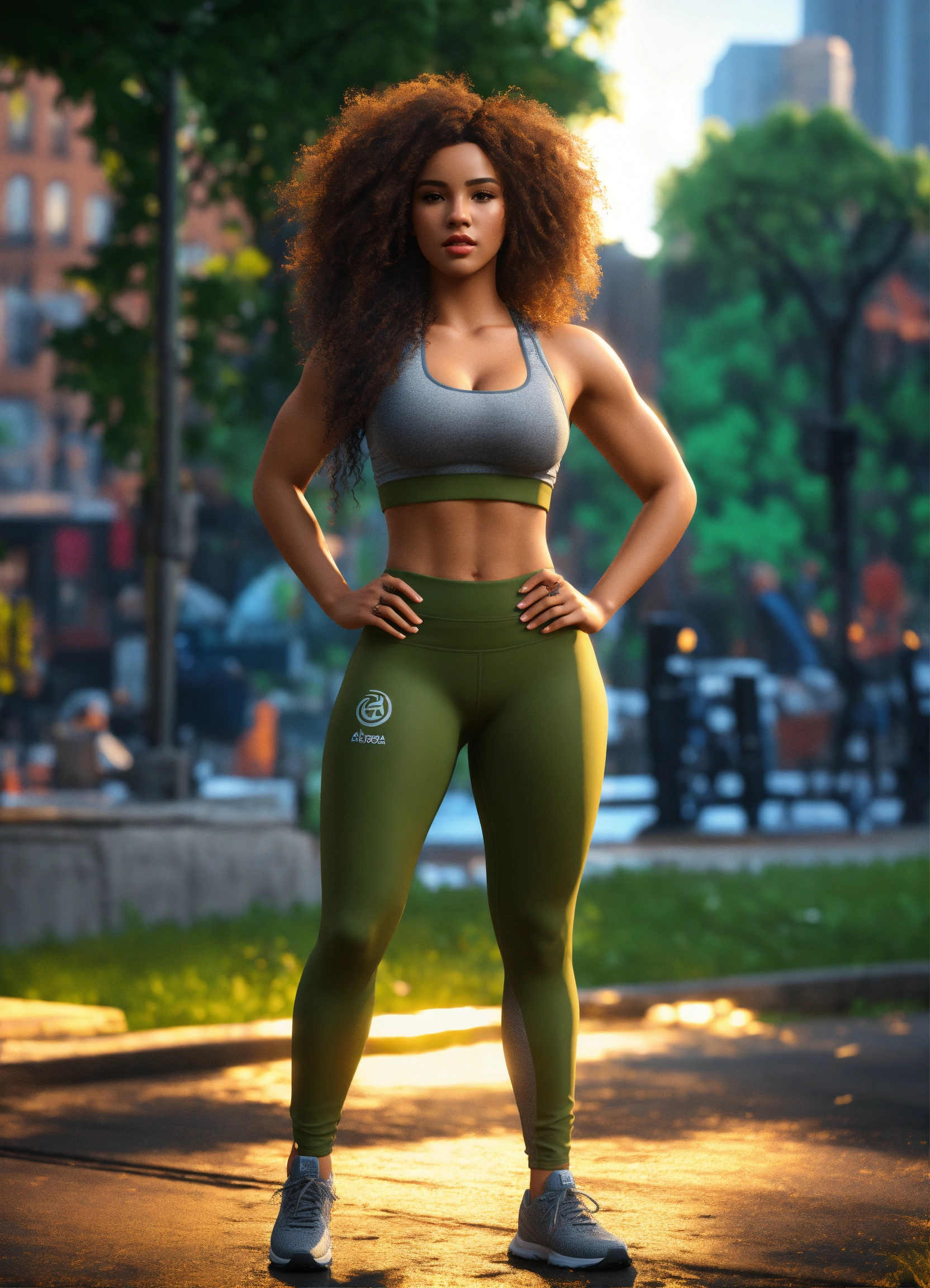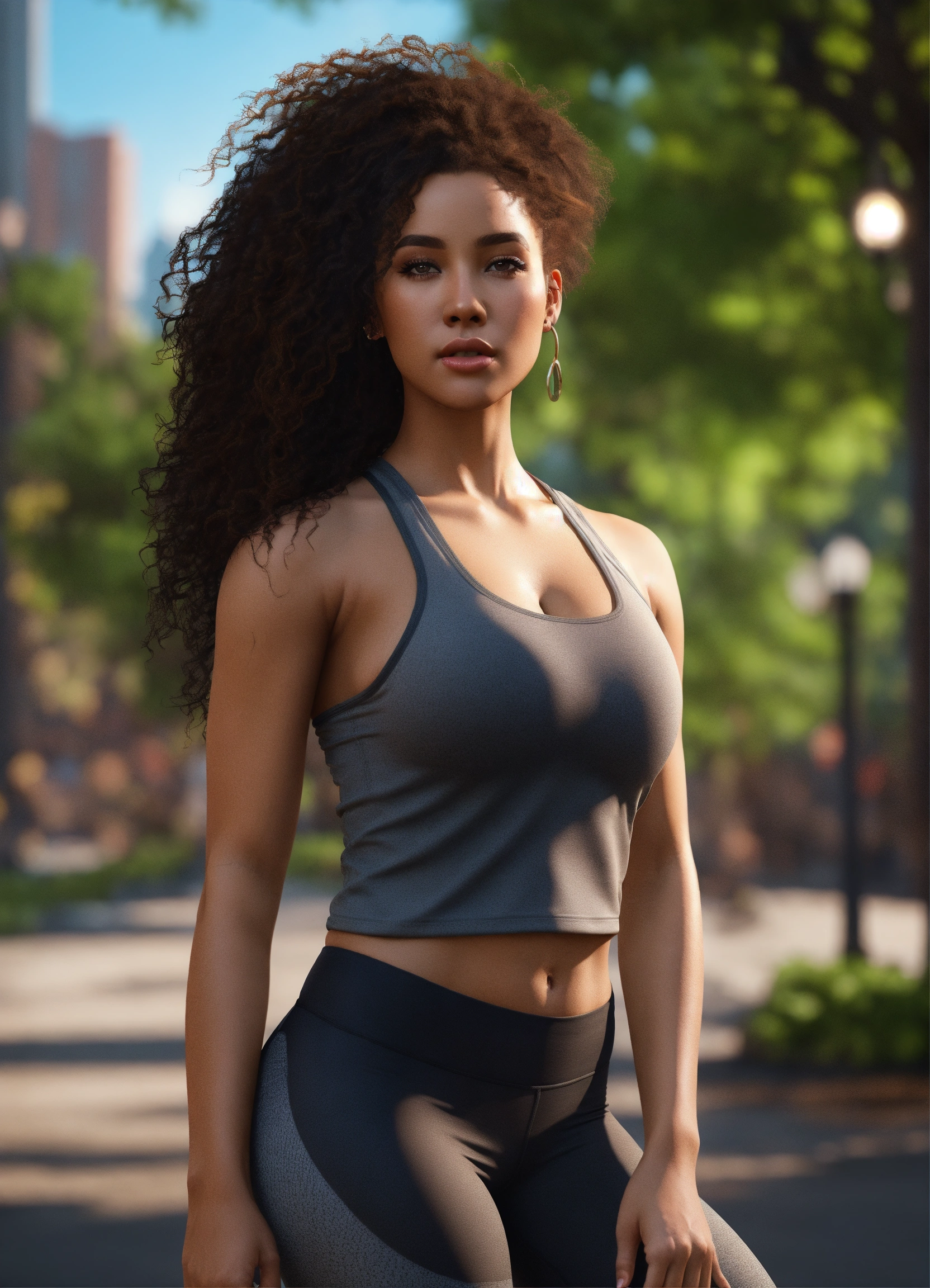 Full body of a beautiful, dominican female, with long curly hair, perfect face and full lips, wearing yoga pants and workout gear, in a new york city park, full body, 8k resolution concept art portrait dynamic lighting hyperdetailed intricately detailed splash art trending on artstation unreal engine 5 volumetric lighting