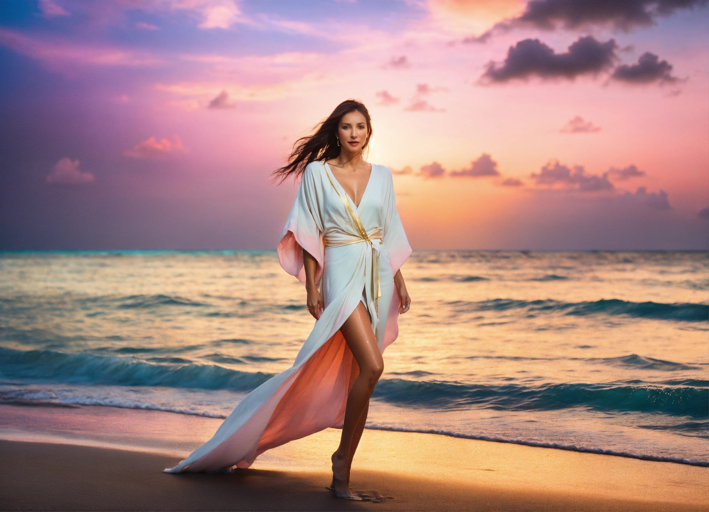 3d realistic full body photo of flamboyant energetic fierce italian model modeling dolman sleeve wrap donna karan upscale denim, white and gold beach outfit and jewelry in heavy tropical wind standing in ocean water to her knees half wet at golden hour full of pink light in maldives and bokeh tropical foliage