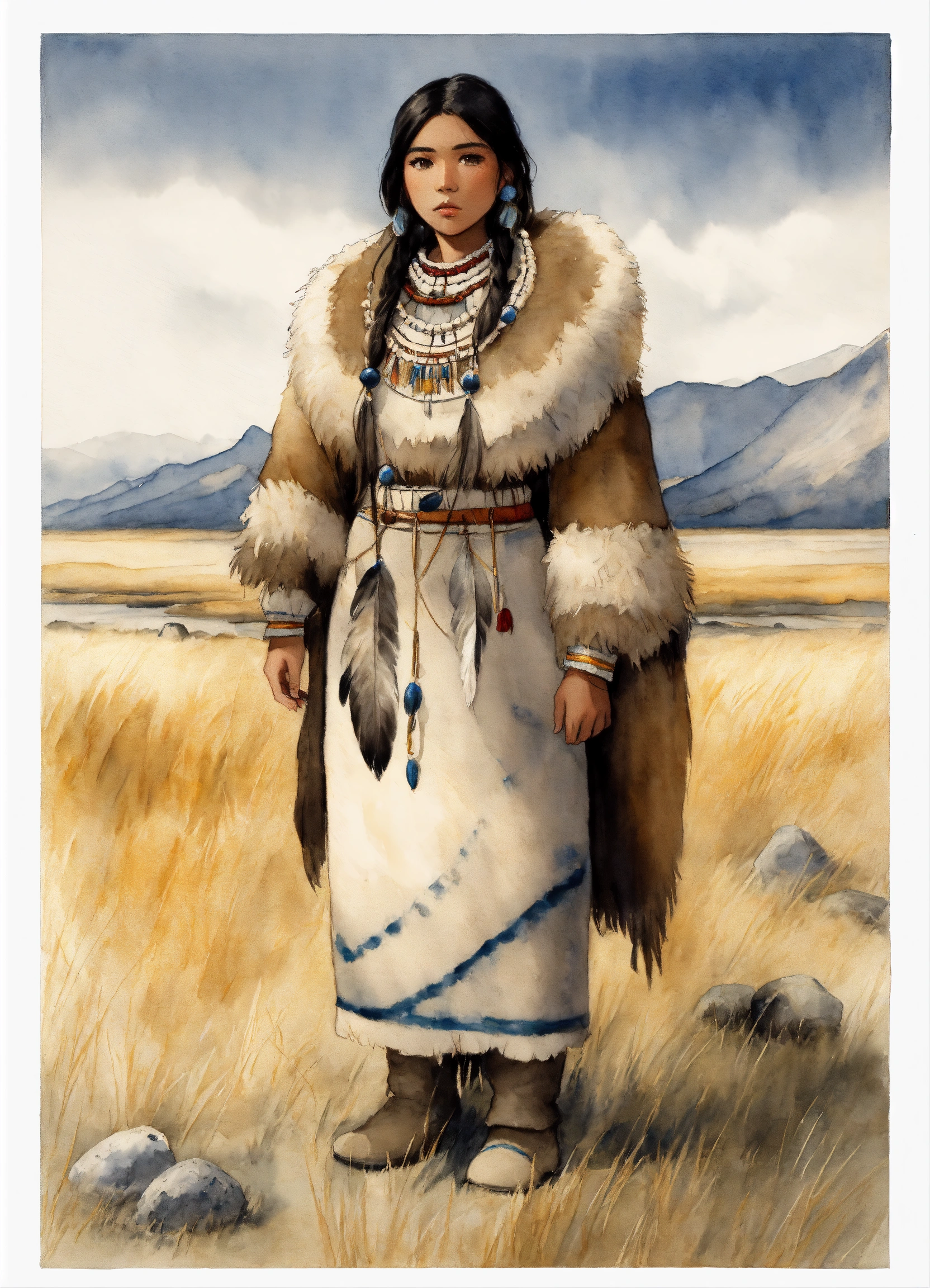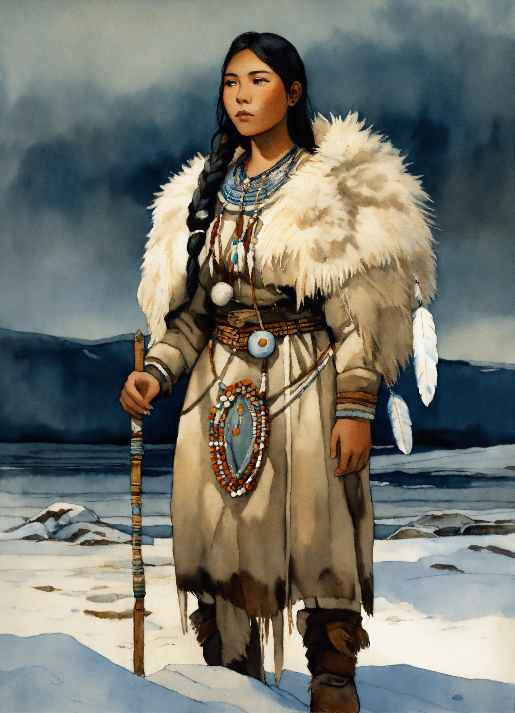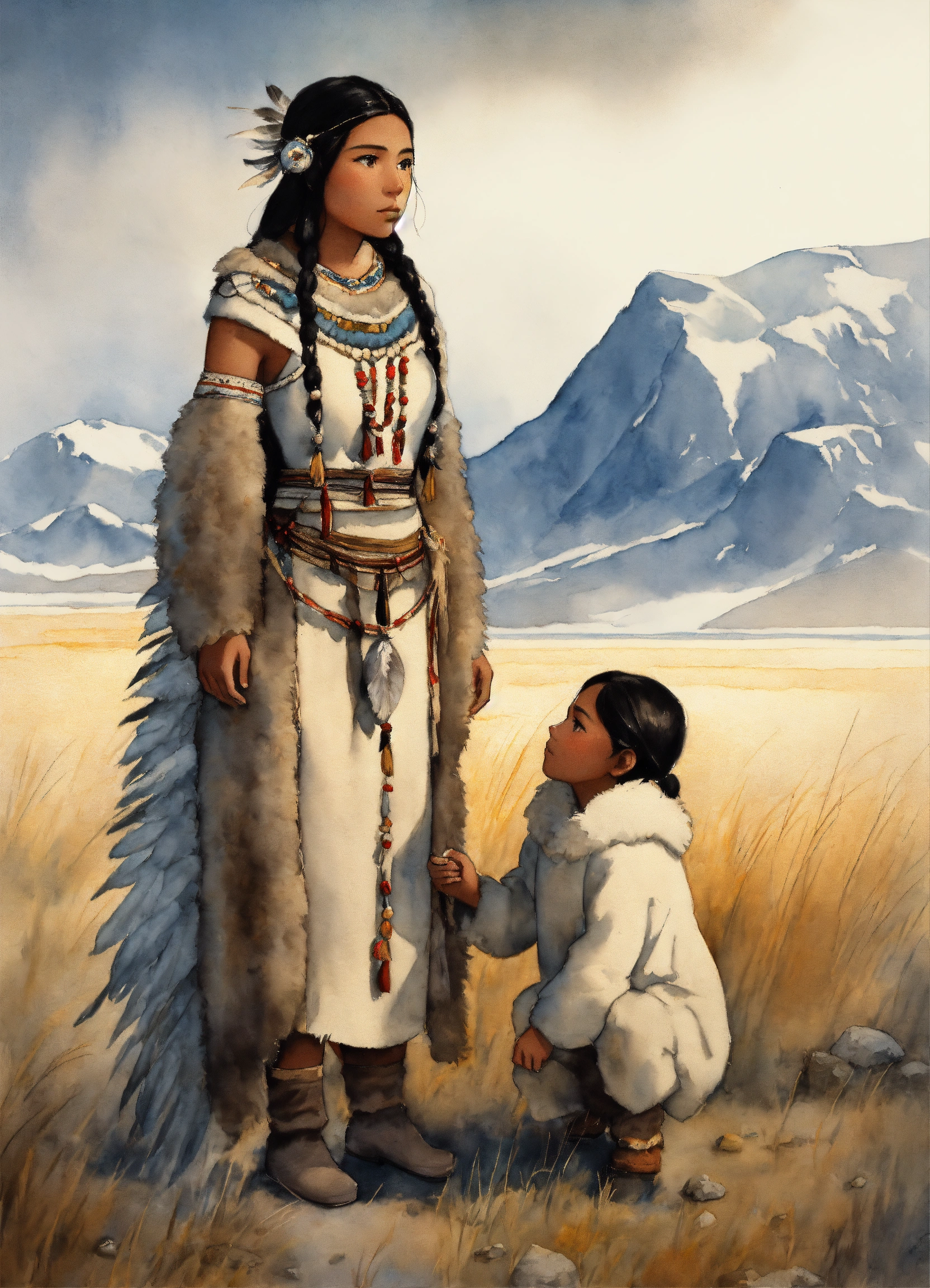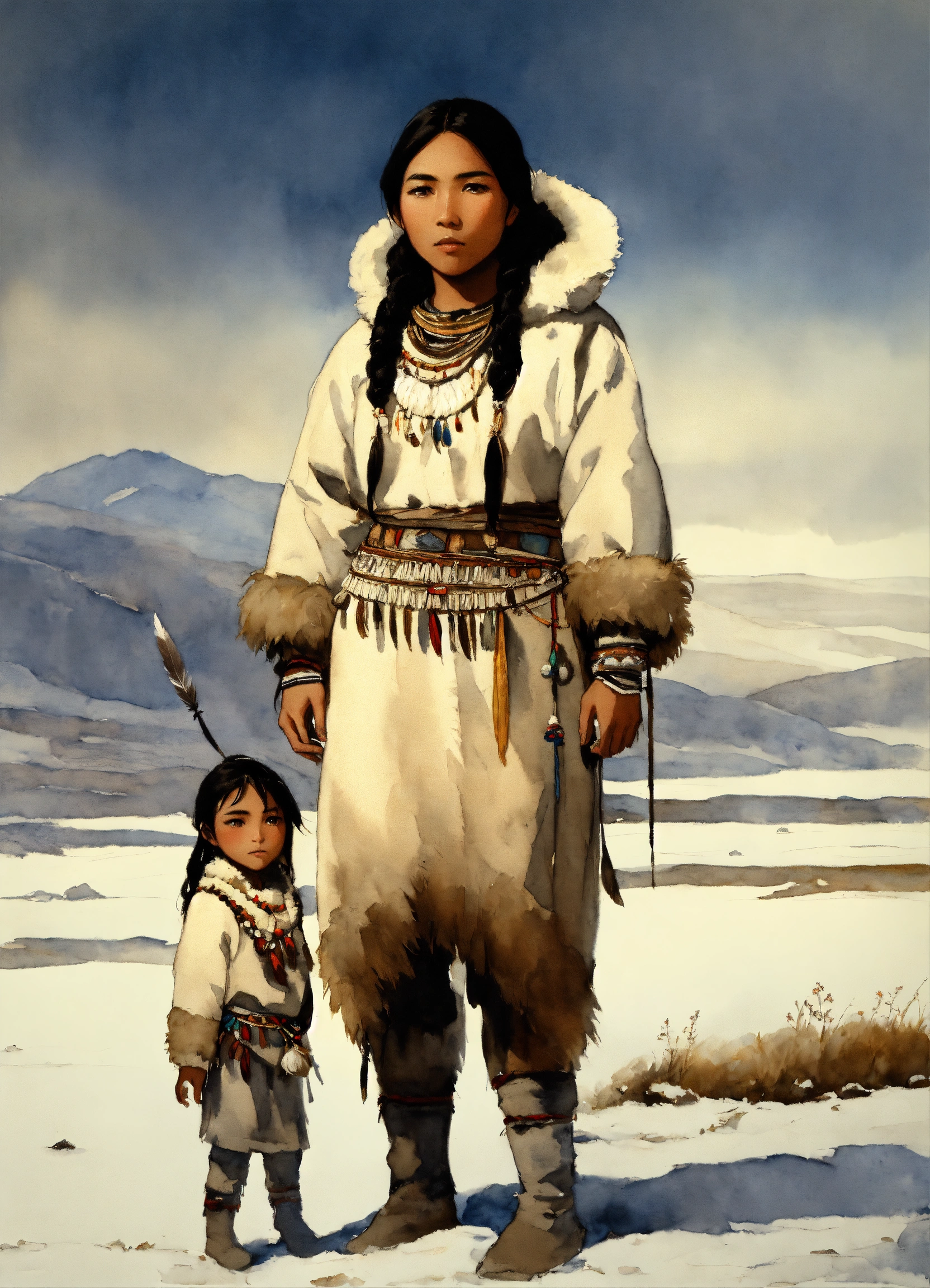 Full body illustration of an inuit woman, young, 18 years old, beautiful, native american phenotype, wearing stone age clothing made from natural fabrics like linen, cotton, or furs, adorned with feathers, beads and shells, stading on the tundra steppe with her youth brother, watercolors, gloomy and depressing ambient, artwork by tom björklund