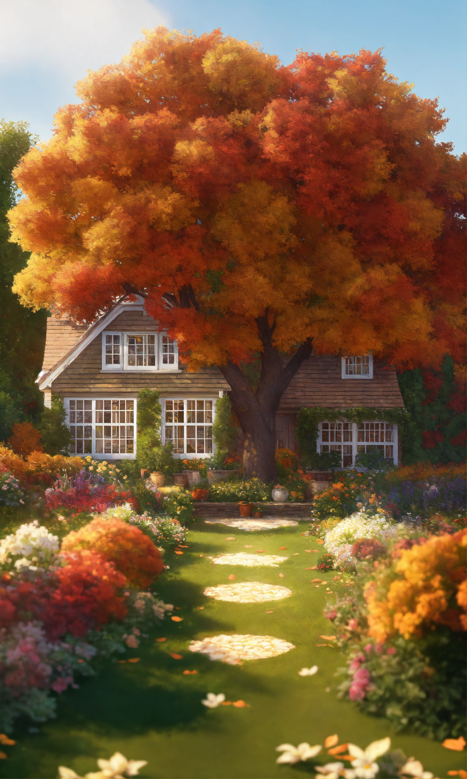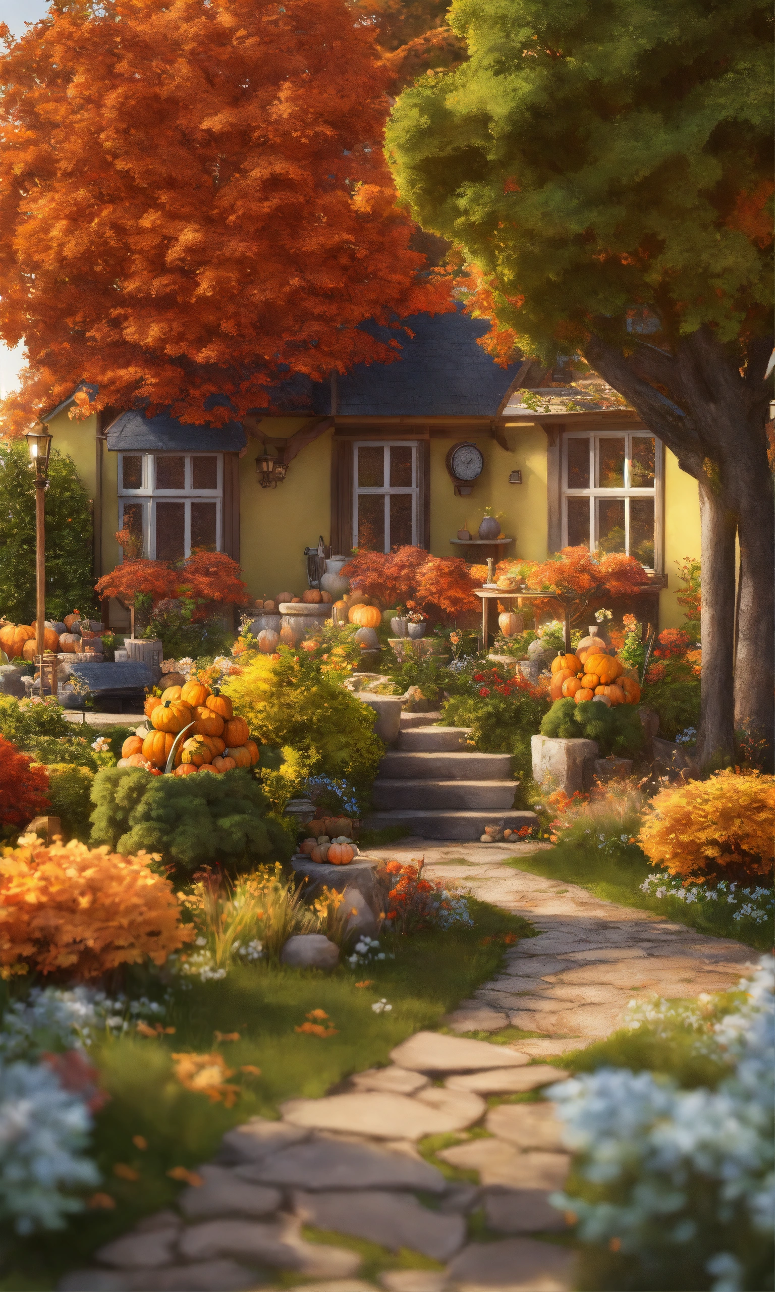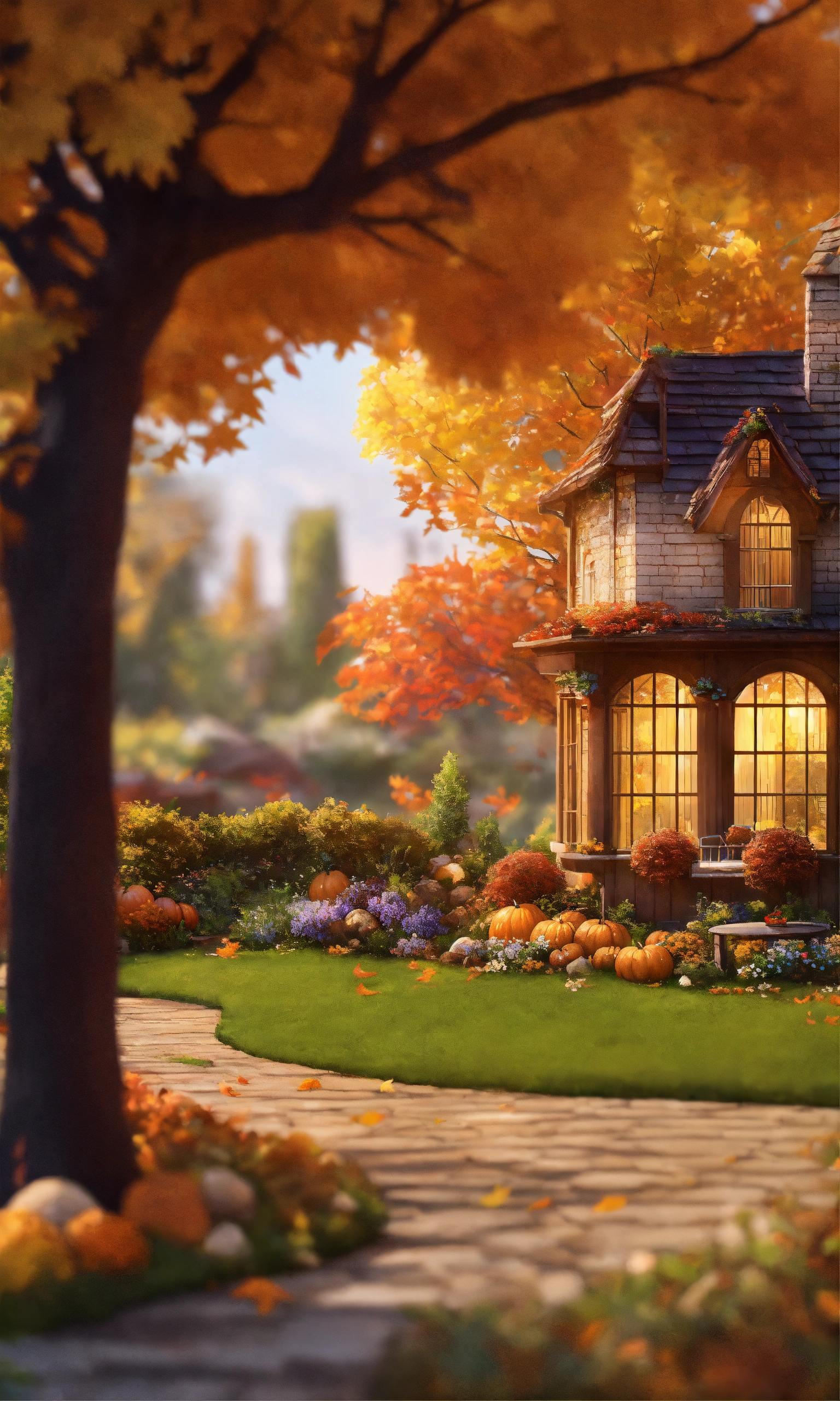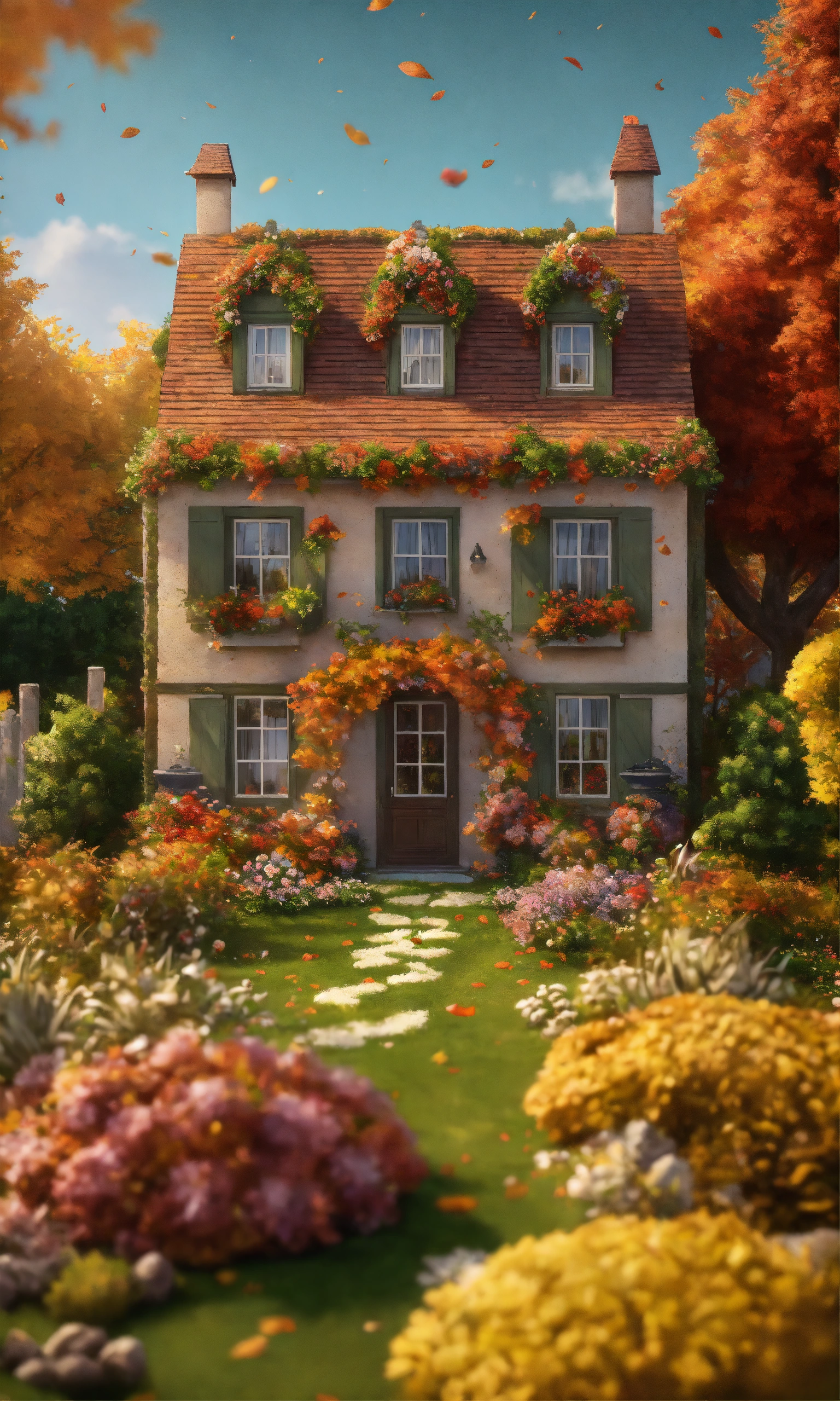 Spacious autumn garden with bushes and flowers, front garden with trees, a cottage, autumn flowers, green grass, realistic, detailed, detailing, 8k. in front place a cake made of autumn leaves and nuts.