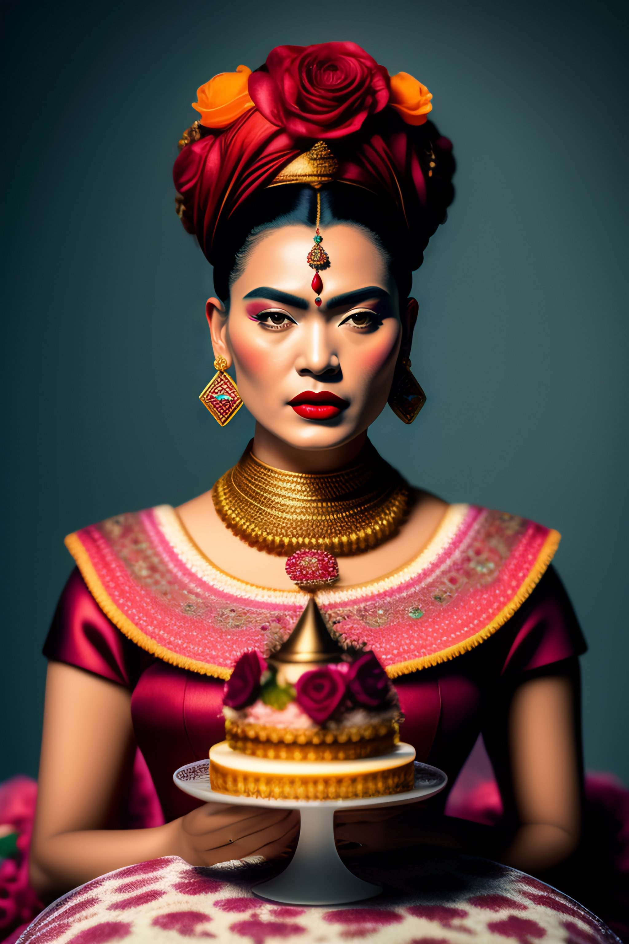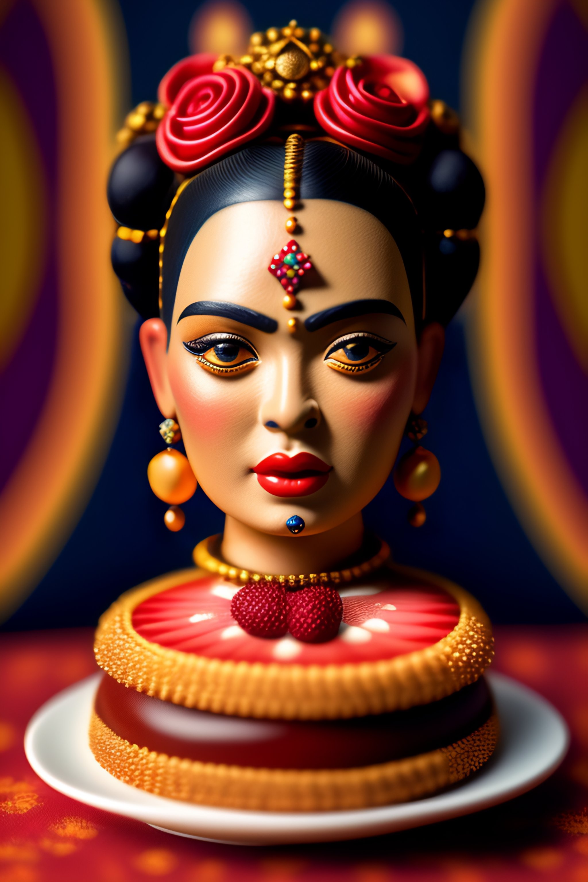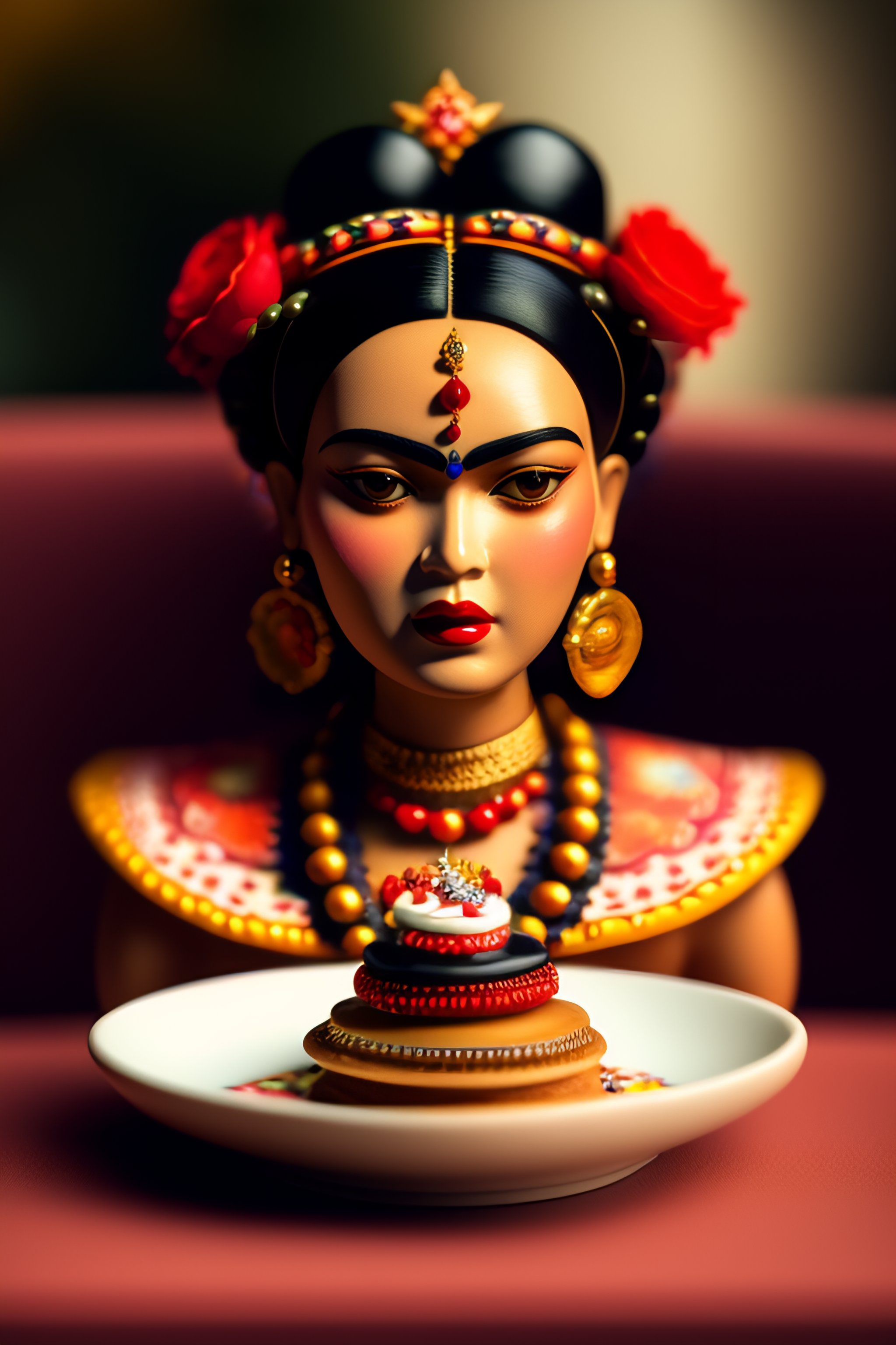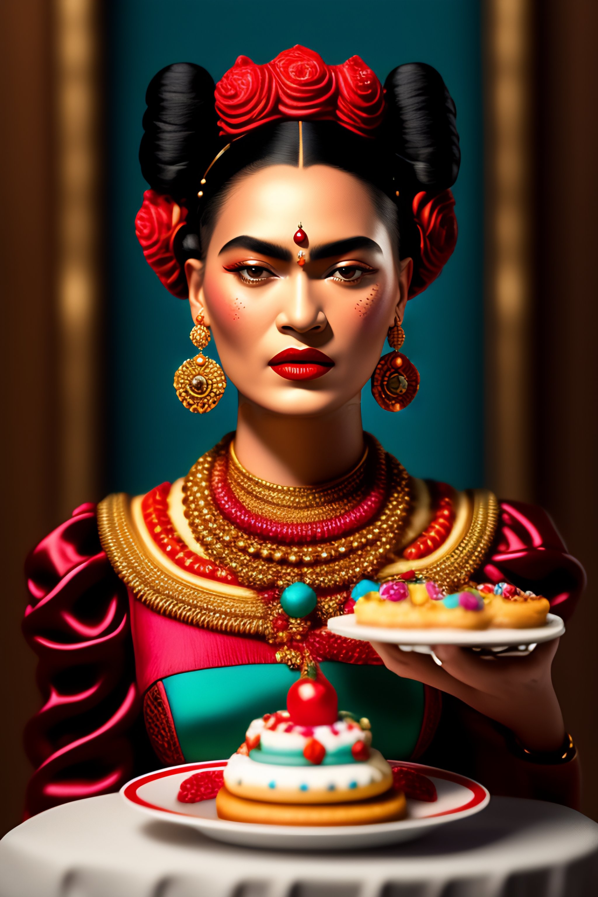 Closeup portrait of tin toy frida kahlo eating cakes, depth of field, zeiss lens, detailed, symmetrical, centered, fashion photoshoot, by nicoletta ceccoli, mark ryden, lostfish, earl nore, hyung tae, frank frazetta, breathtaking, 8 k resolution, extremely detailed, beautiful, establishing shot, artistic, hyperrealistic, octane render