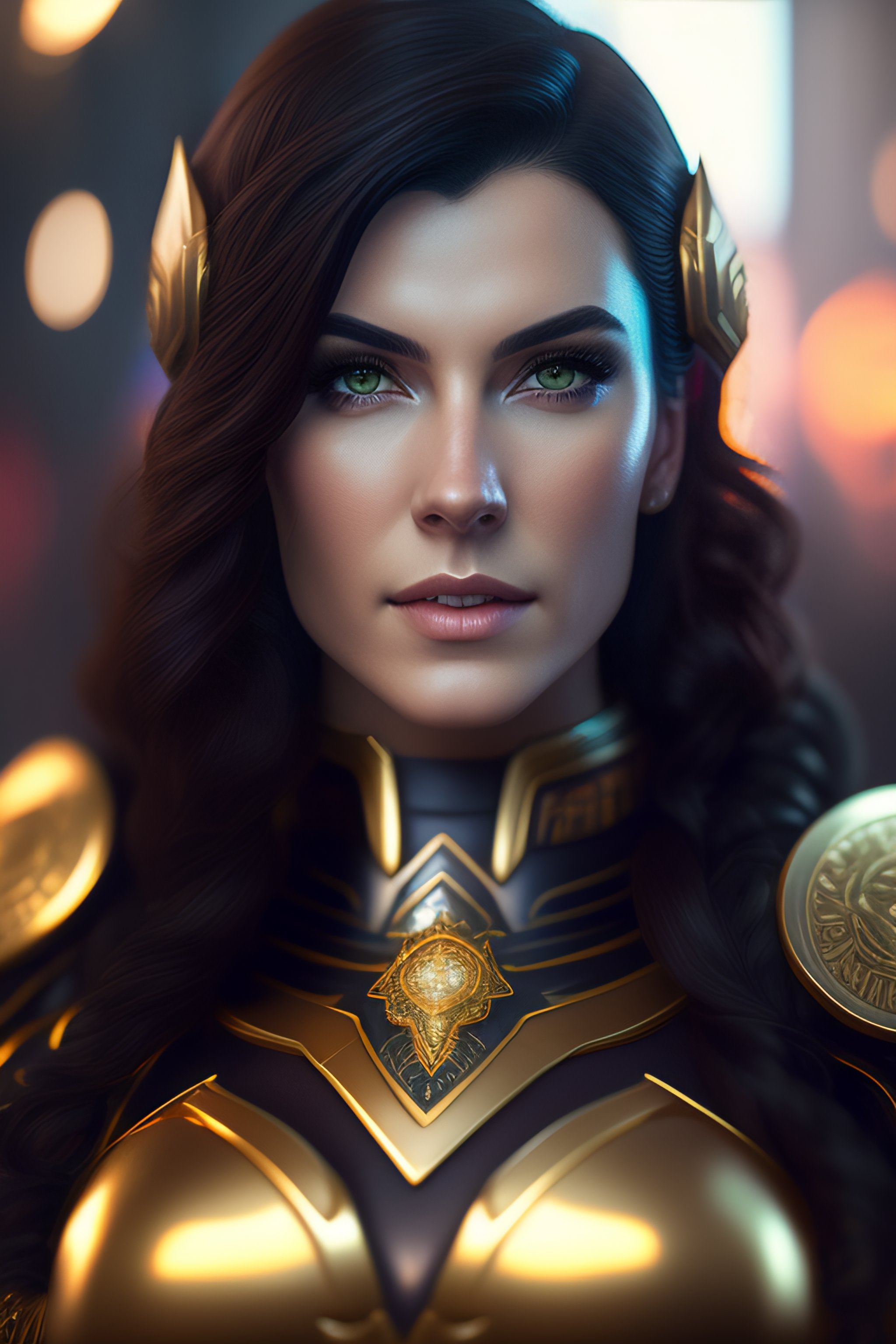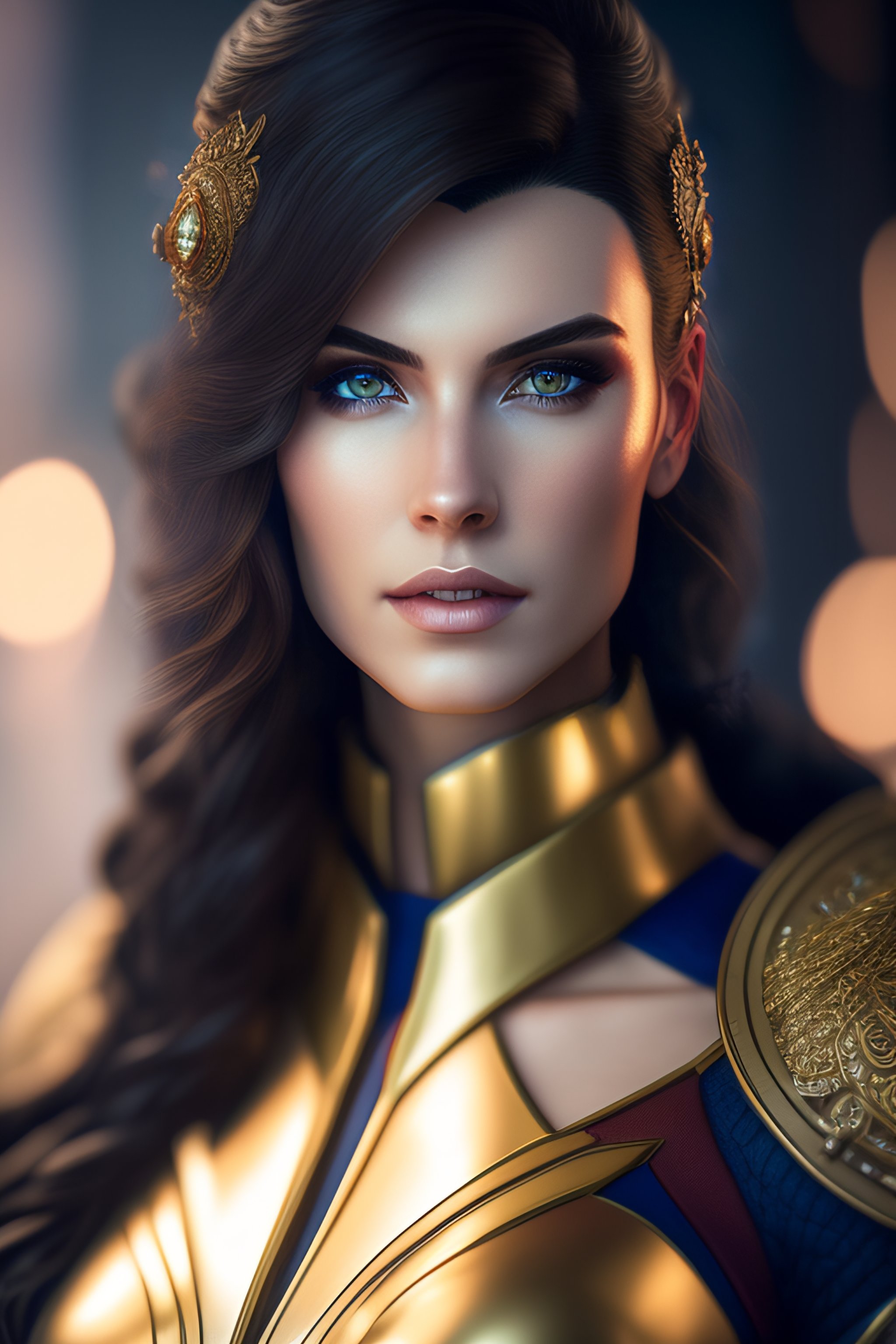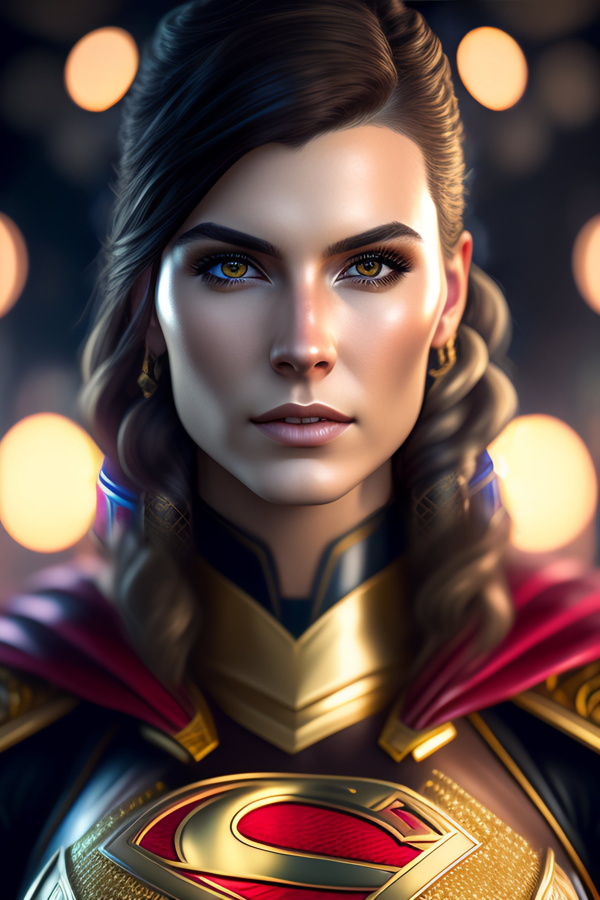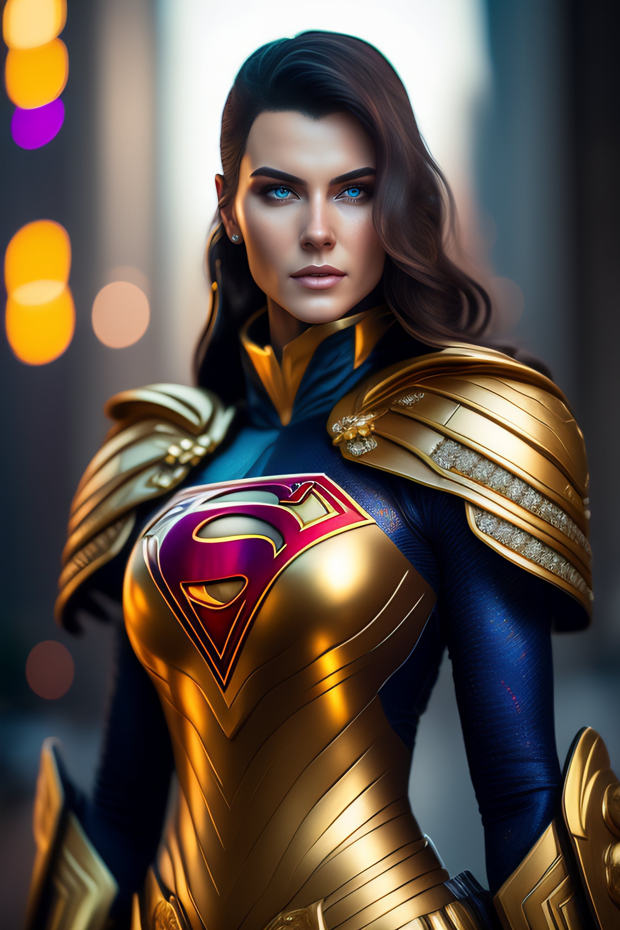Greg rutkowski, artgerm, insanely detailed photograph of cyberpunk kaitlin witcher as supergirl, flawless eyes, flawless face, intricate ornate armor, gold filigree weave, photograph taken on nikon d750, intricate, elegant, scenic, hyper-realistic, hyper-detailed, 8k