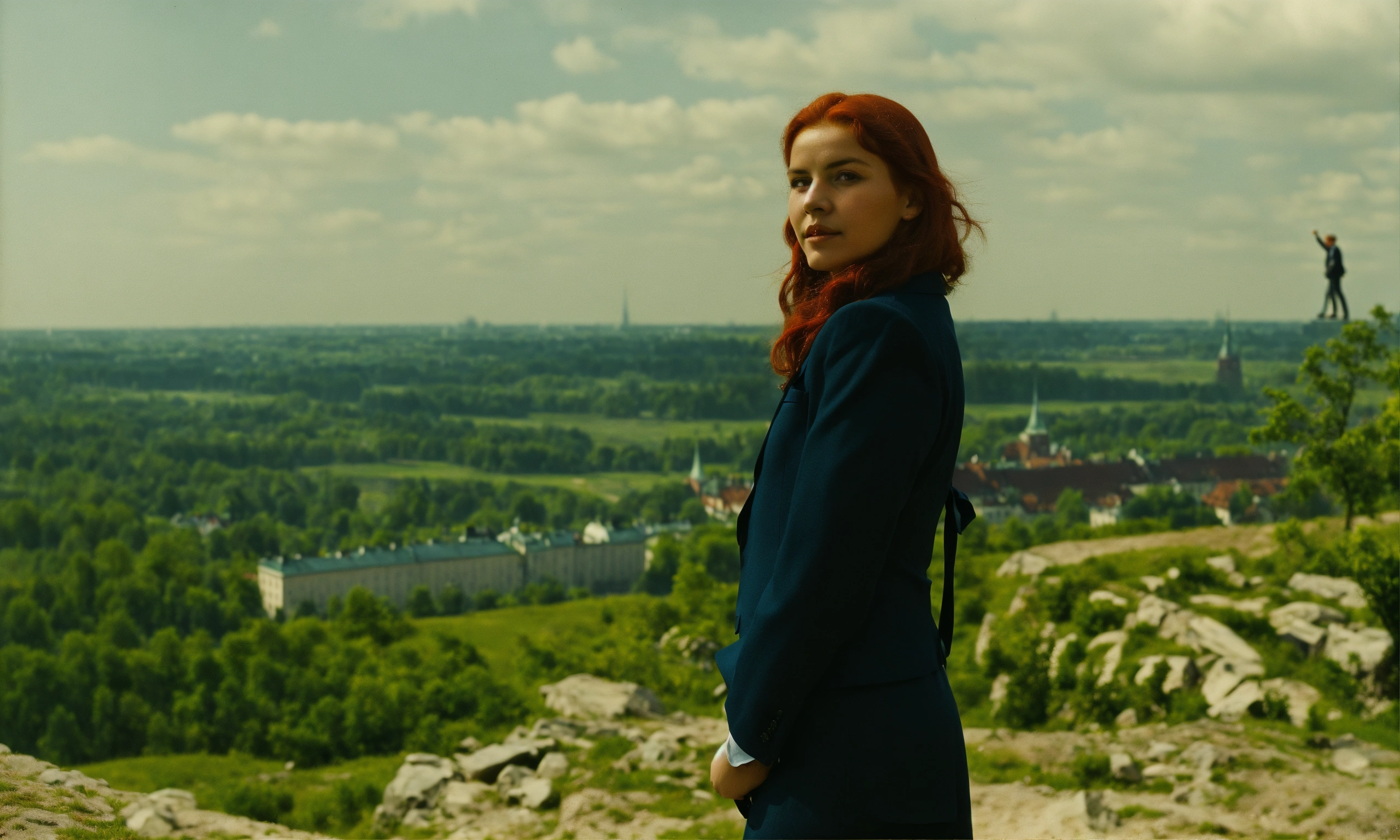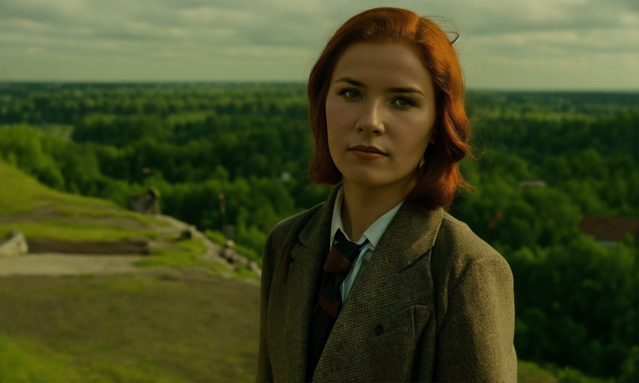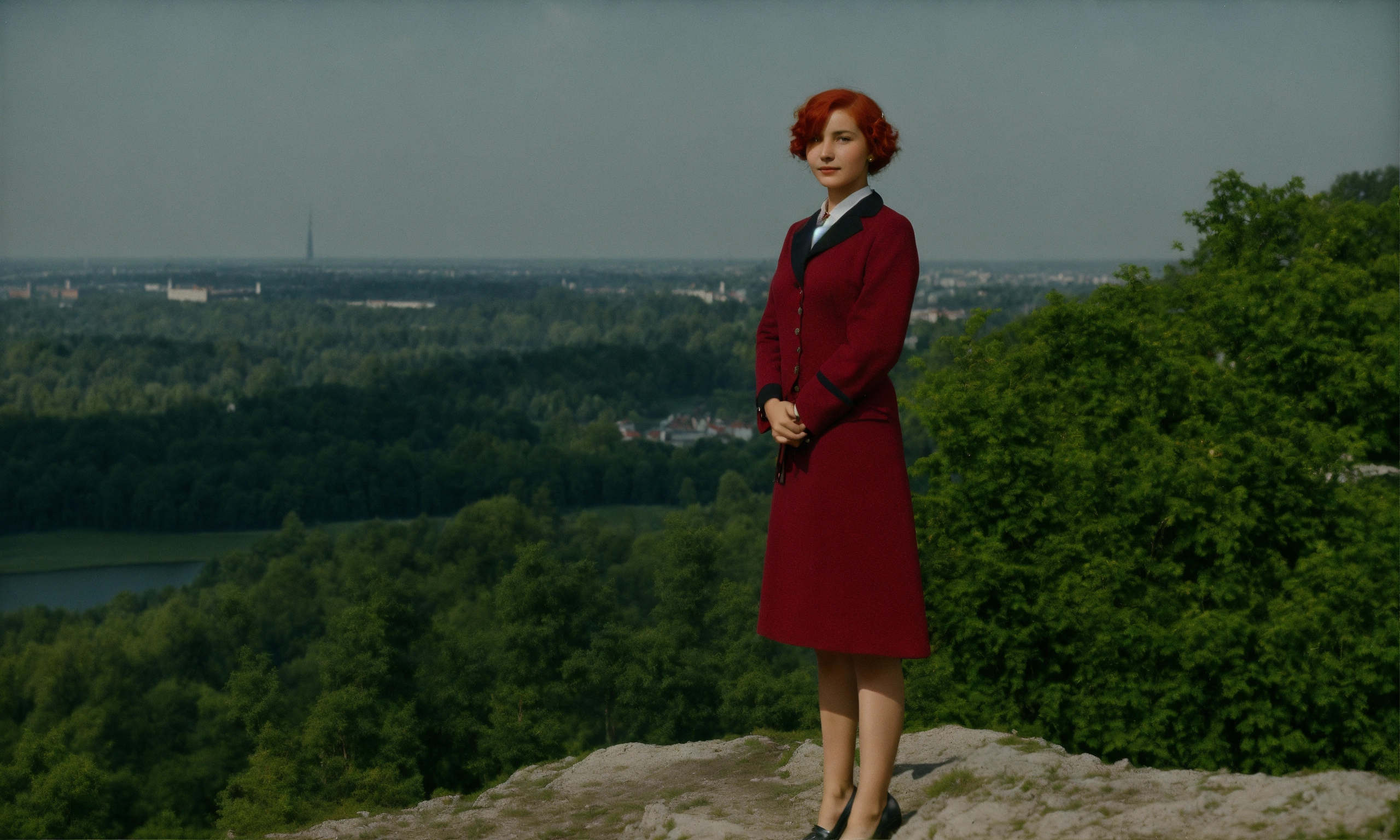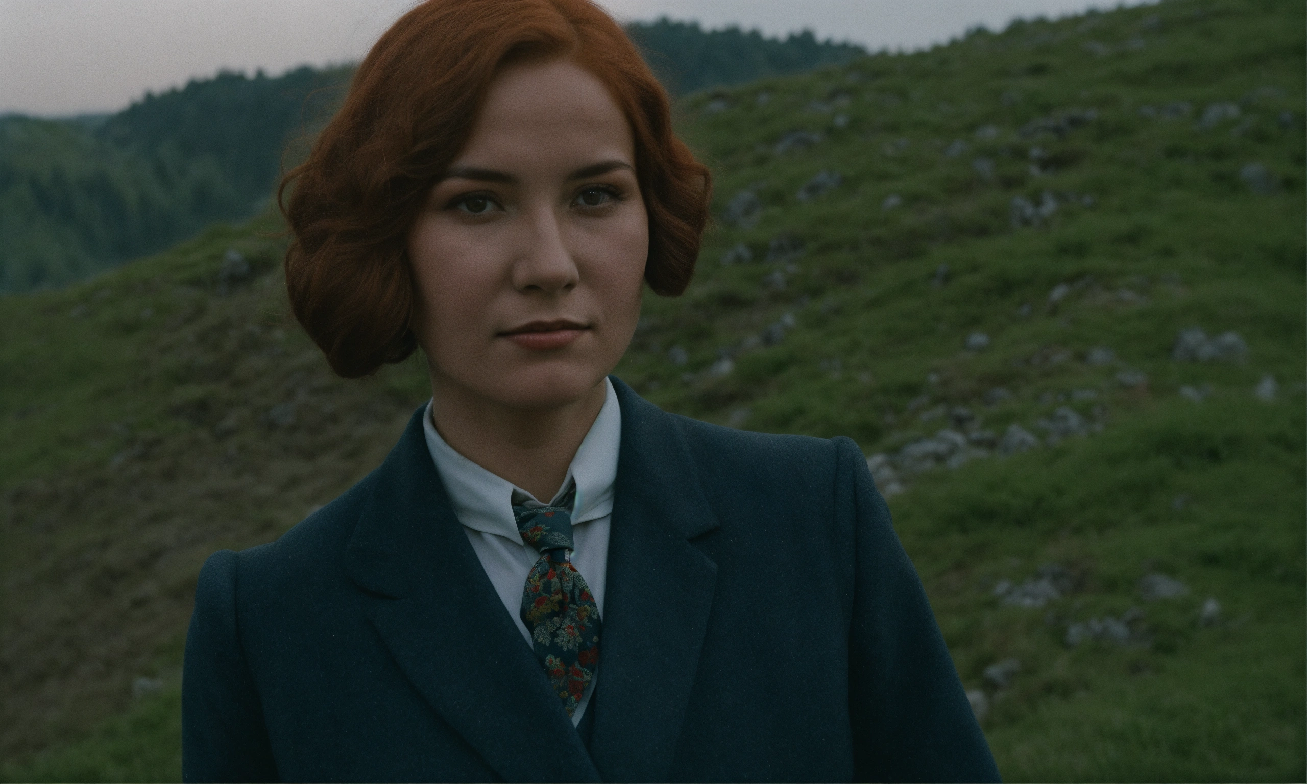 Warszawa 1920-1930, buaty woman 18 age red hair, on top of a mountain, looks at the camera at full height, suit and tie.