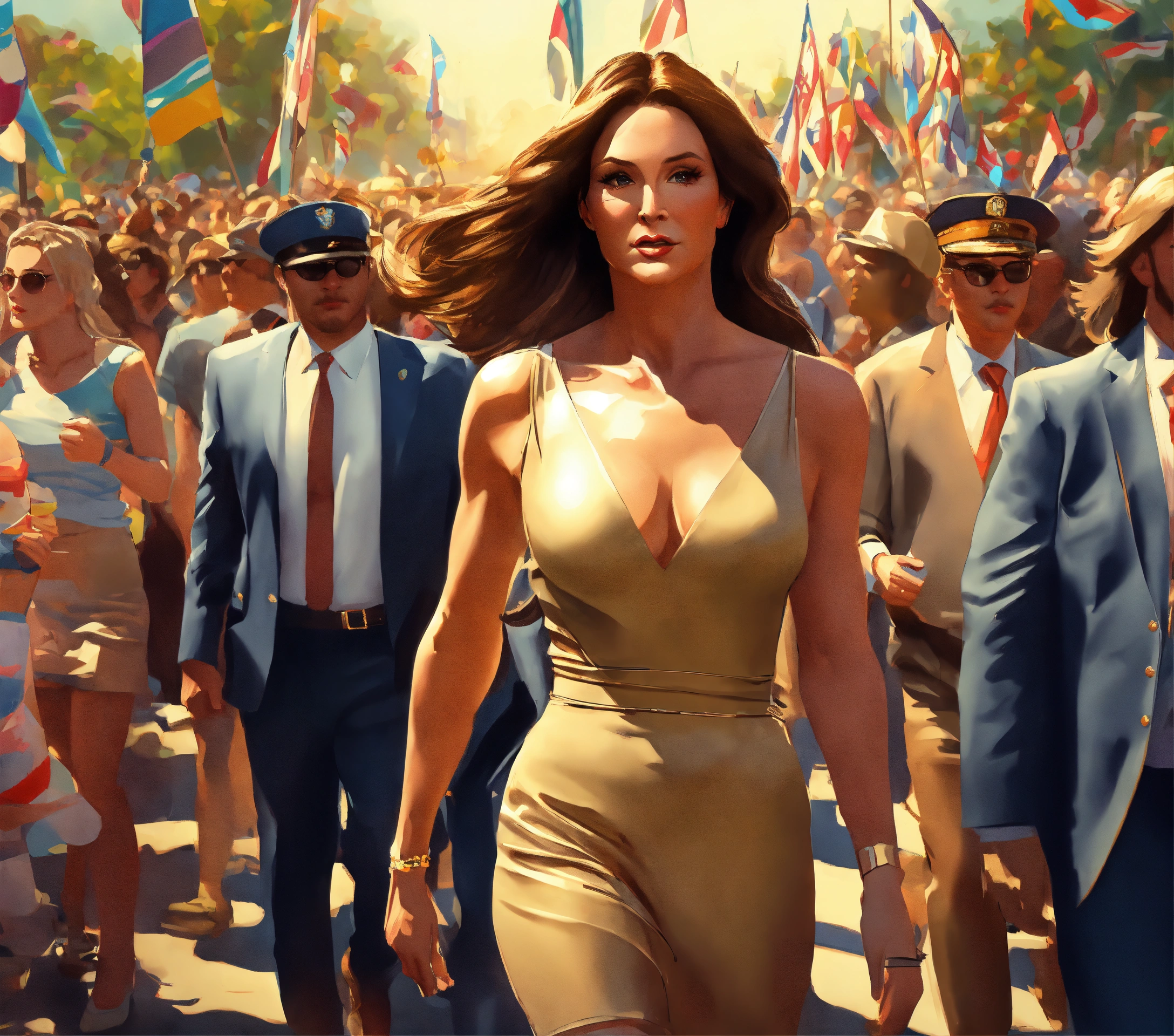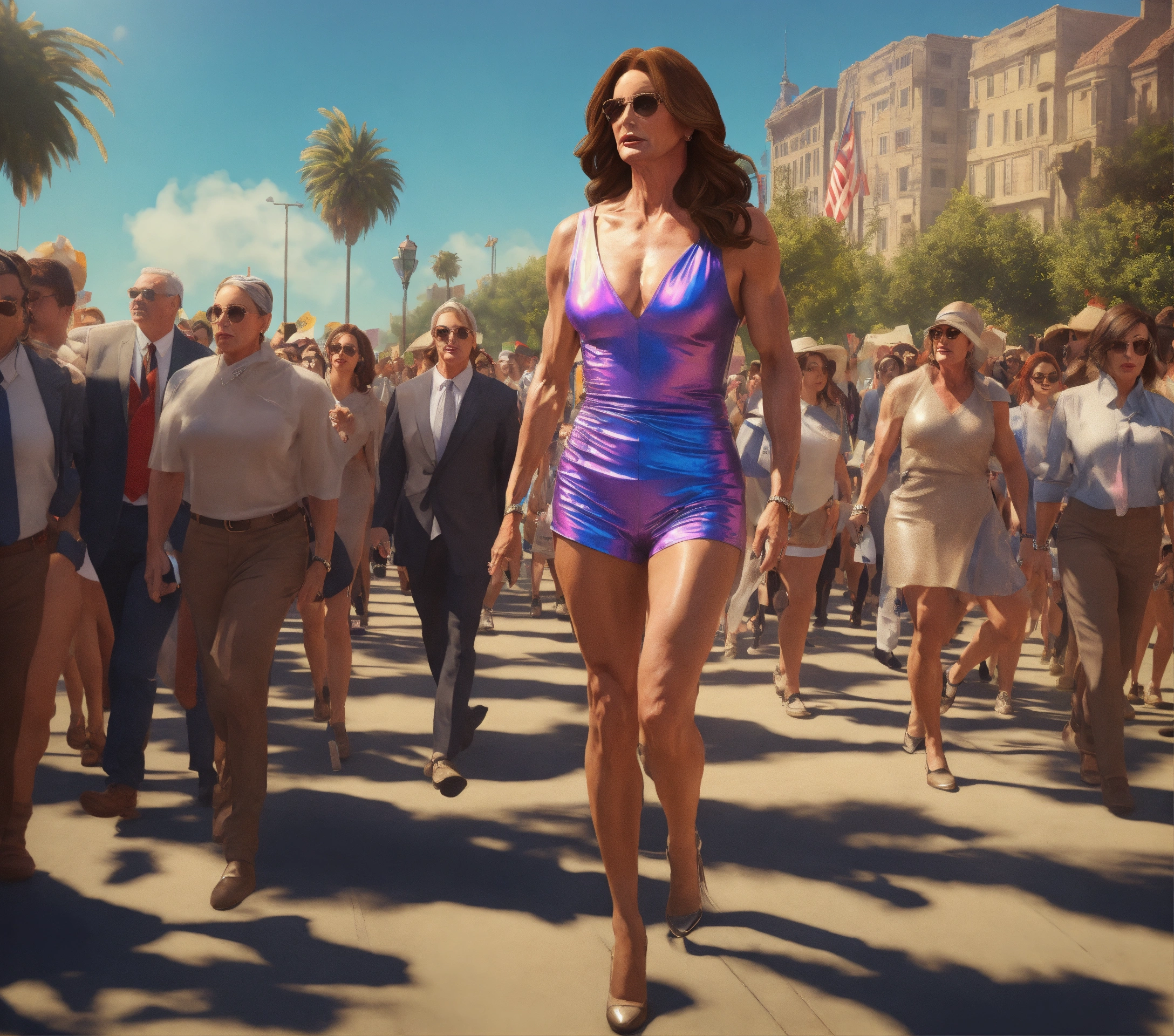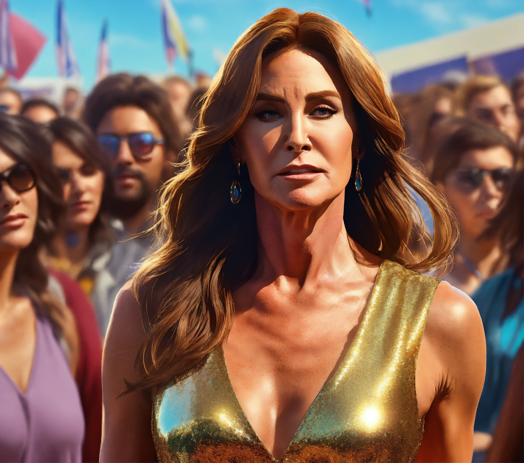 Medium shot pop art, hyperrealist full body portrait of "caitlyn jenner" marching at a lbgq gathering on a sunny day, fantasy art, photo realistic, dynamic lighting, artstation, poster, volumetric lighting, very detailed faces, 4 k, award winning