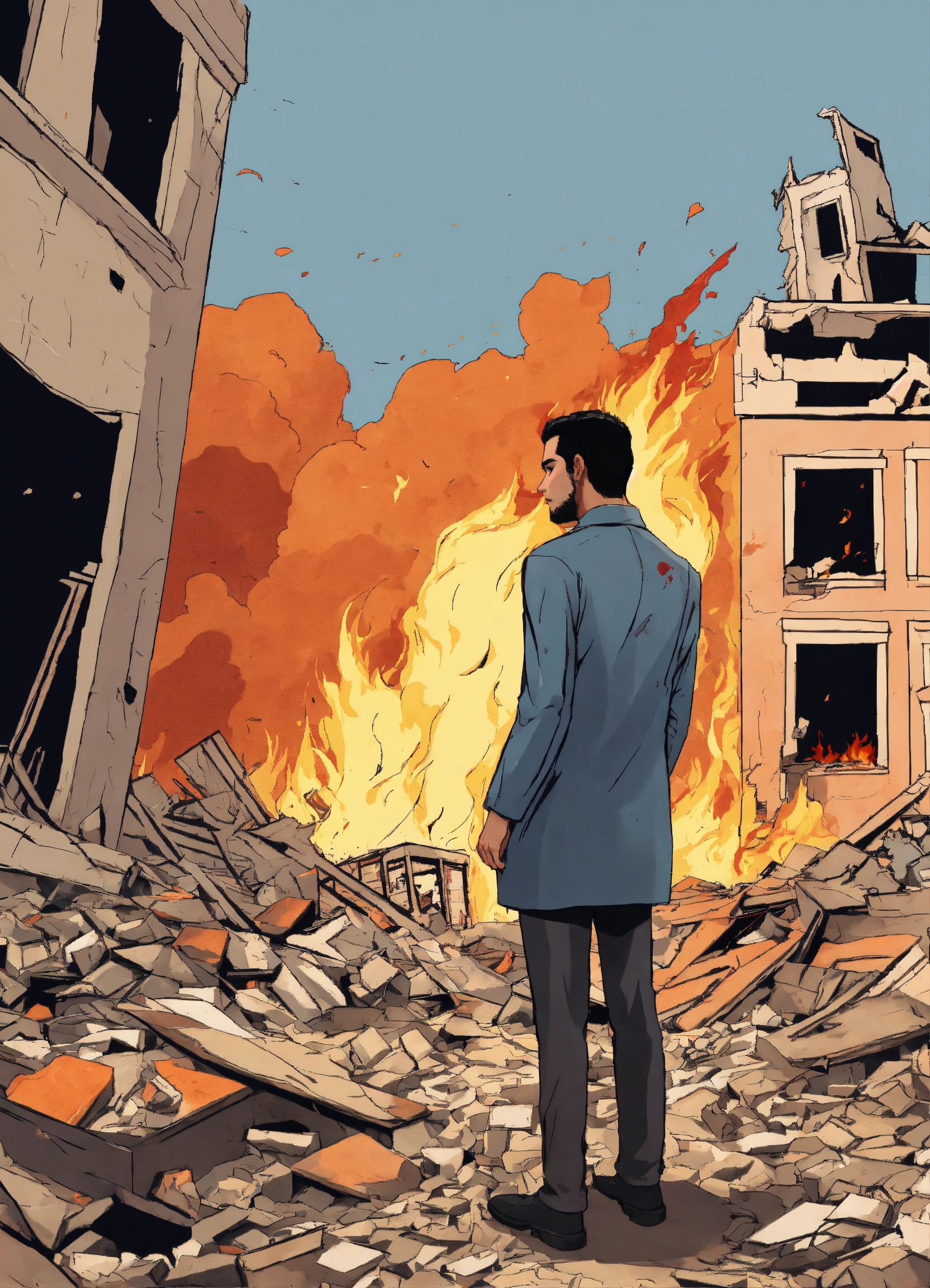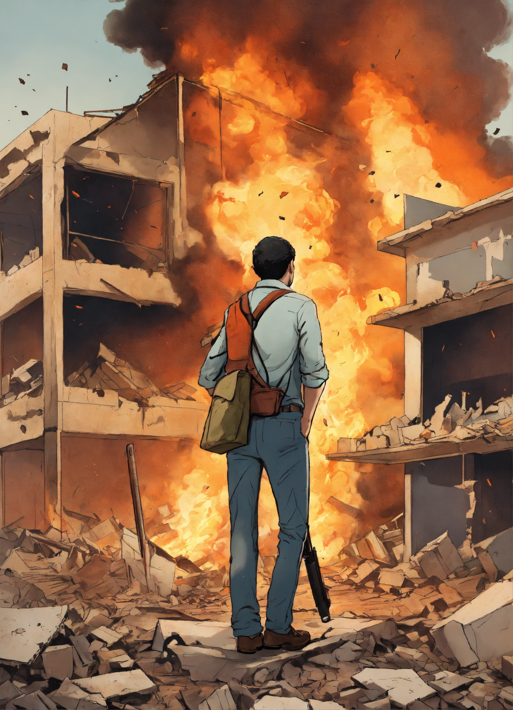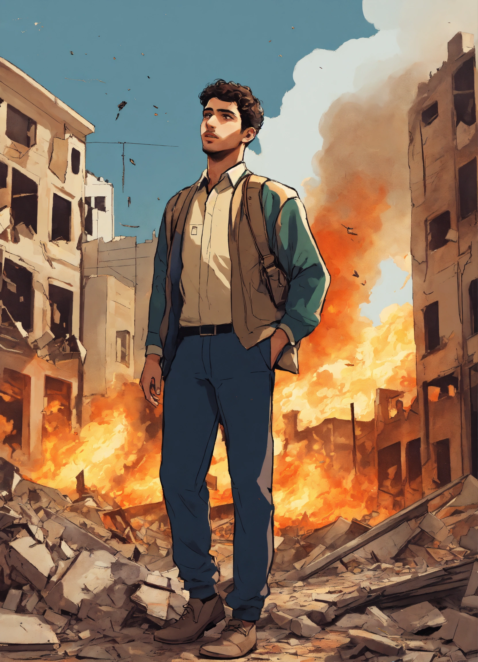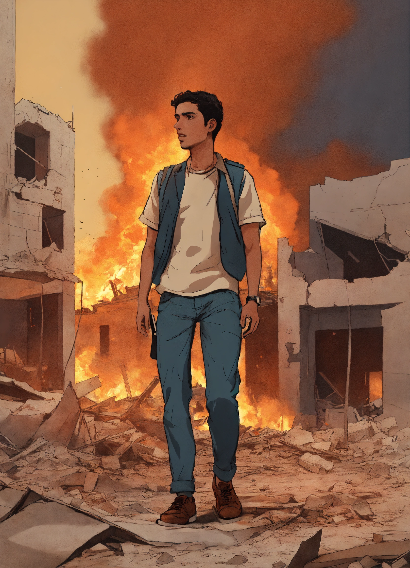 "a design that depicts a young palestinian man standing amidst destruction with collapsing and burning buildings, he is acting as a news correspondent but presents the news in a satirical manner, "