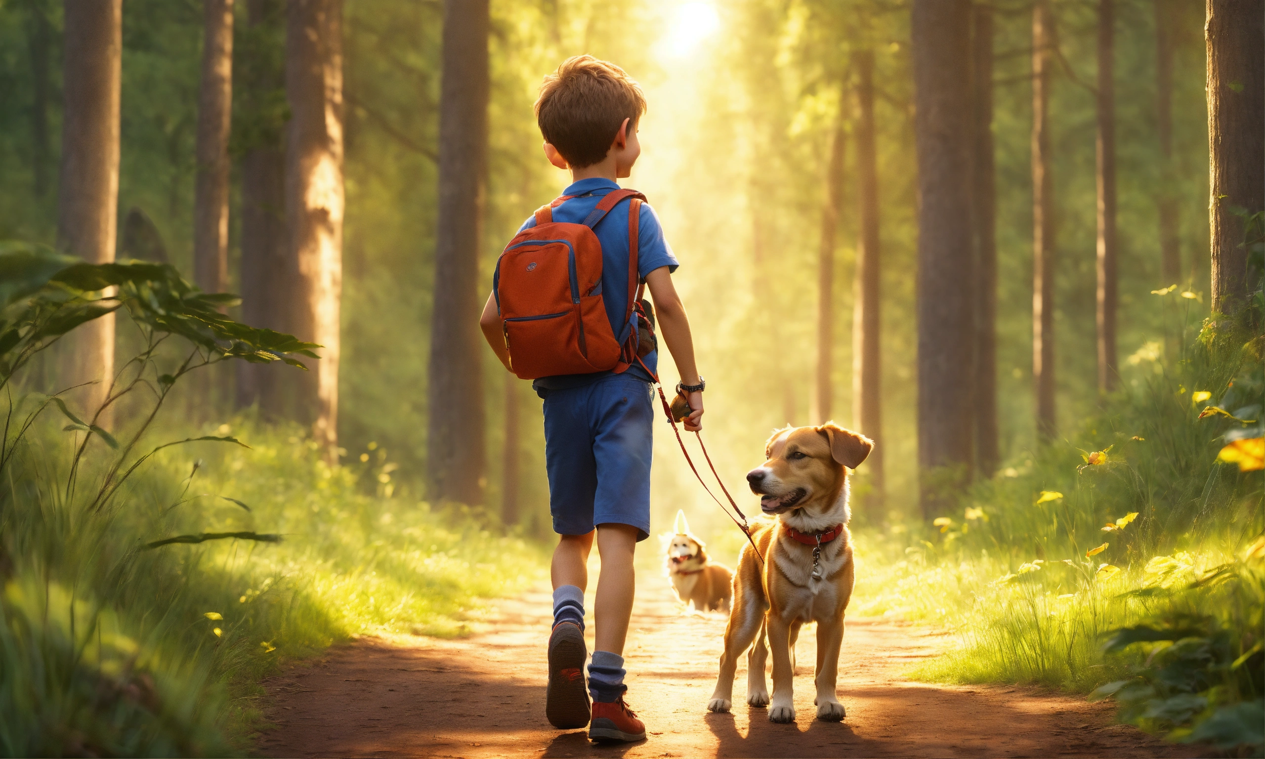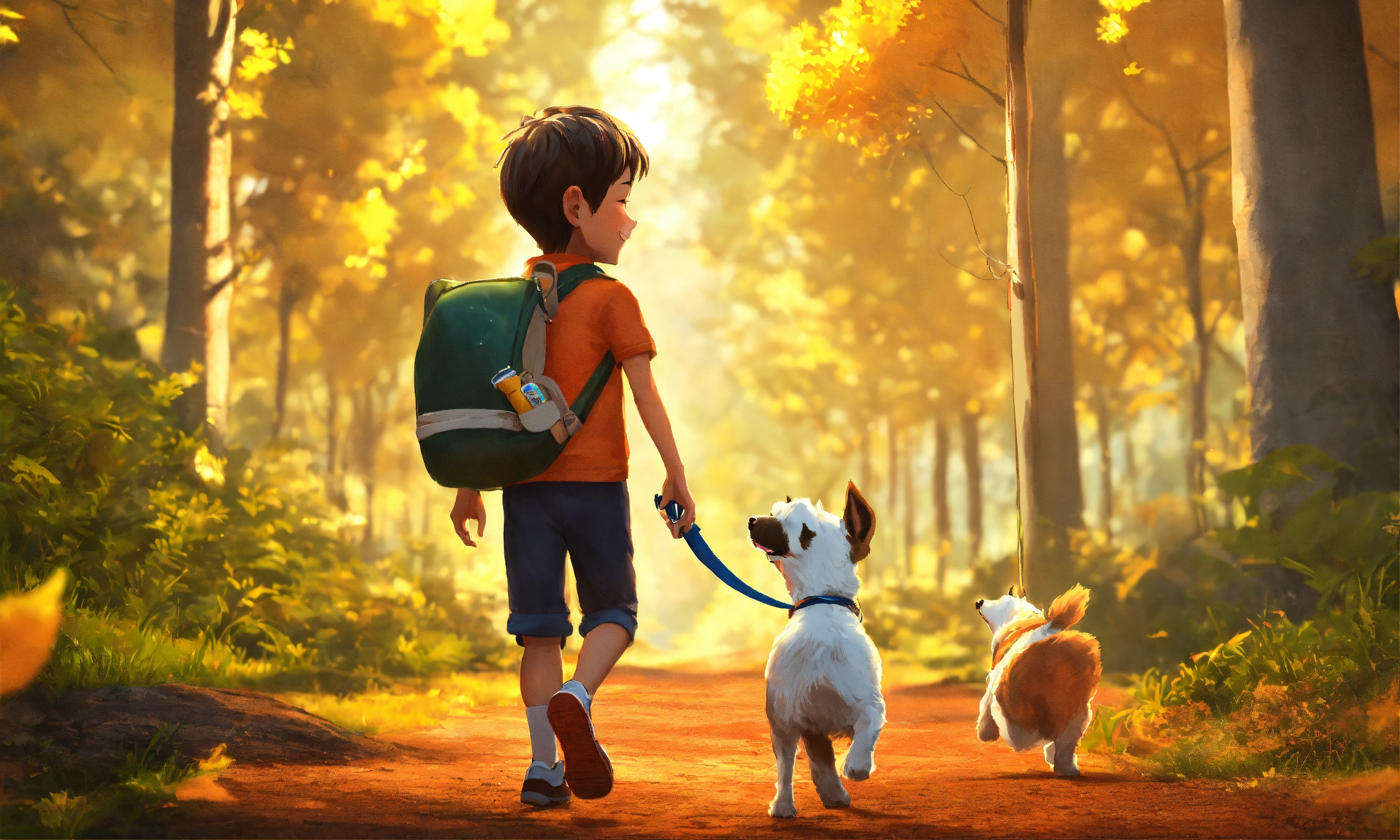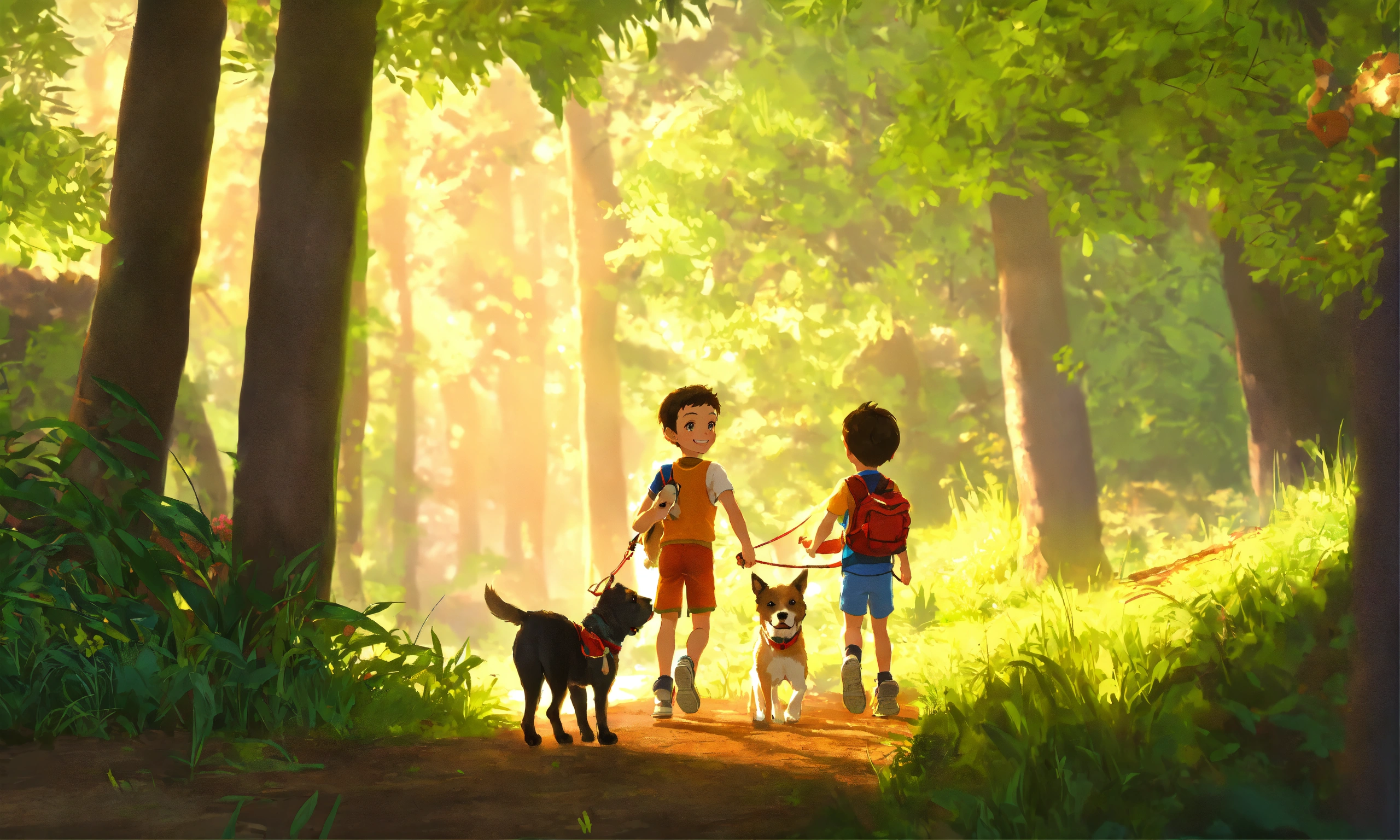 Draw lucas, a smiling boy, holding his faithful friend, bolt, the dog, as they walk through the forest together. seed 556672768
