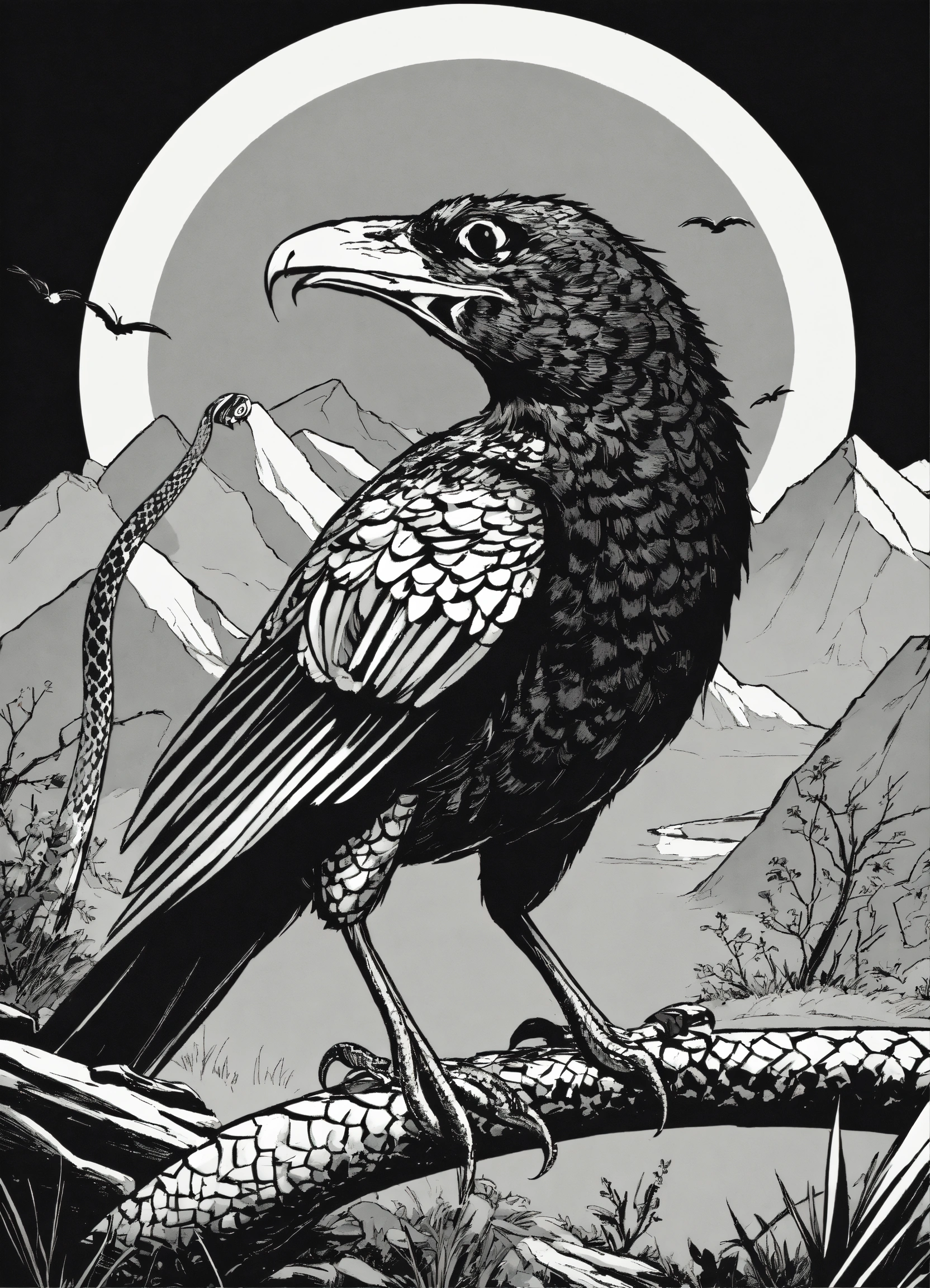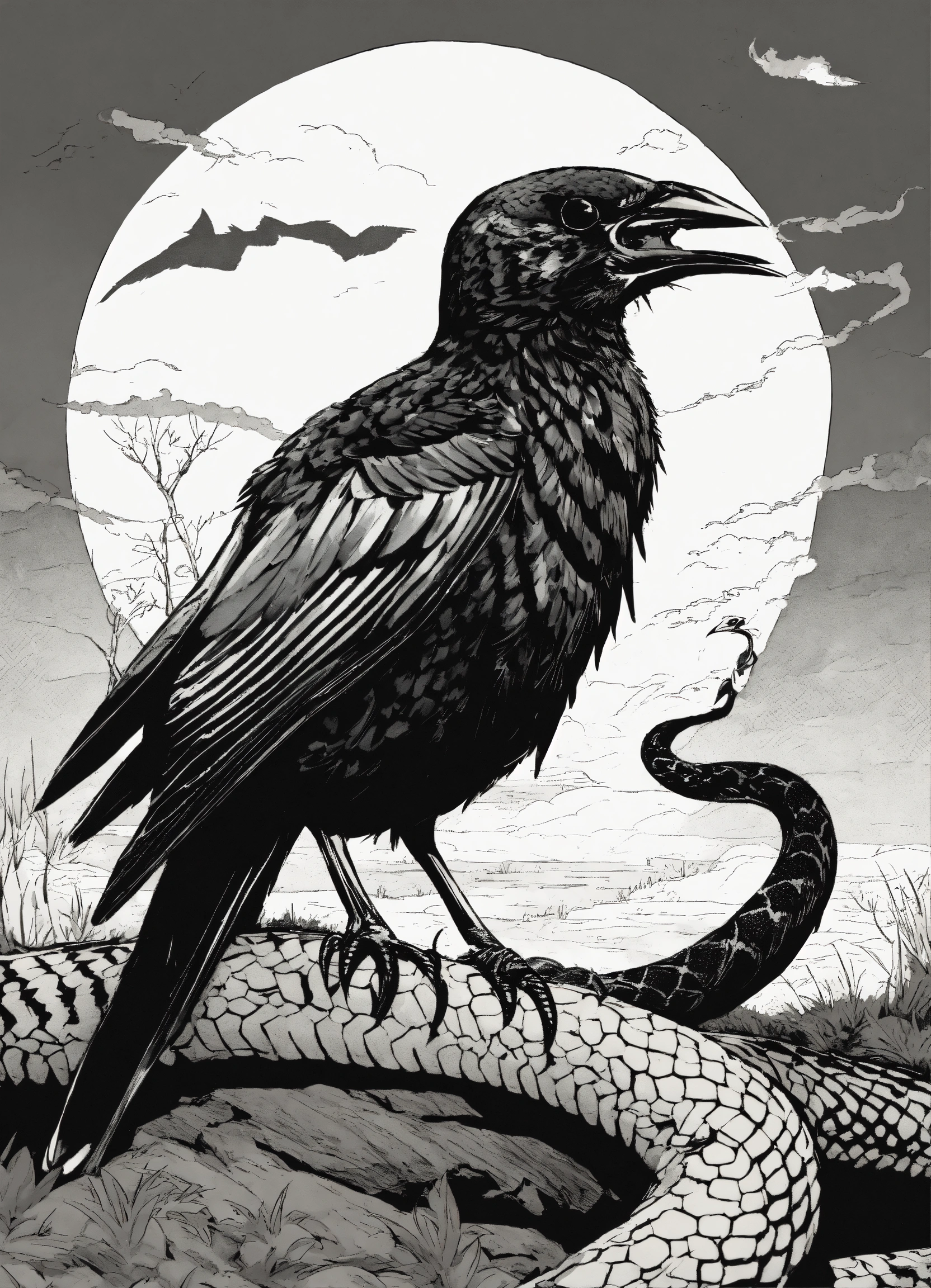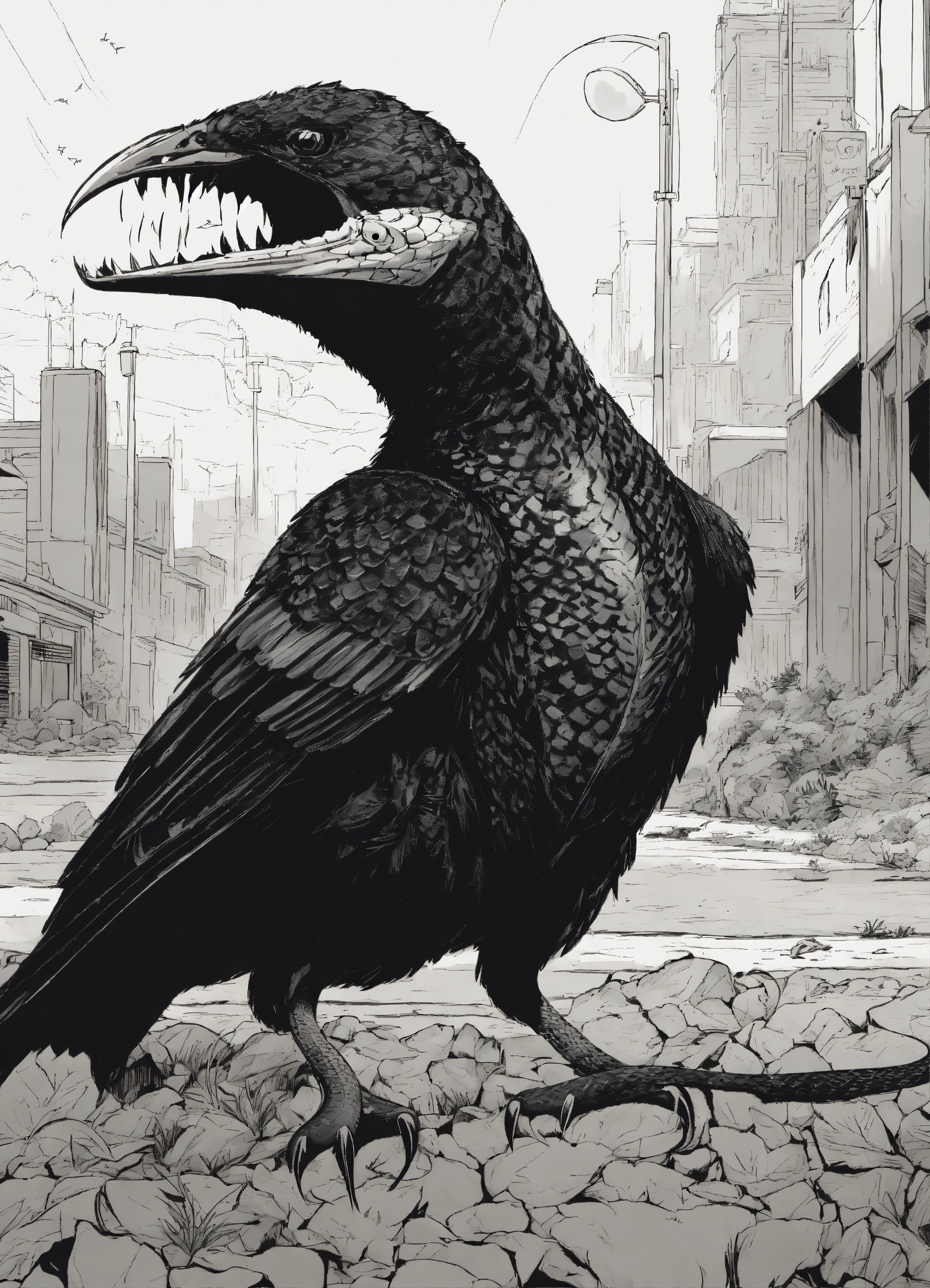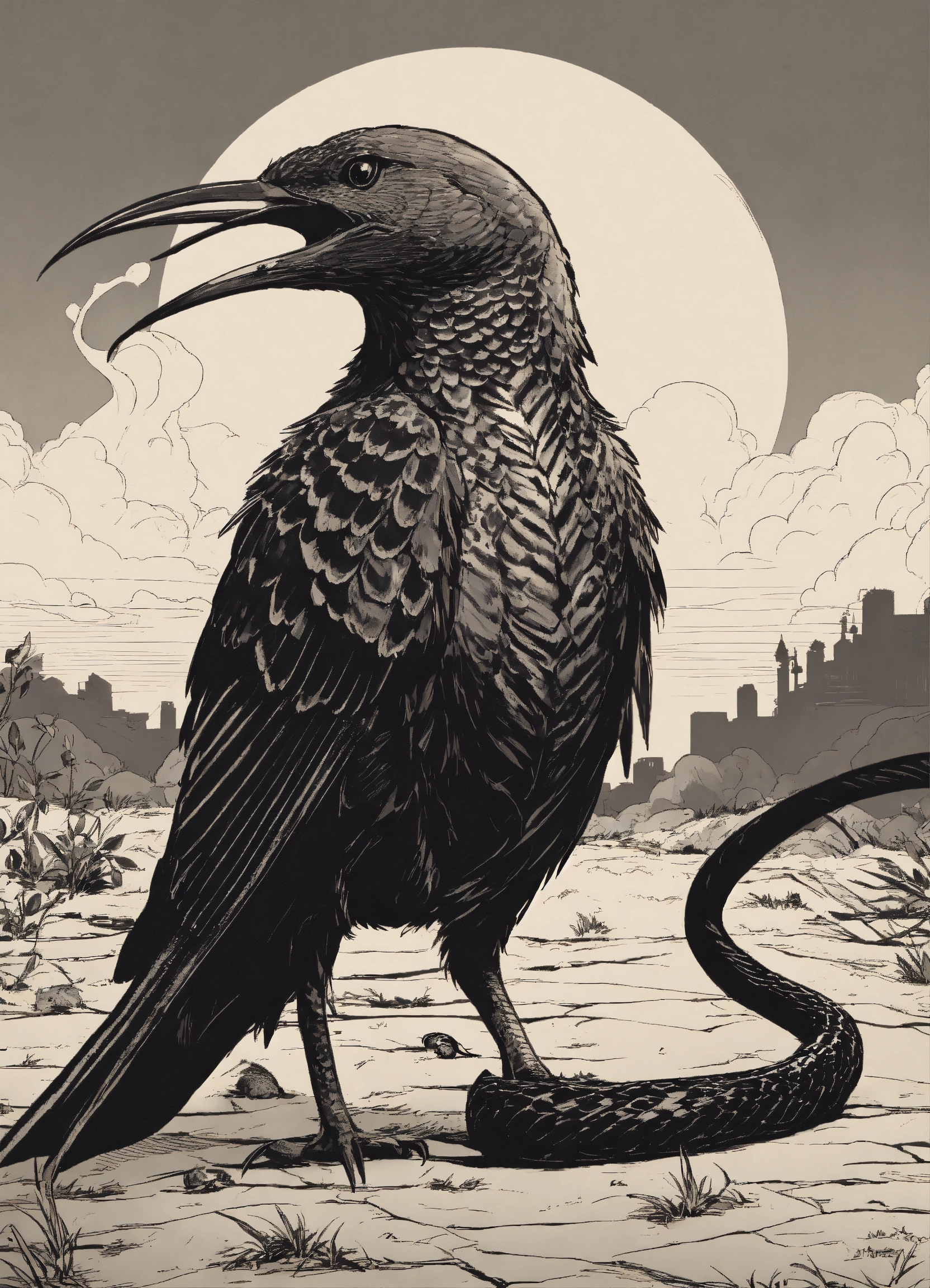 A black bird with a rattlesnake head, mouth wide open, standing on the ground in comics style black and white