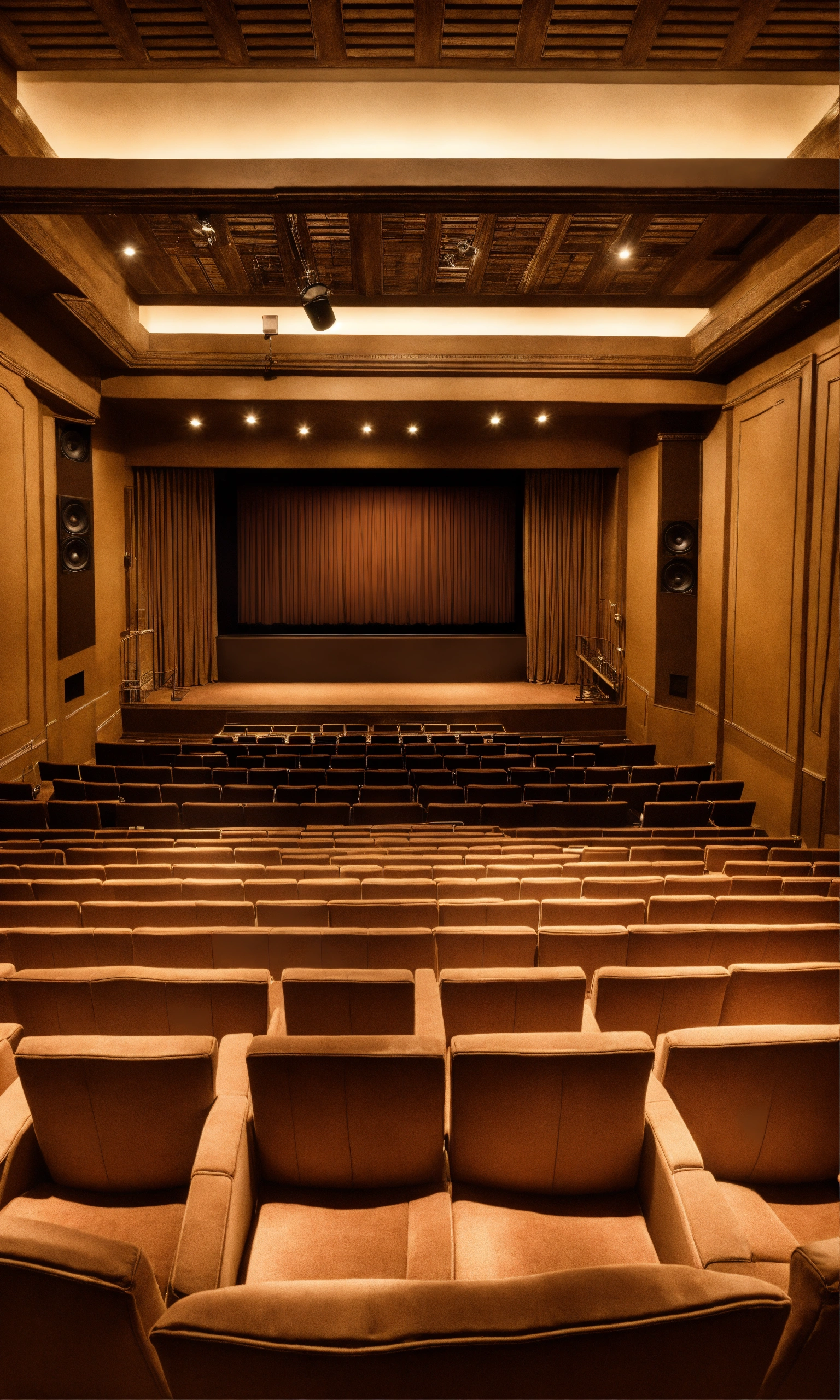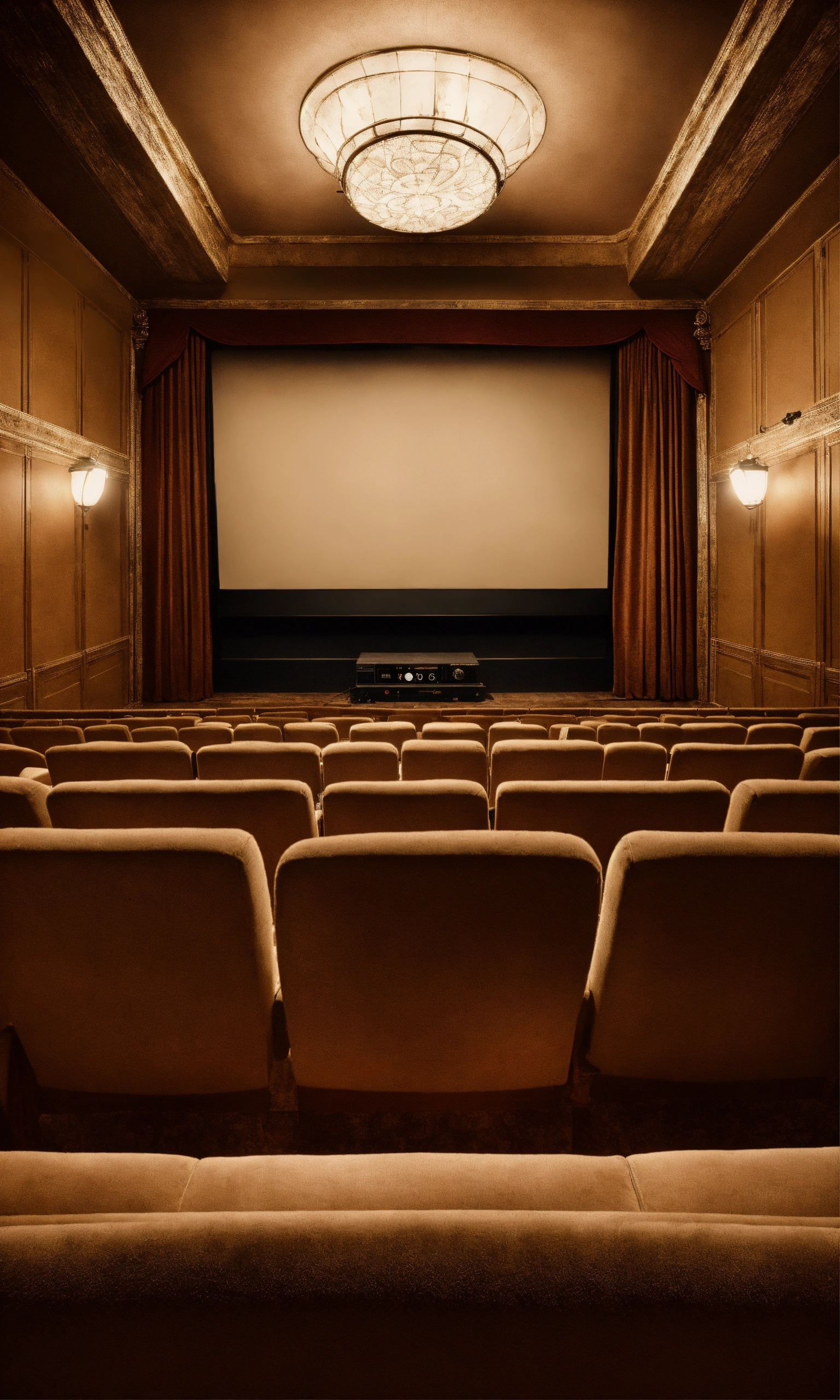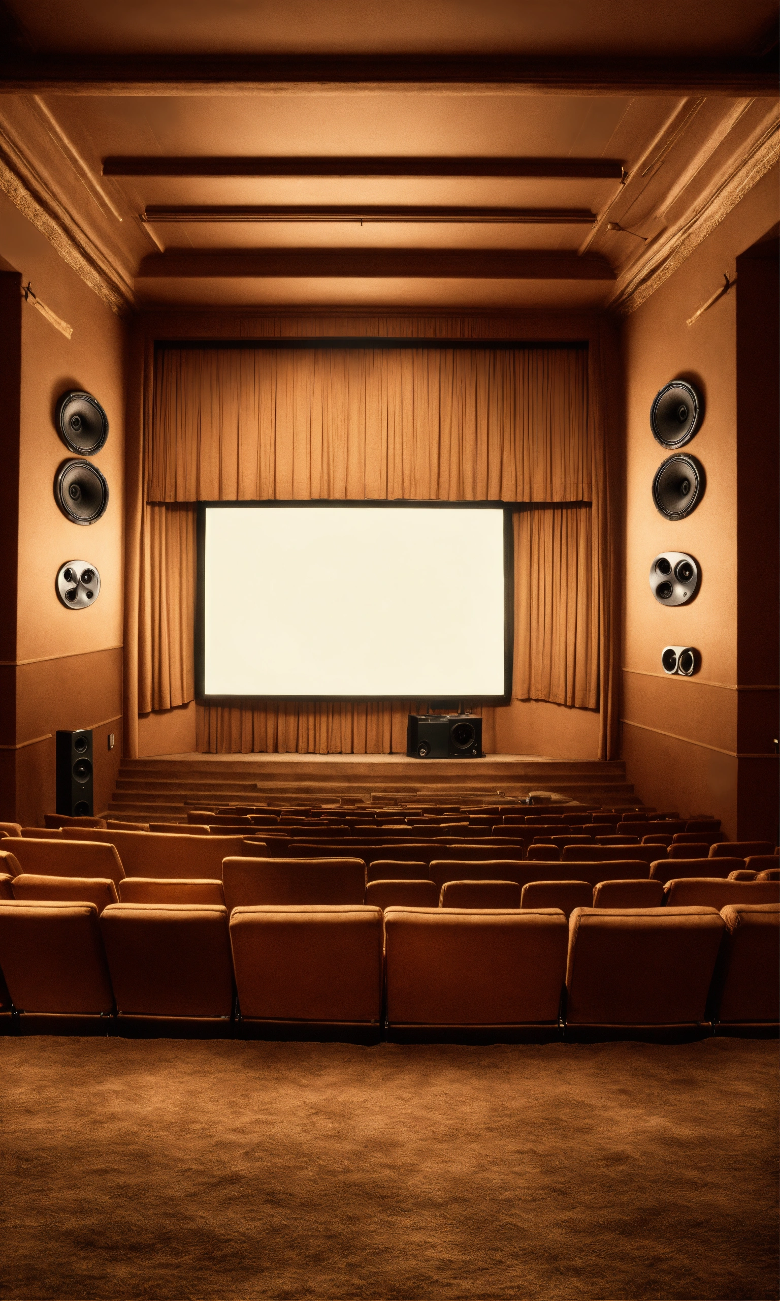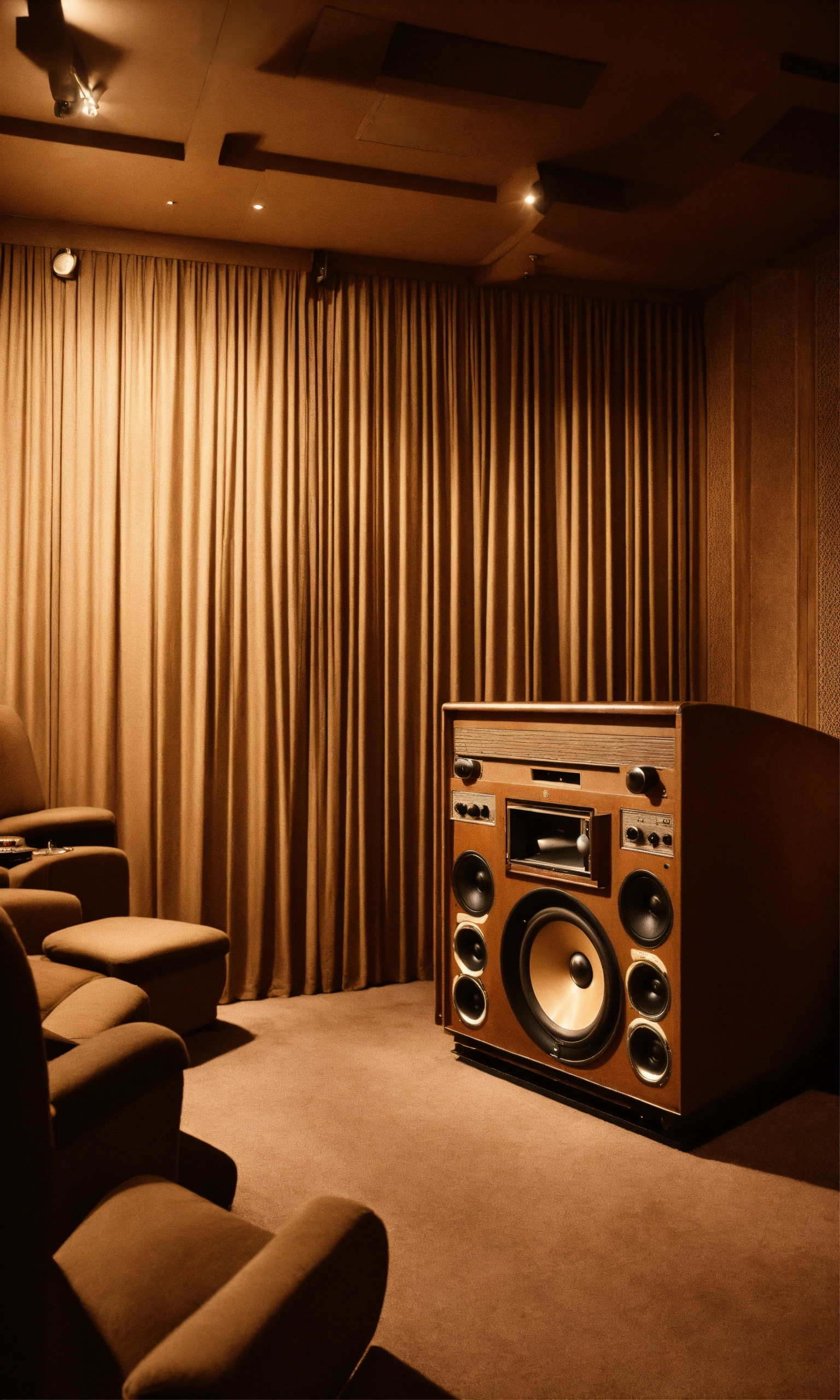 Rollos de películas y parlantes de audio en una sala de cine con un estilo retro en tonos sepia