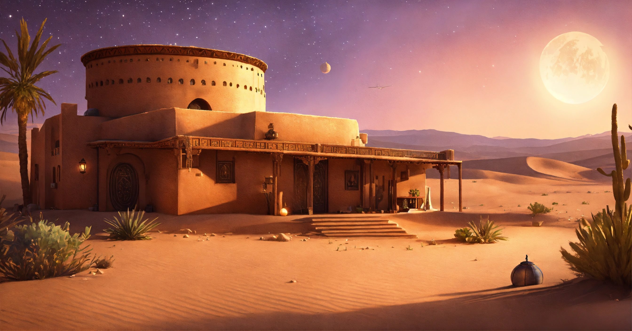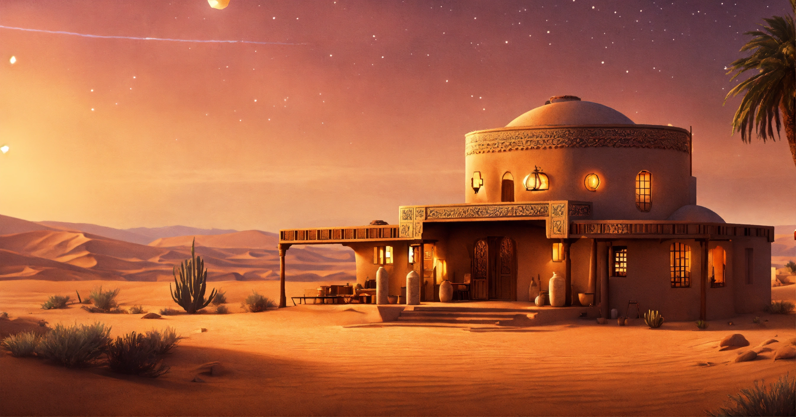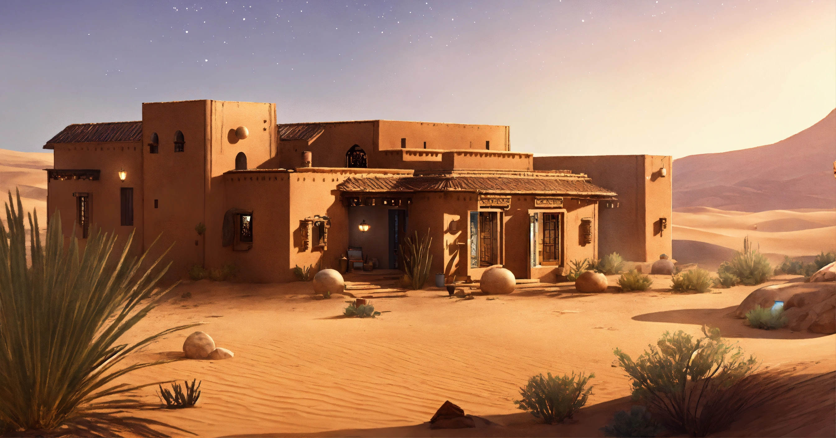 Concept art of a large desert home, jakku, desert, flat roof, several rooms, hut, two story, peasant, fire and chairs outside, survivor, charming, desert planet, multi-room, moroccan, starry desert planet sky, lanterns outside, moroccan fairy light lanterns outside poor, view from the outside, exterior view only, stucco outhouse, patterned design stucco walls, windows without glass, windows have shimmer dark magenta pattern flowing curtains, exterior only, house with courtyard in the center, beautiful, adobe, sand dunes in background, large huge two story house, alien desert planet, stranded, adobe villa, star wars, very long adobe mansion, huge, realistic, intricate, 3d, hyper realistic