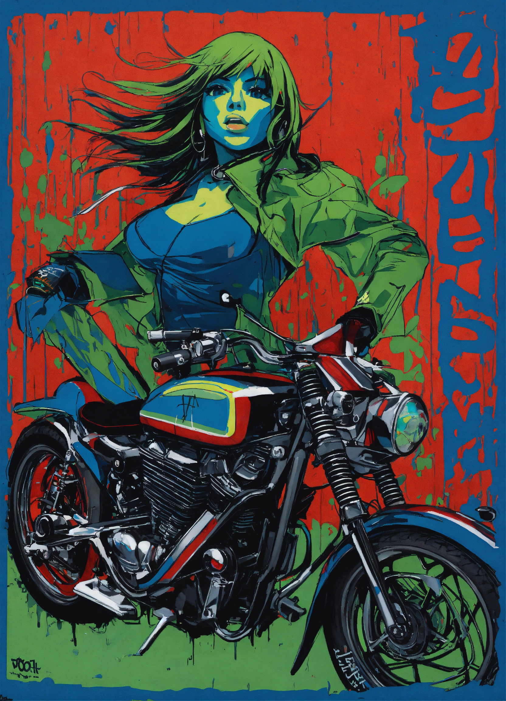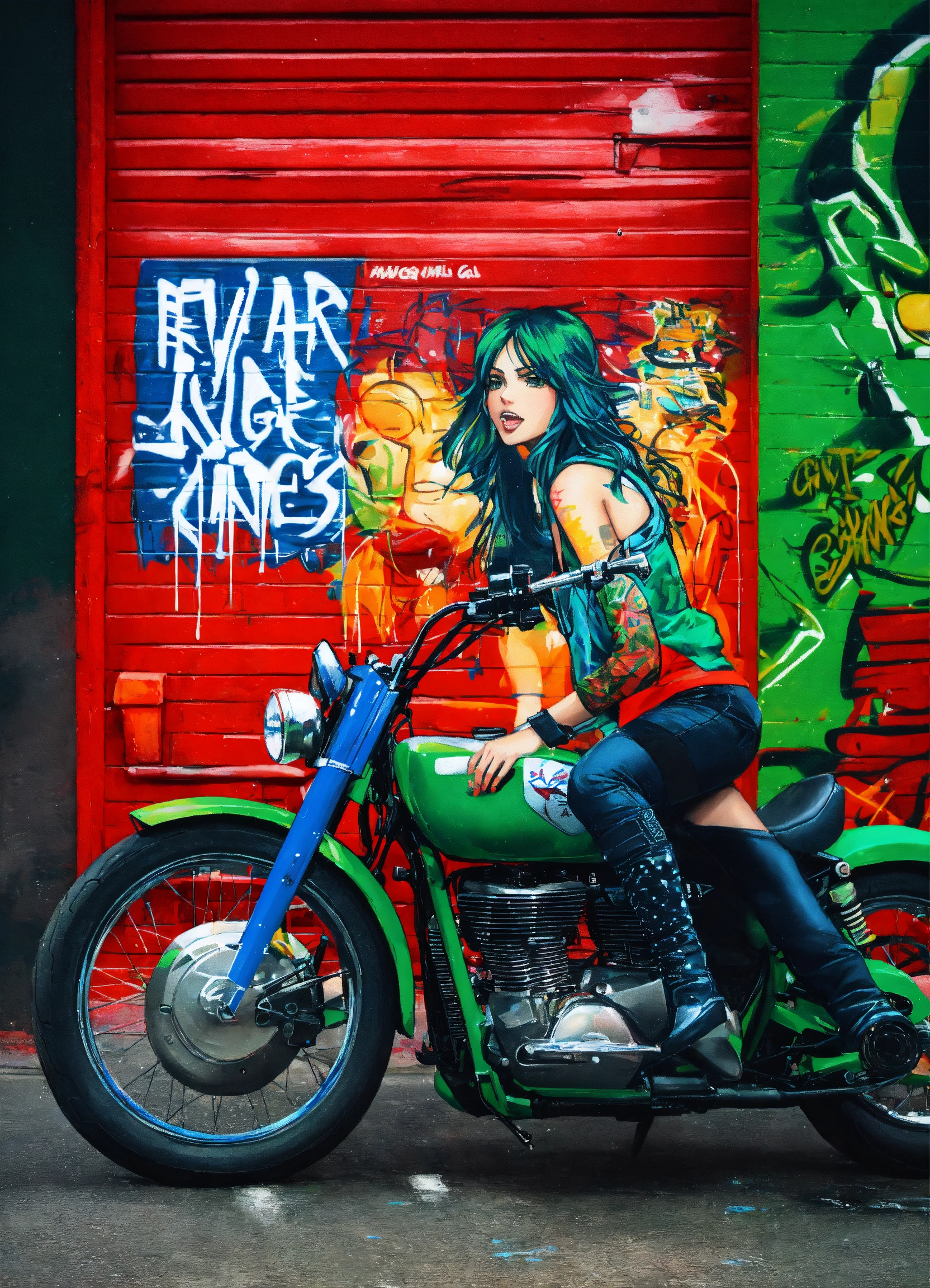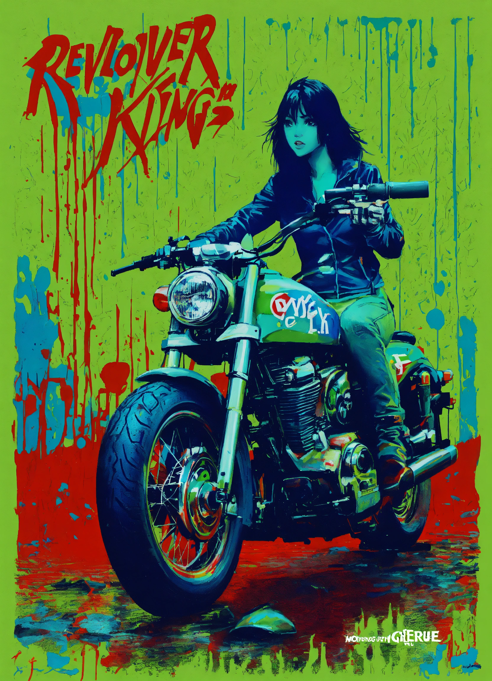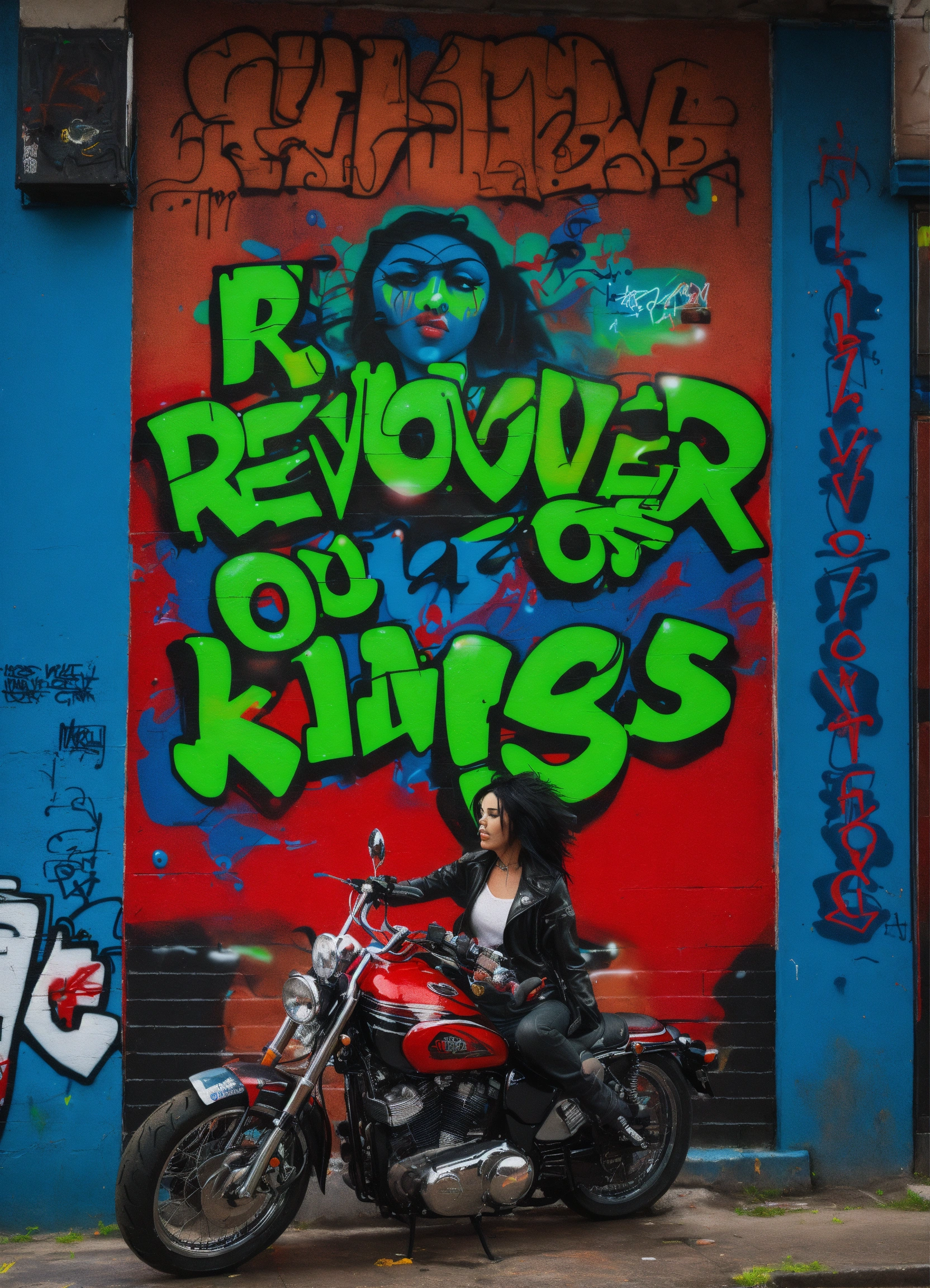 A graffiti saying "revolver of kings" in green, blue and red with a girl on motorcycle in raining day like motley crue