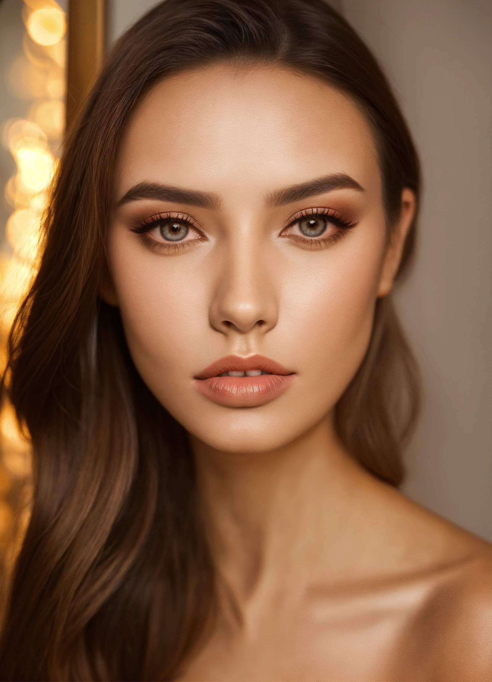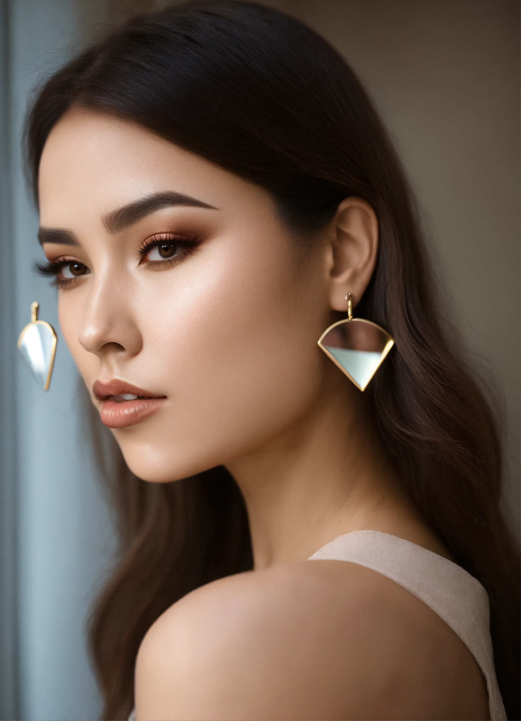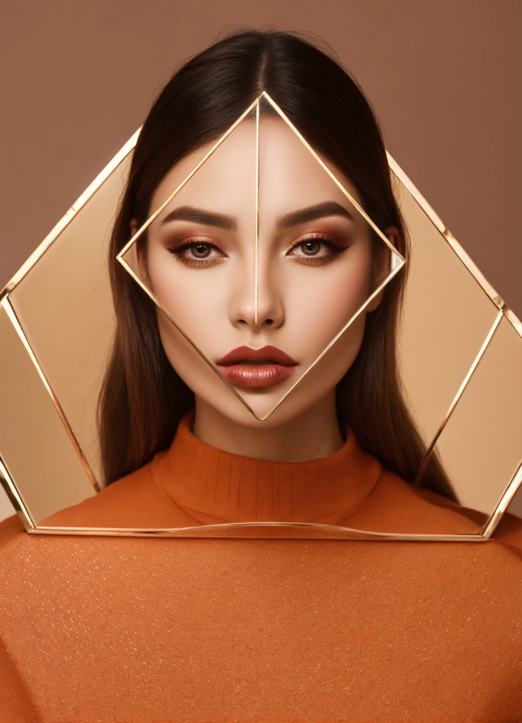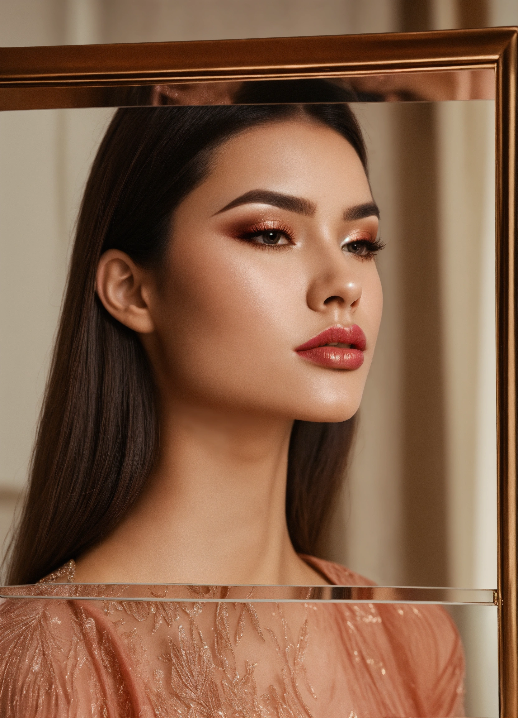 Lips makeup in triangle downturned shaped mirror, beautiful woman with triangle downturned shaped face with large forefront and thin chin
