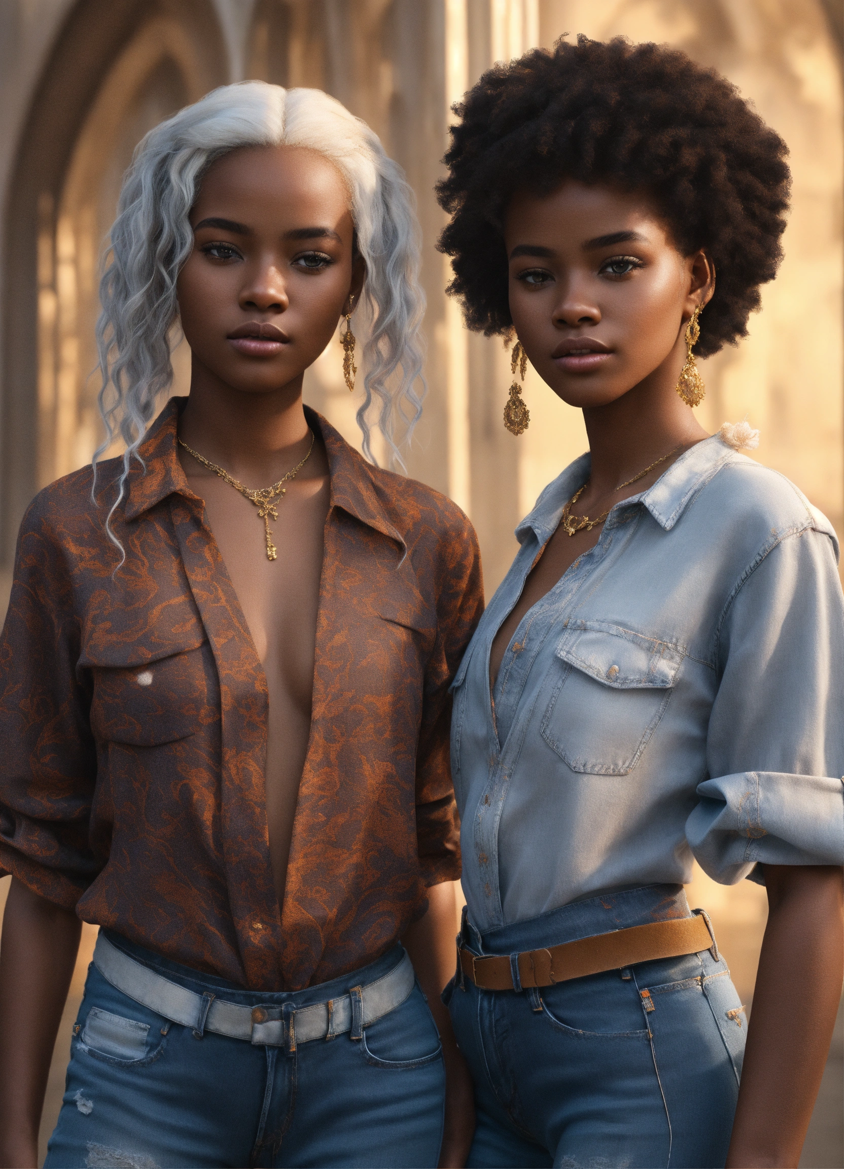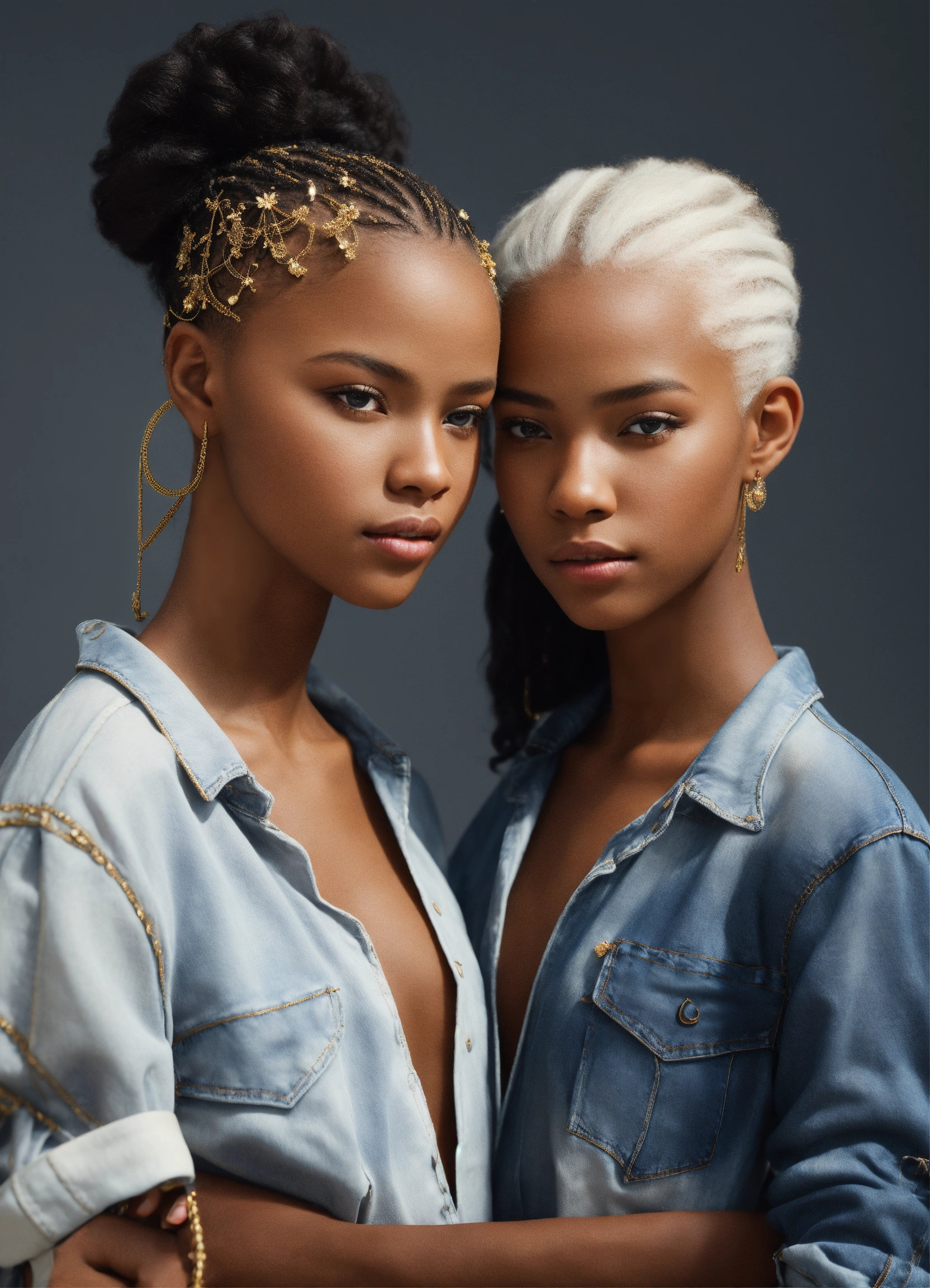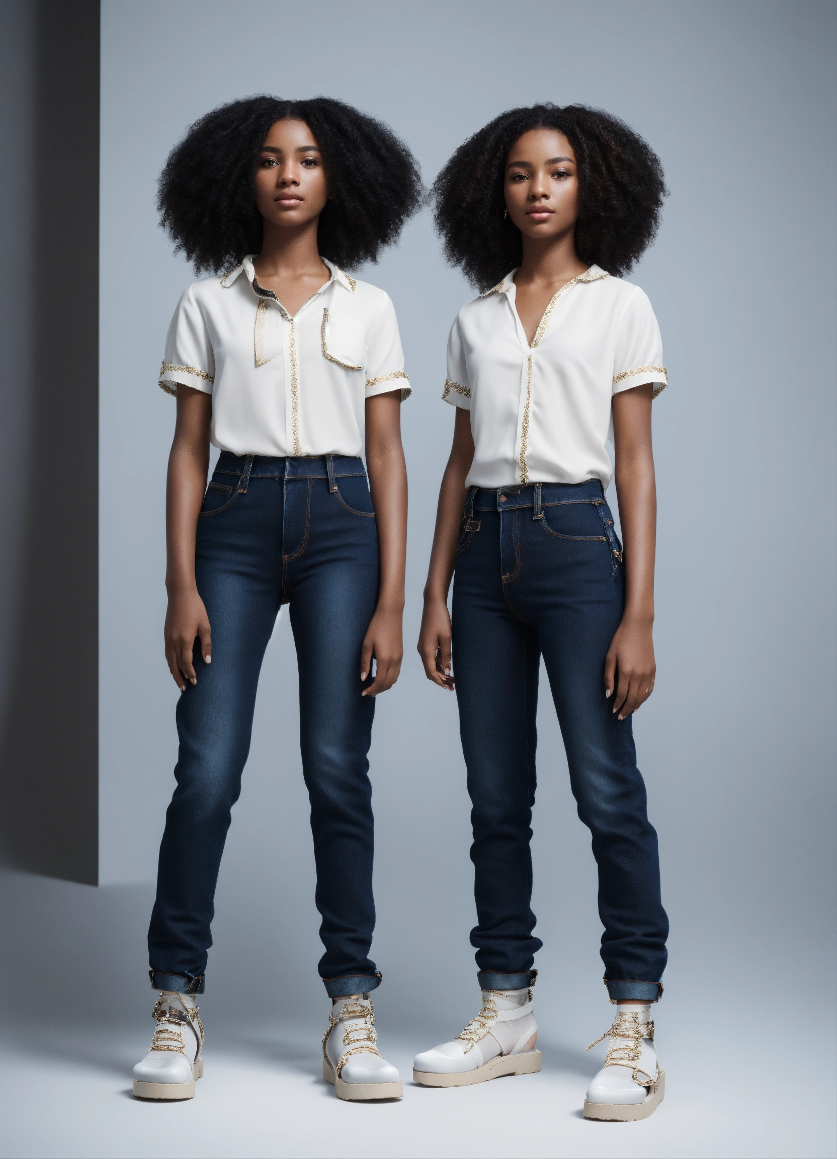 Pretty fraternal twins, twin 13-year-old, one twin white hair. african features, one twin brown-skin, black hair, in haute couture blouse, jeans, and sandles. white background, persona. early morning, cinematic style, high detail, realistic physics, photorealistic, unreal engine, hdr, 8k