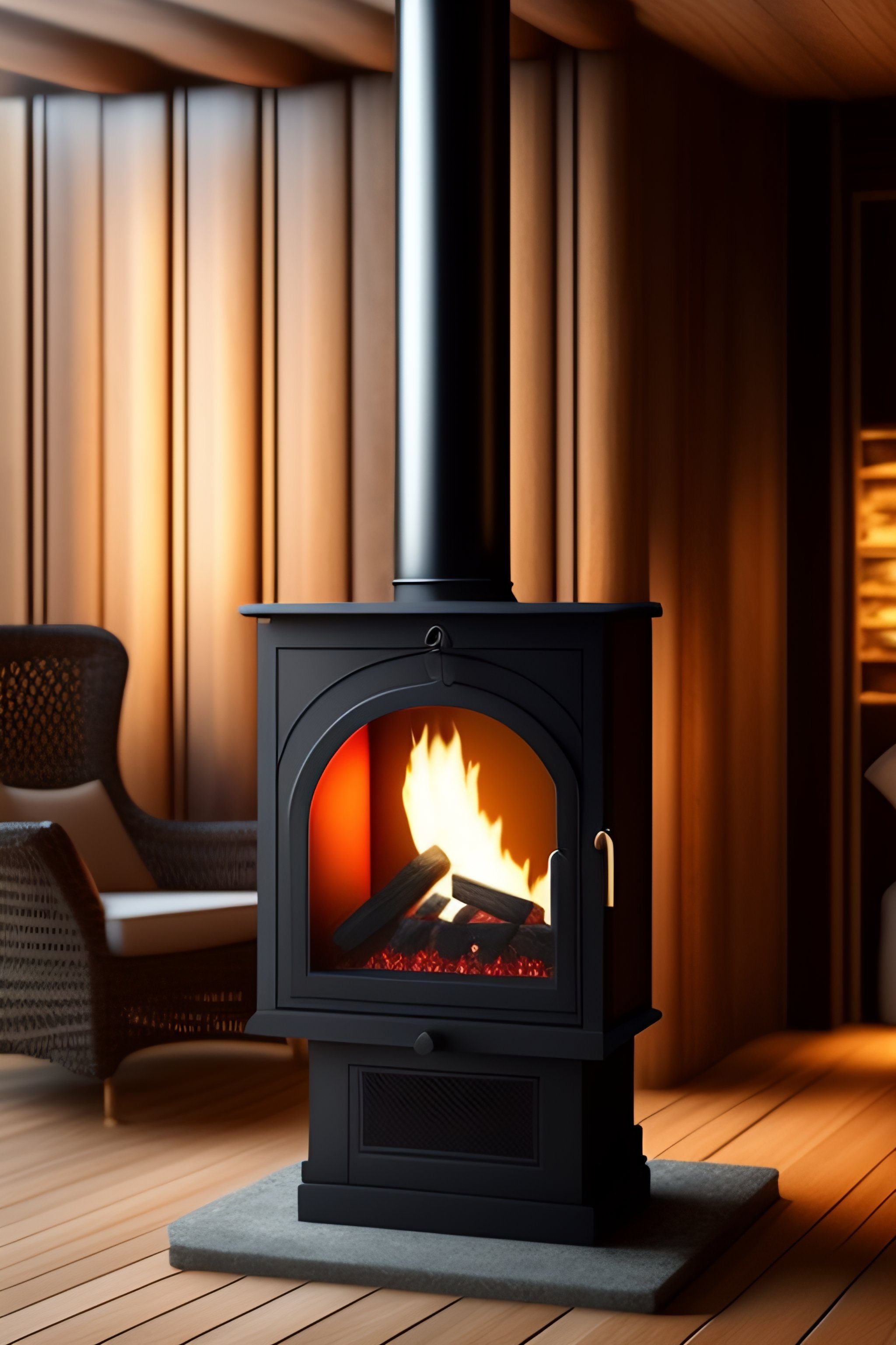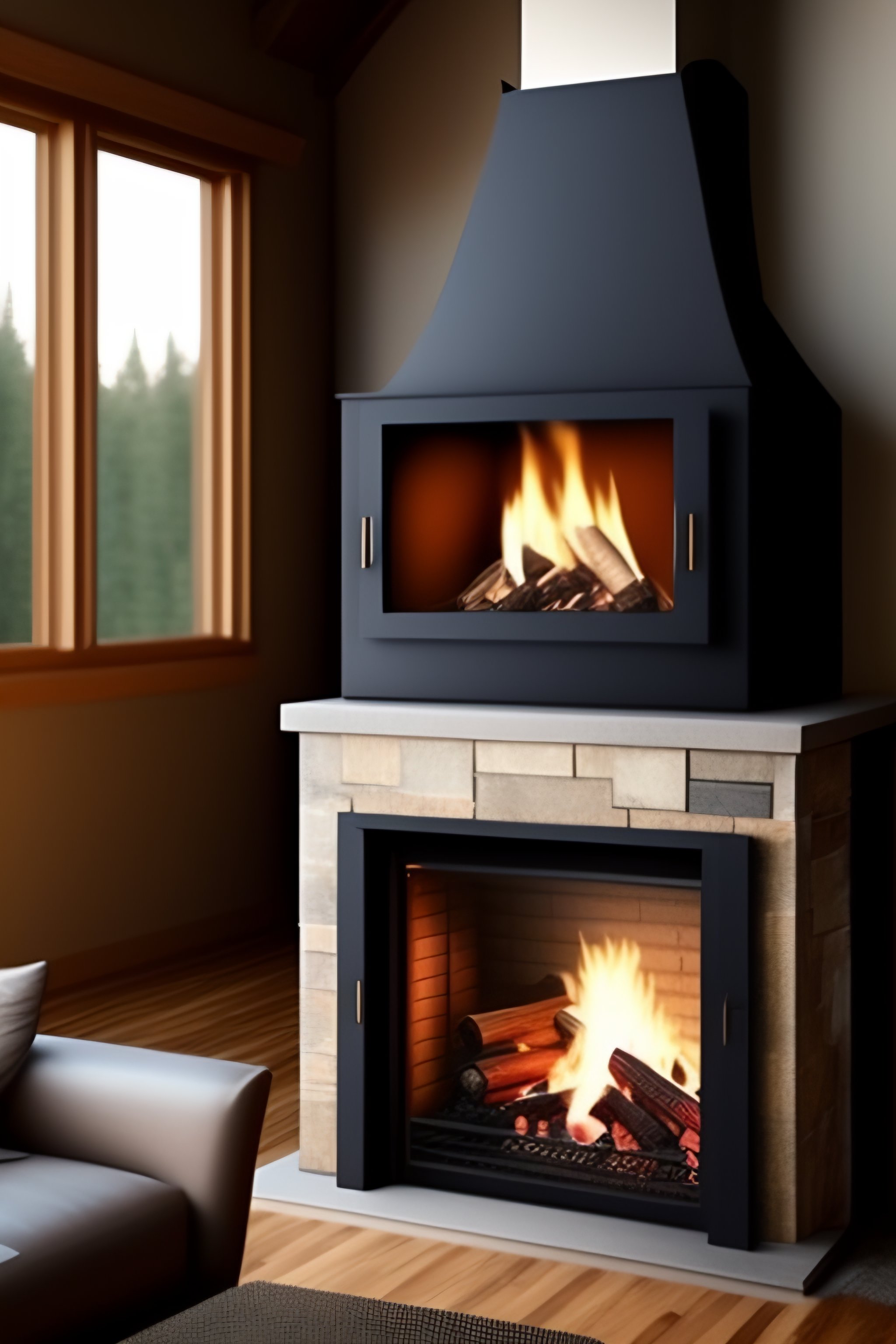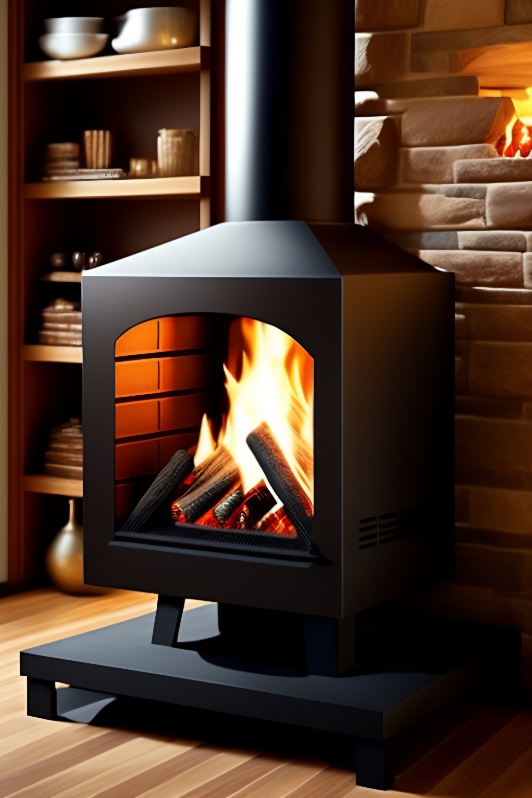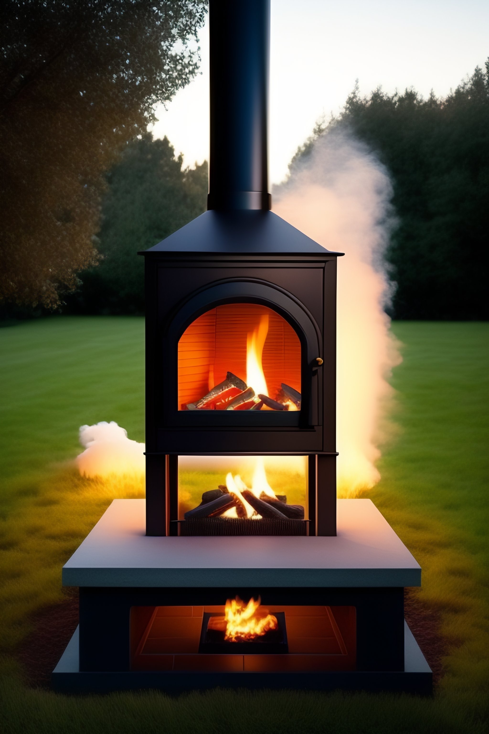 Create an image of a small, portable fireplace that has a cooking area on one side. the fireplace should be made of metal and have a square frame that is 1x1 meter in size. the front of the fireplace should have a small opening for air to enter and fuel the fire. the cooking area should have a flat metal surface that can be used to place a small stove or grill. the fireplace should also have a chimney on top to vent out smoke.