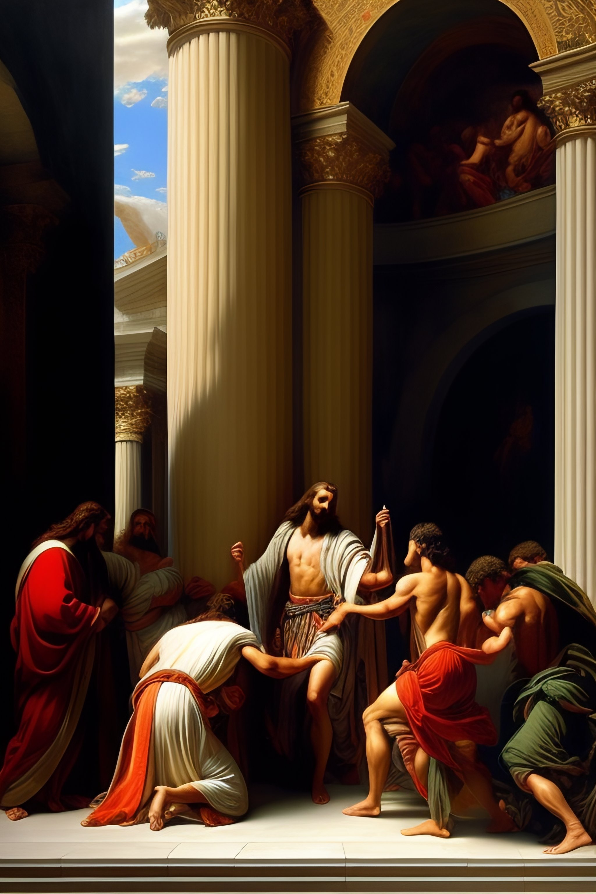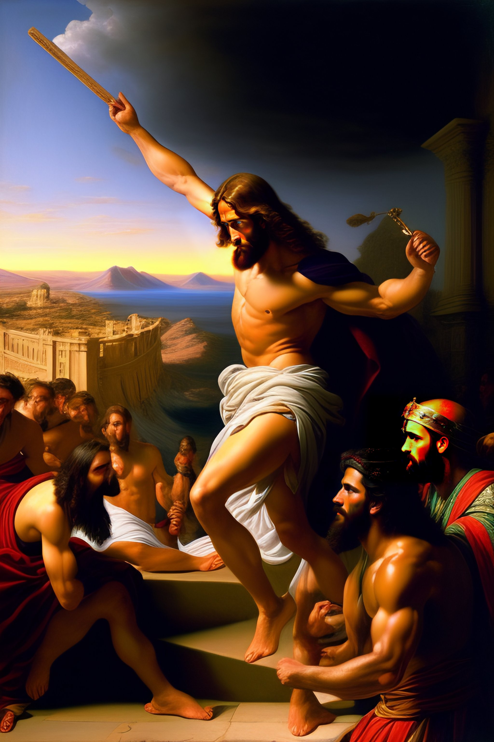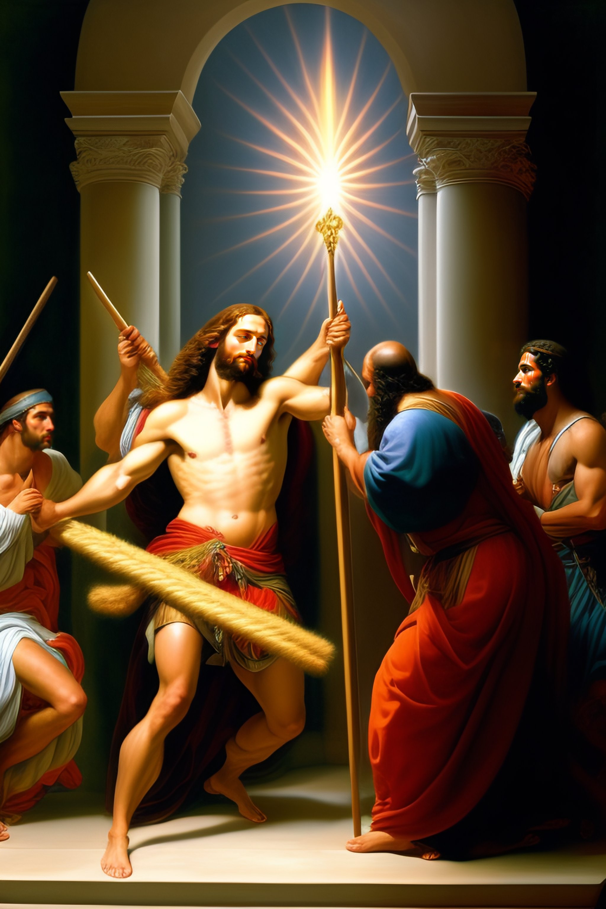 Jesus christ being flogged by the romans and a strong light from heaven, realistic style, surrealism, detailed, hyperrealism, imaginative trippy