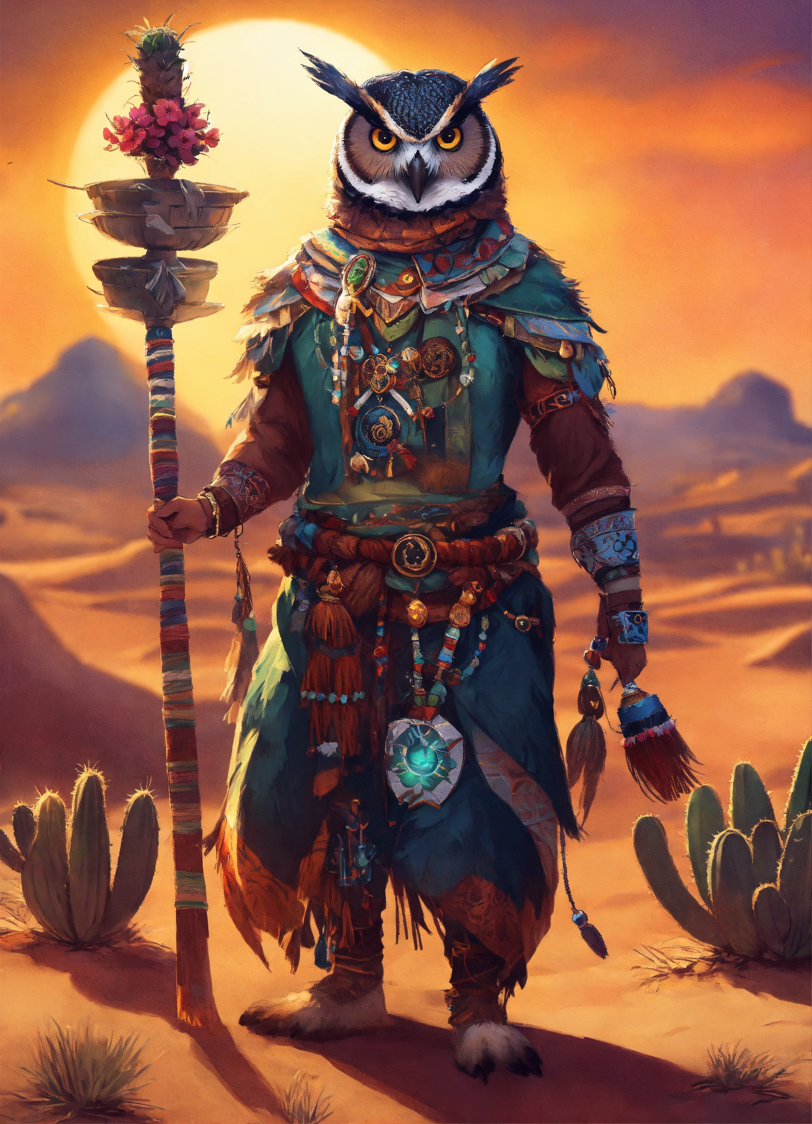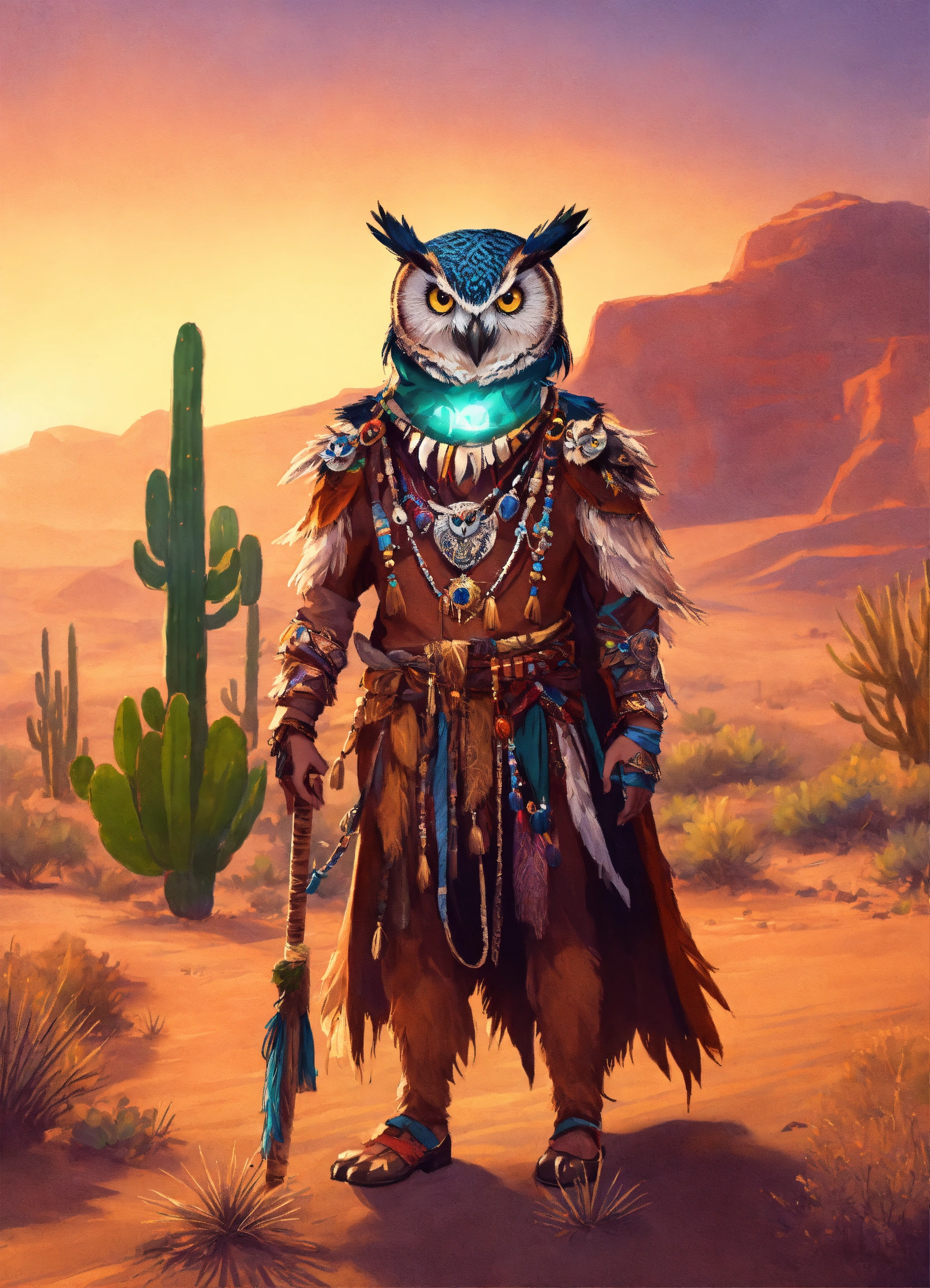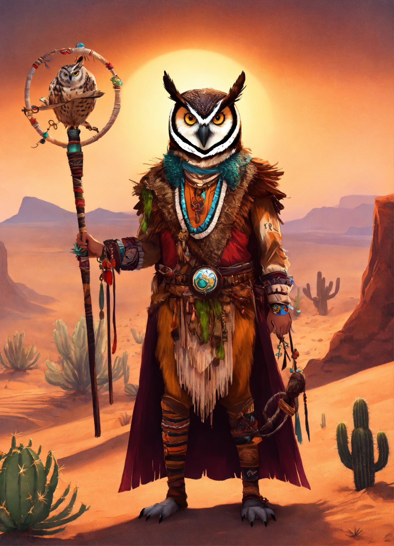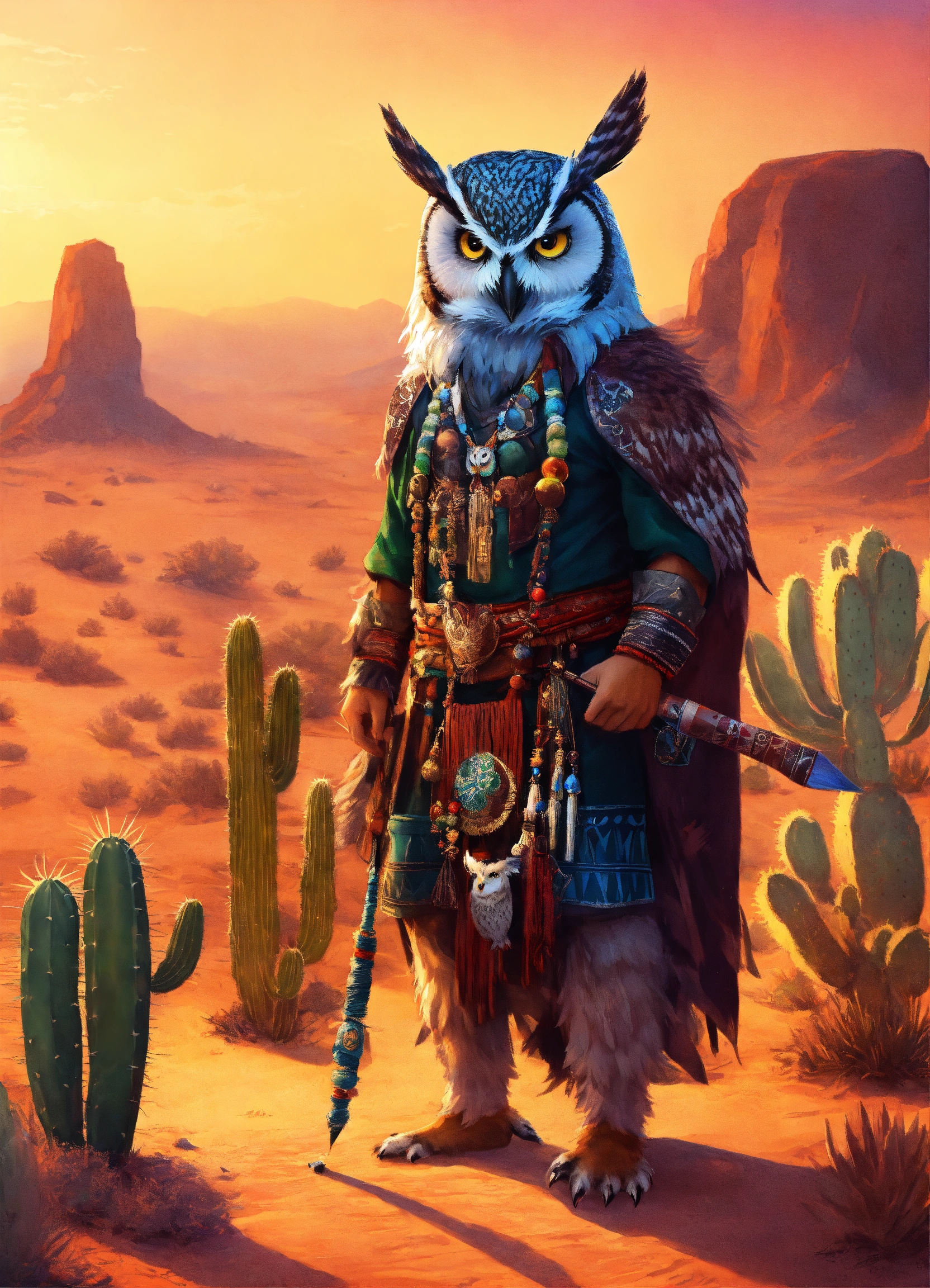 Owl witch doctor, male, animal, warrior, weaving enchantments, shaman simbols, beautiful picture, beautiful style drawing, epic, cactus in the background, desert in the background