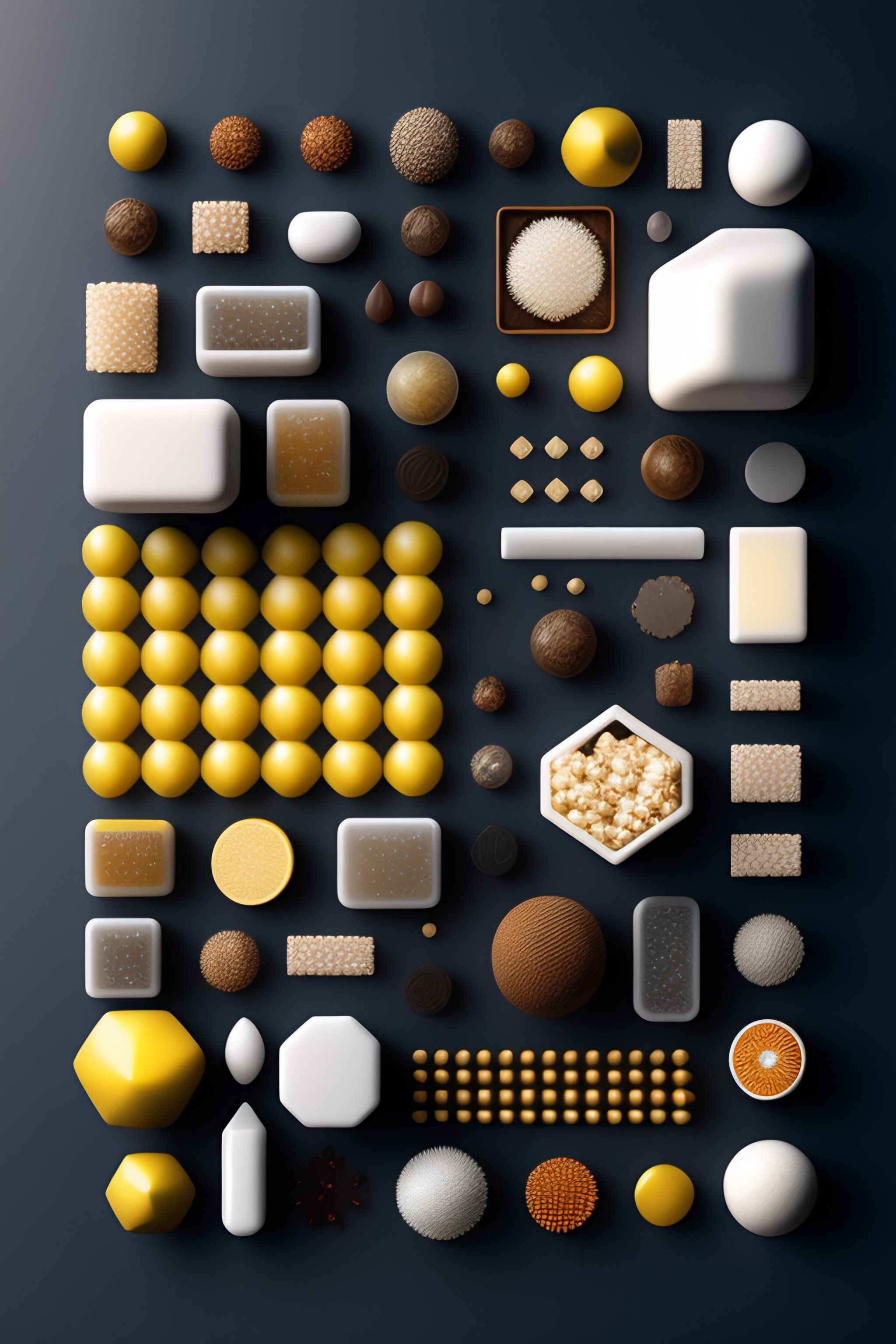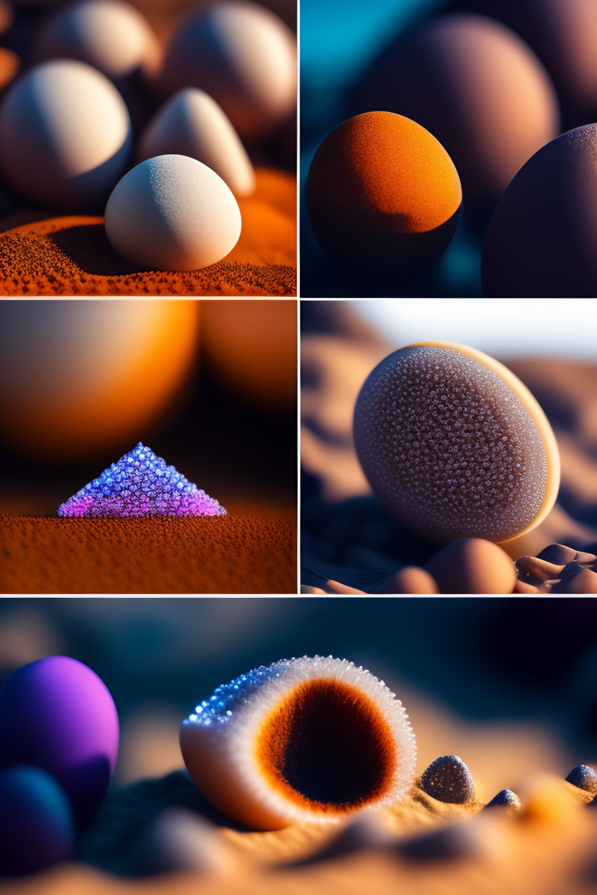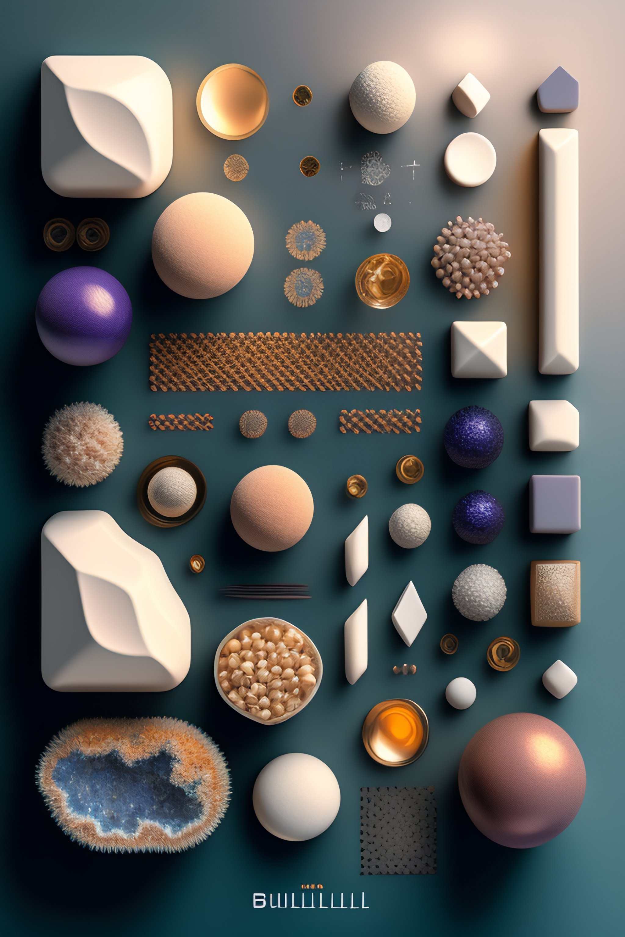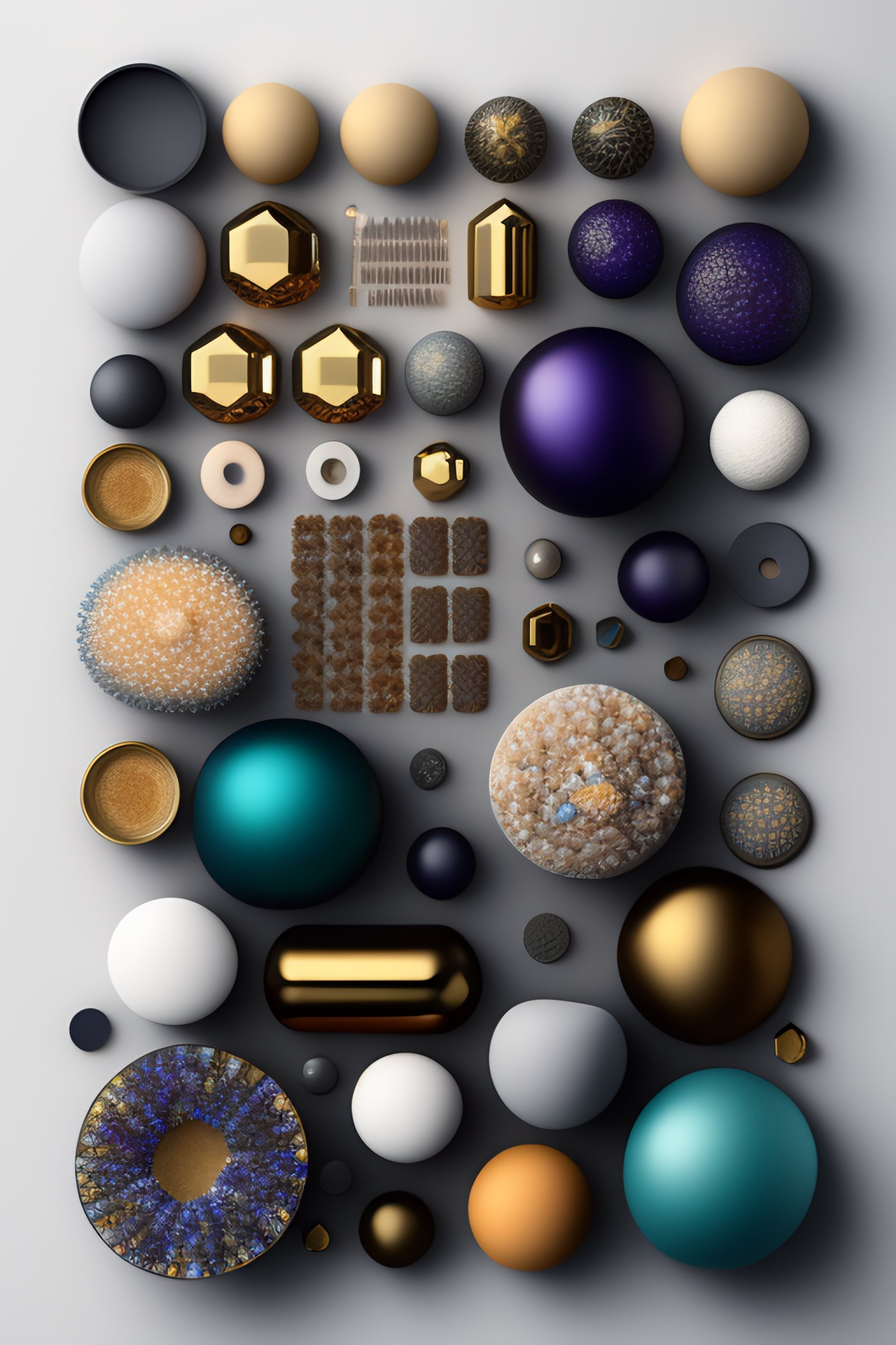 Geodes, knolling, knolling layout, deconstruction, highly detailed, depth, many parts, lumen render, 8k