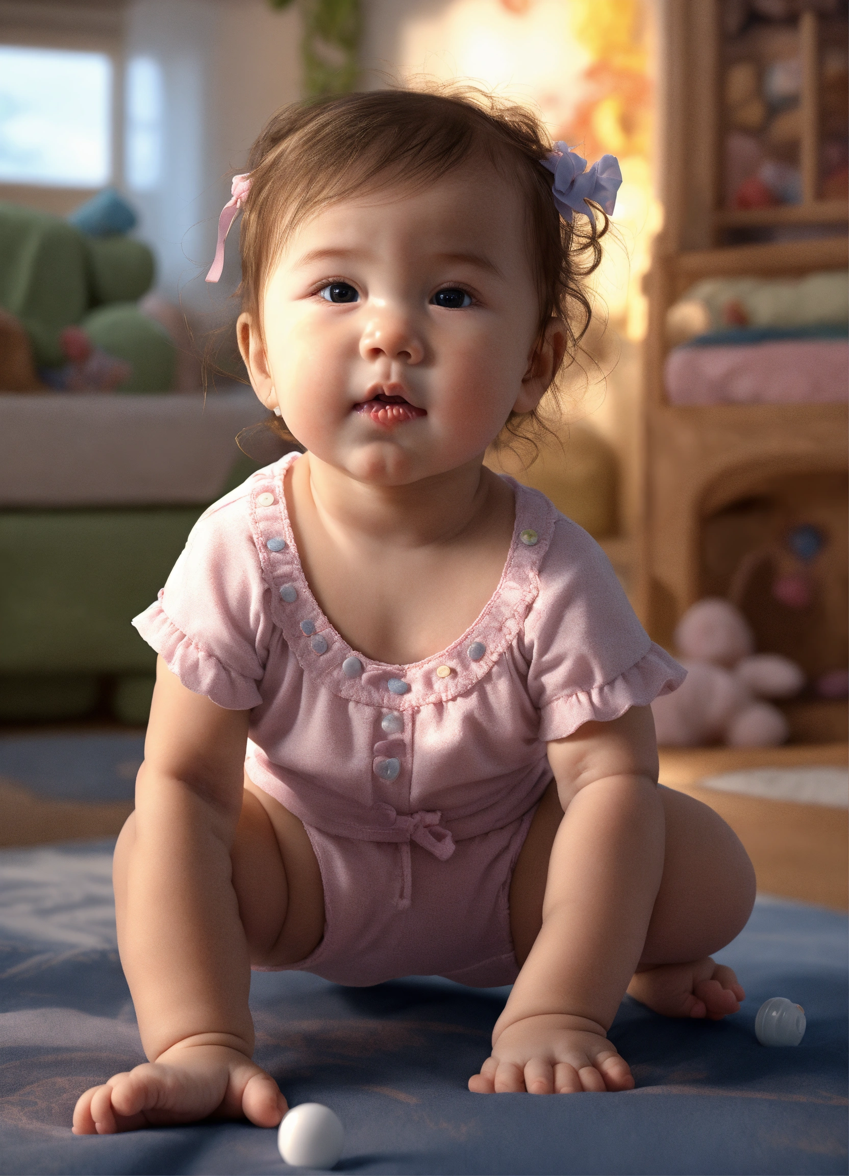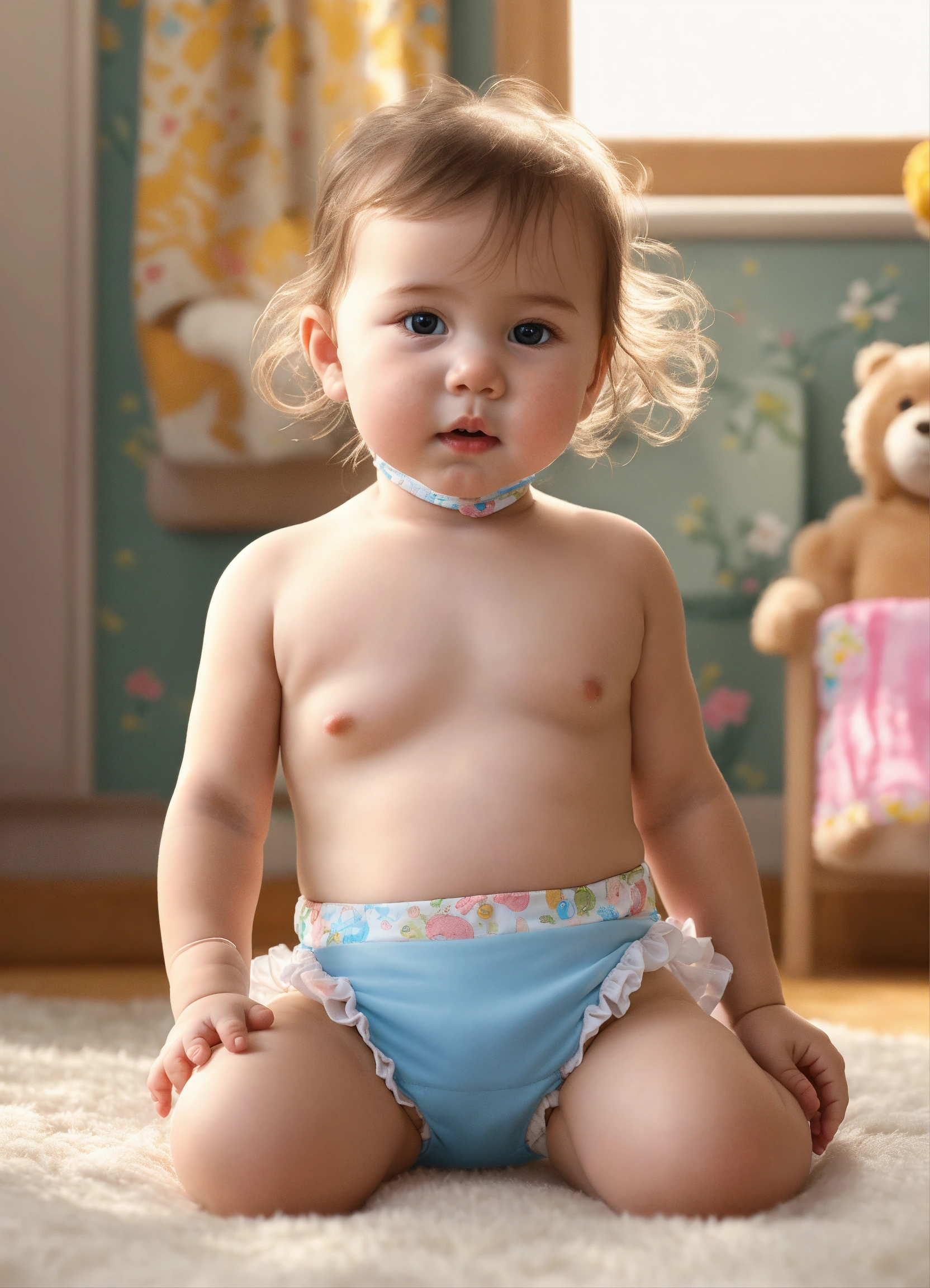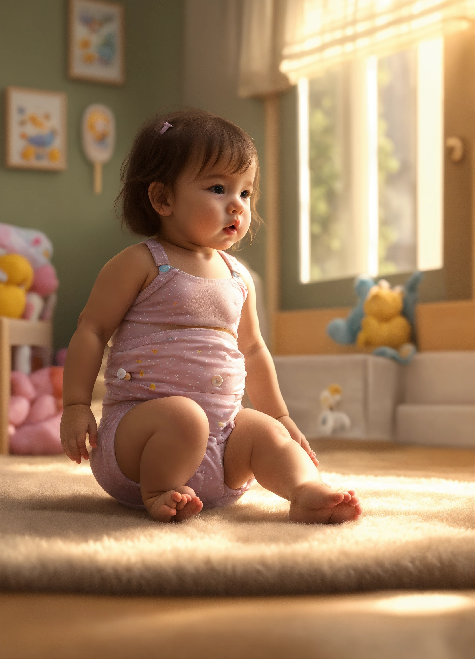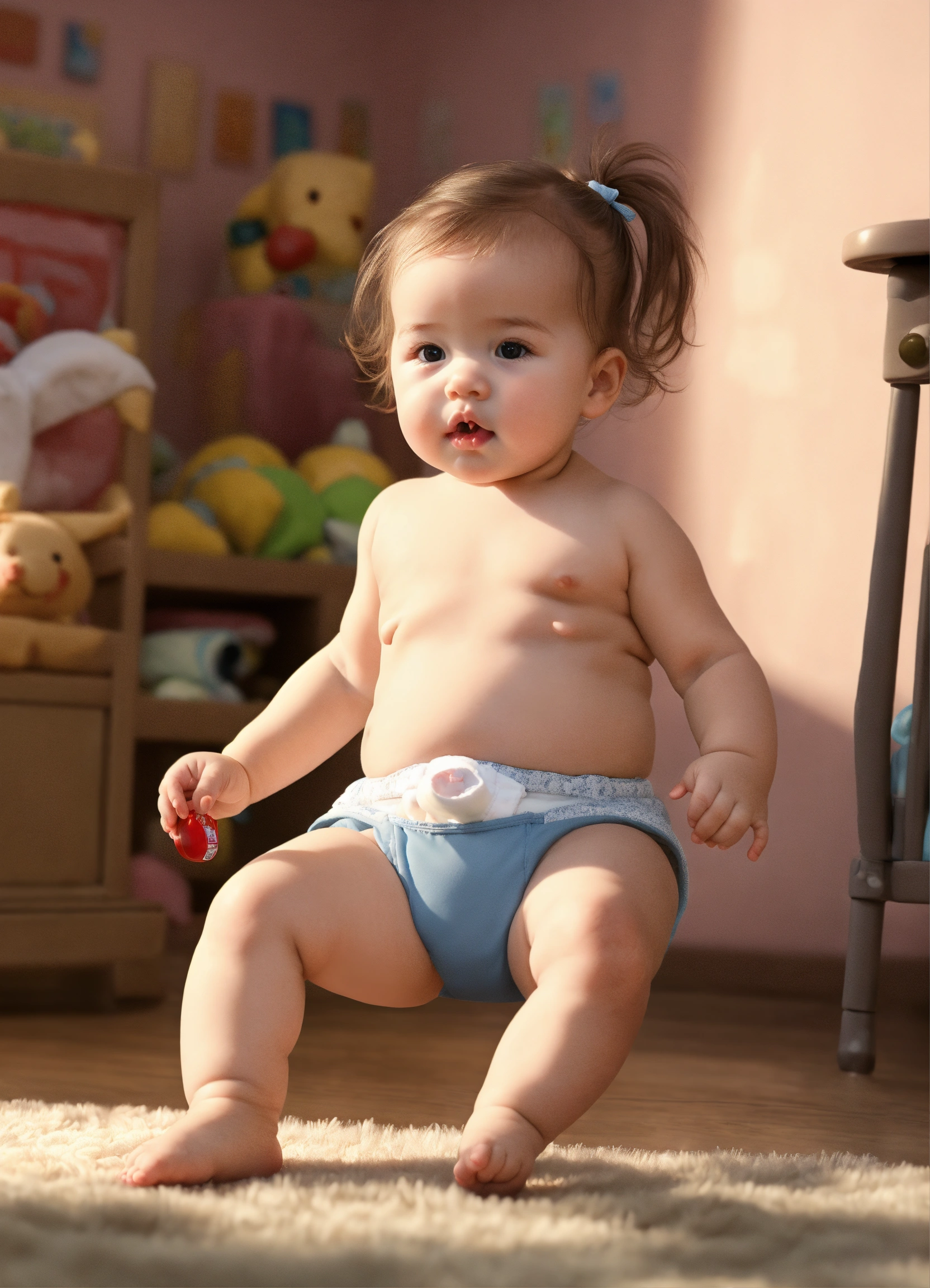 Art of a toddler girl wearing a diaper, diapered, beautiful, toddler, pacifier, bellybutton, chest, young girl, realistic, legs, 8k, stunning detail, realism, ray-traced environment, detailed scenery, playroom, crib