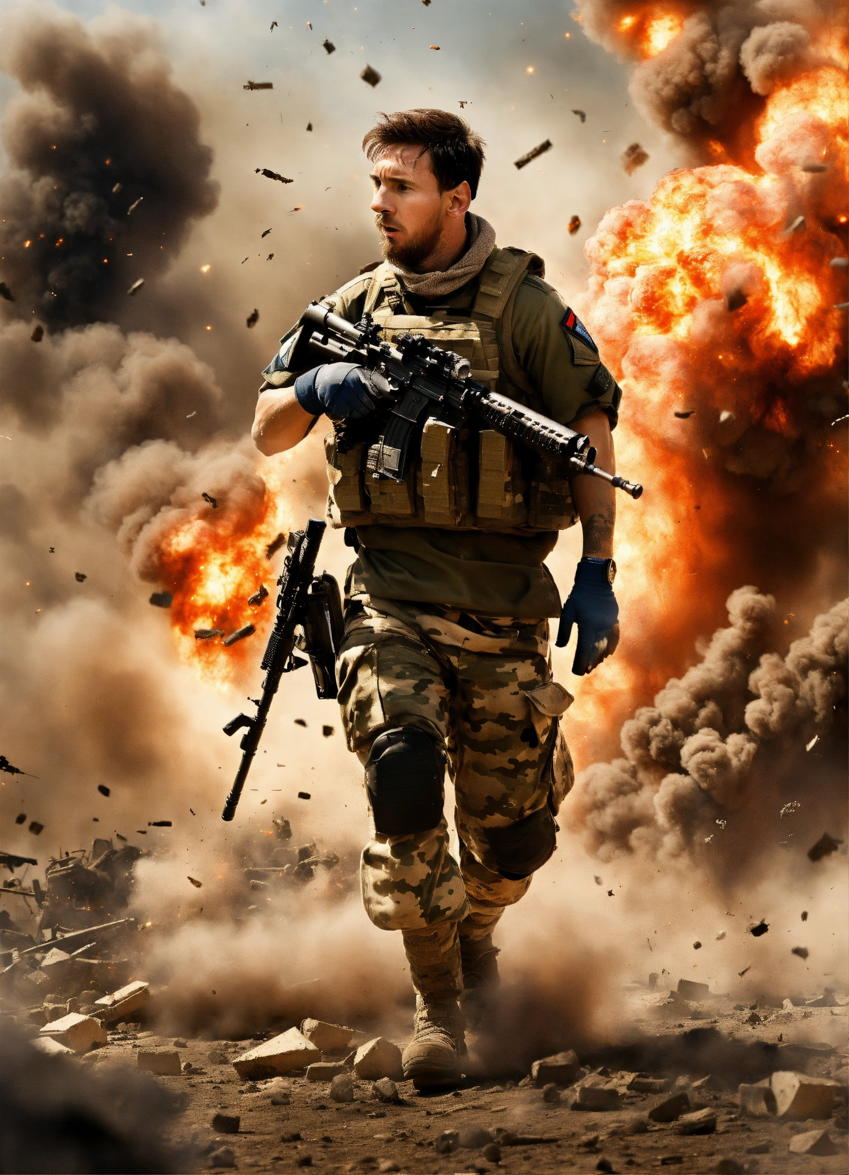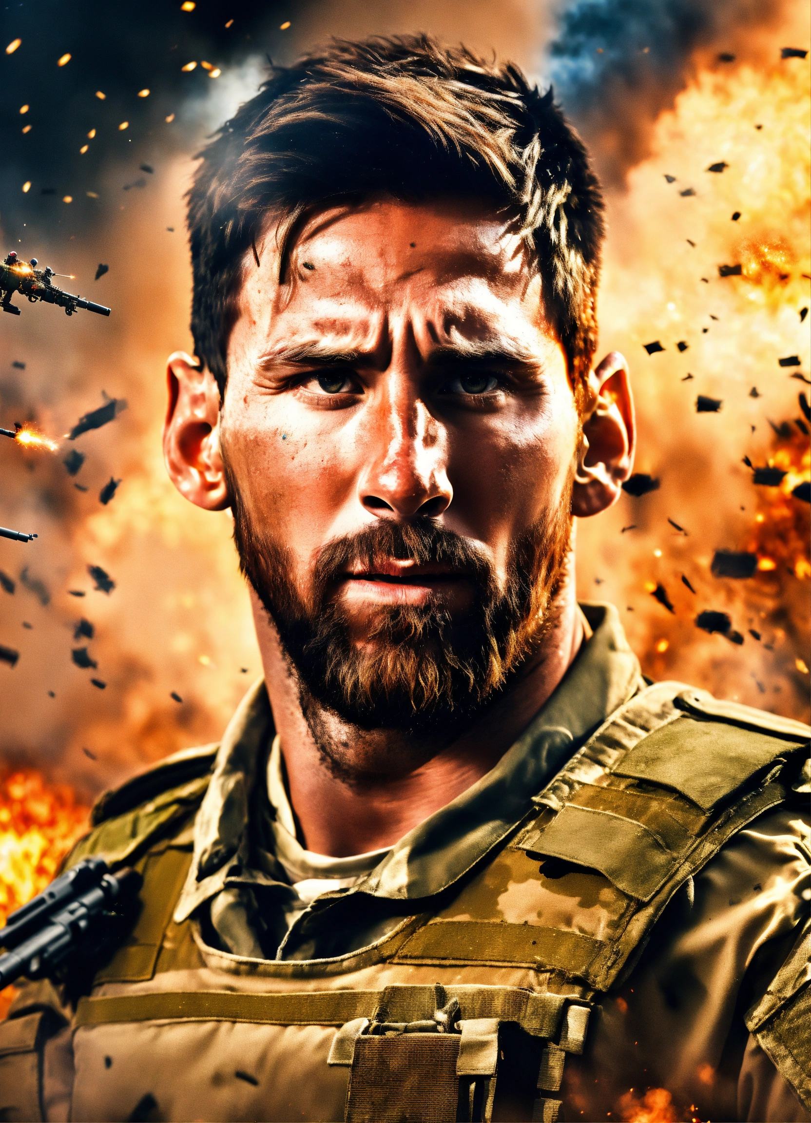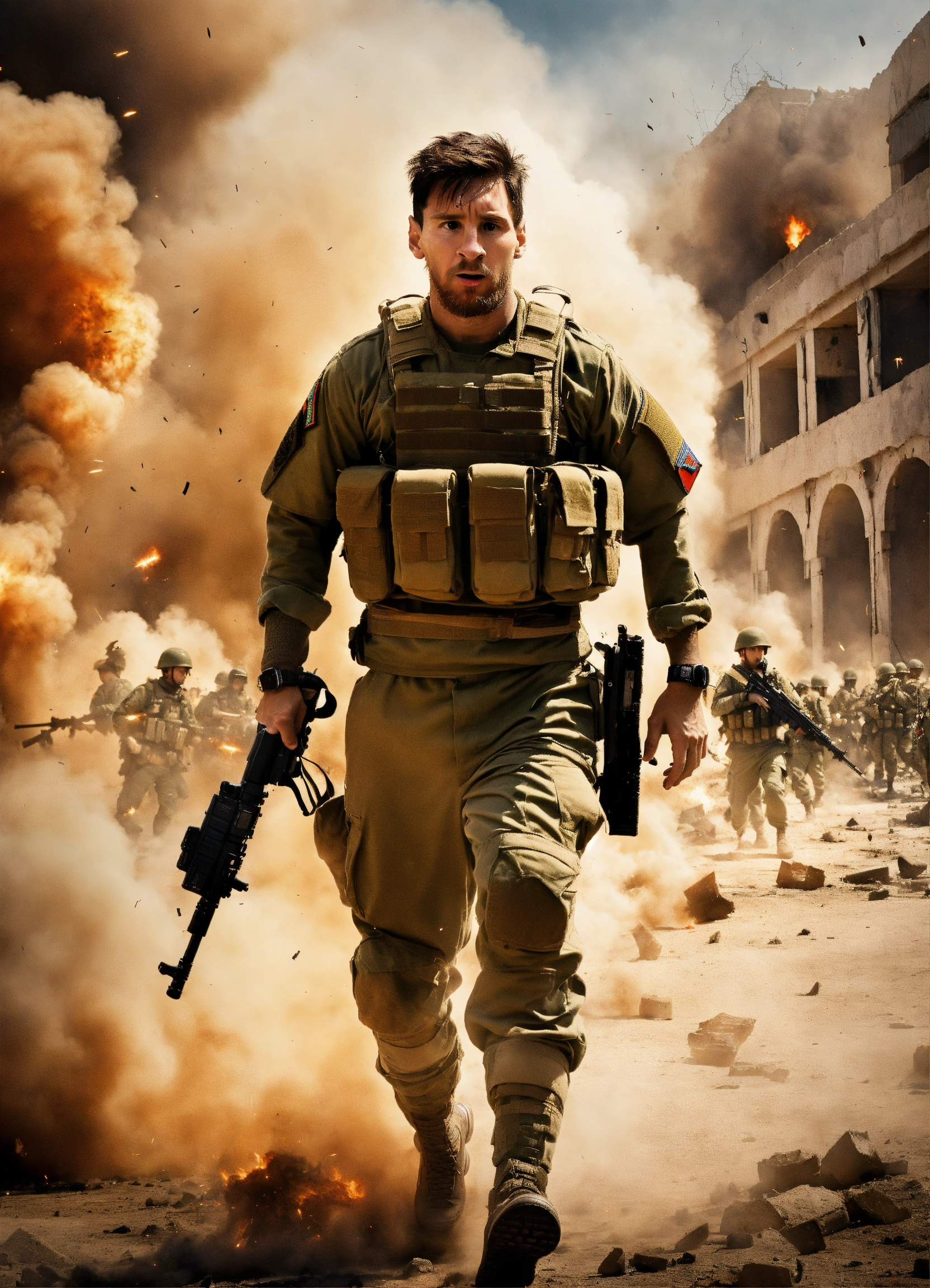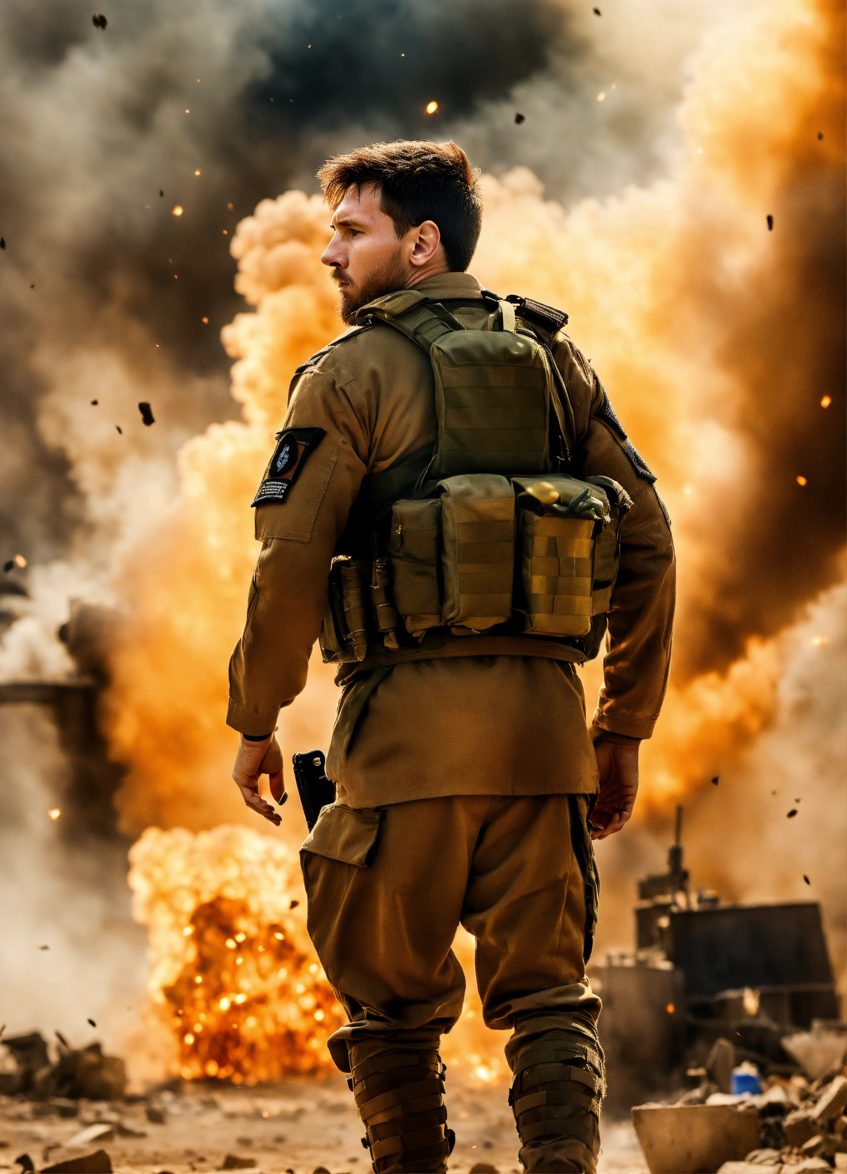 Messi in israeli soldier uniform, in the midst of a battle scene, a soldier stands determined. the background is blurred, capturing the chaos of war, with flying ember particles adding to the intensity of the moment.