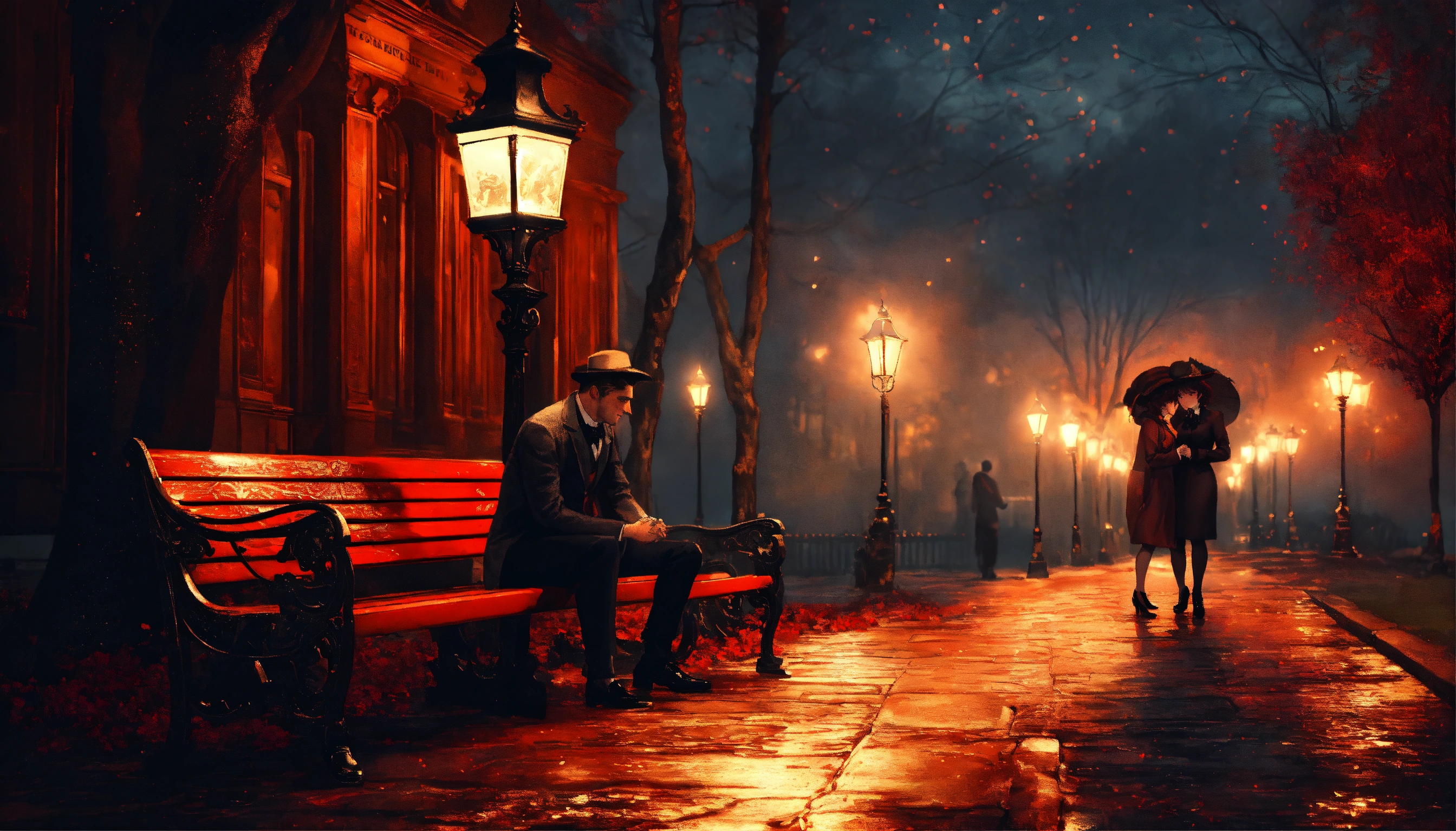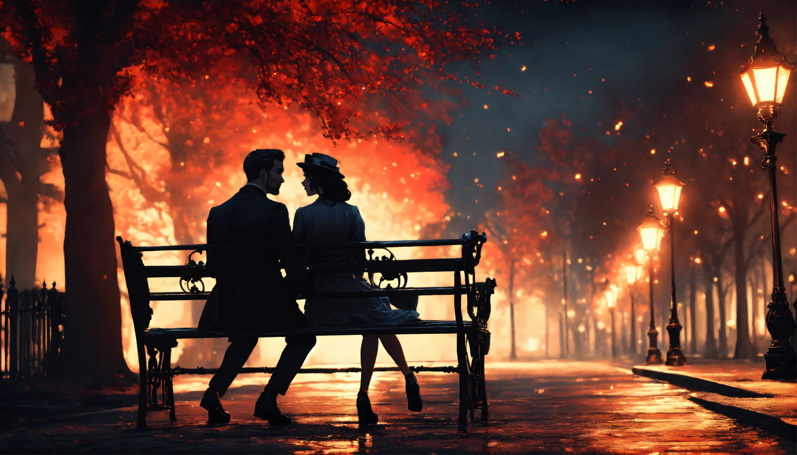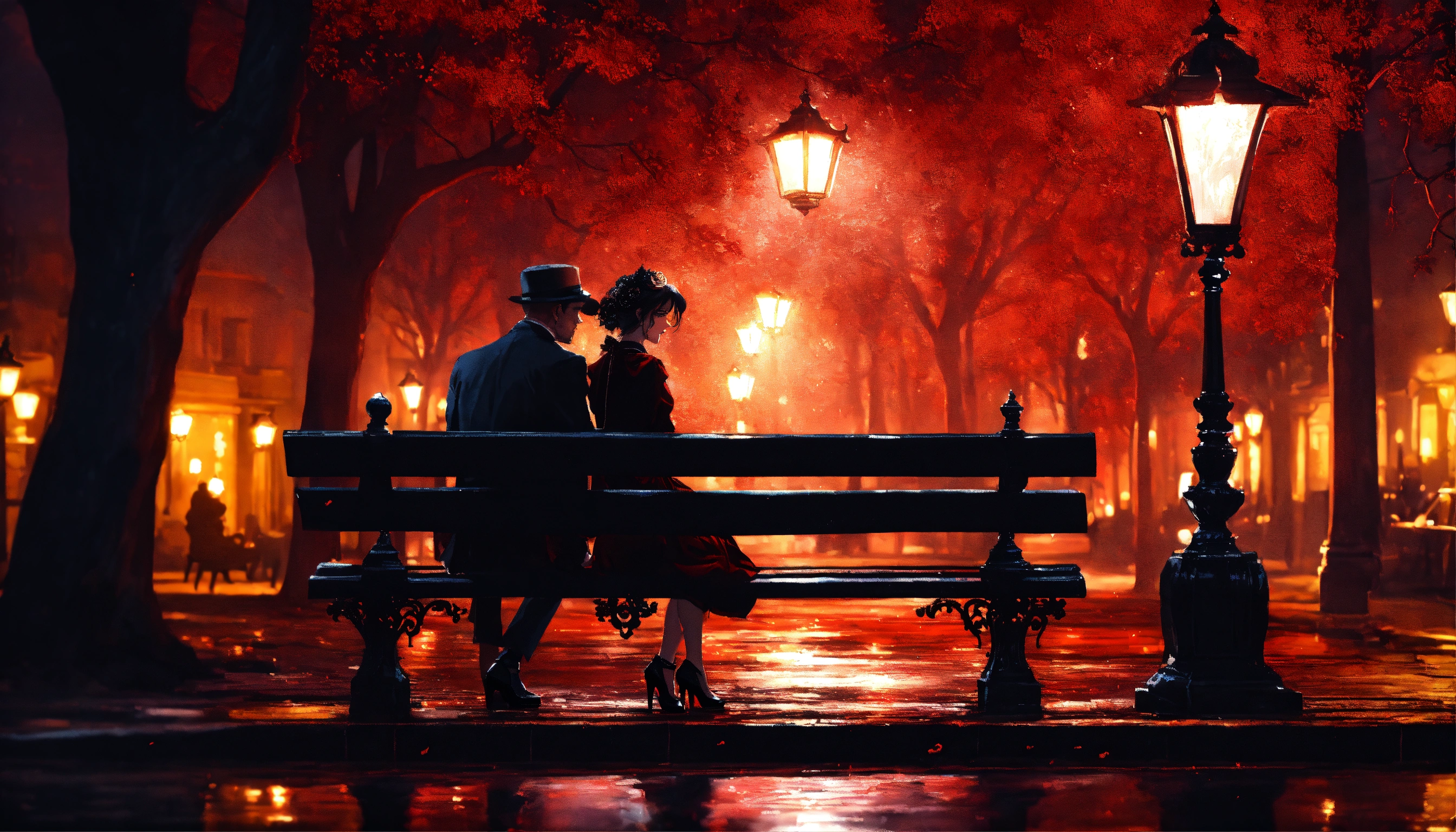 A handsome man and a pretty female sitting on a park bench holding hands under a victorian street lamp, splash art, 1920s, louis royo style, modern look, sparkles, shining, black and red, scary creepy, unreal engine, moonlight, intricately detailed, modern european ink painting, 8k, cinematic