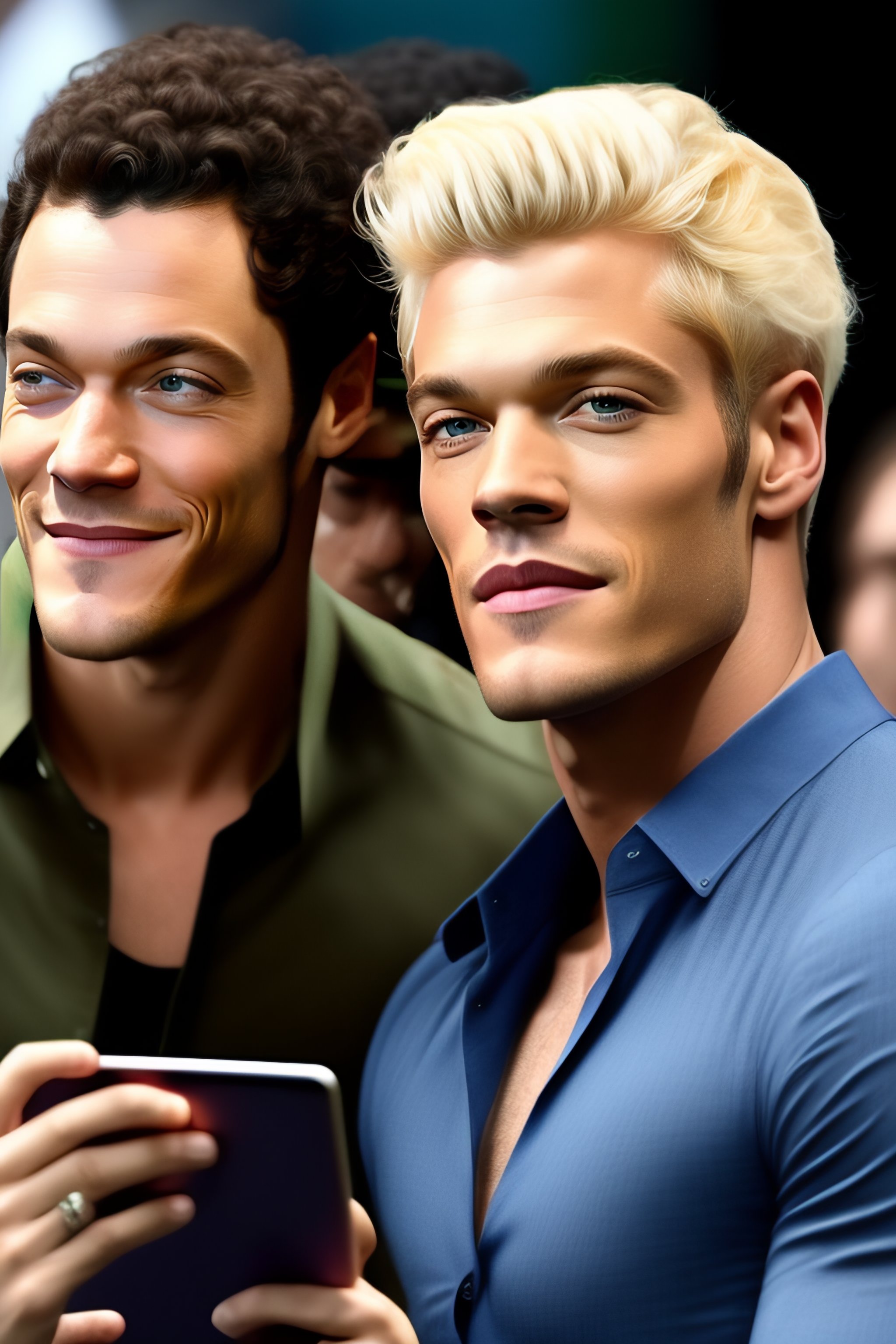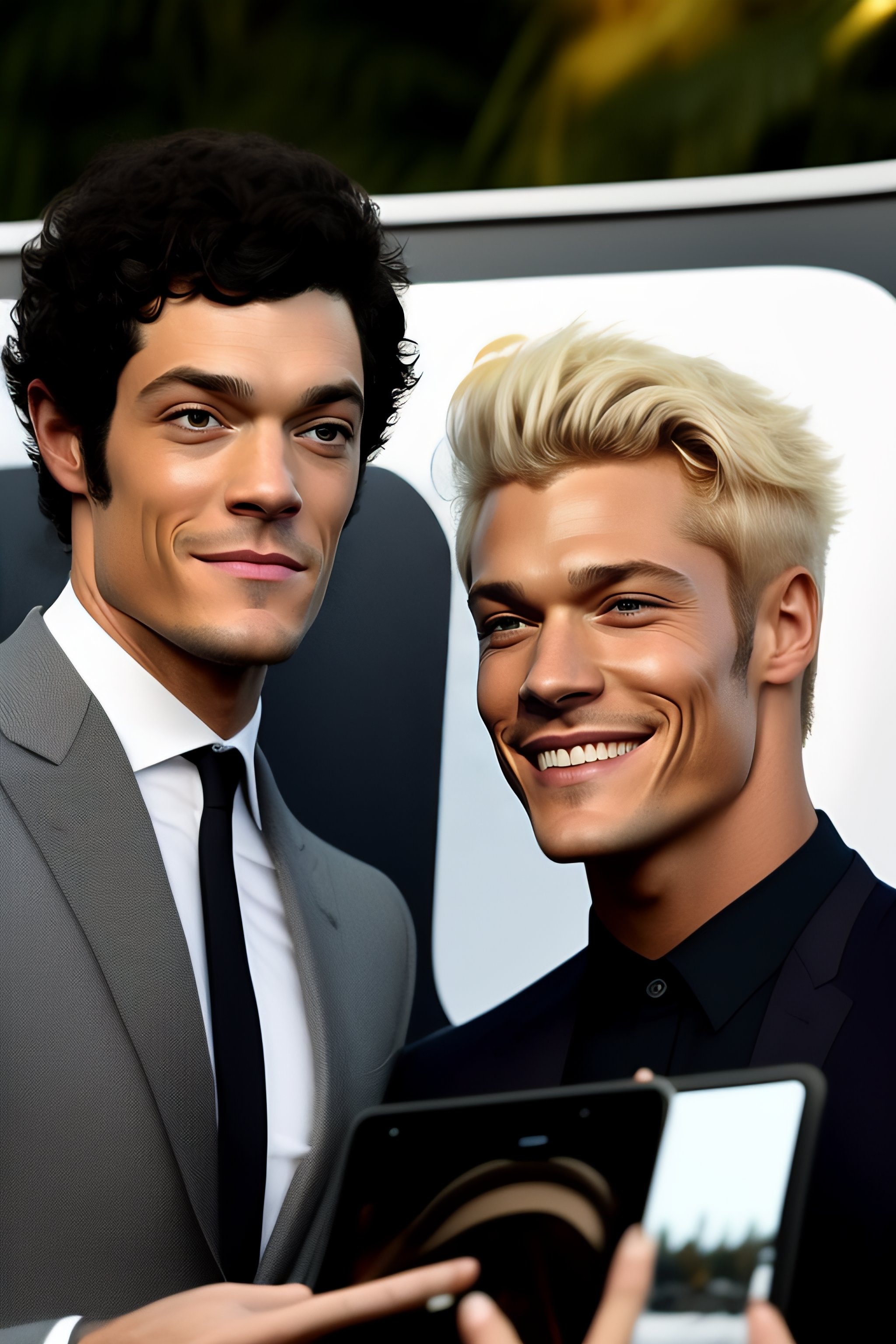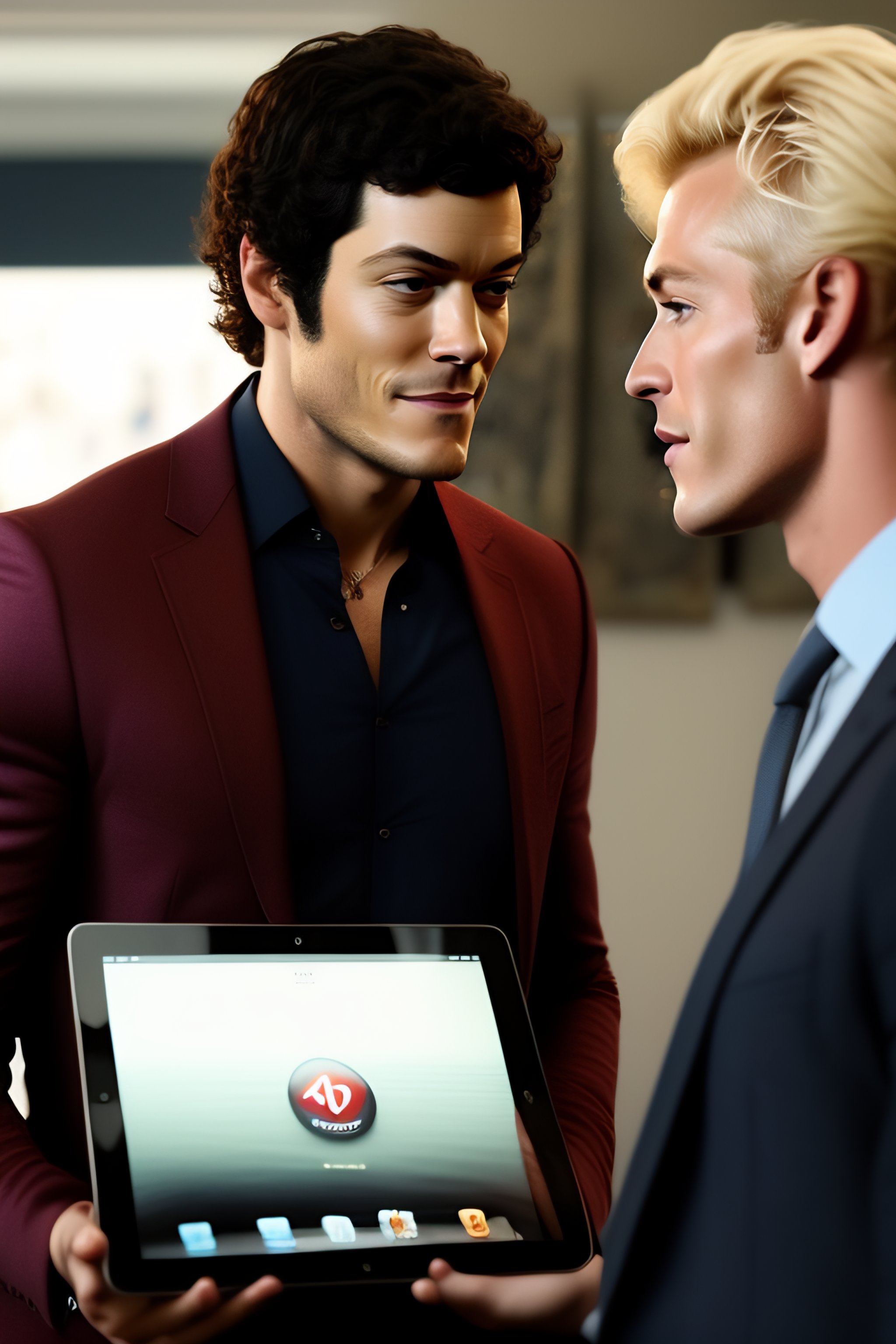 Actor adam brody is surprised to see the face of a male blonde friend of his on his ipad