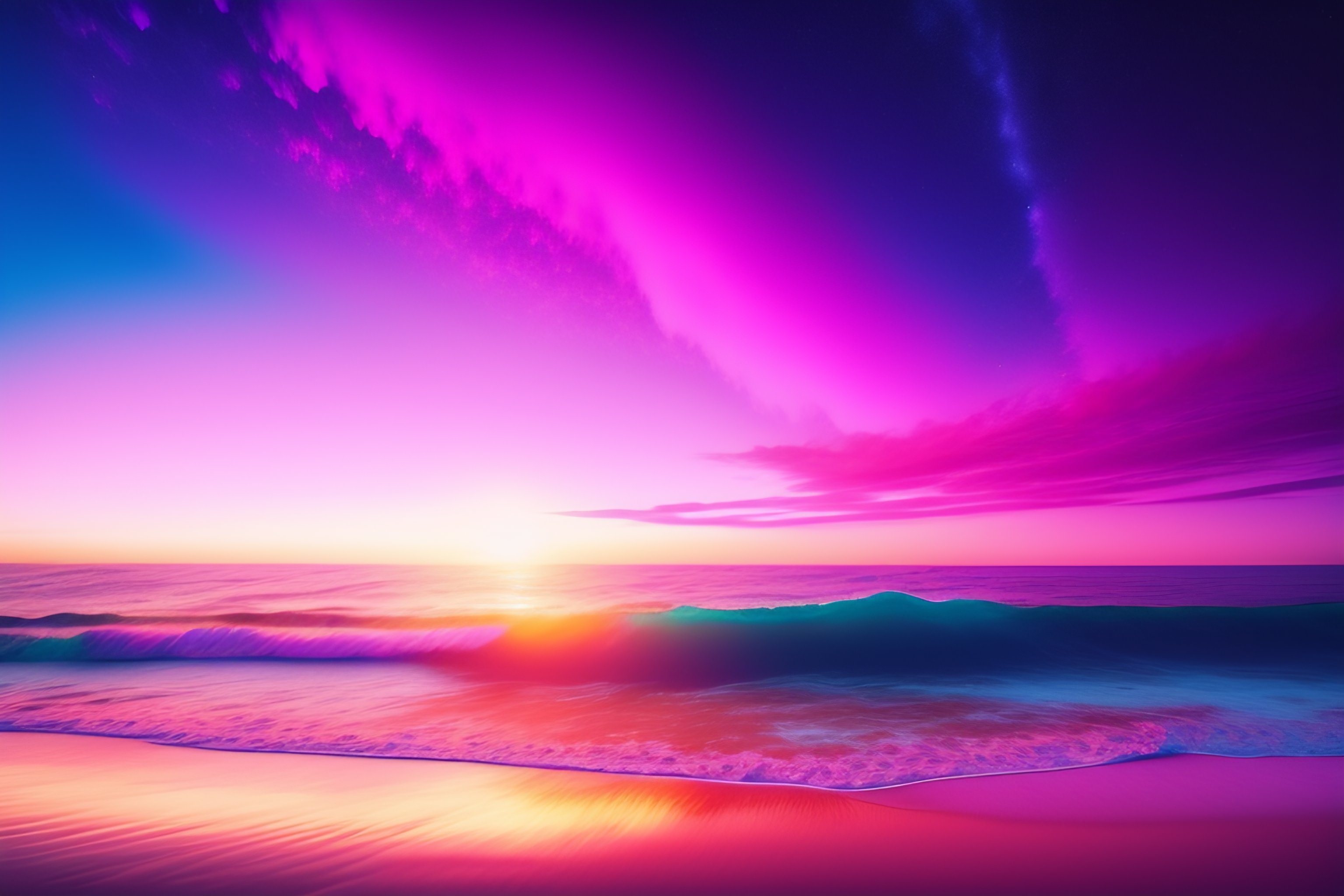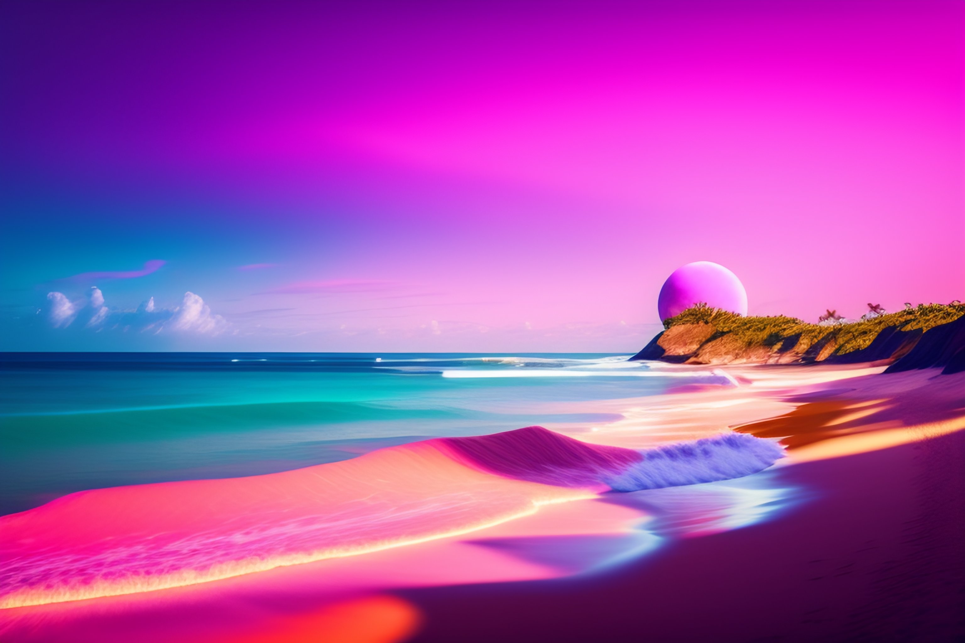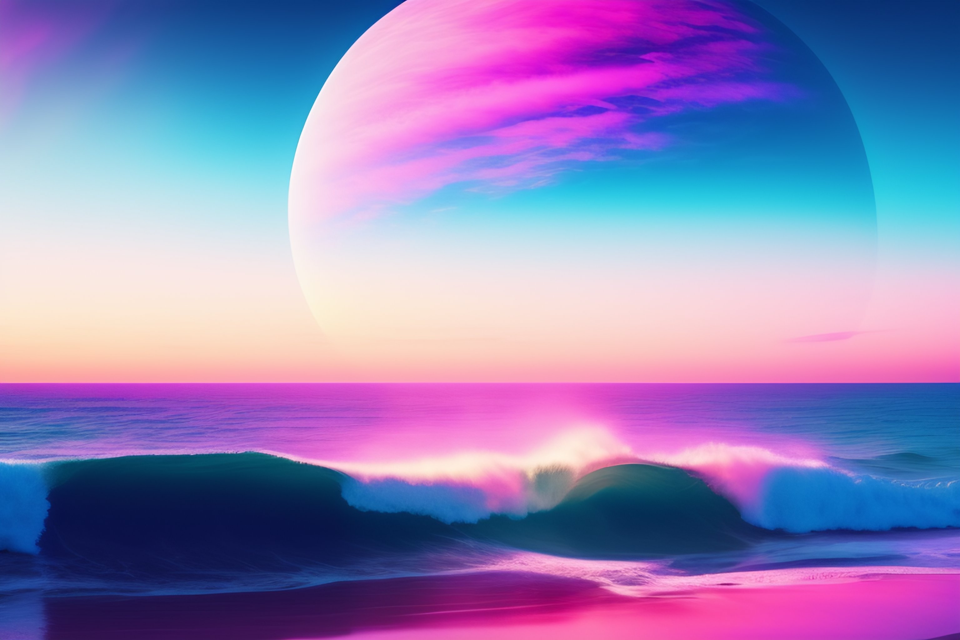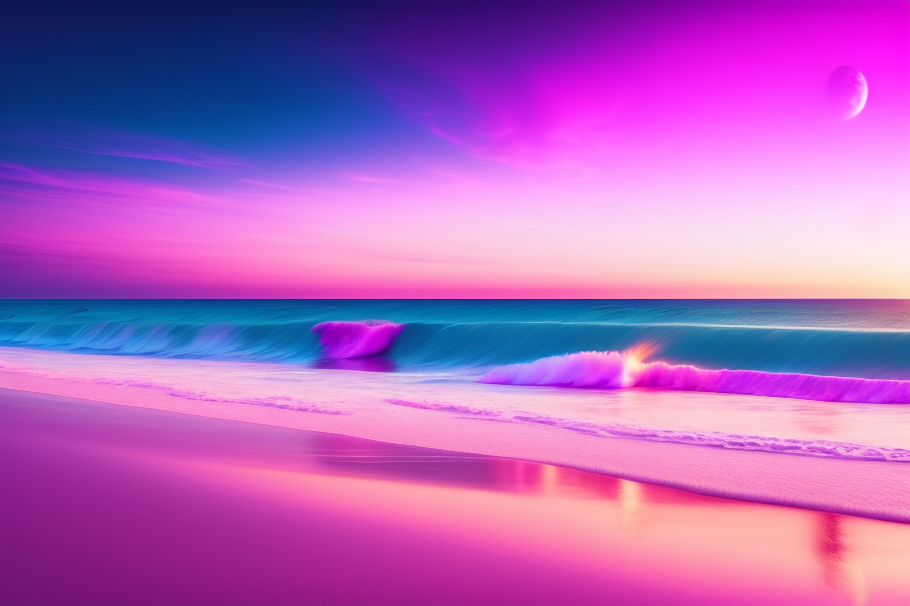 Beautiful beach horizon view of the tropical pink ocean on an alien planet, pink vaporwave ocean, clear sky, planet in space ove