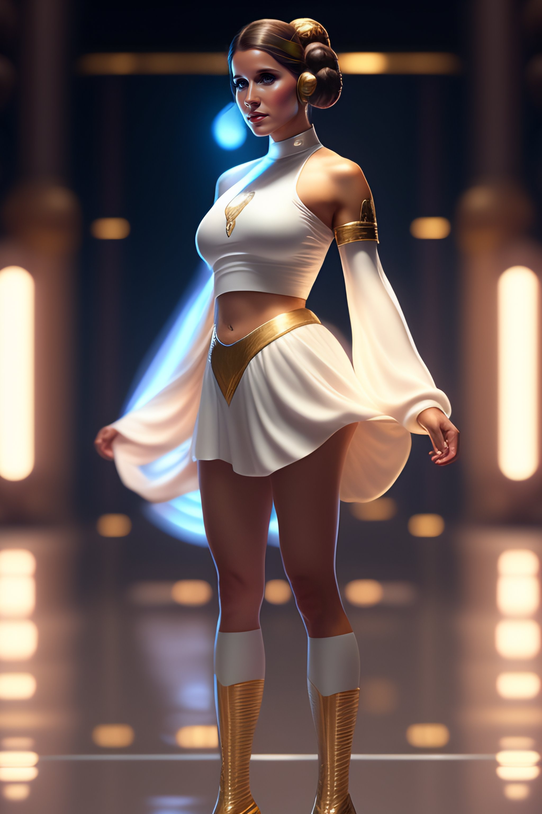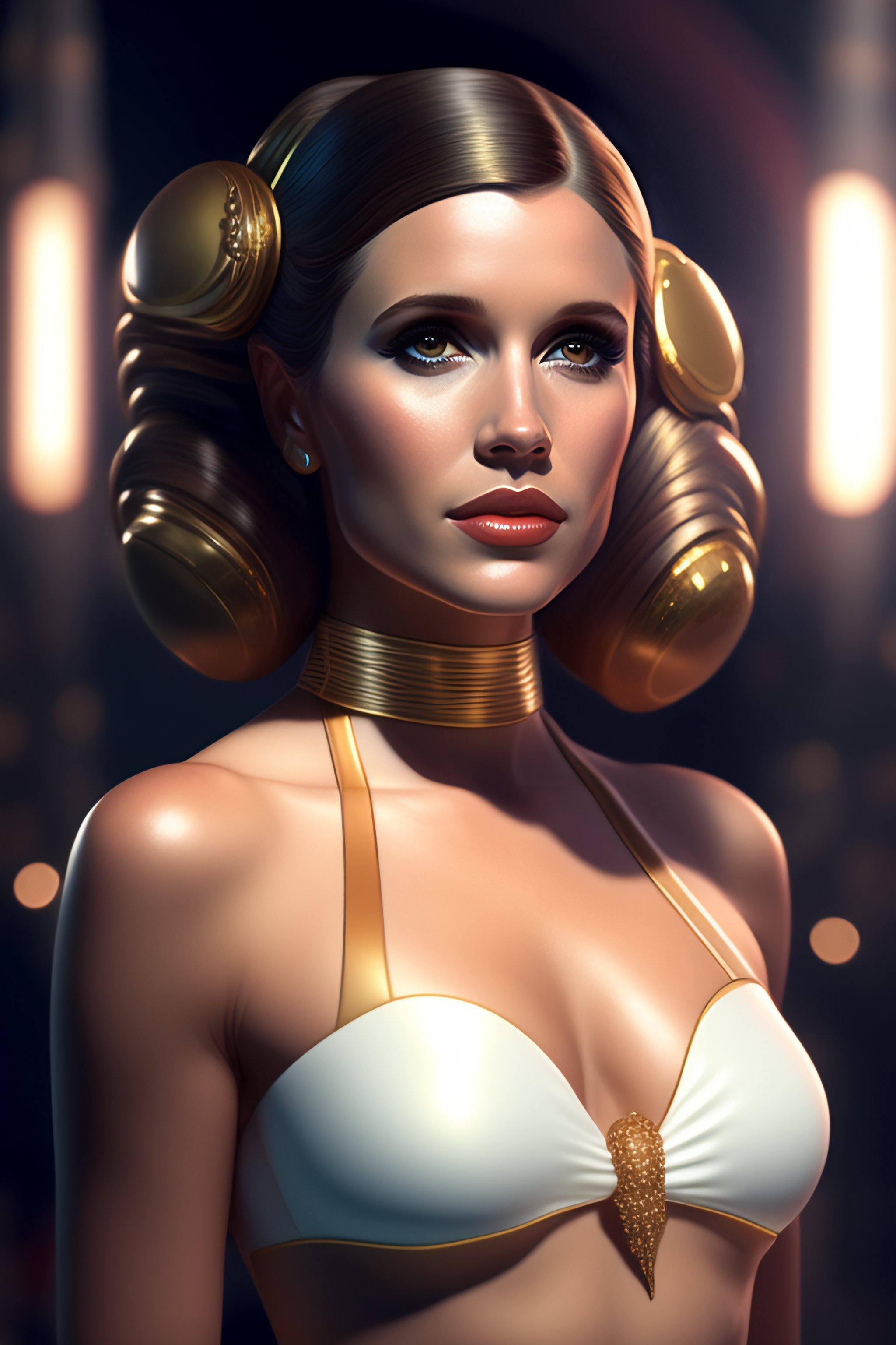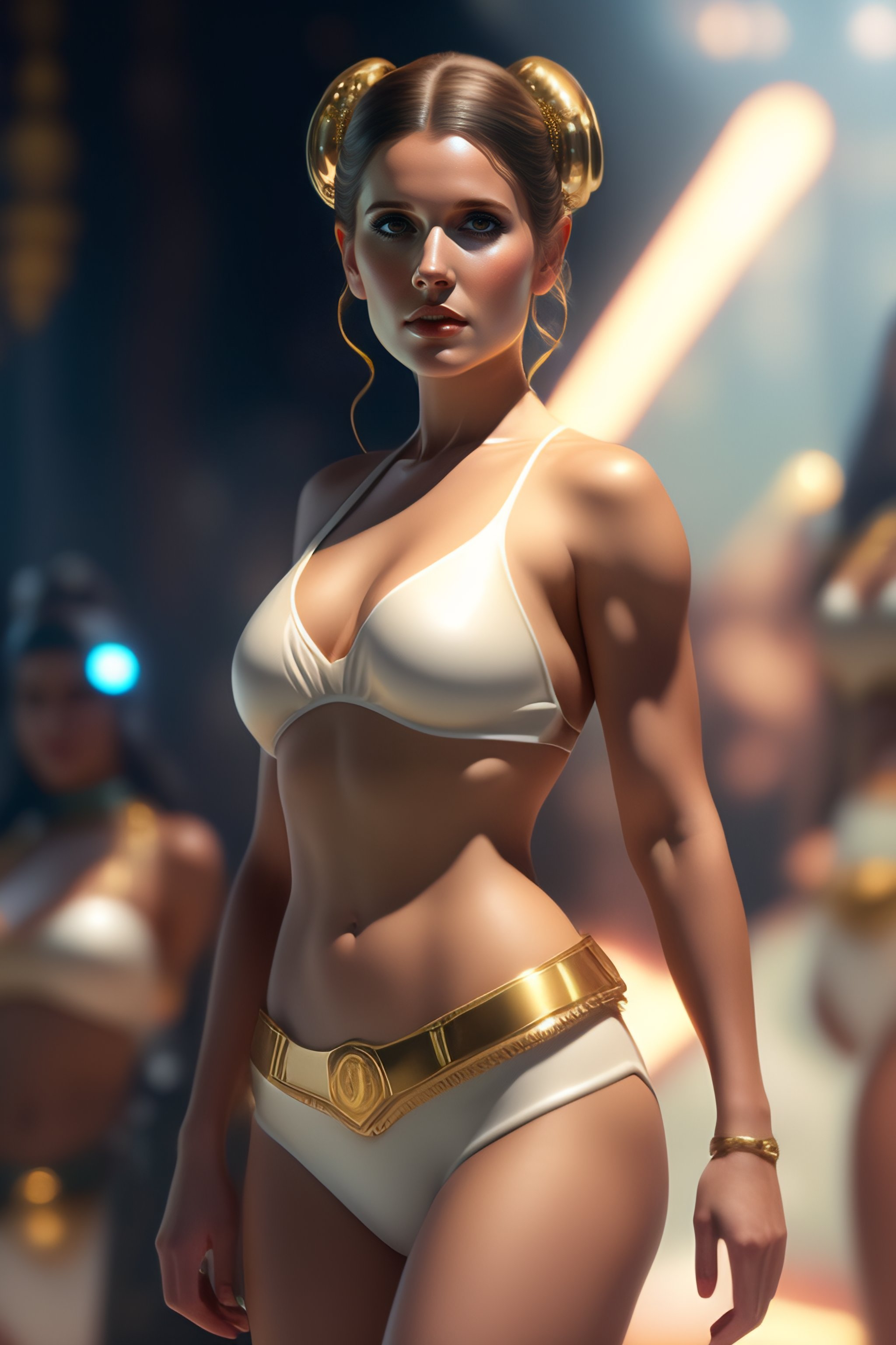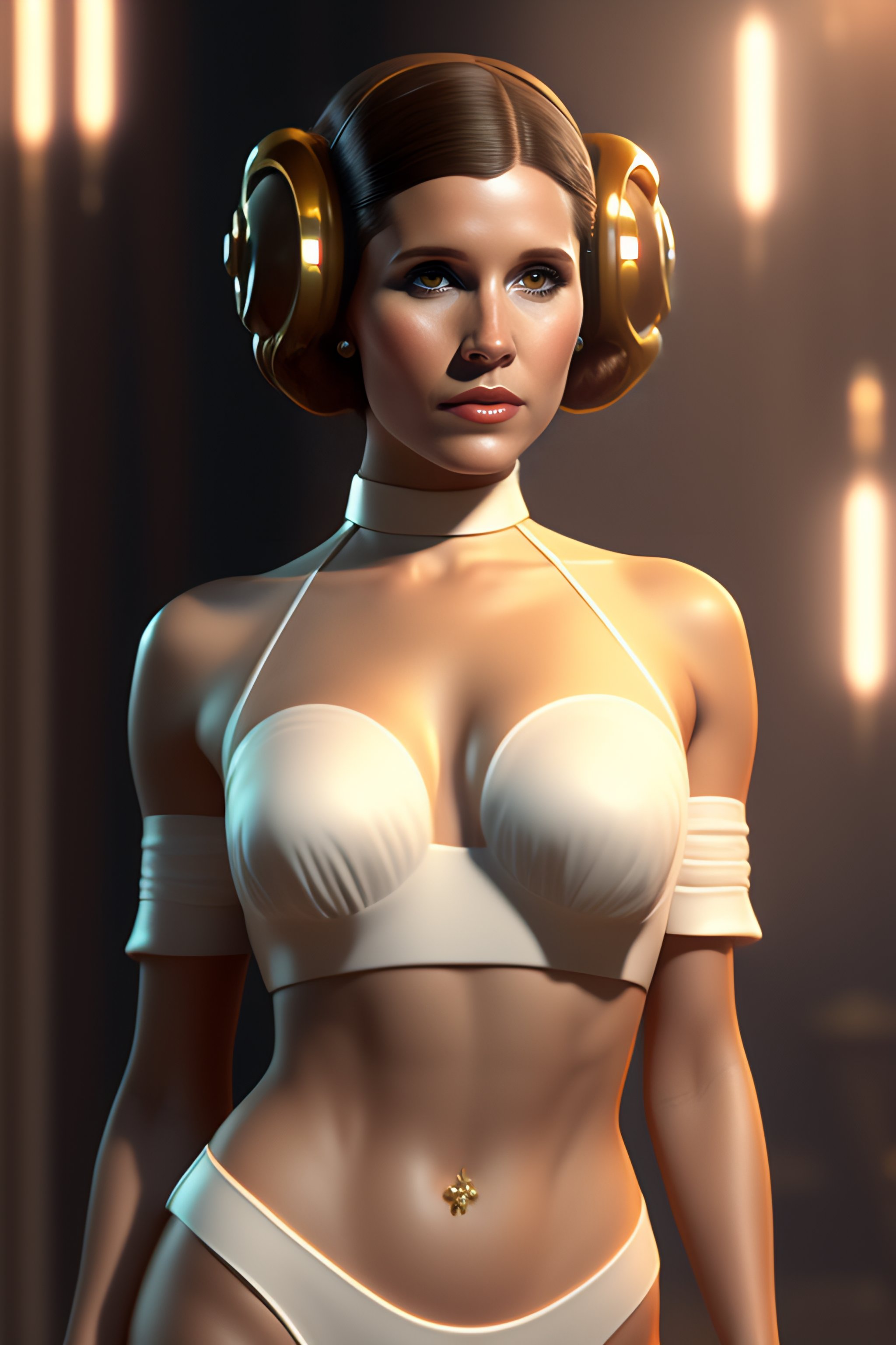 Mini bikini, full length, legs, feet, young carrie fisher as princess leia, anatomy, bathed in light, highly detailed, photorealistic, artstation, smooth, sharp focus, illustration, unreal engine 5, 8 k, art by artgerm and greg rutkowski and edgar maxence