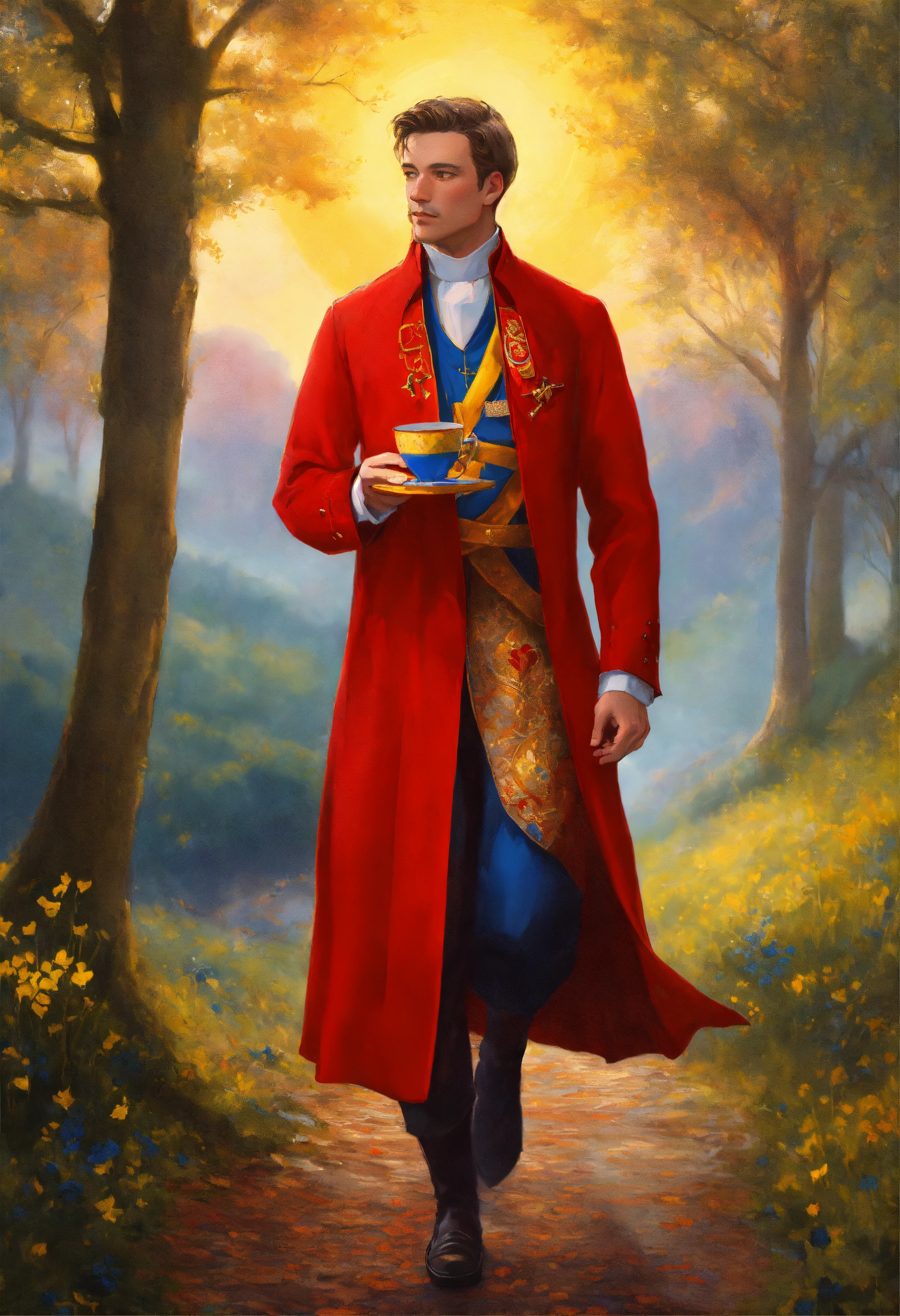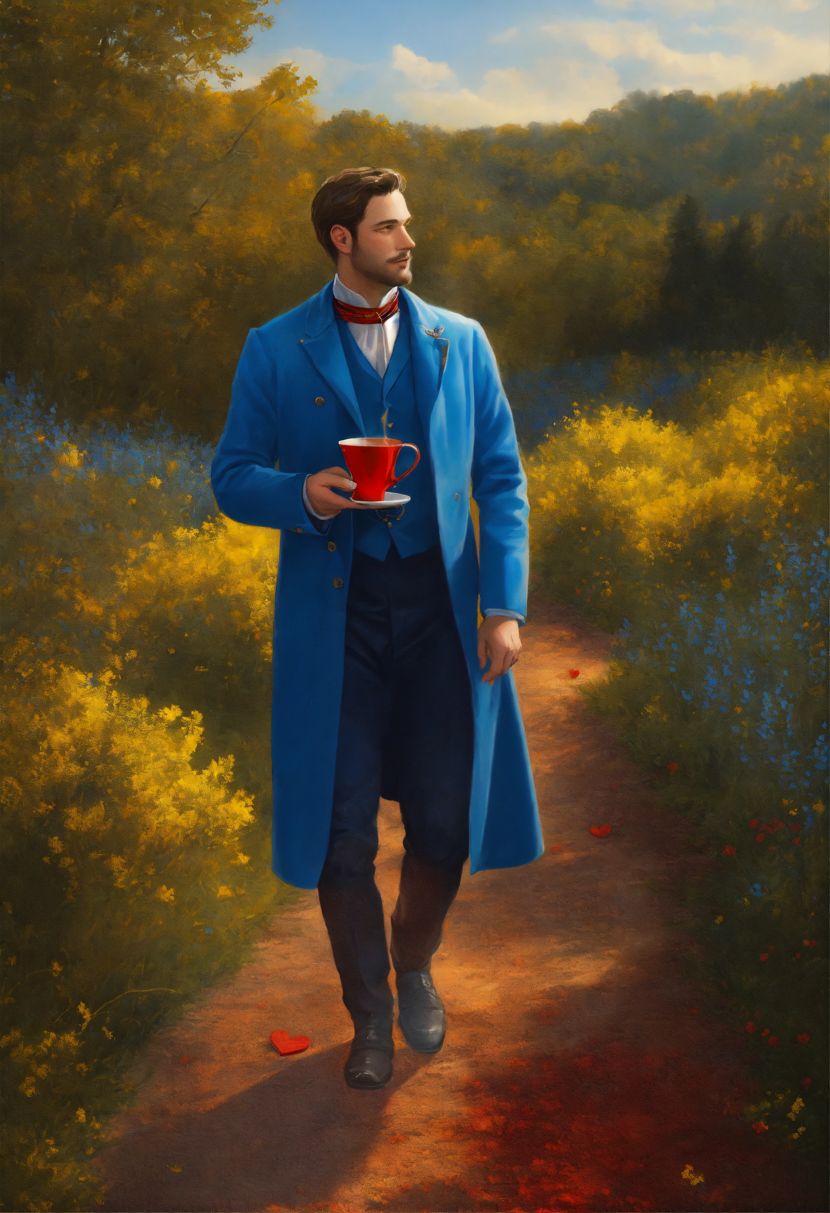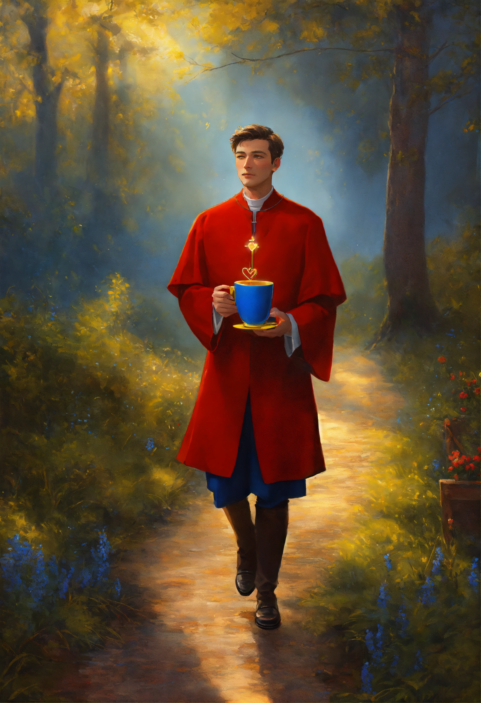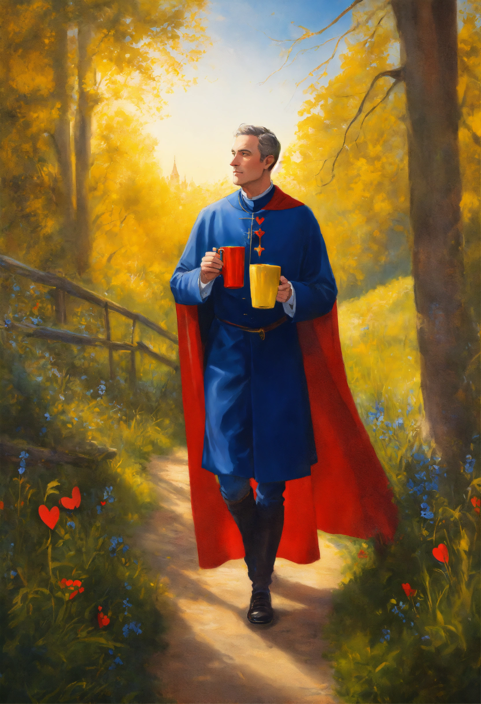 Illustrated, realistic, healing, jack of hearts, clergyman, donned in red and blue, strolls in nature with a yellow cup, radiating warmth