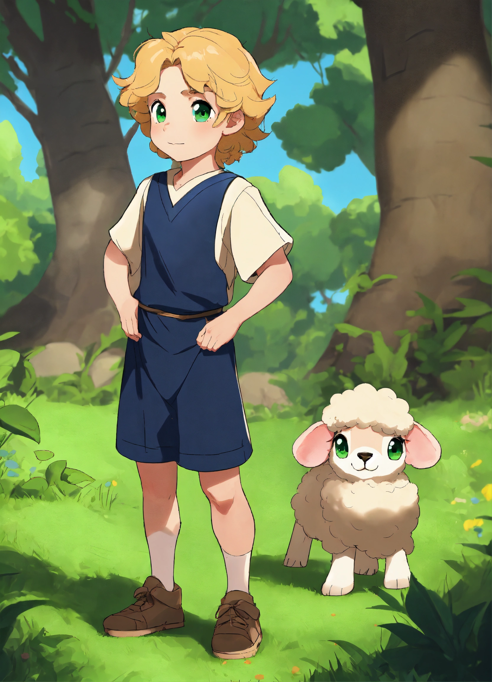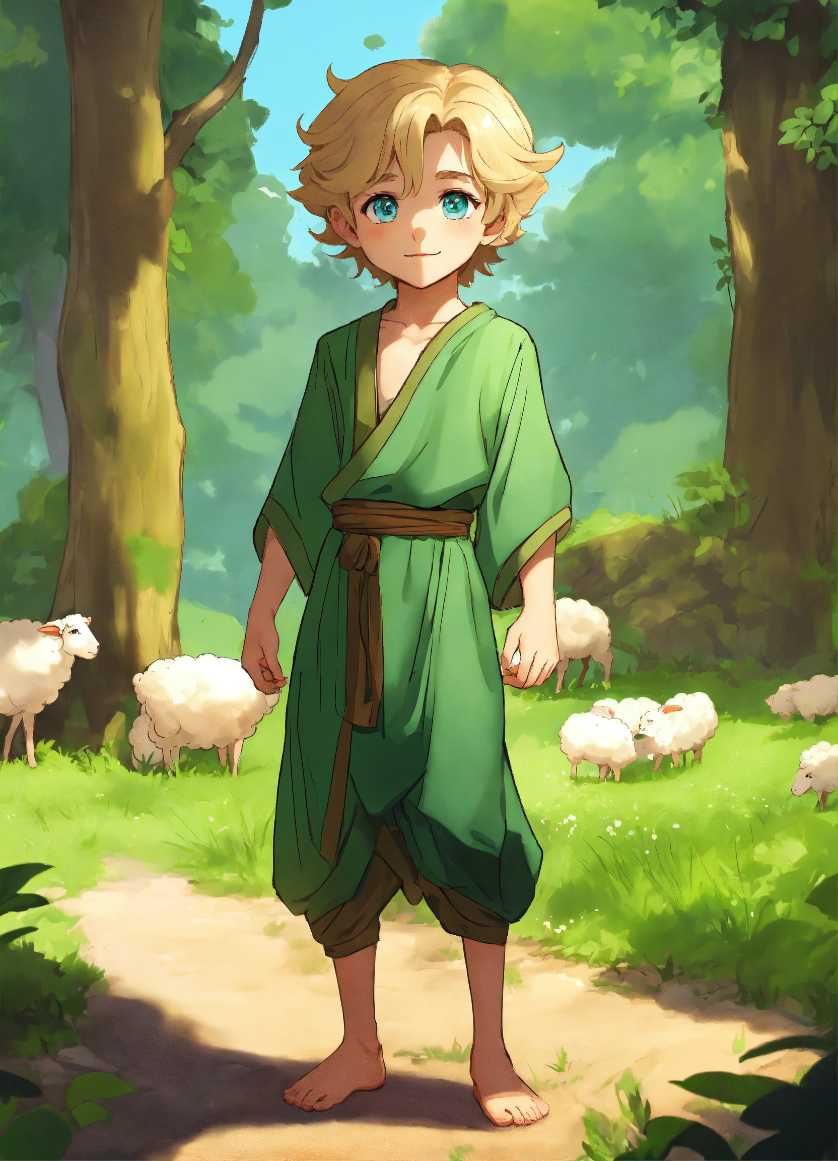 Green sheet, multiple angles cute boy cartoon, green eyes, 15 years old, blue eyes, dark blue dress, cute boy long hair cute and adorable cartoon tom holland baby white skin, full body pose, !!! legs!!! blonde hair, handsome, 500 bc years, green eyes cartoon, old israeli dress sheep group, forest