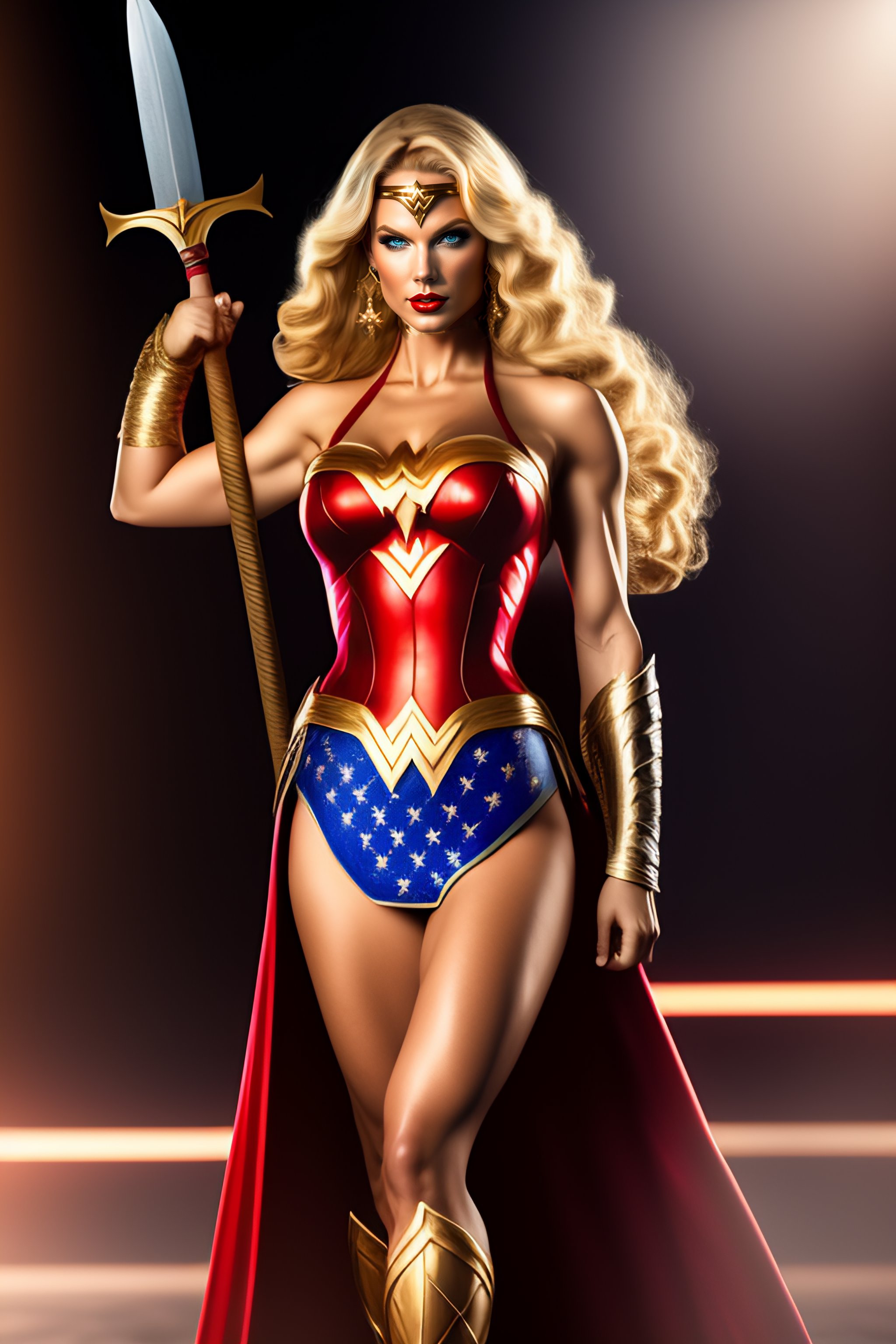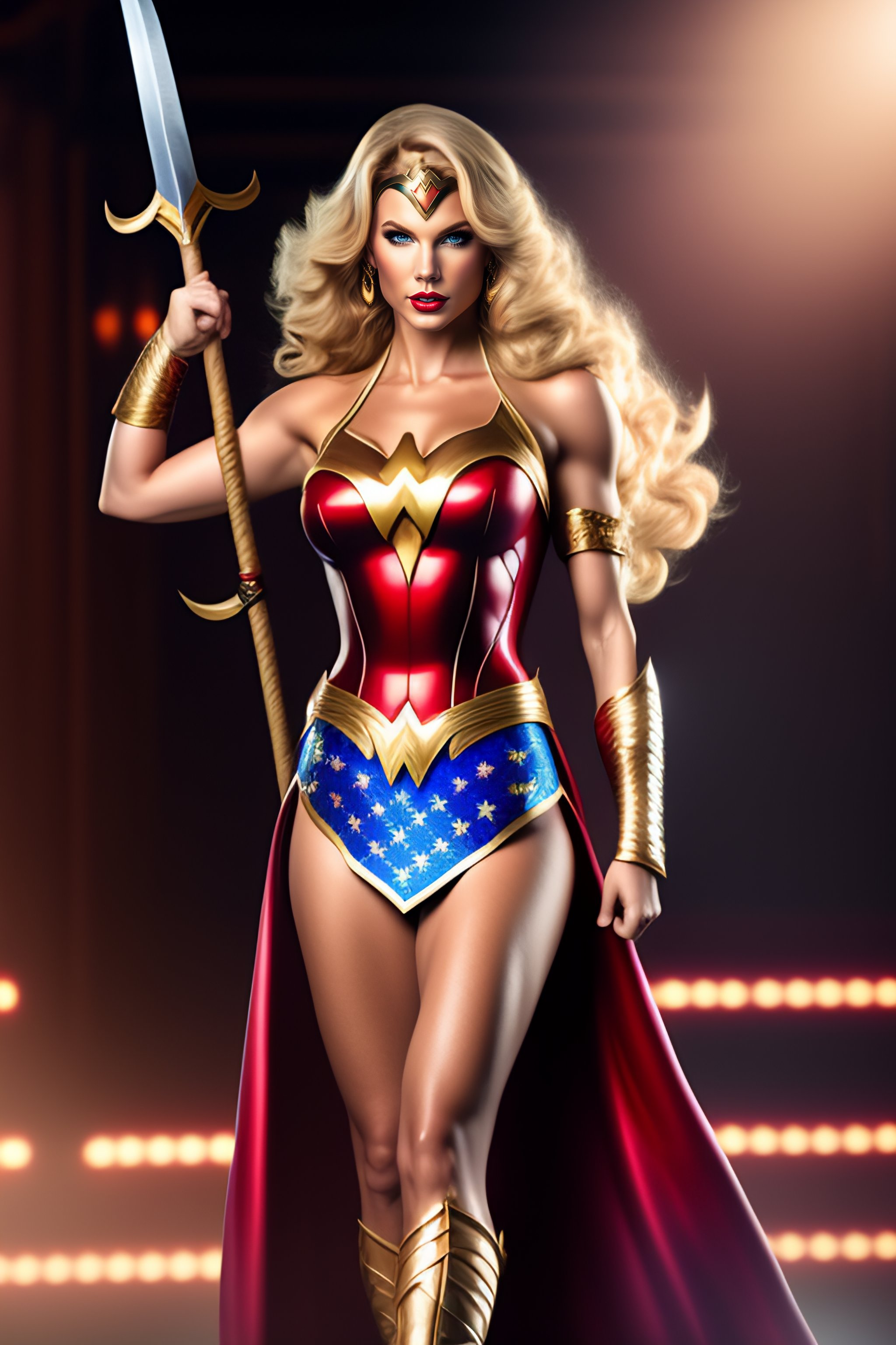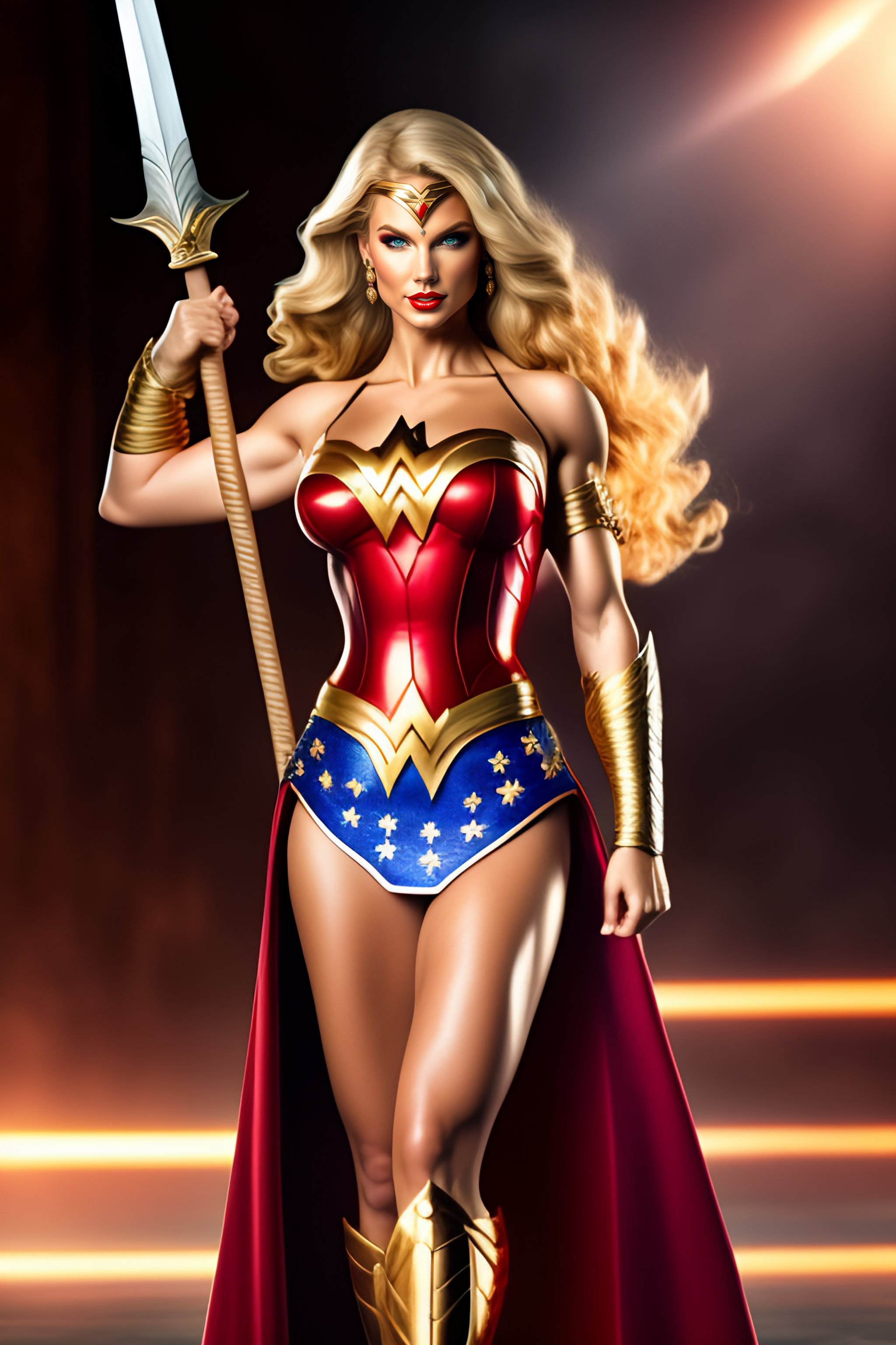 Highly detailed full body of taylor swift)), blonde hair, wonder woman costume, more muscles, fighting pose, holding long sword, global illumination, radiant light, none environment