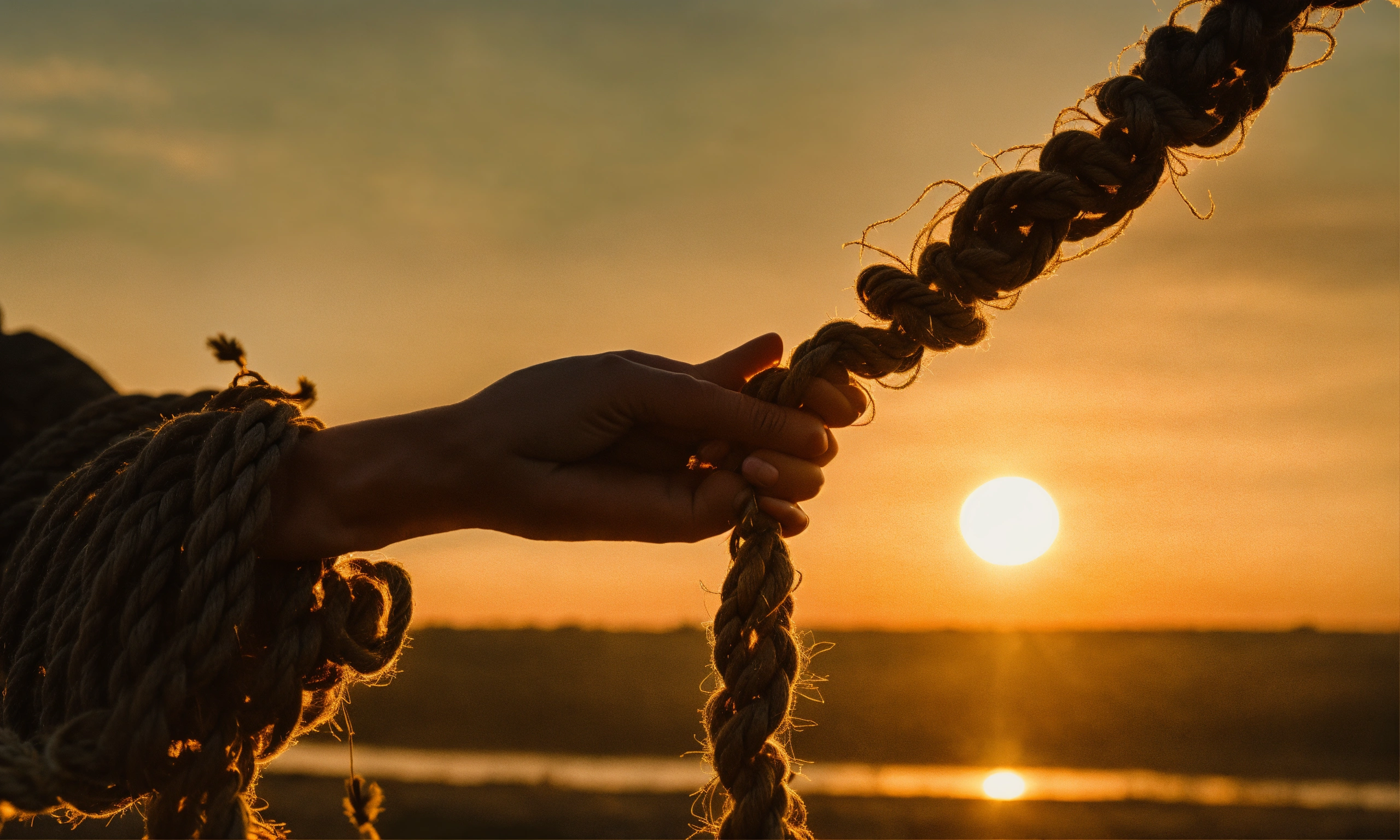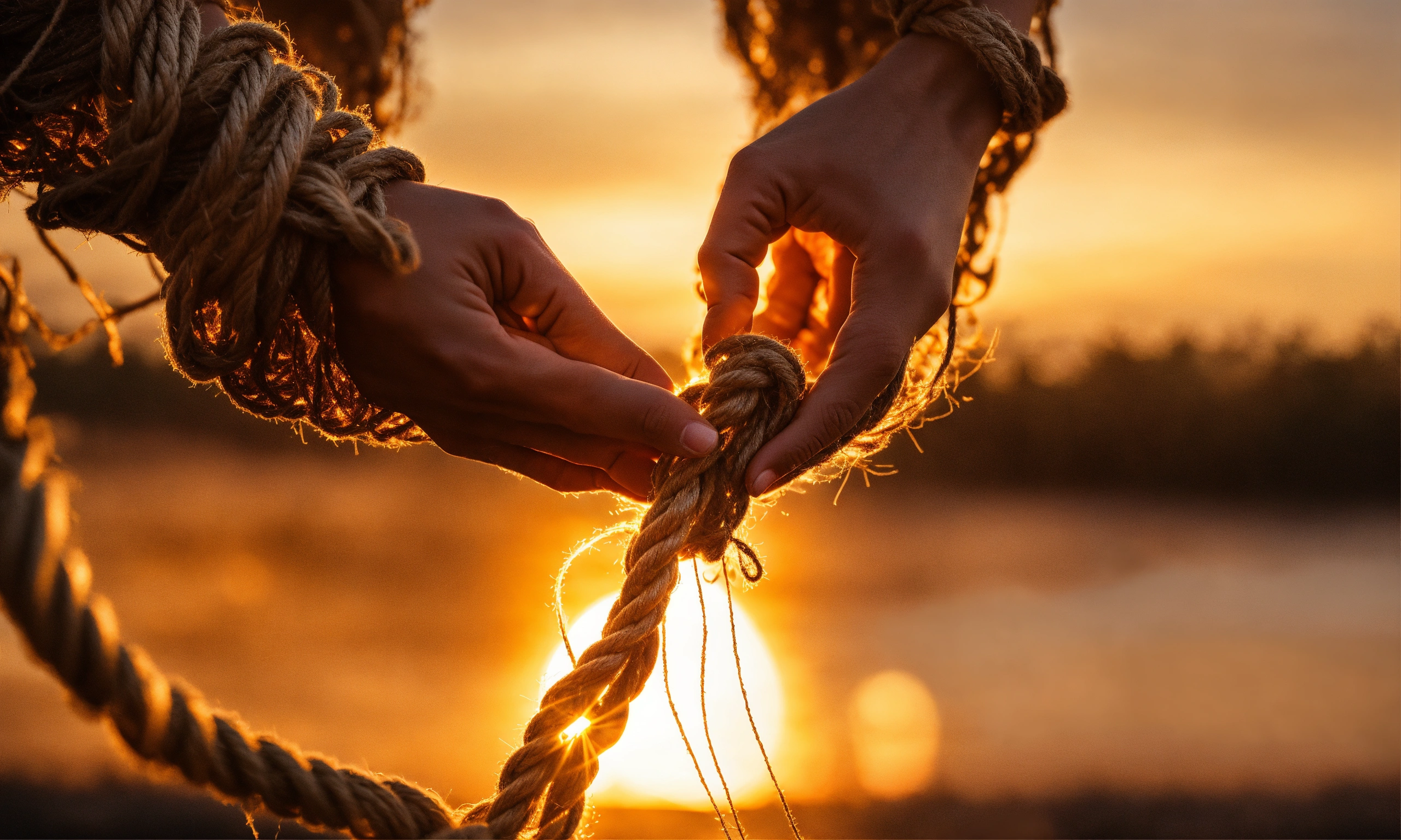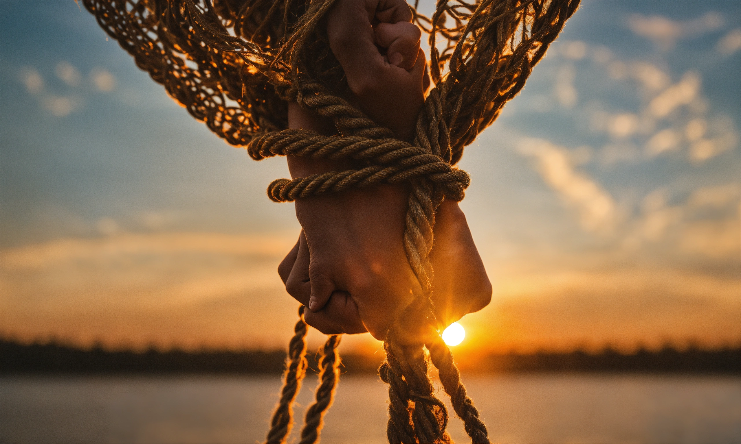 A tight grip on a fraying rope, slowly releasing into open hands. as the hands let go, a sunrise begins to emerge in the background. the words 'let go, everything will be fine' shimmer in golden light across the scene.