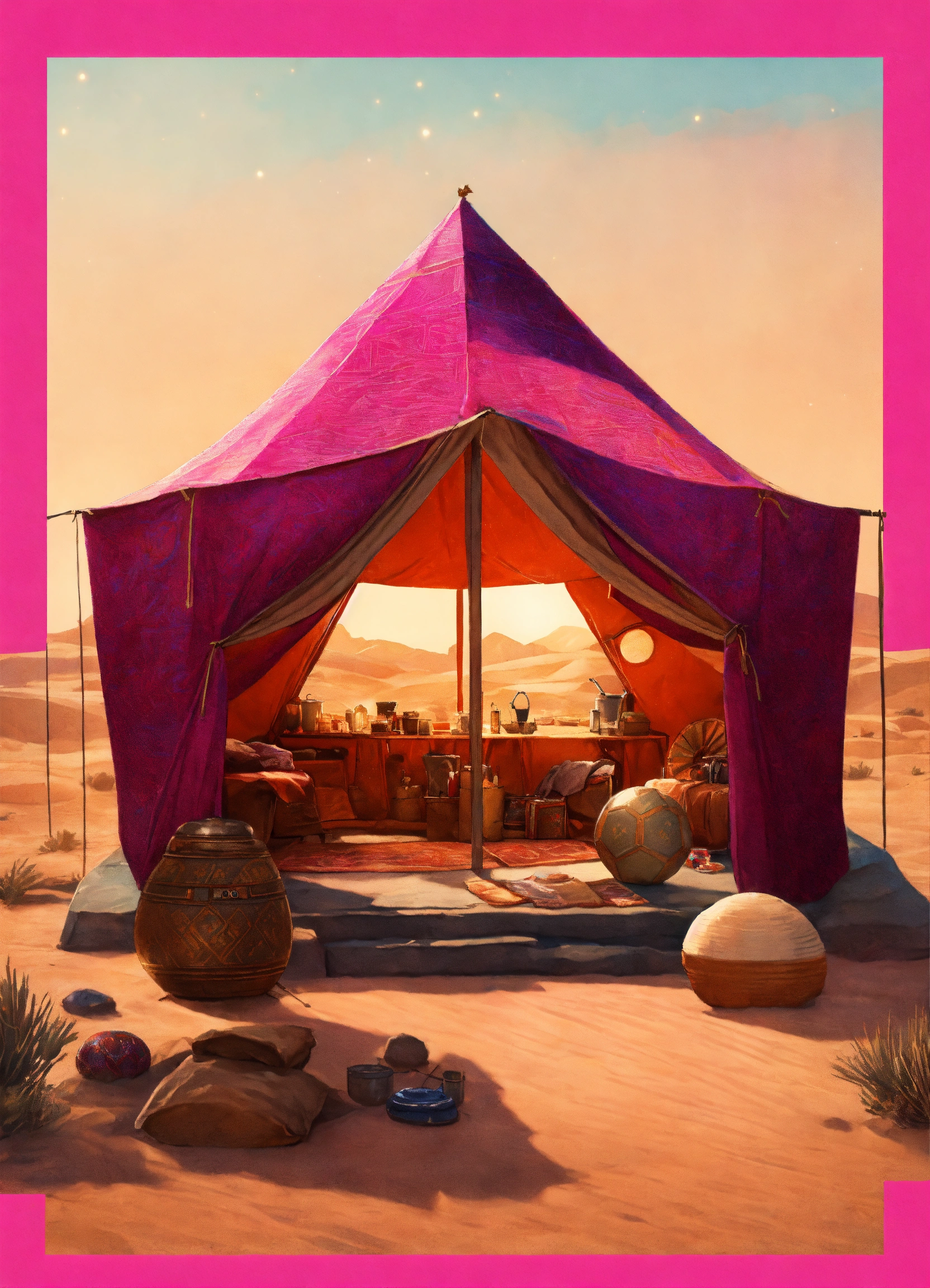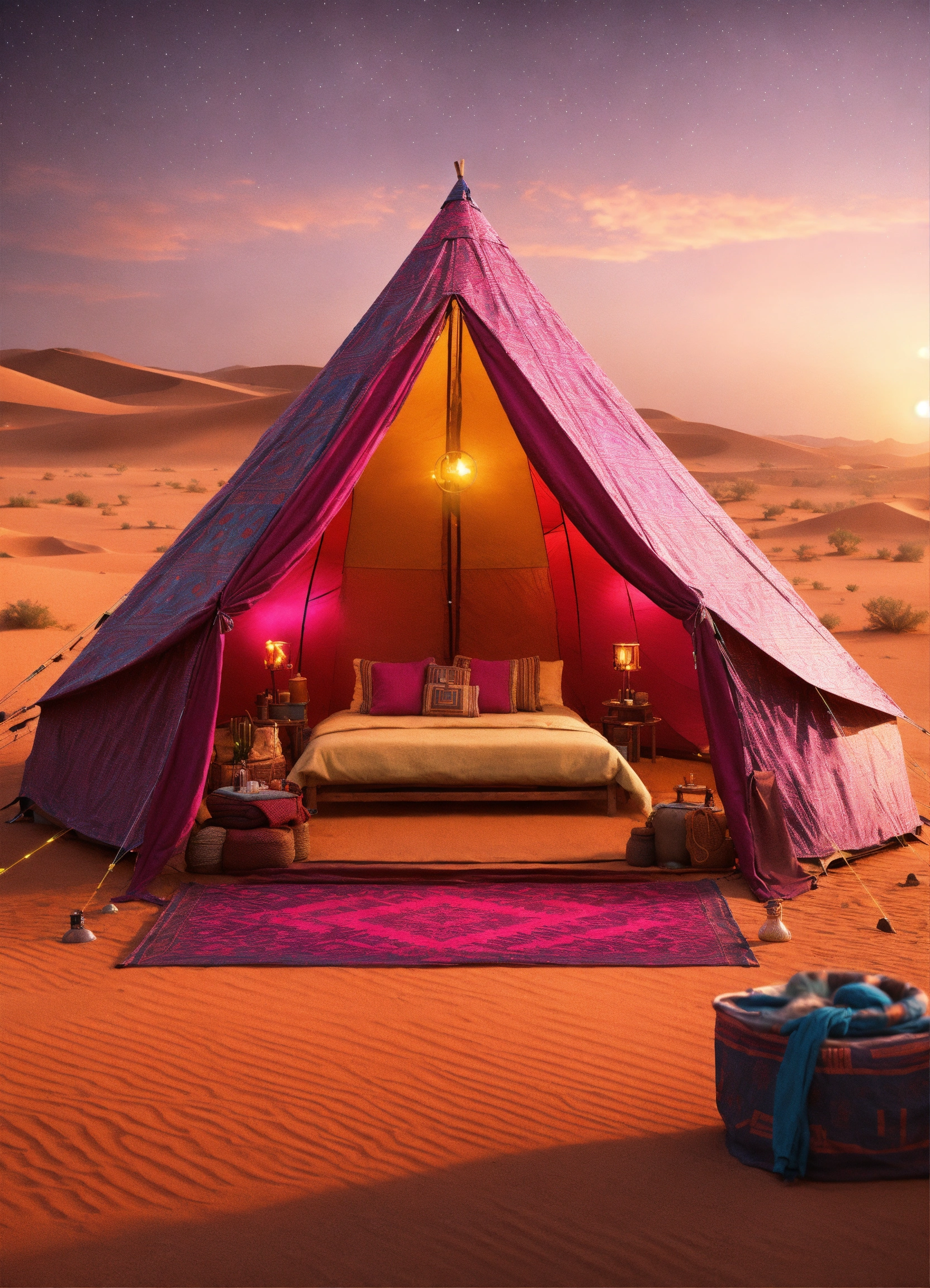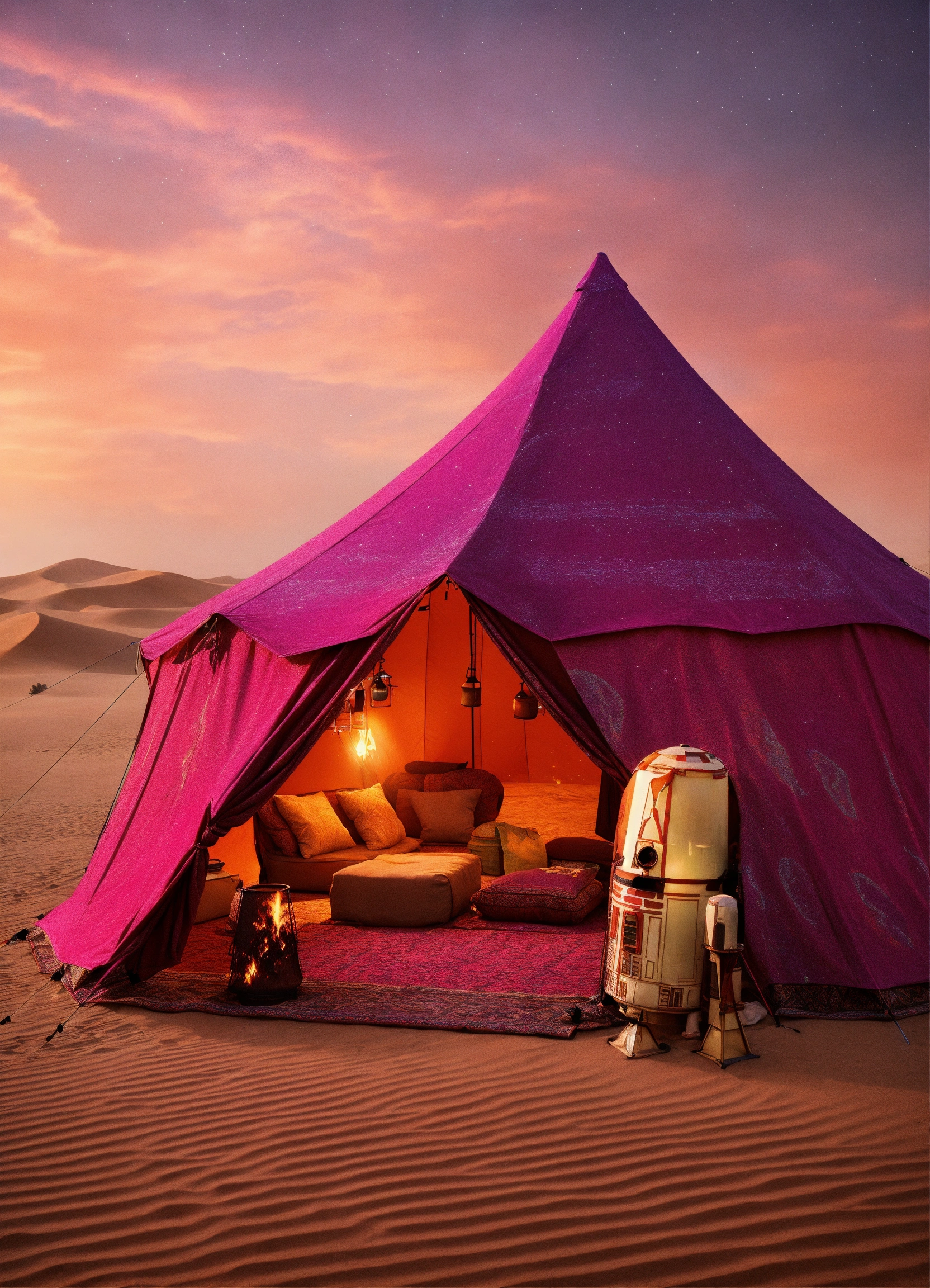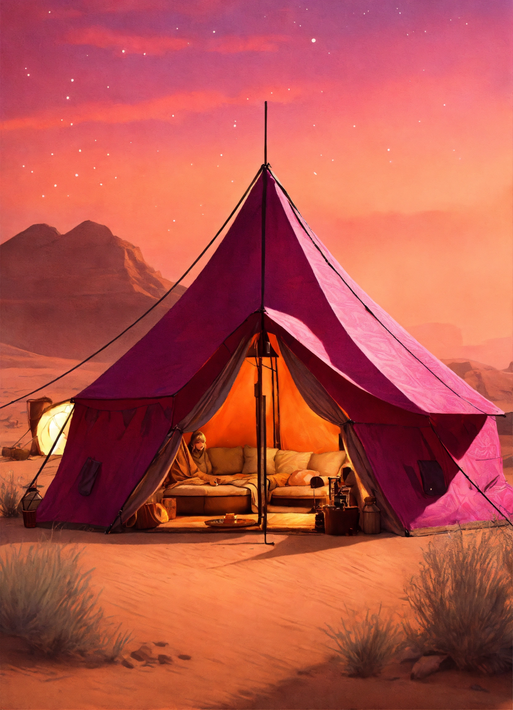 Concept art of a desert campsite tent home, star wars, jakku, desert, multicolored patterned textured shimmer magenta moroccan fabric large tent home, several rooms, hut, peasant, fire and chairs outside, survivor, charming