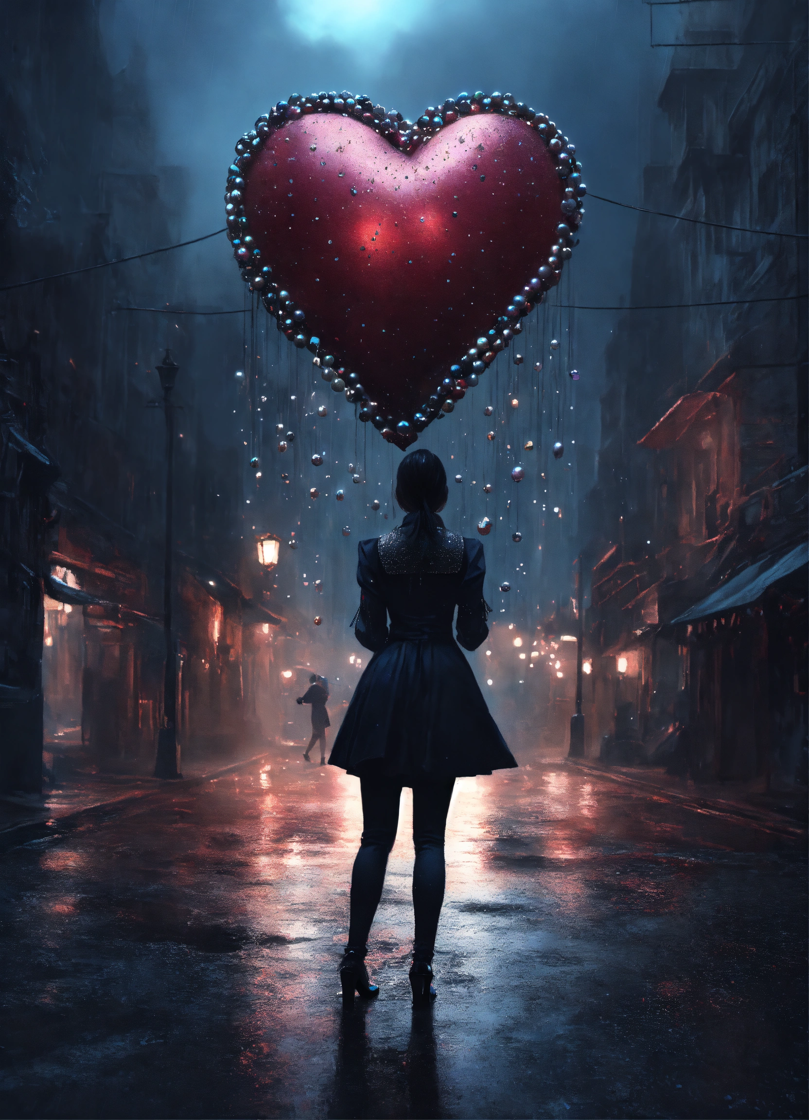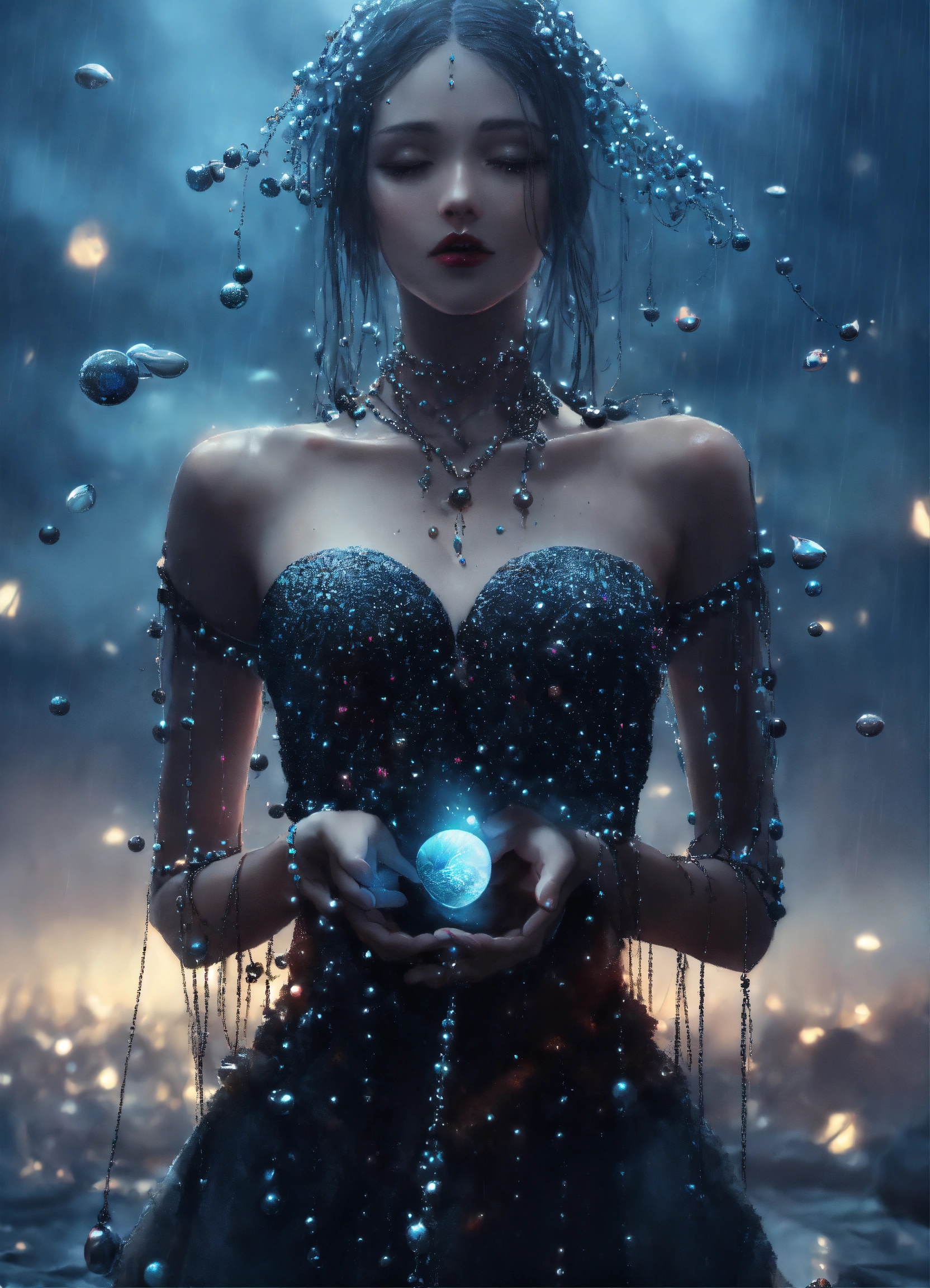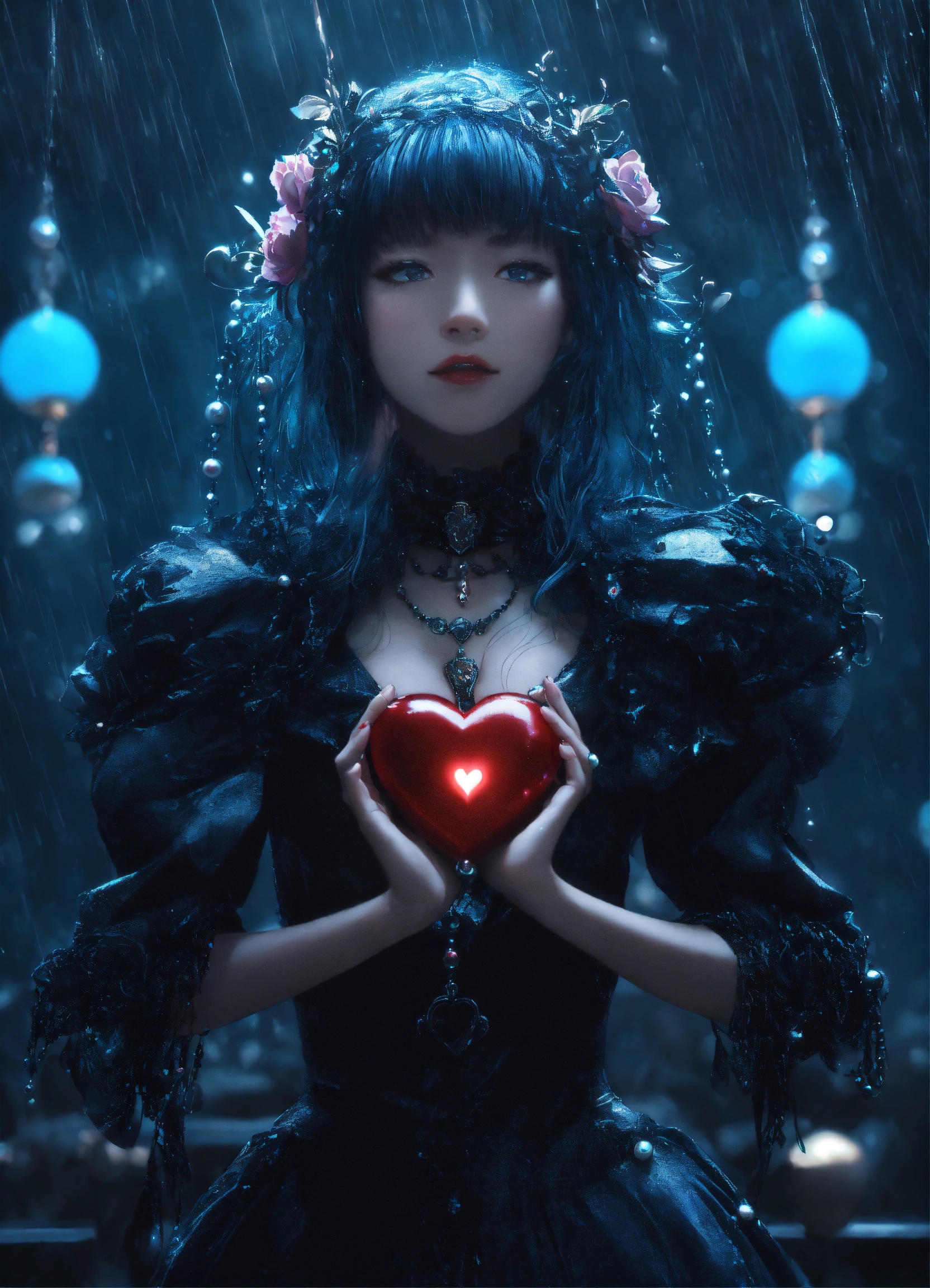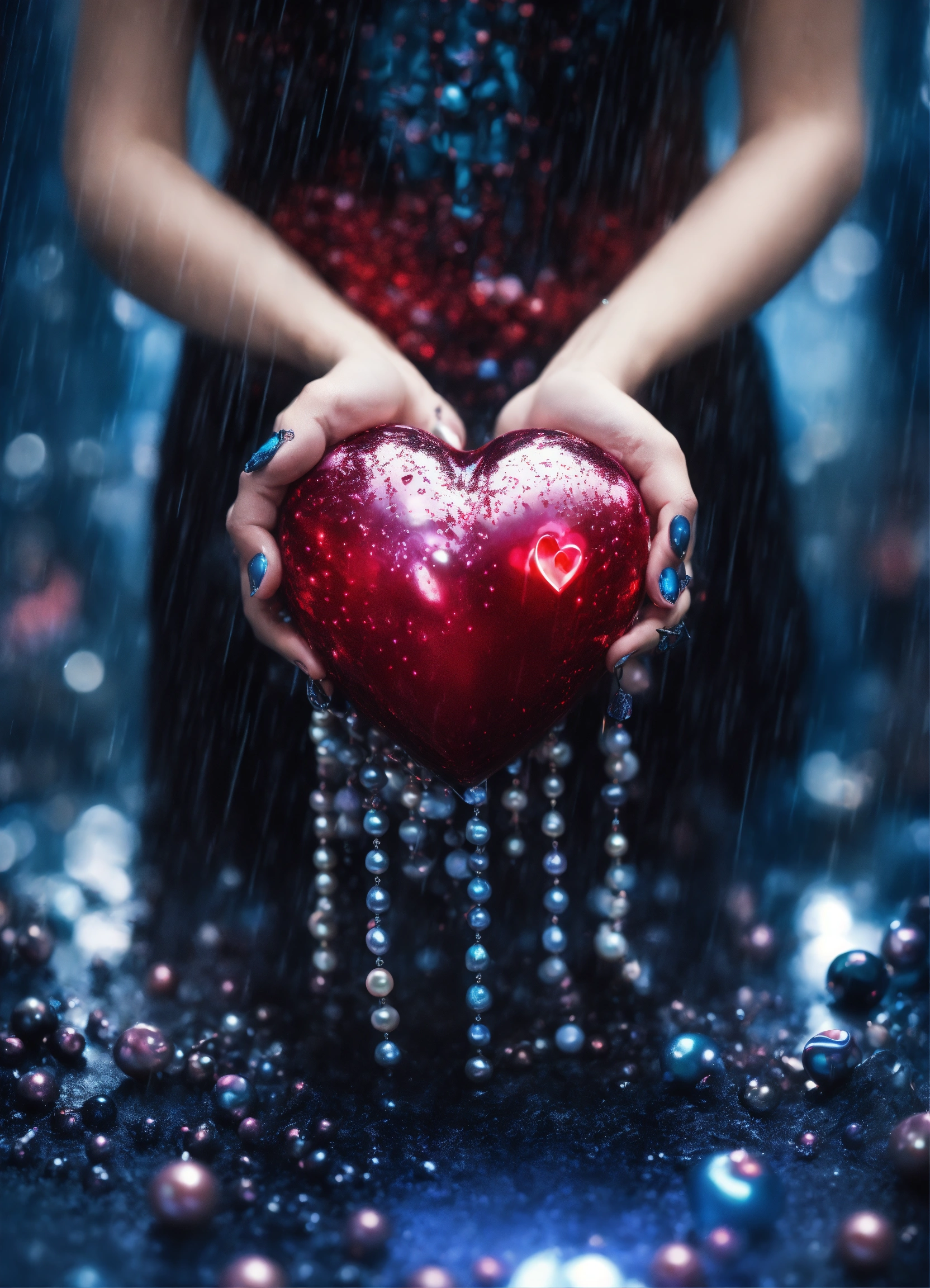 Genre dark fantasy. cg image quality. the genre of art is surrealism. in the foreground is a beating heart, pearl color, black rain. background pale hands, studded with blue pearls, reach for the heart.