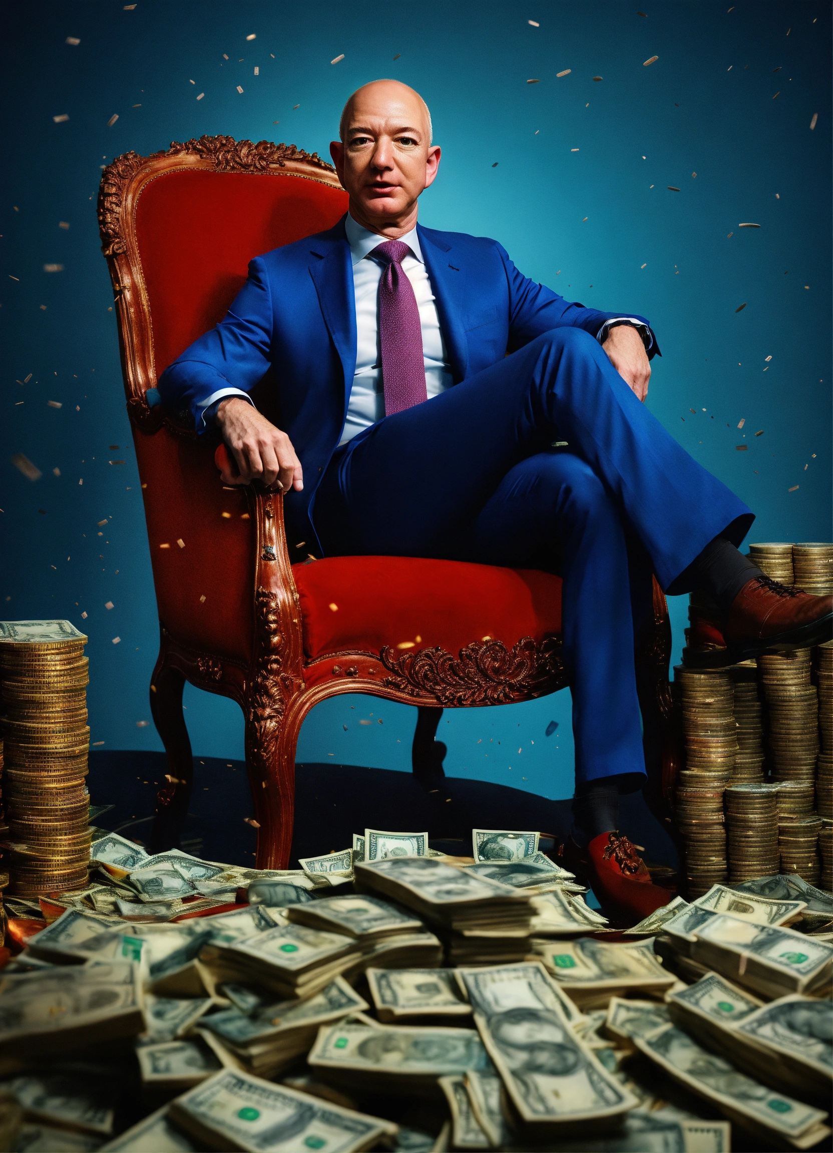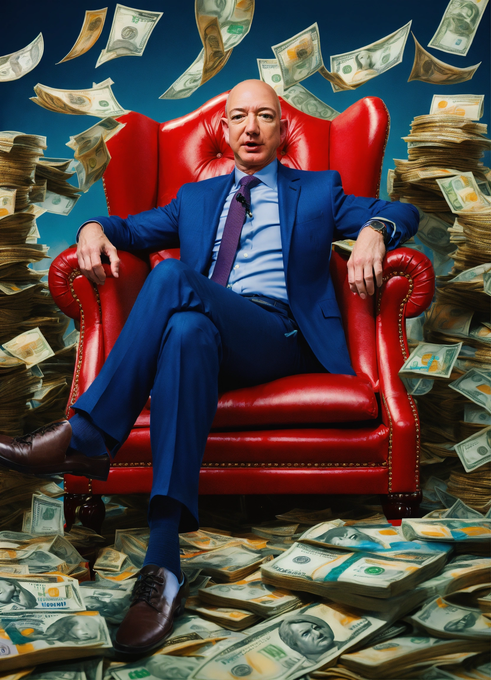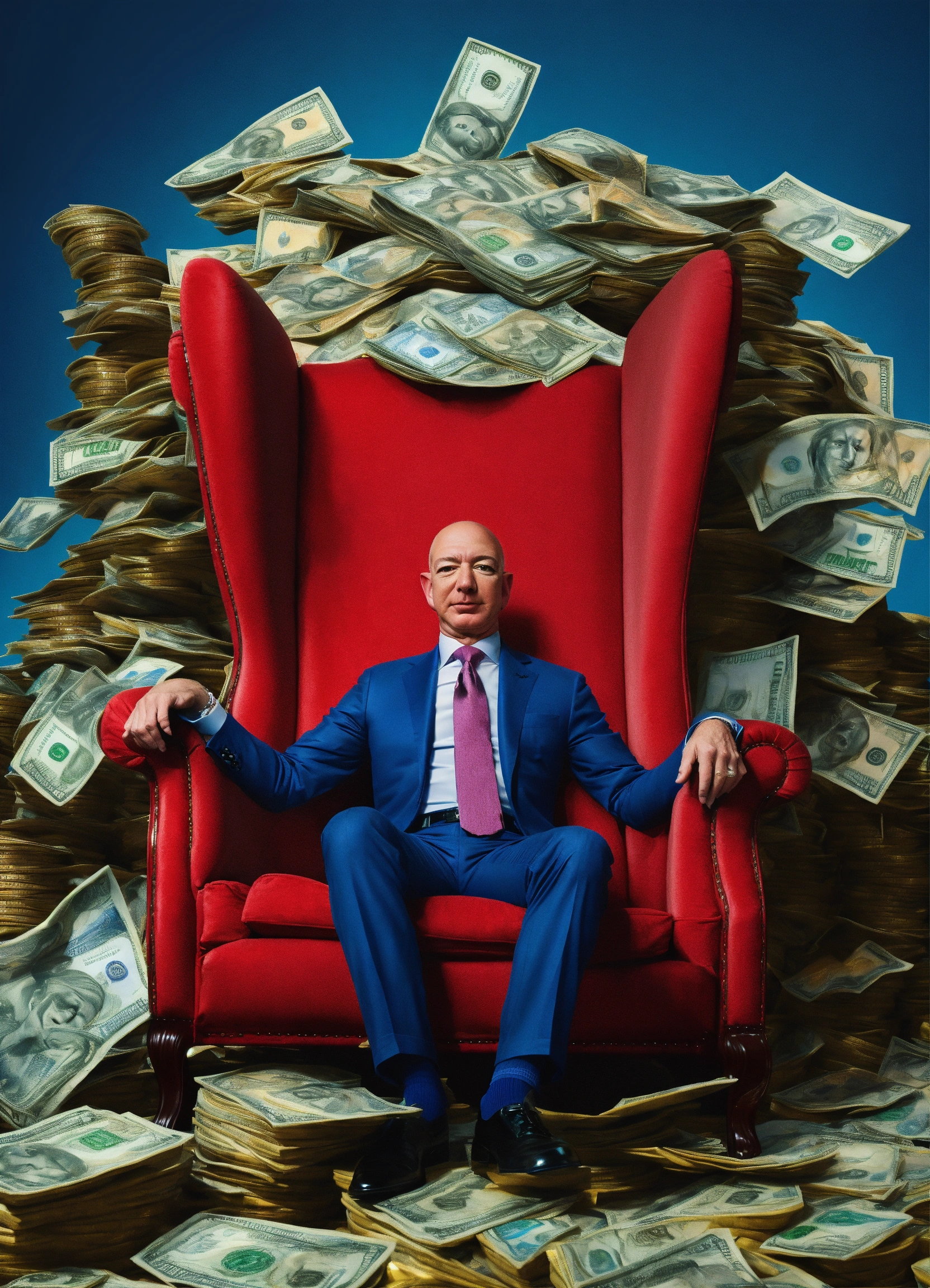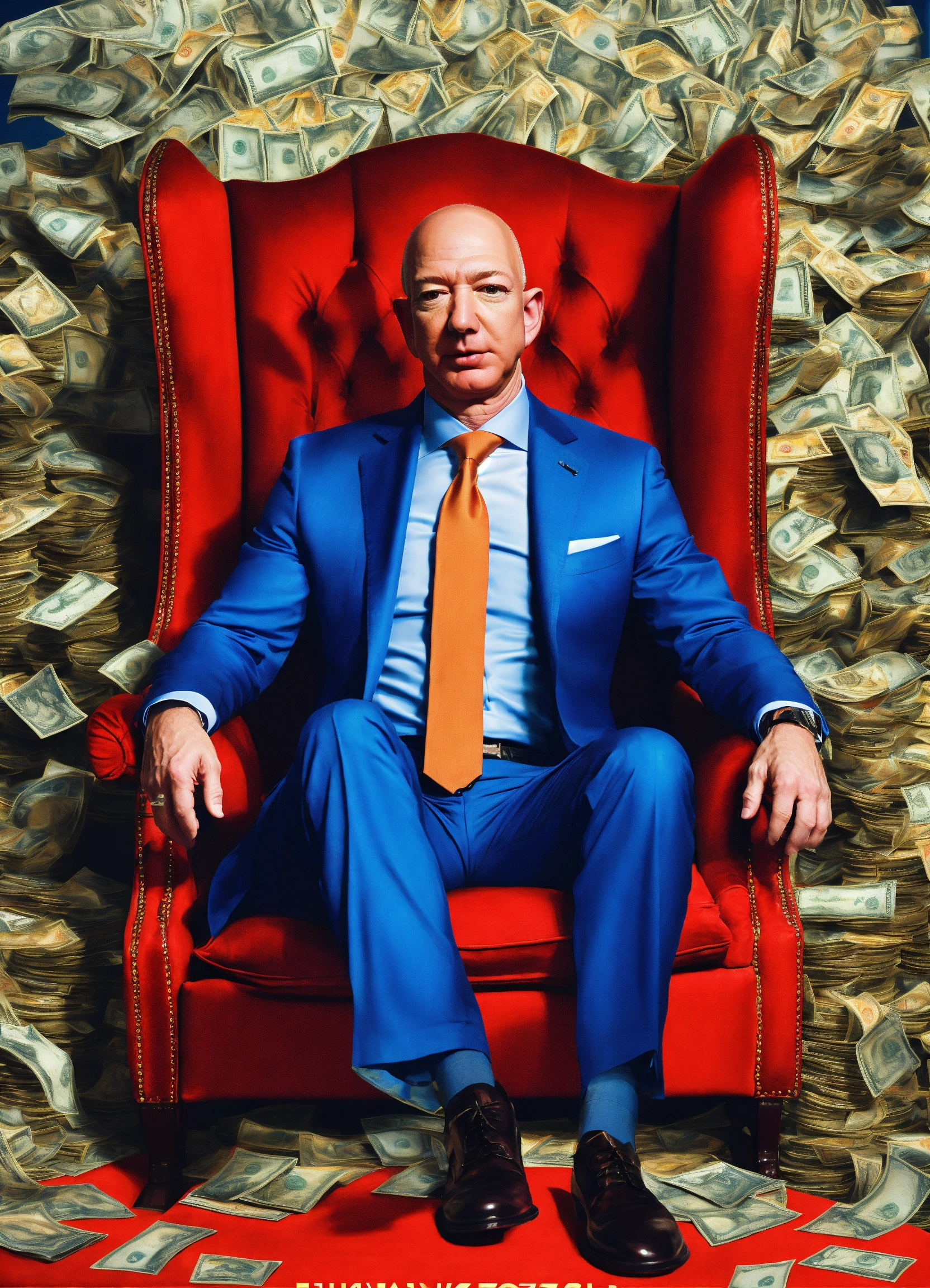 Jeff bezos very angry and looking crazy sits in a red highback chair in a blue suit standing in front of piles of money hyper realistic, vivid colors