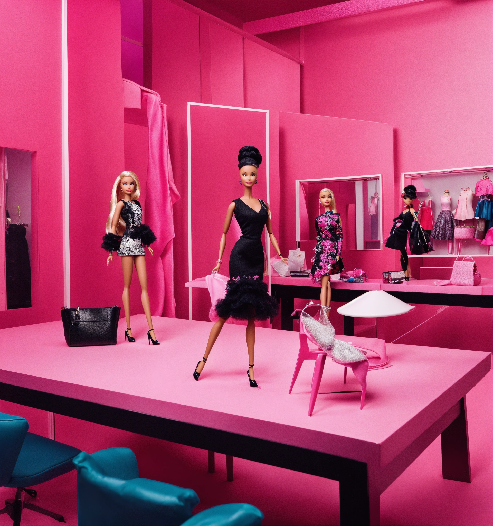 Barbie dolls, career as a fashion designer, pink, and black fashionable, gorgeous, working in a fashion studio