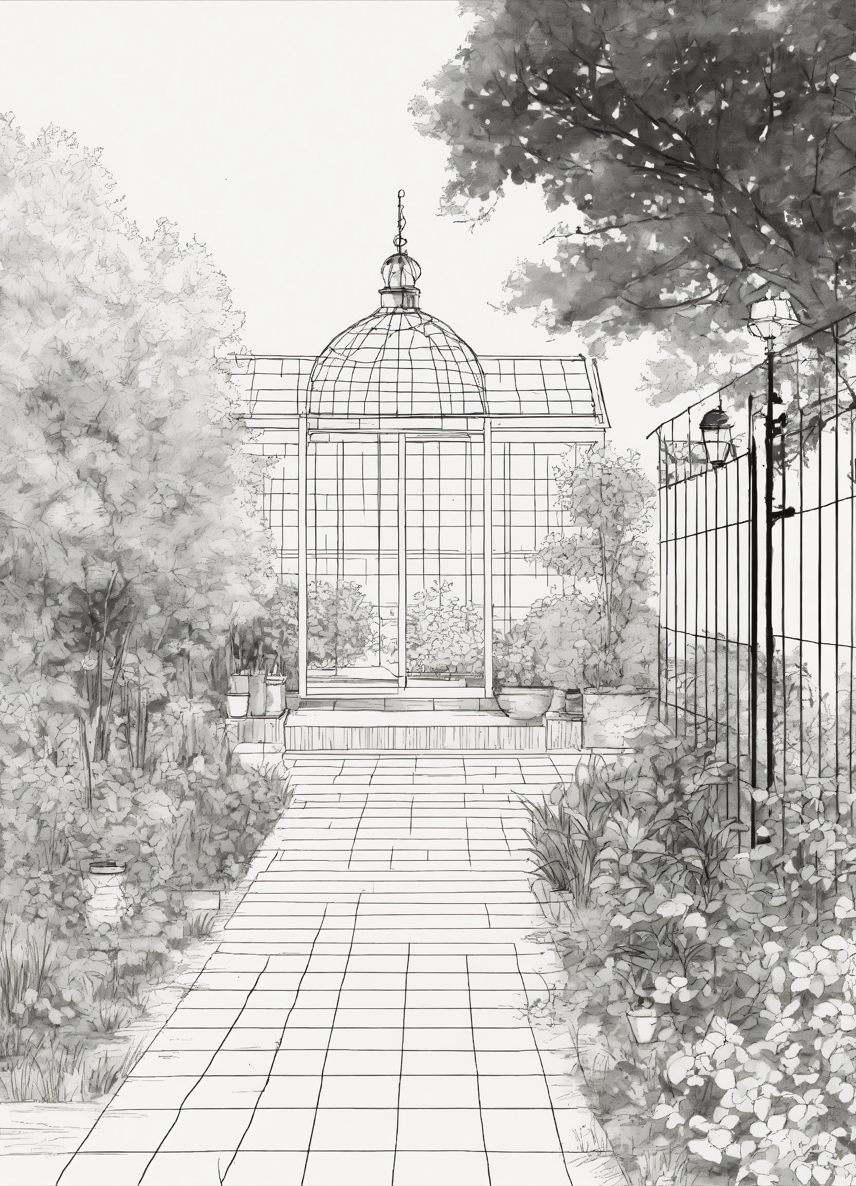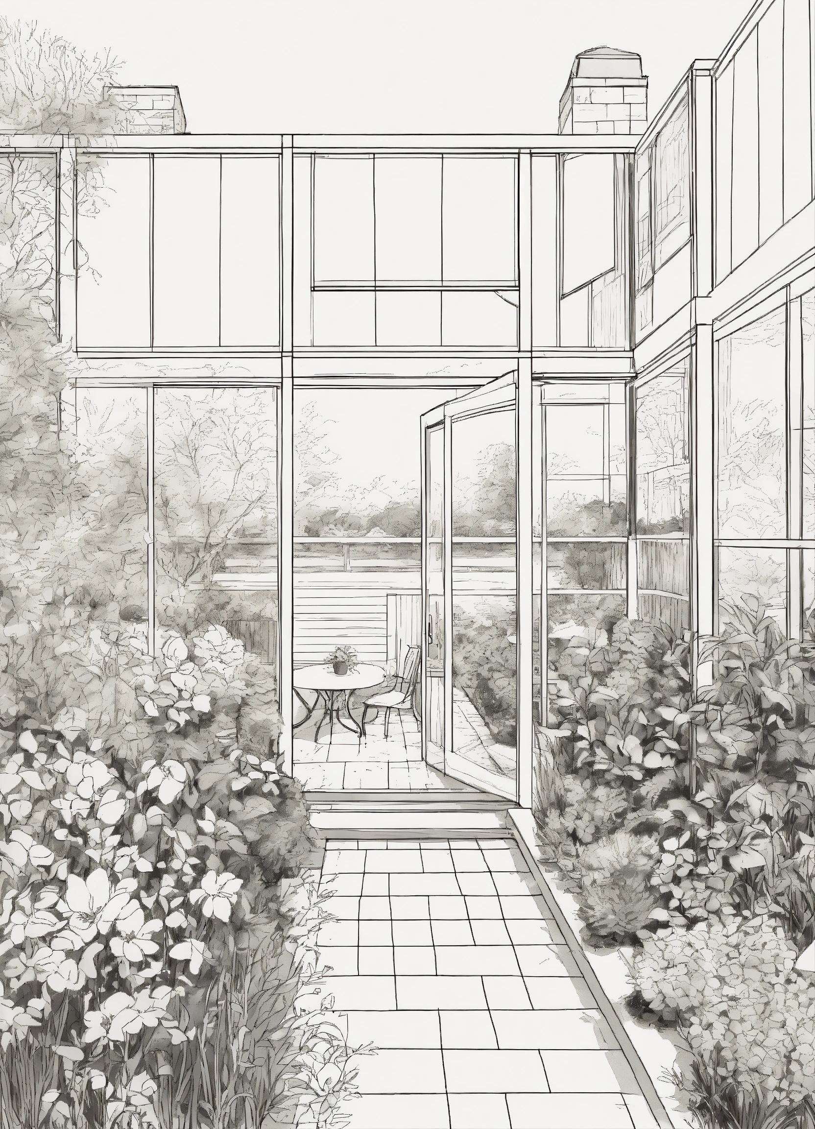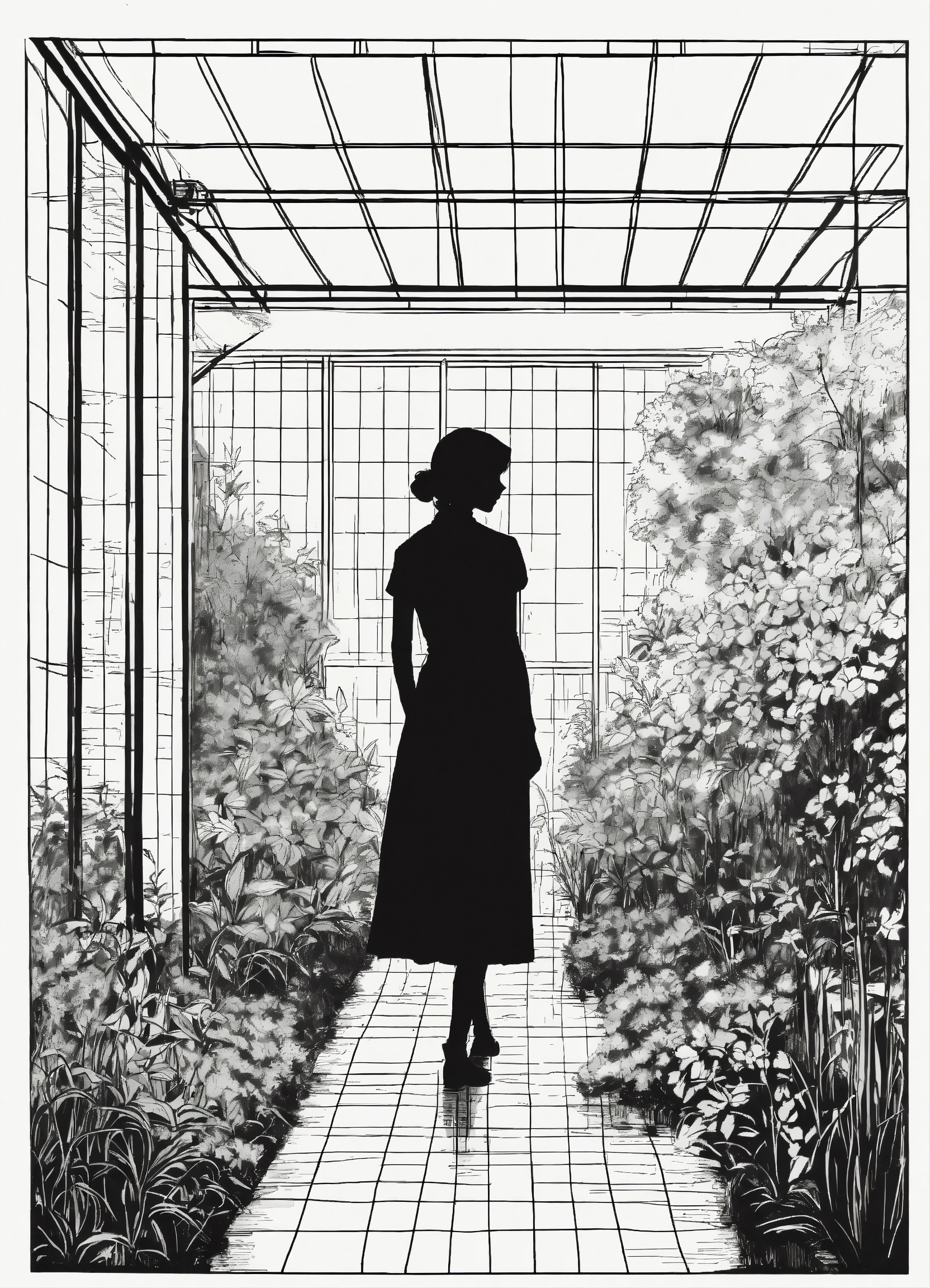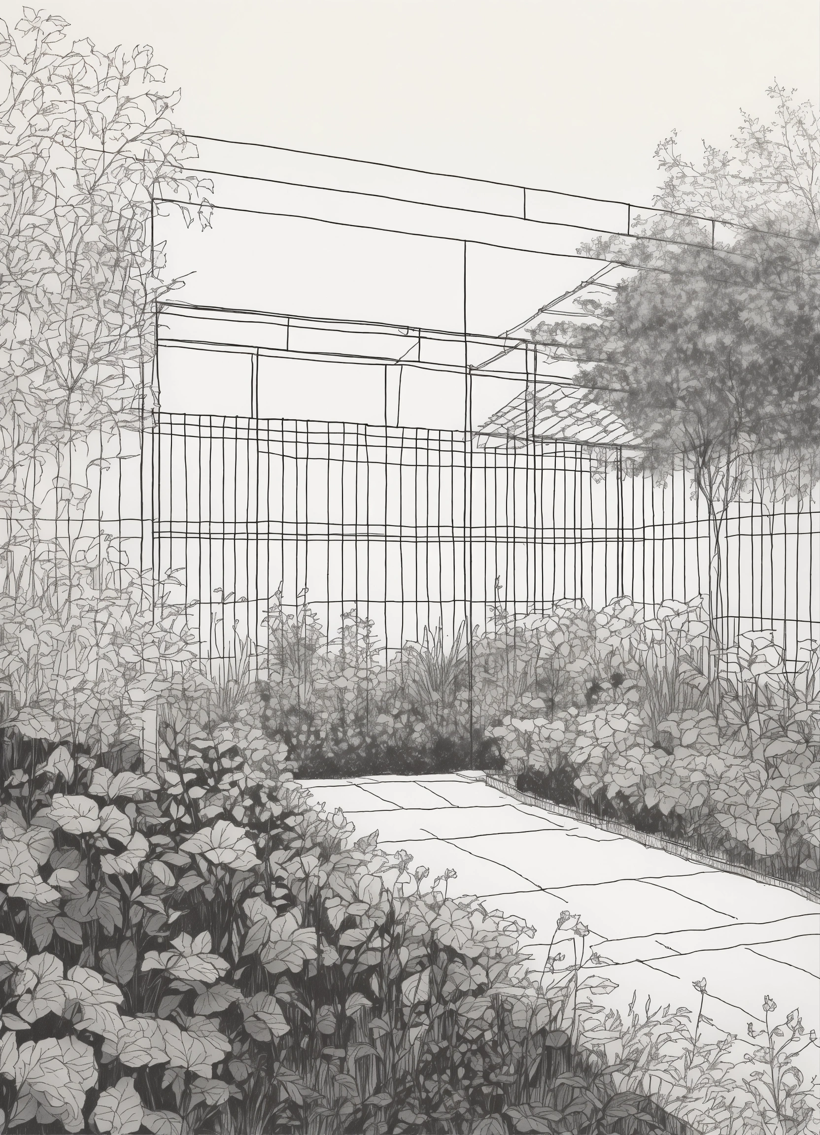 Create a sketch of the garden silhouette, black, single lines as a grid on a white background, filling the entire silhouette