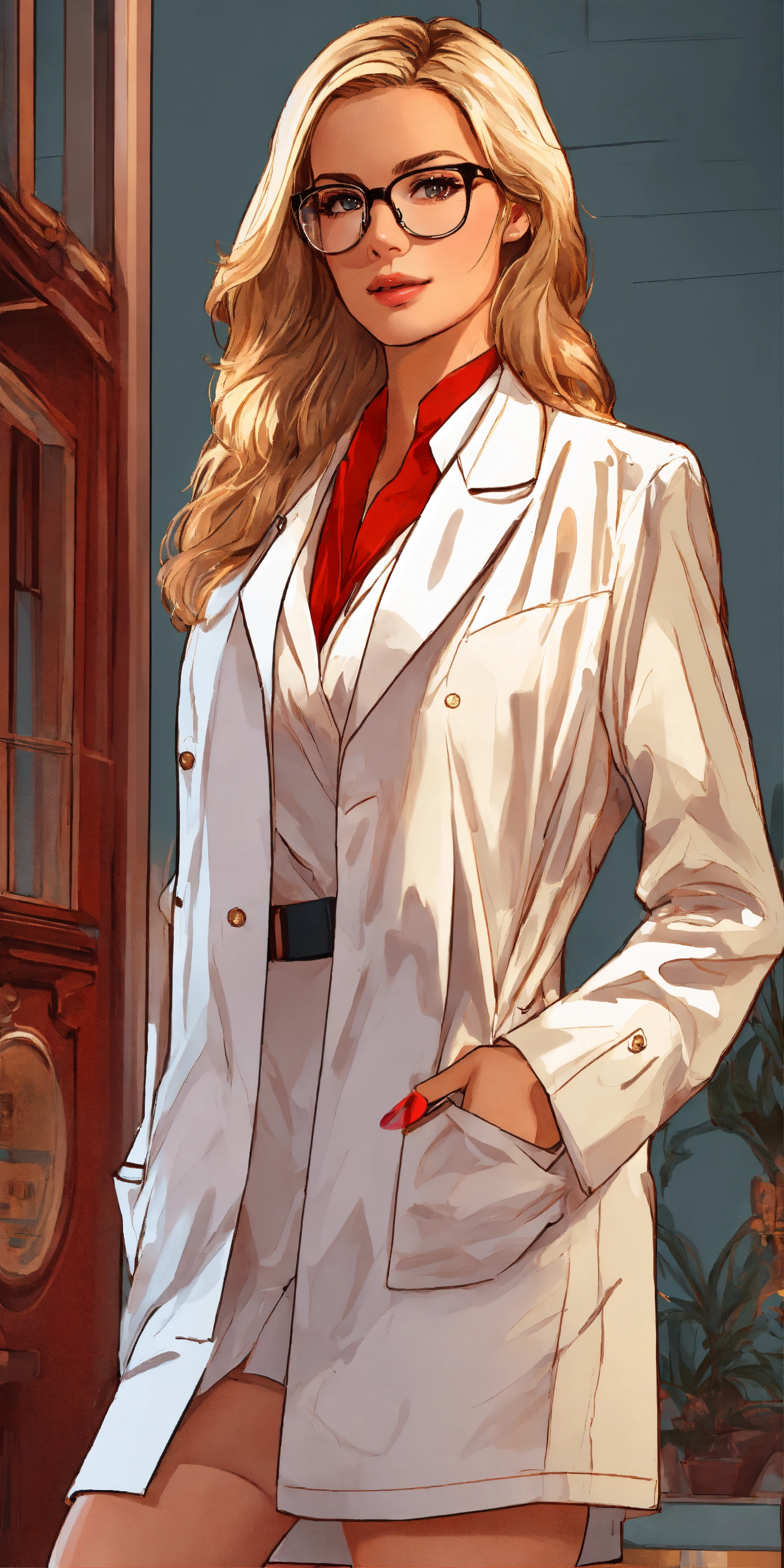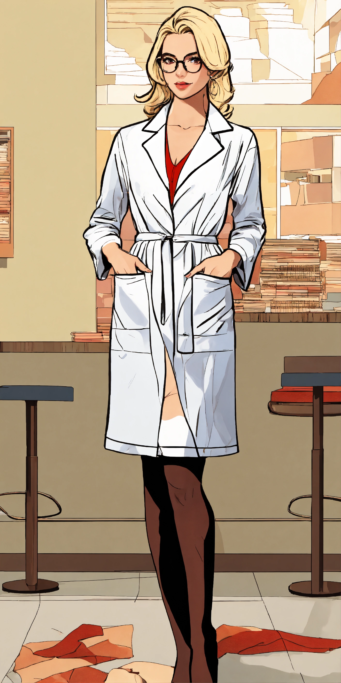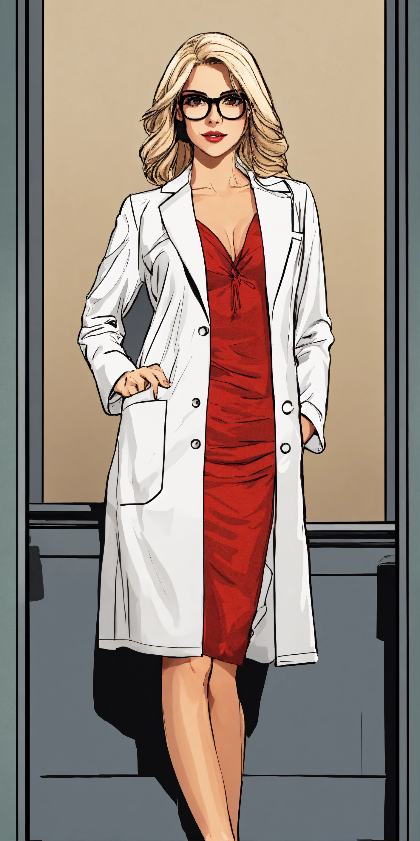 A vector illustration with detailed line art drawing in color, a full length portrait, shot in a photography studio with all white walls, of very very beautiful woman blonde hair straight chin-length with amazing body figure with a posture exudes confidence and professionalism, wearing a white lab coat open to reveal a short short red dress underneath nice legs, wearing red high heels and black cat eye glasses, even lighting, a long-shot at eye level long shot showing full length