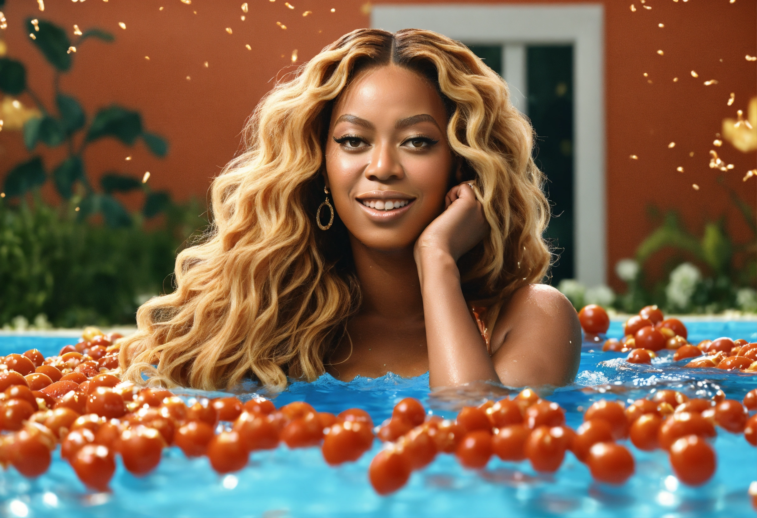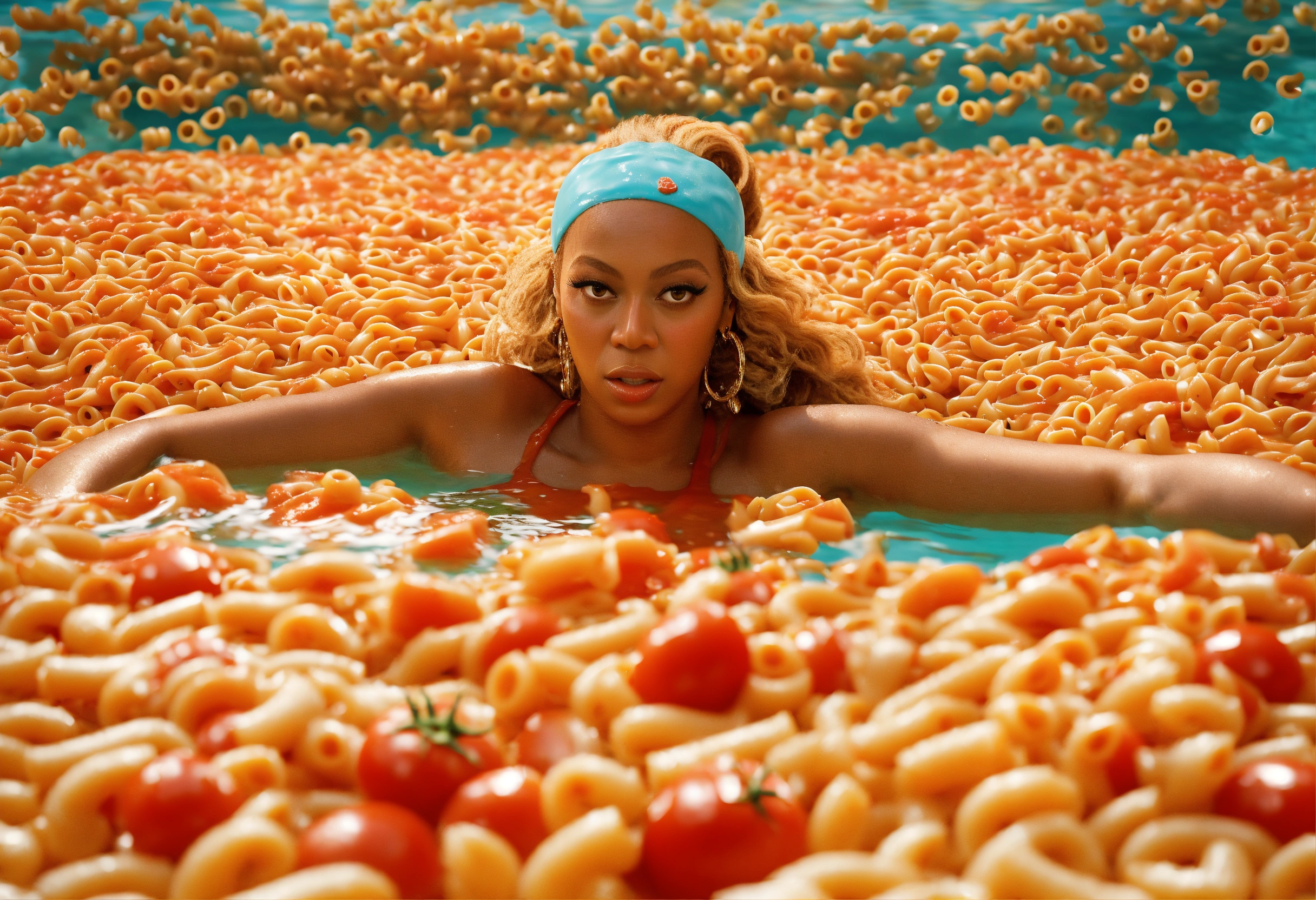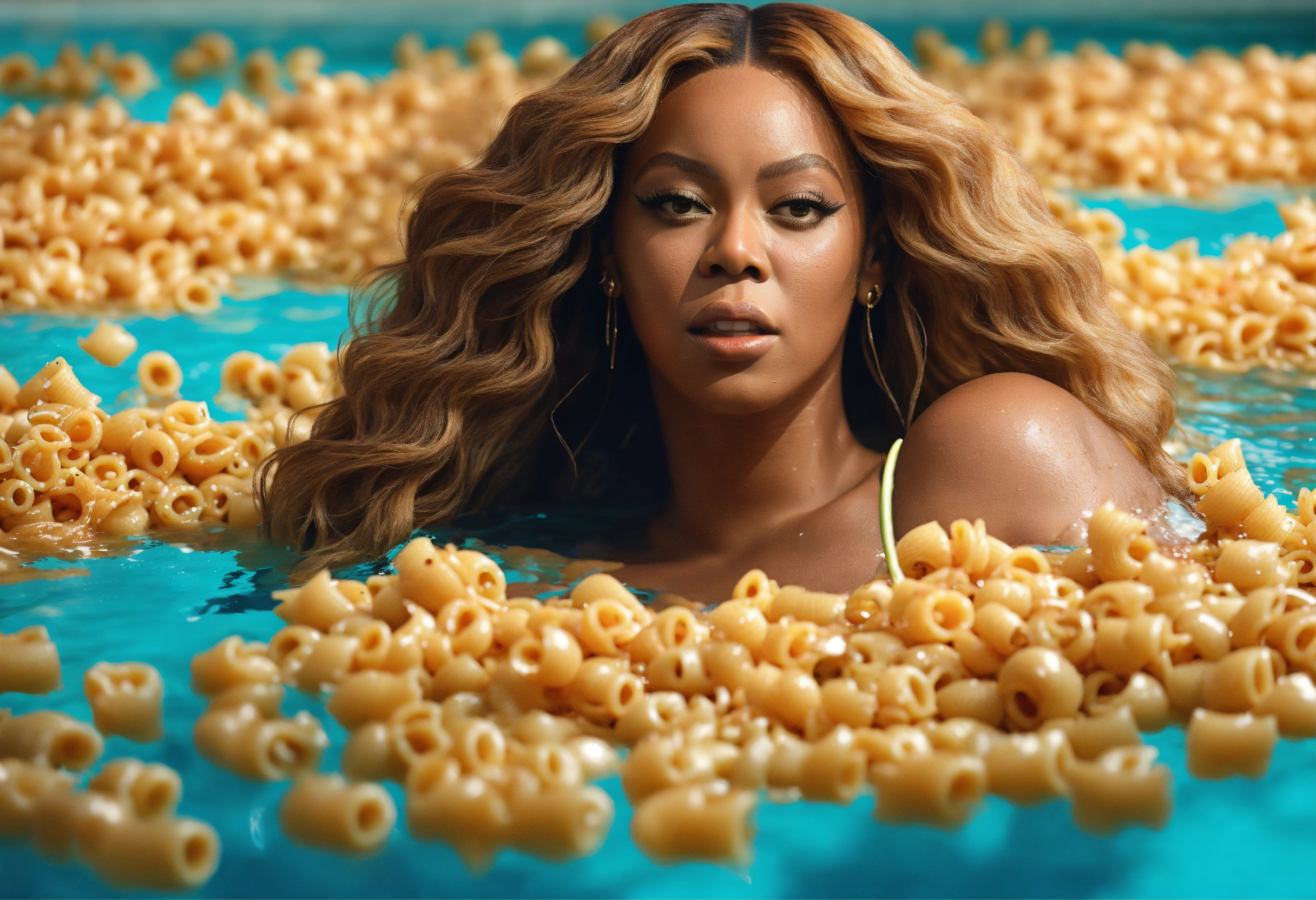 Beyonce knowles in a swimming pool full of macaroni pasta with tomato sauce, photorealistic, 8k quality.