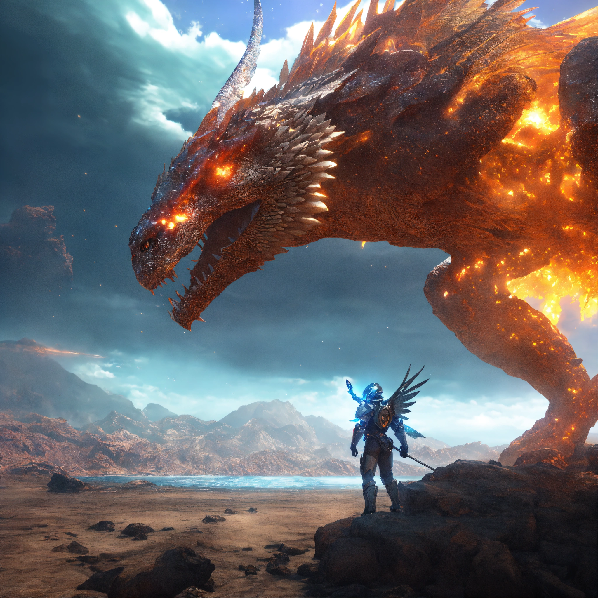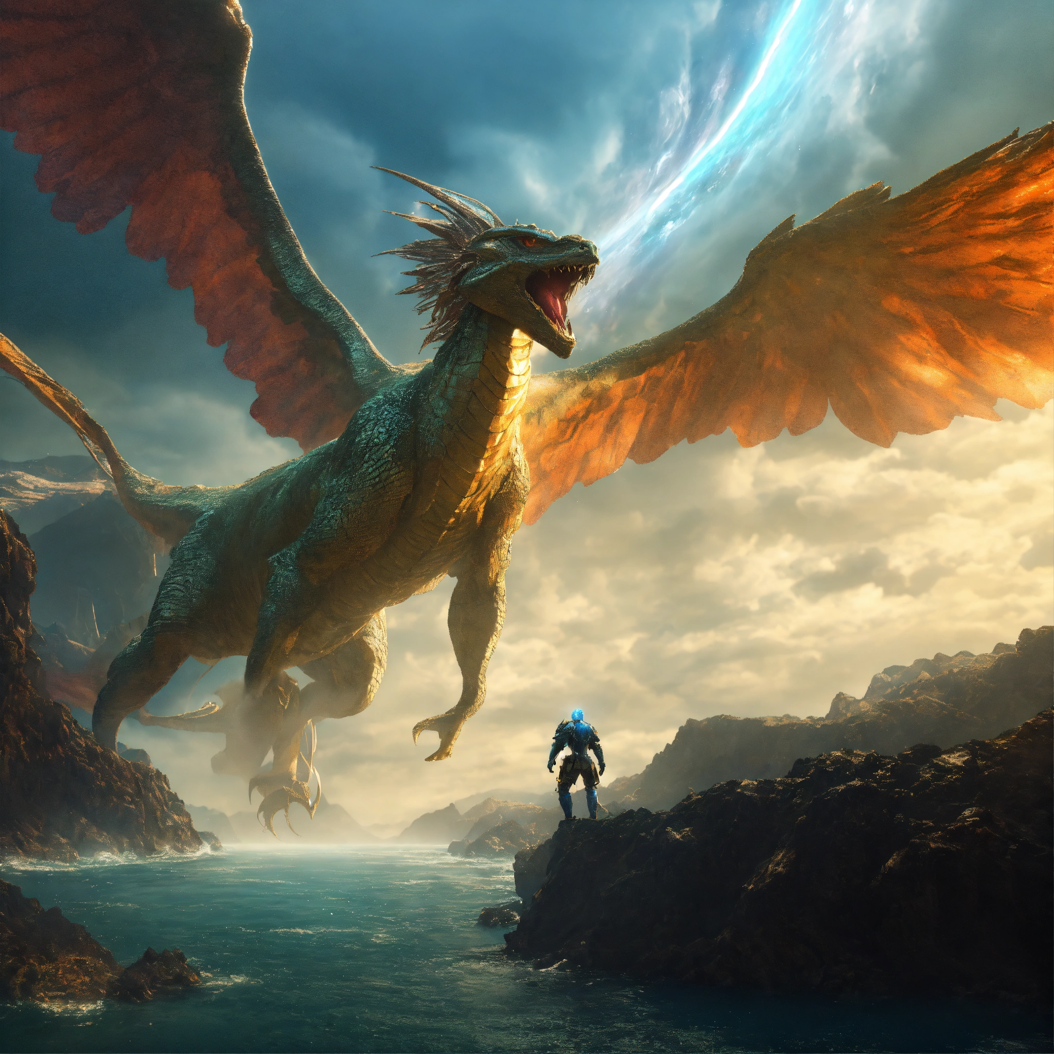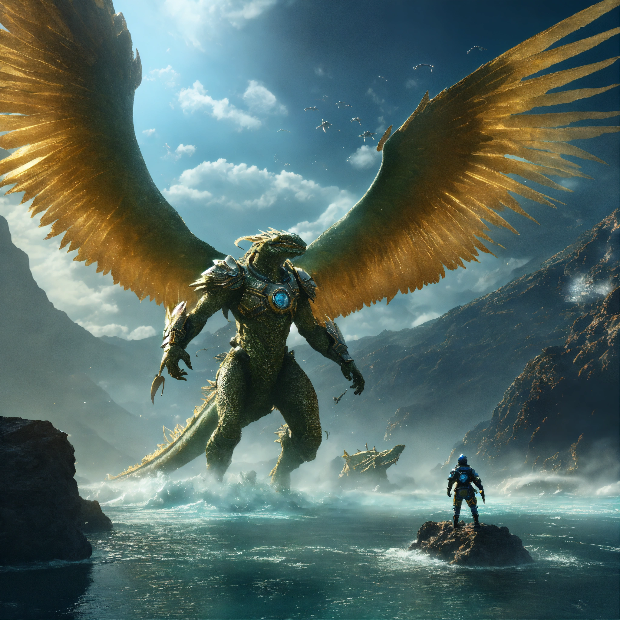 An archangel battles a little humanoid reptile, being reincarnated into a ocean world, sky nebula, artstation scifi 3d scene of a showing mountains, maximalism, ambient occlusion, atmospheric haze, unreal engine, hyper realism, realistic shading, cinematic composition, realistic render, octane render, detailed textures, photorealistic, wide shot