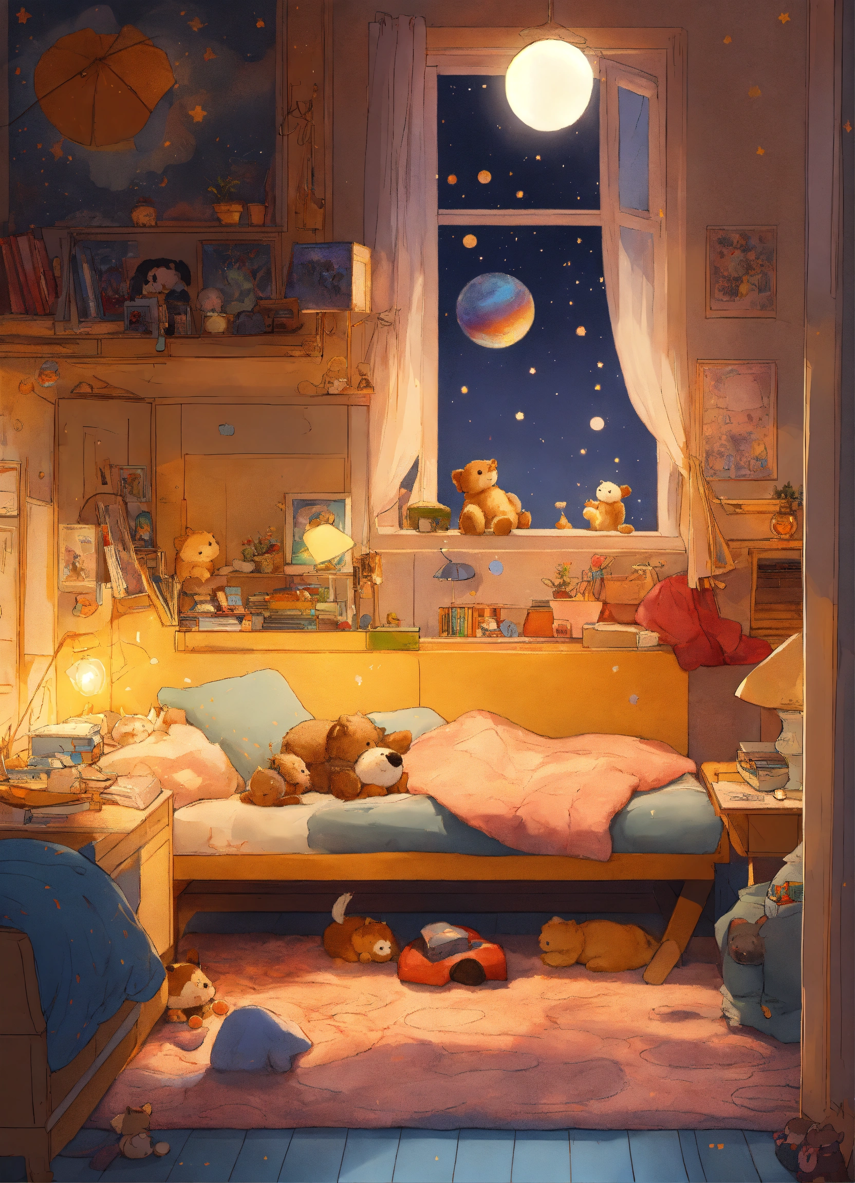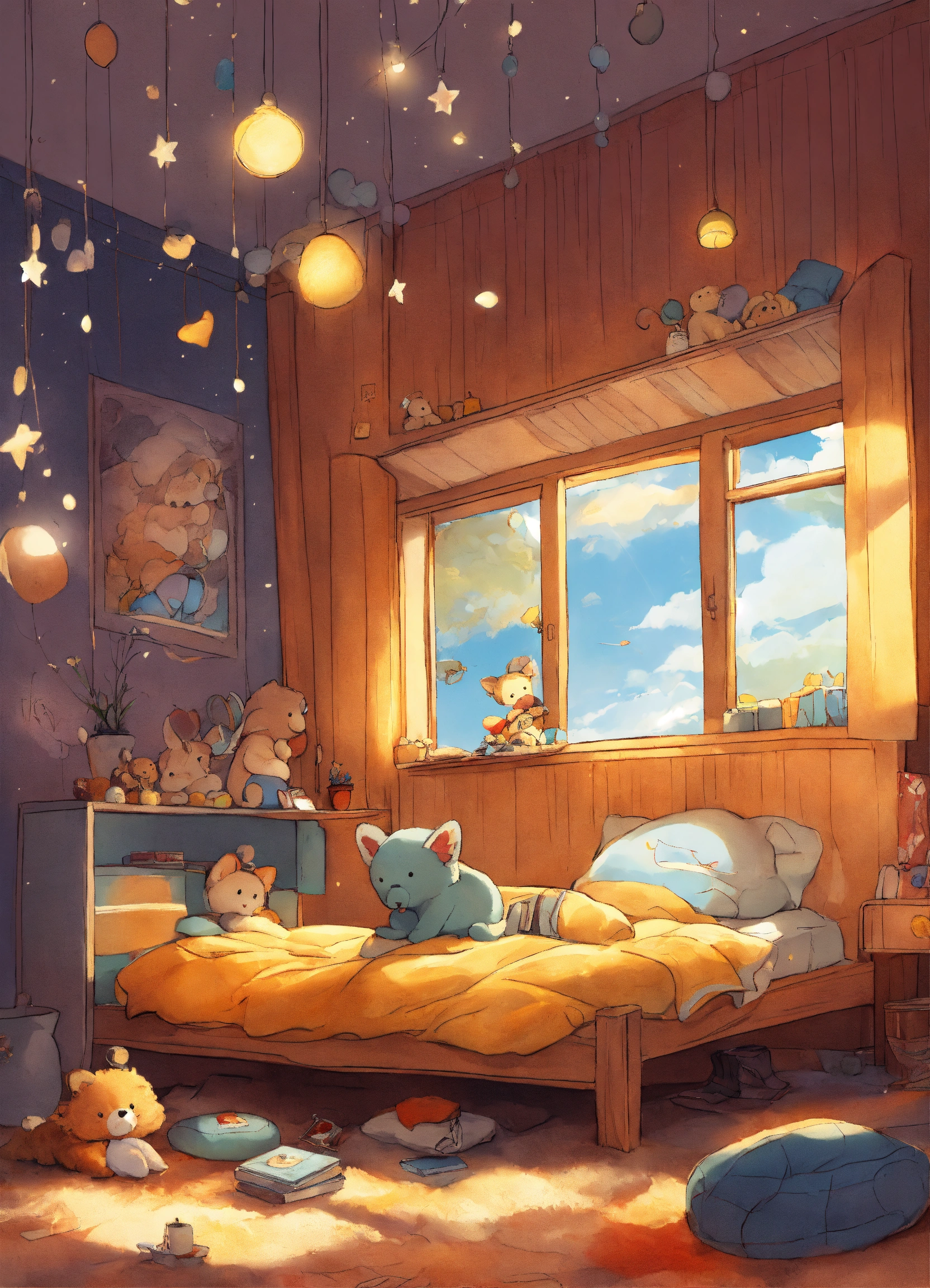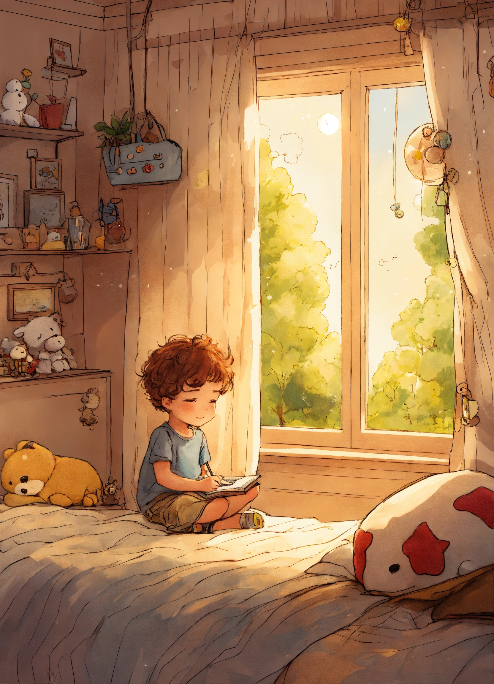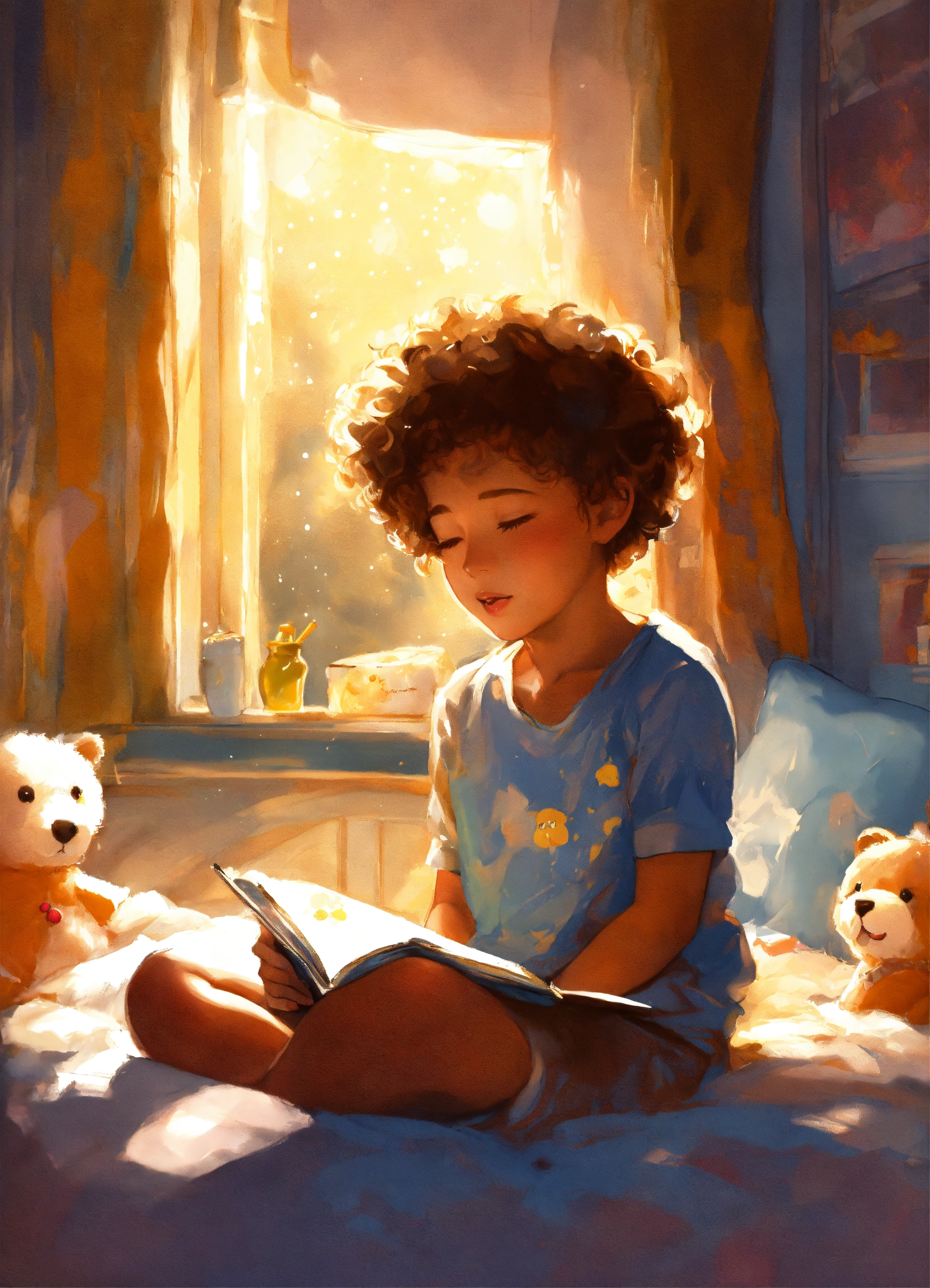 Dessine comme une bd un petit garcon de 4 ans metisse cheveux bouclés assis sur son lit dans sa jolie chambre de petit garcon, entouré de ses jouets et peluches est dans une bulle de lumiere traversee par un rayon de luliere doree venant du ciel et s'enfoncant dans le sol